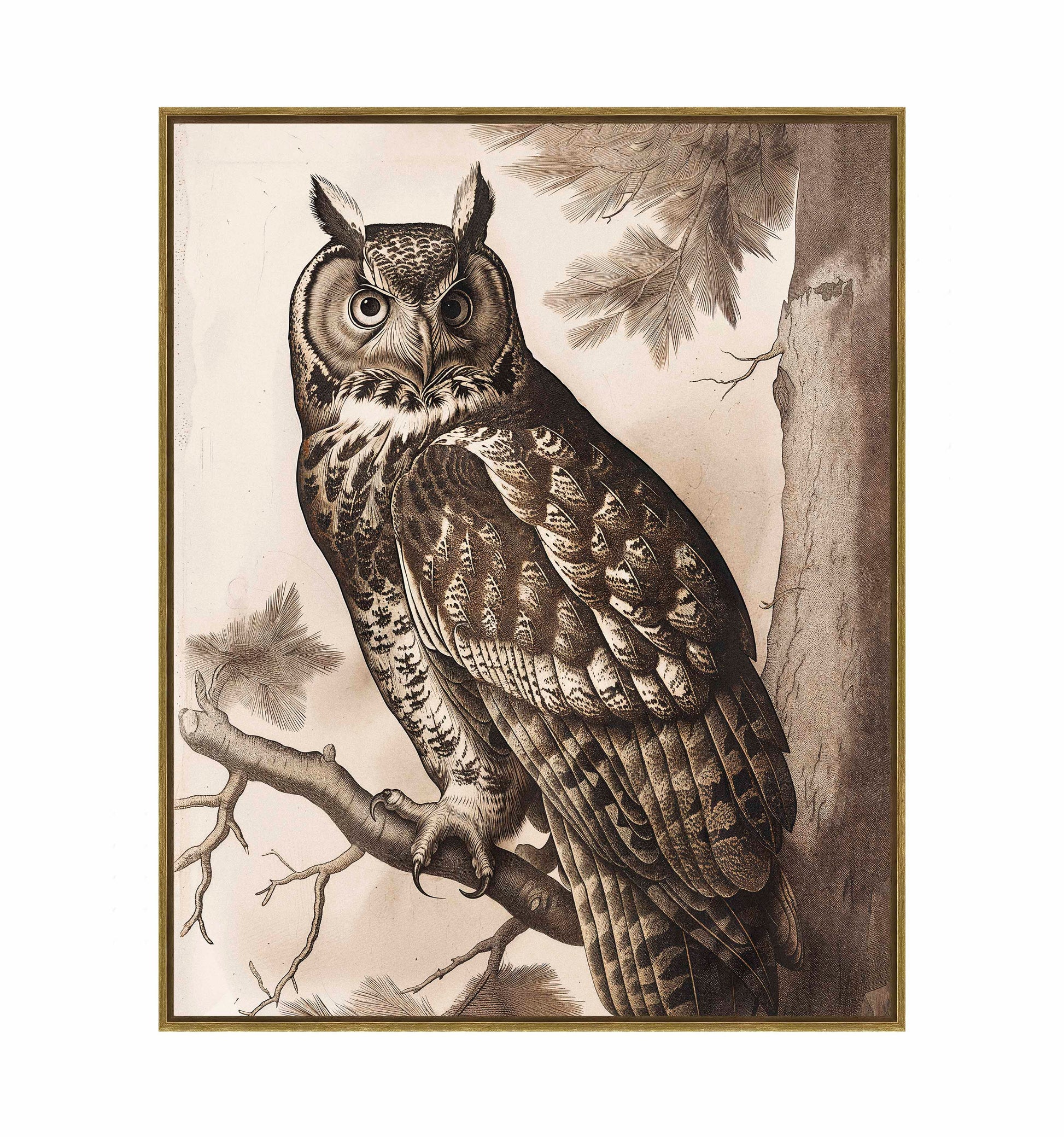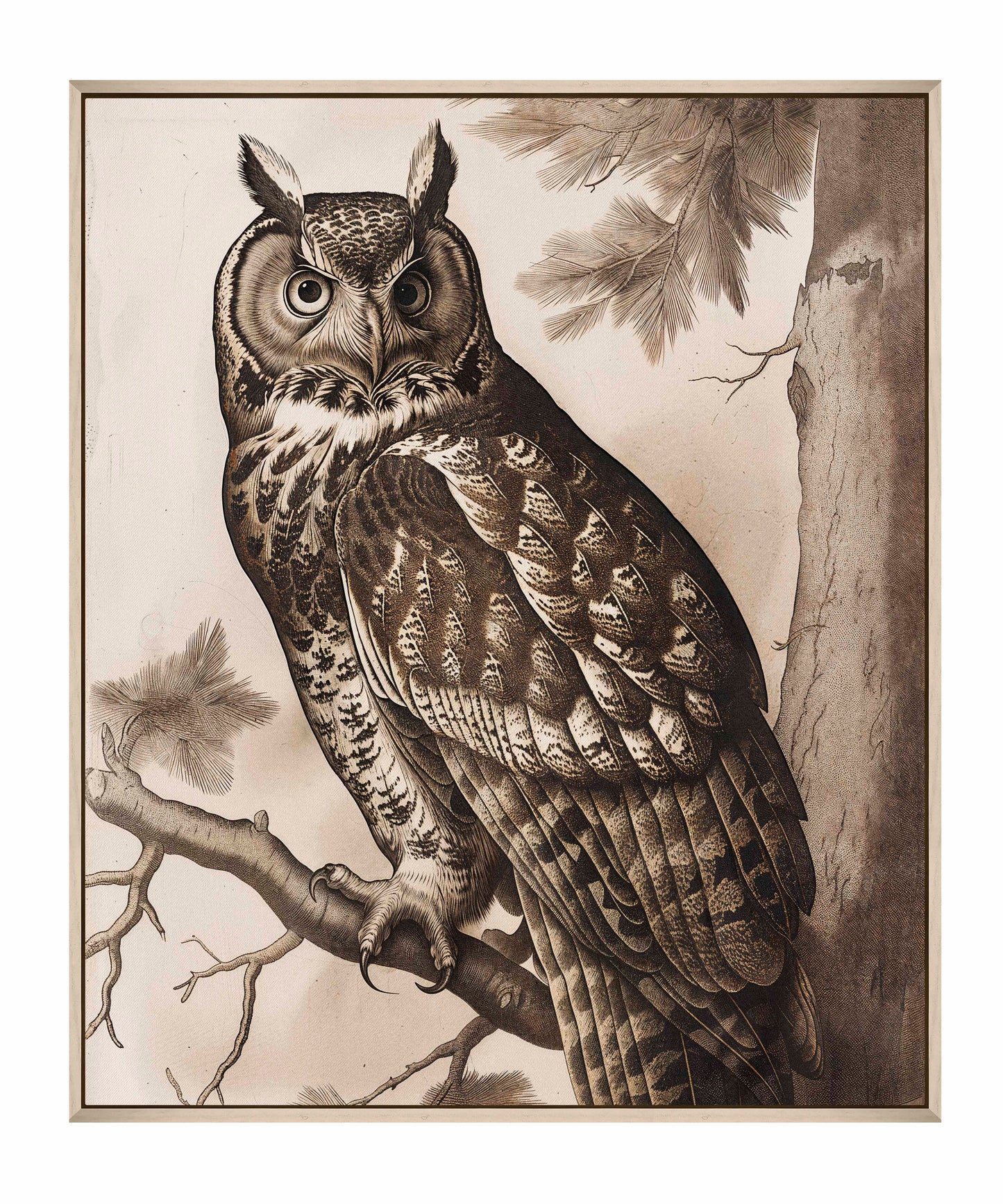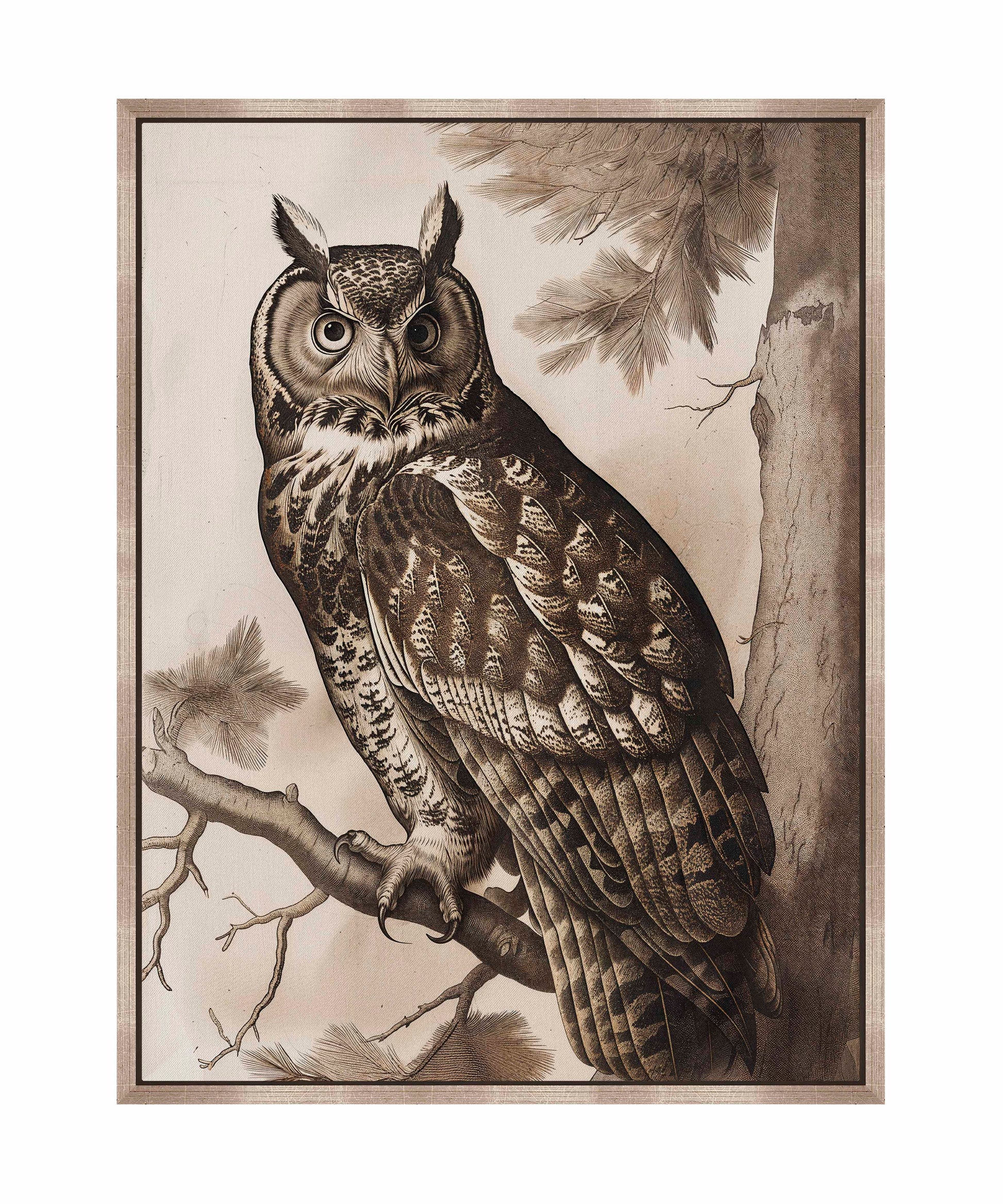 Silent Guardian - Great Horned Owl is a captivating piece from the Engravers Choice Collection, exemplifying the exquisite detail and timeless beauty of traditional engraving. This artwork features a majestic Great Horned Owl perched confidently on a pine branch, its piercing eyes and intricate feather patterns meticulously rendered to convey both strength and grace.