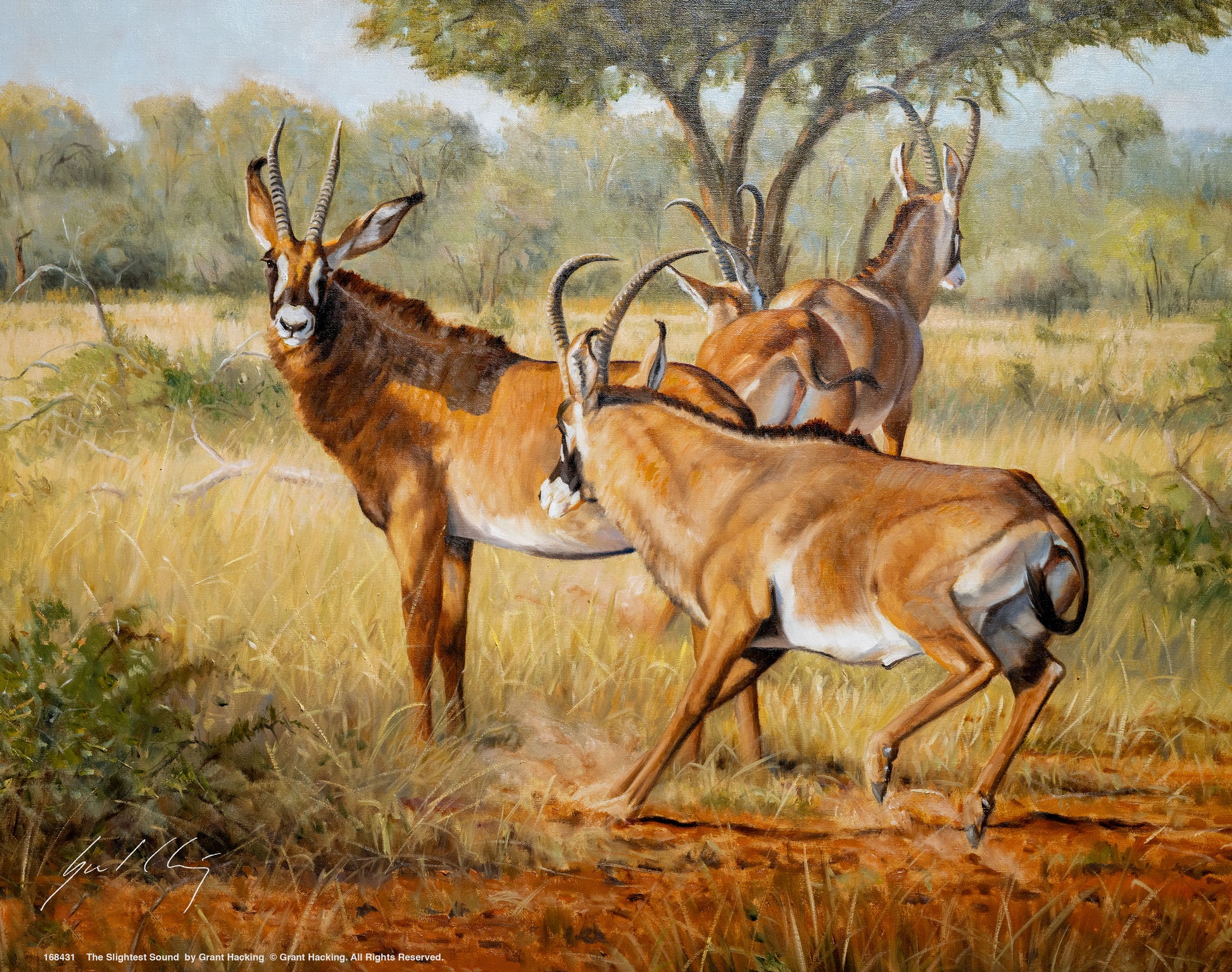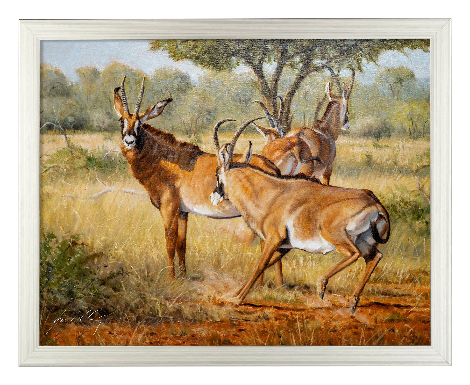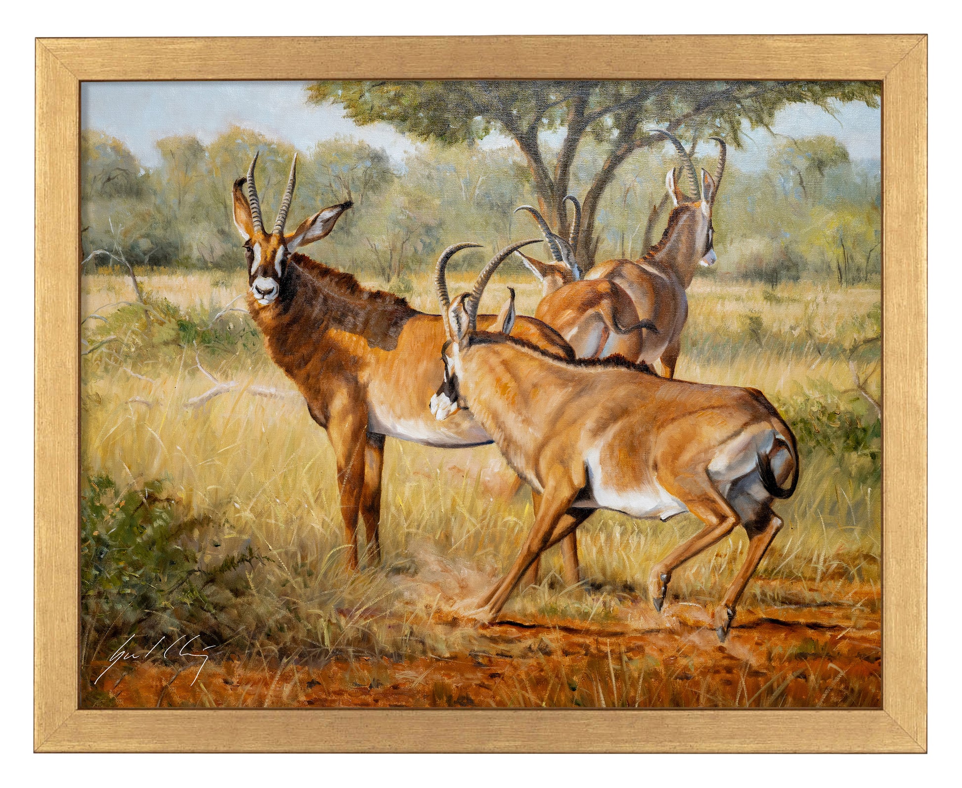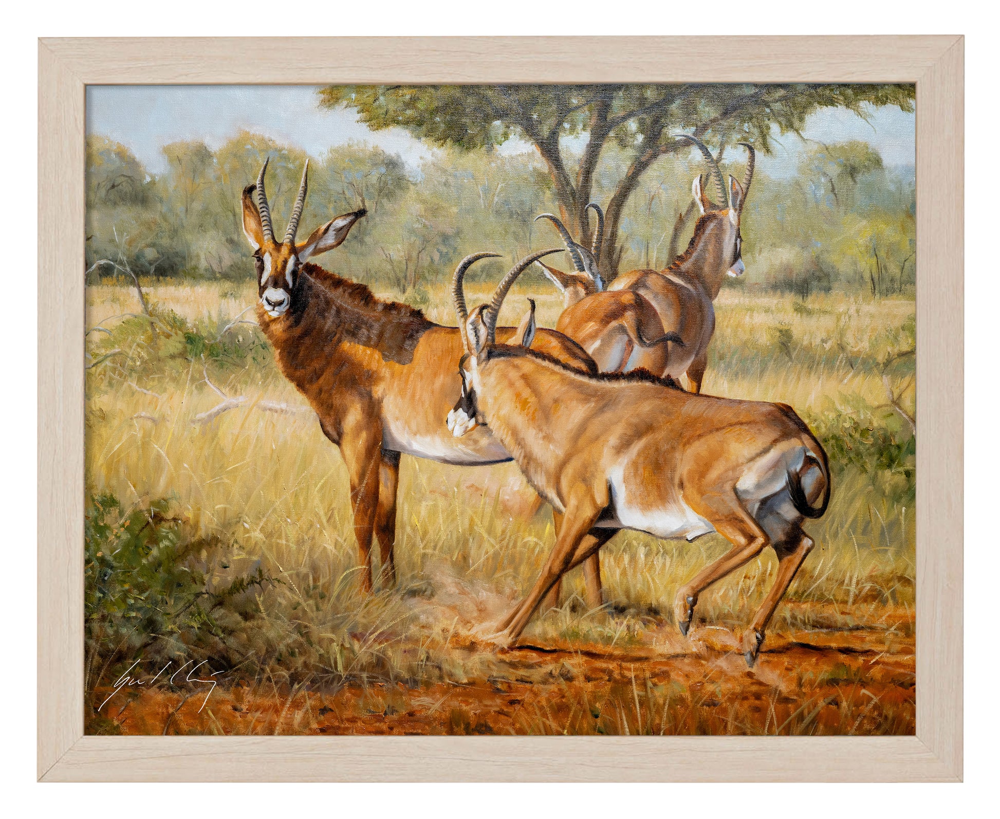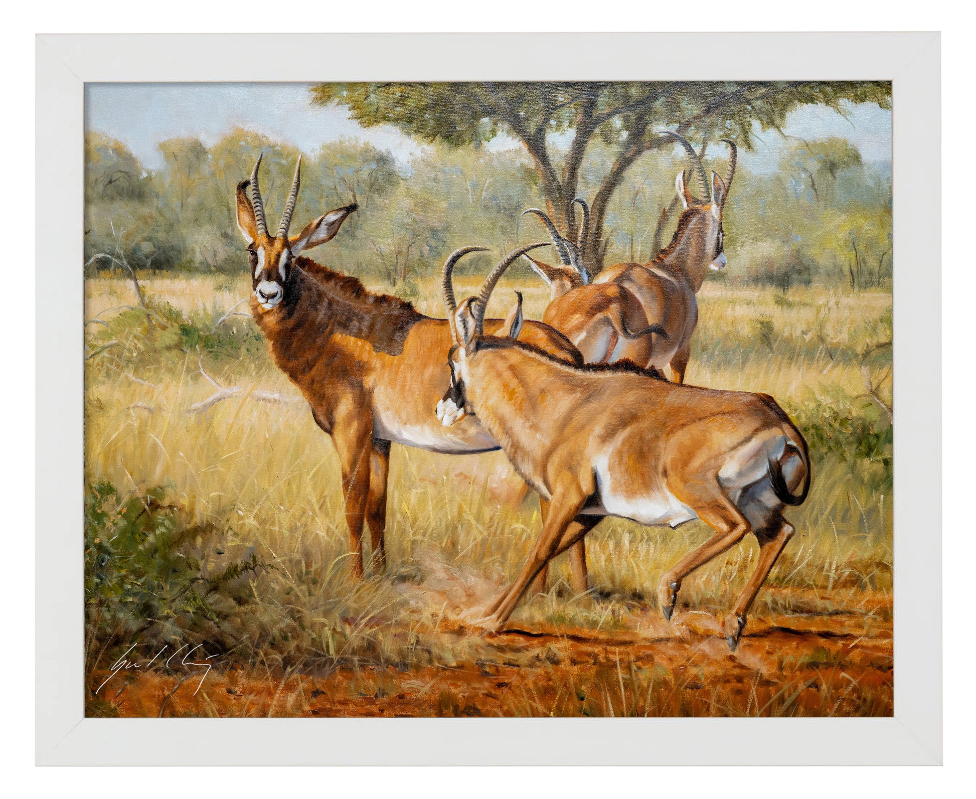 The Roan Antelope is one of the largest antelope in Africa. They are, in my, opinion, one of the most beautiful animals and with those crazy big ears they stand apart from other bovids. I enjoyed studying them in the Northern Cape near Douglas. The word Roan is a term used to describe their color. In this painting the herd is alerted to a crack of wood under my foot. They swiftly ran off but not too far because of their curious nature.
