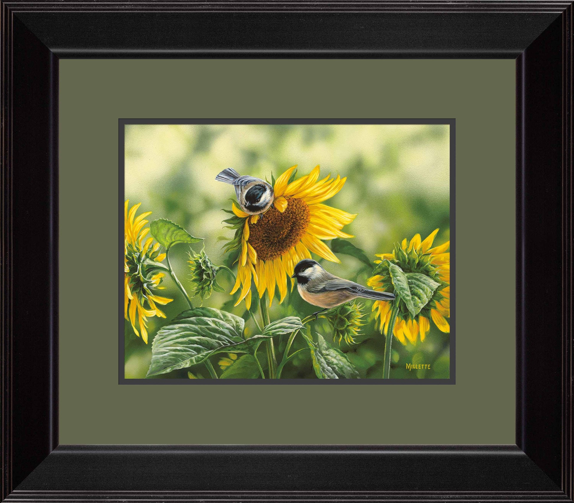 Signature edition art print made from the original acrylic painting. Image size, 11" x 14". Framed size 22" x 25" with a 2-1/2" black moulding. Double matting with dill outer mat. Published exclusively by Wild Wings.