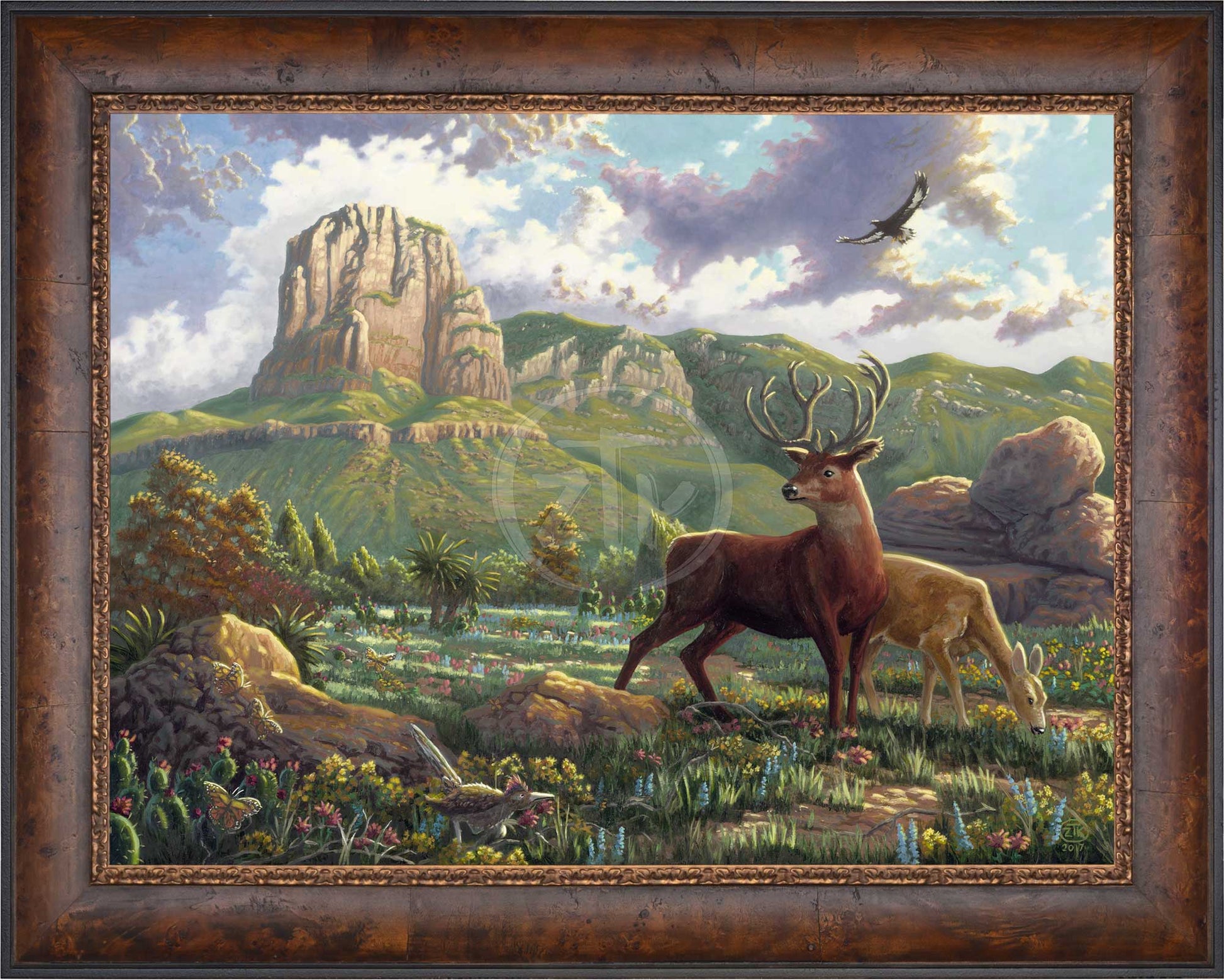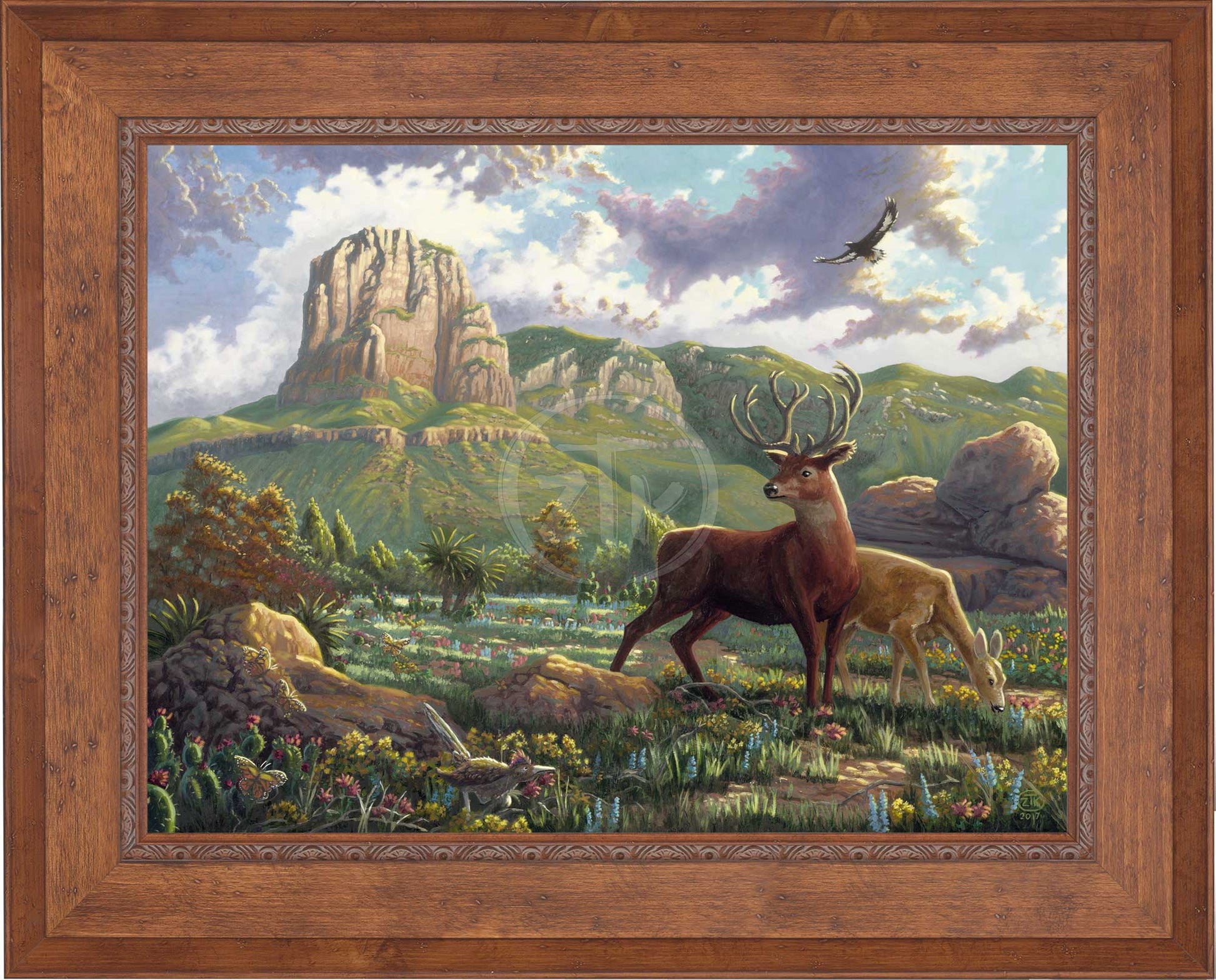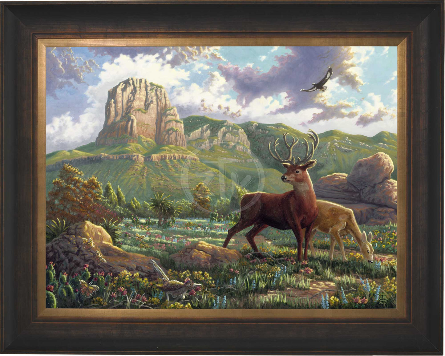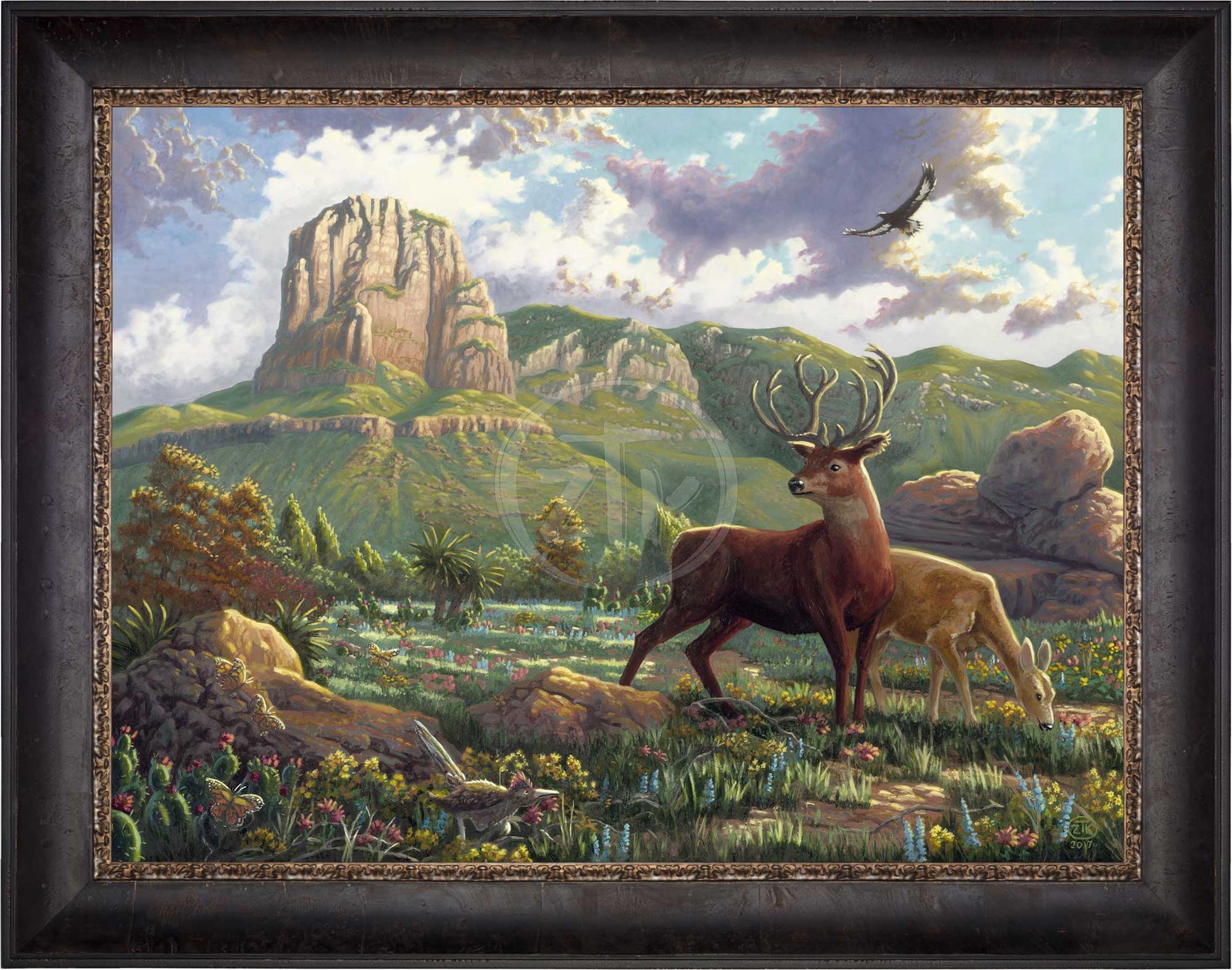 The majesty and beauty of our country’s national parks has long been part of my artistic imagination. Even as a child when I began visiting these untamed places their emotional impact on me was real and profound. Those early transformative experiences were only furthered when I grew to fully appreciate the works of other artists and their interpretations of these natural treasures. Fredrick Church, Albert Bierstadt and, of course, my uncle Thomas Kinkade all came to influence my own efforts in oil seeking to capture what I was seeing and feeling inside. In the first of my America’s Wildlands series, I explore a little-known region in my home state of Texas that is protected within Guadalupe Mountains. Set at sunrise as the park’s inhabitants just begin to stir, the background is dominated by “El Capitan” the best-known peak of the Guadalupe range. Mule deer and road runners forage for food as a golden eagle flies above and scans the ground below. Splashes of color dot the landscape in the petals of bluebonnets and Indian paintbrush as well as on the wings of monarch butterflies. It is spring in Guadalupe and a moment of verdant green hangs on before the coming summer heat has chance to grey the rocky terrain. My plan is to visit many of our nation’s parks over the coming years and chronicle the sights, the flora and the fauna of each for those of you who would enjoy my captured moments. And, as always, I want to thank you all for sharing my adventure in art.