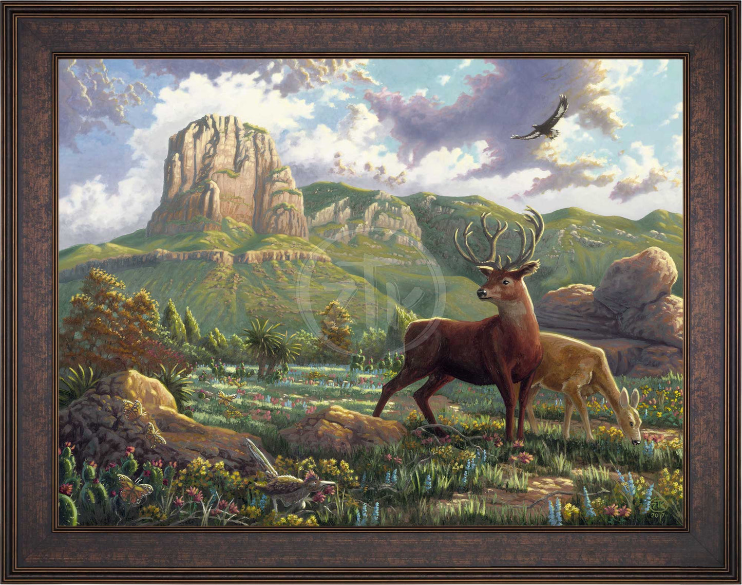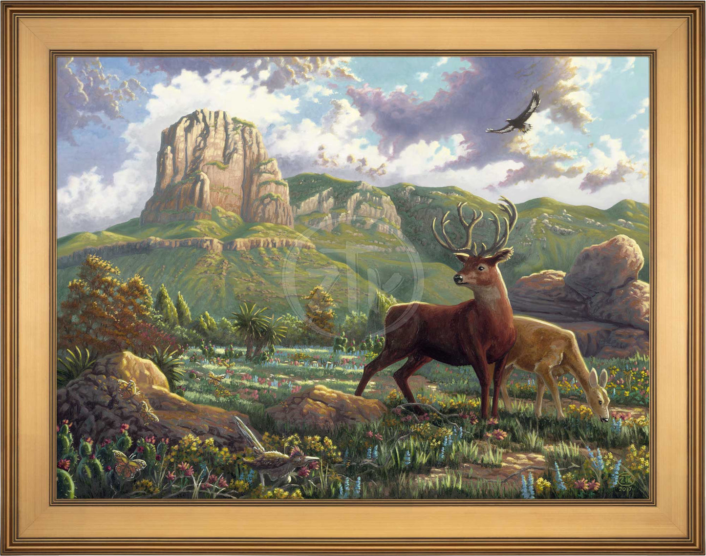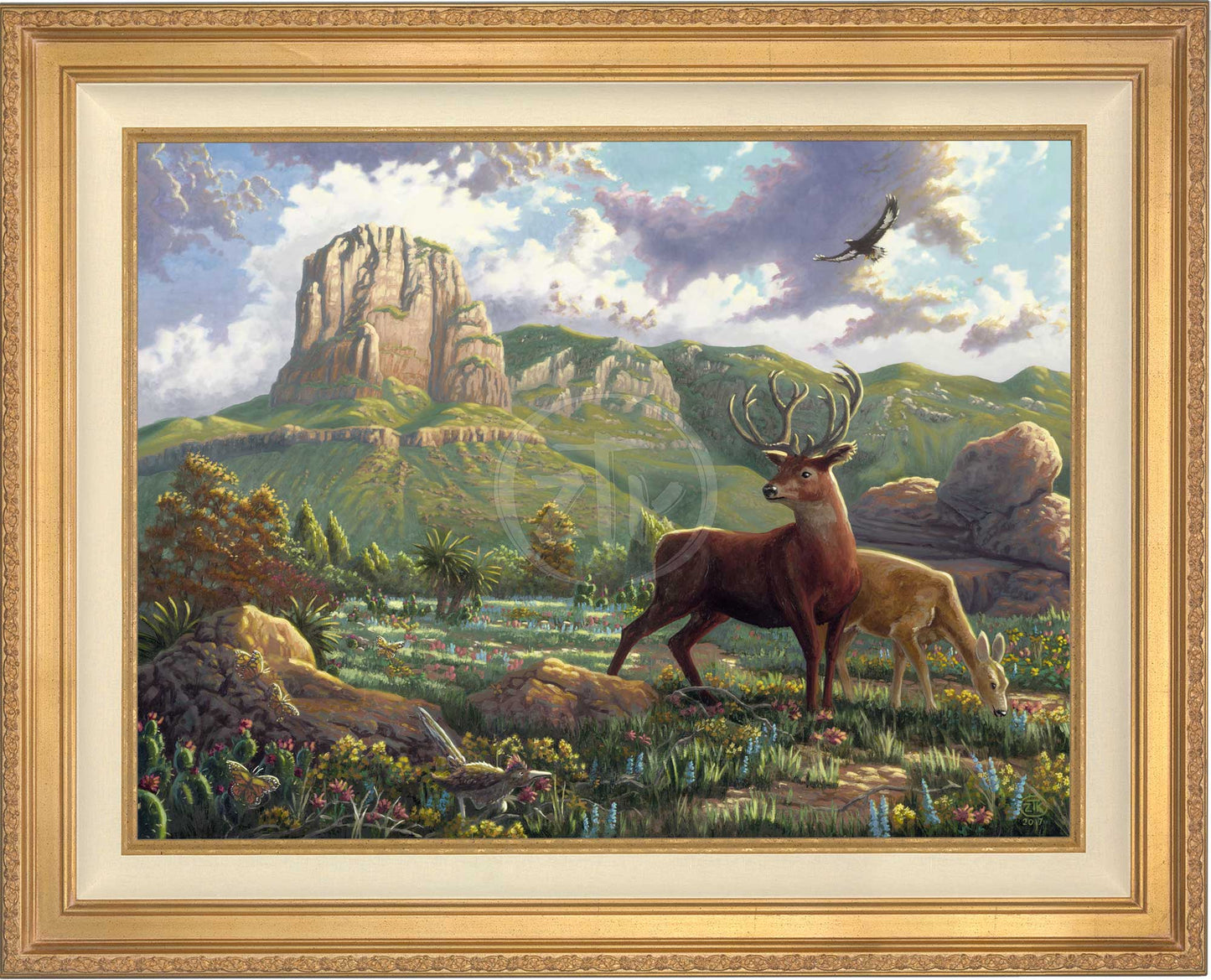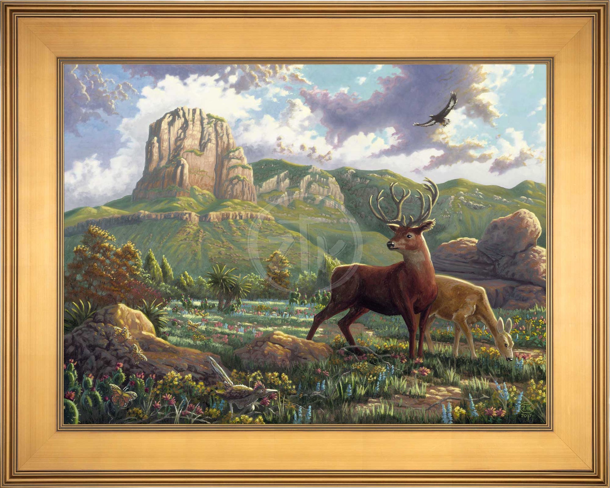 The majesty and beauty of our country’s national parks has long been part of my artistic imagination. Even as a child when I began visiting these untamed places their emotional impact on me was real and profound. Those early transformative experiences were only furthered when I grew to fully appreciate the works of other artists and their interpretations of these natural treasures. Fredrick Church, Albert Bierstadt and, of course, my uncle Thomas Kinkade all came to influence my own efforts in oil seeking to capture what I was seeing and feeling inside. In the first of my America’s Wildlands series, I explore a little-known region in my home state of Texas that is protected within Guadalupe Mountains. Set at sunrise as the park’s inhabitants just begin to stir, the background is dominated by “El Capitan” the best-known peak of the Guadalupe range. Mule deer and road runners forage for food as a golden eagle flies above and scans the ground below. Splashes of color dot the landscape in the petals of bluebonnets and Indian paintbrush as well as on the wings of monarch butterflies. It is spring in Guadalupe and a moment of verdant green hangs on before the coming summer heat has chance to grey the rocky terrain. My plan is to visit many of our nation’s parks over the coming years and chronicle the sights, the flora and the fauna of each for those of you who would enjoy my captured moments. And, as always, I want to thank you all for sharing my adventure in art.