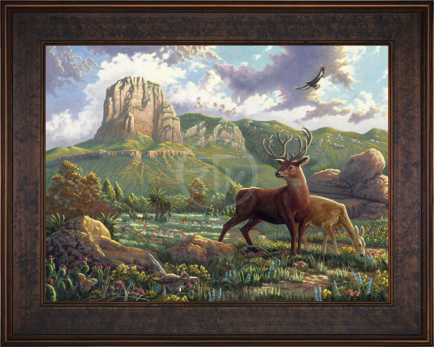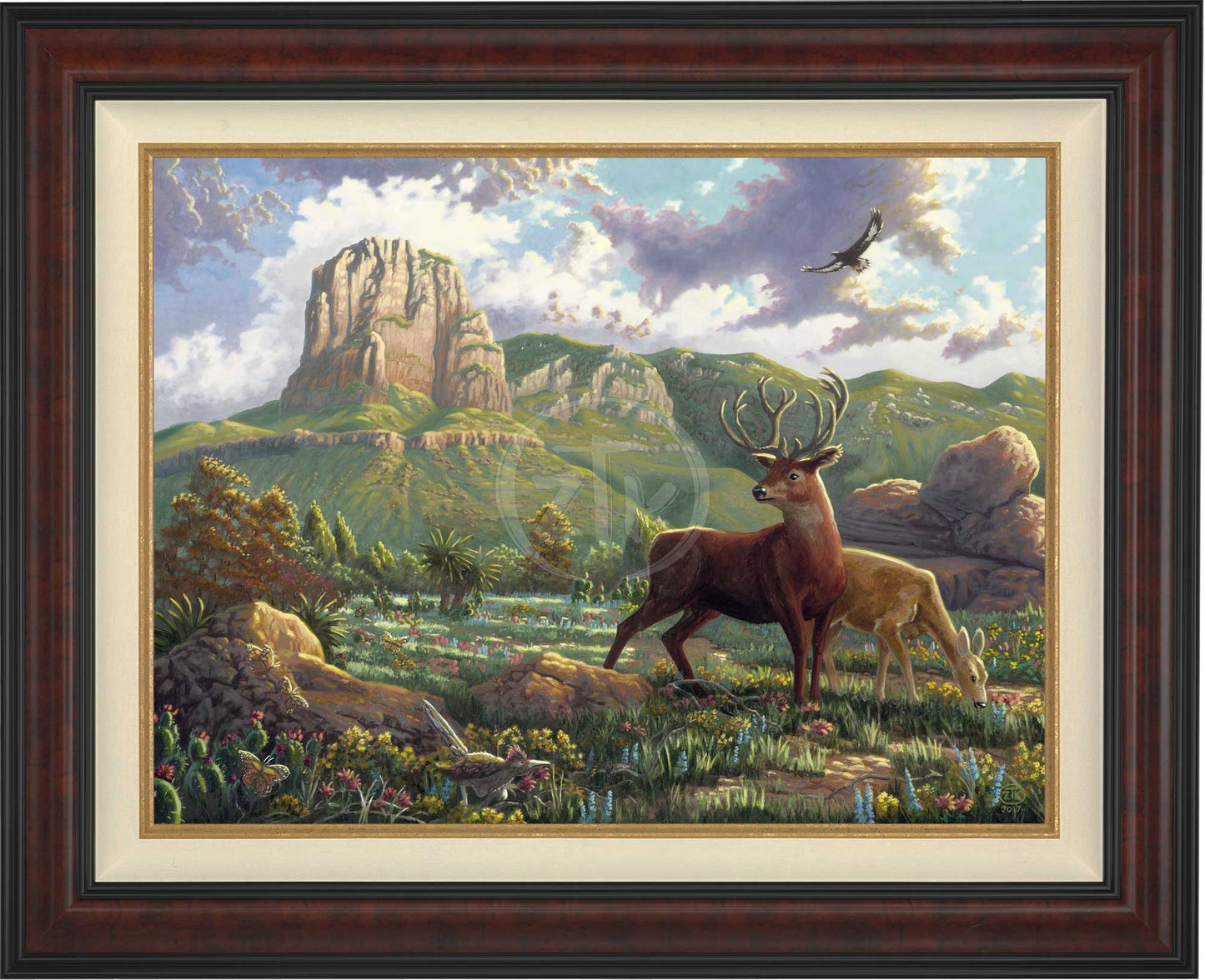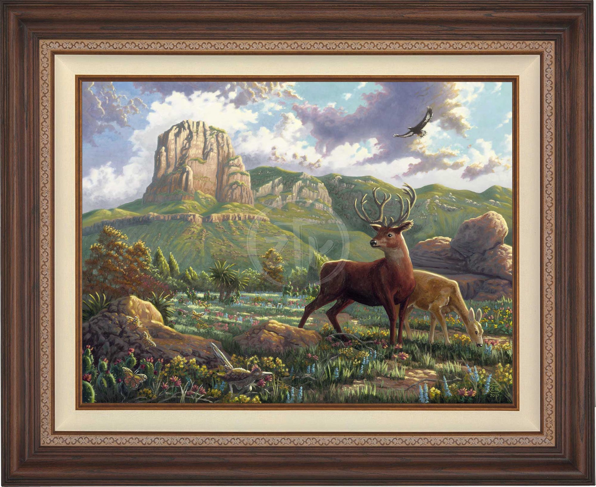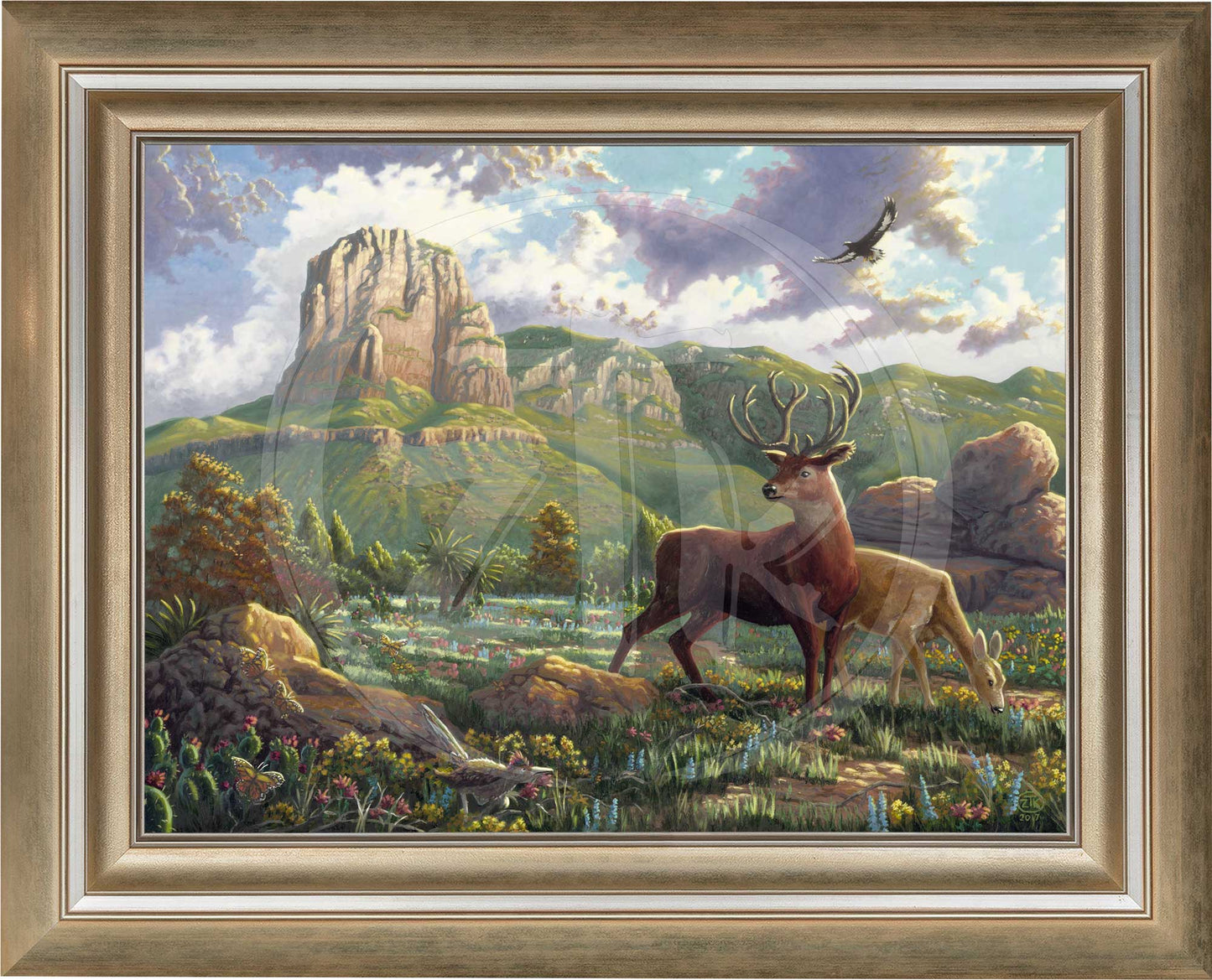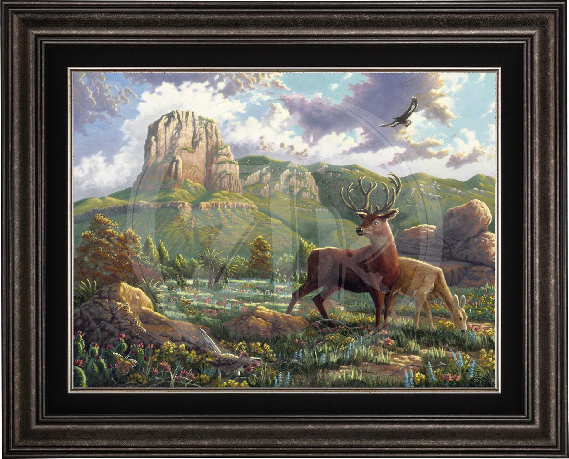 The majesty and beauty of our country’s national parks has long been part of my artistic imagination. Even as a child when I began visiting these untamed places their emotional impact on me was real and profound. Those early transformative experiences were only furthered when I grew to fully appreciate the works of other artists and their interpretations of these natural treasures. Fredrick Church, Albert Bierstadt and, of course, my uncle Thomas Kinkade all came to influence my own efforts in oil seeking to capture what I was seeing and feeling inside. In the first of my America’s Wildlands series, I explore a little-known region in my home state of Texas that is protected within Guadalupe Mountains. Set at sunrise as the park’s inhabitants just begin to stir, the background is dominated by “El Capitan” the best-known peak of the Guadalupe range. Mule deer and road runners forage for food as a golden eagle flies above and scans the ground below. Splashes of color dot the landscape in the petals of bluebonnets and Indian paintbrush as well as on the wings of monarch butterflies. It is spring in Guadalupe and a moment of verdant green hangs on before the coming summer heat has chance to grey the rocky terrain. My plan is to visit many of our nation’s parks over the coming years and chronicle the sights, the flora and the fauna of each for those of you who would enjoy my captured moments. And, as always, I want to thank you all for sharing my adventure in art.