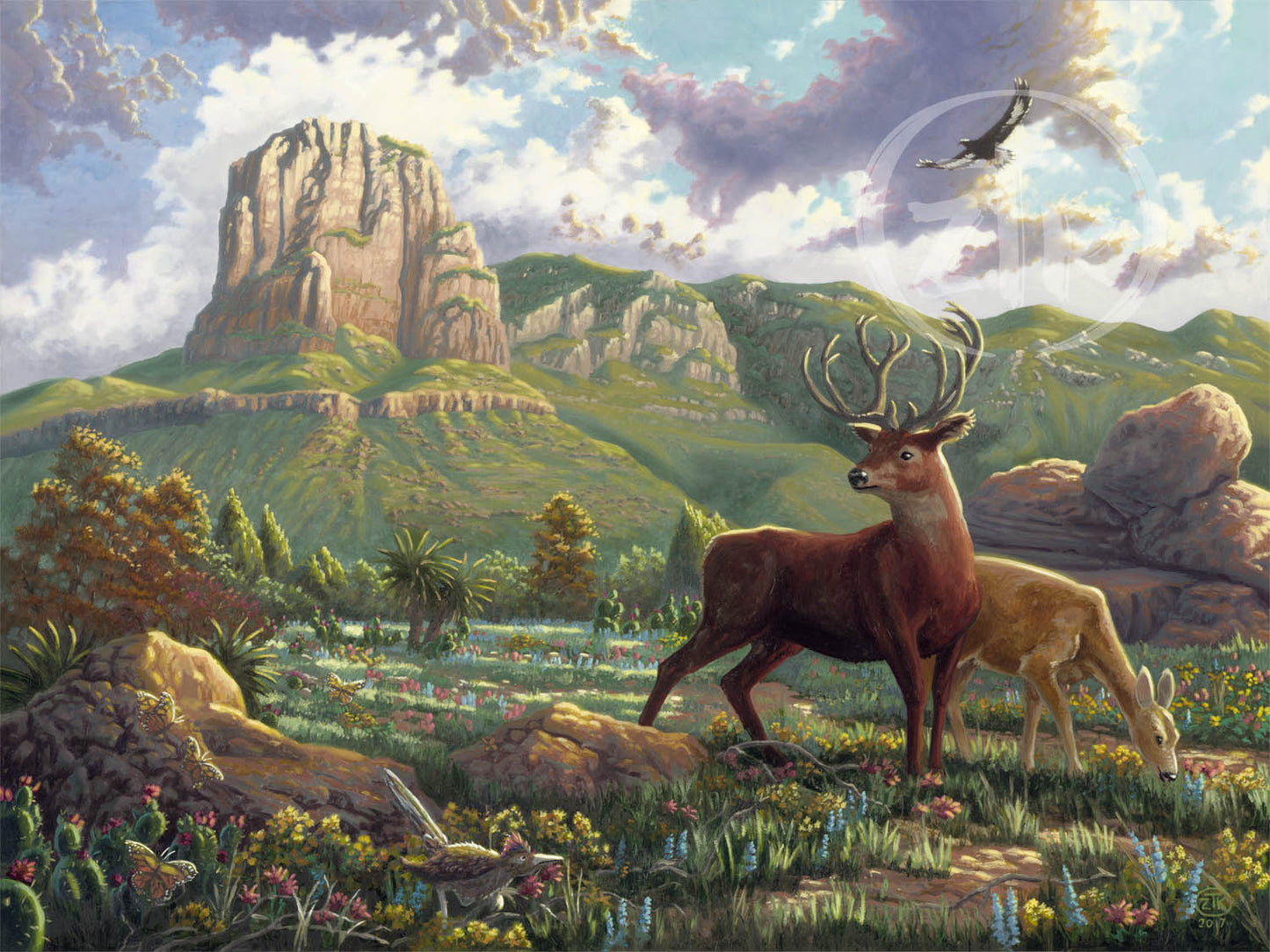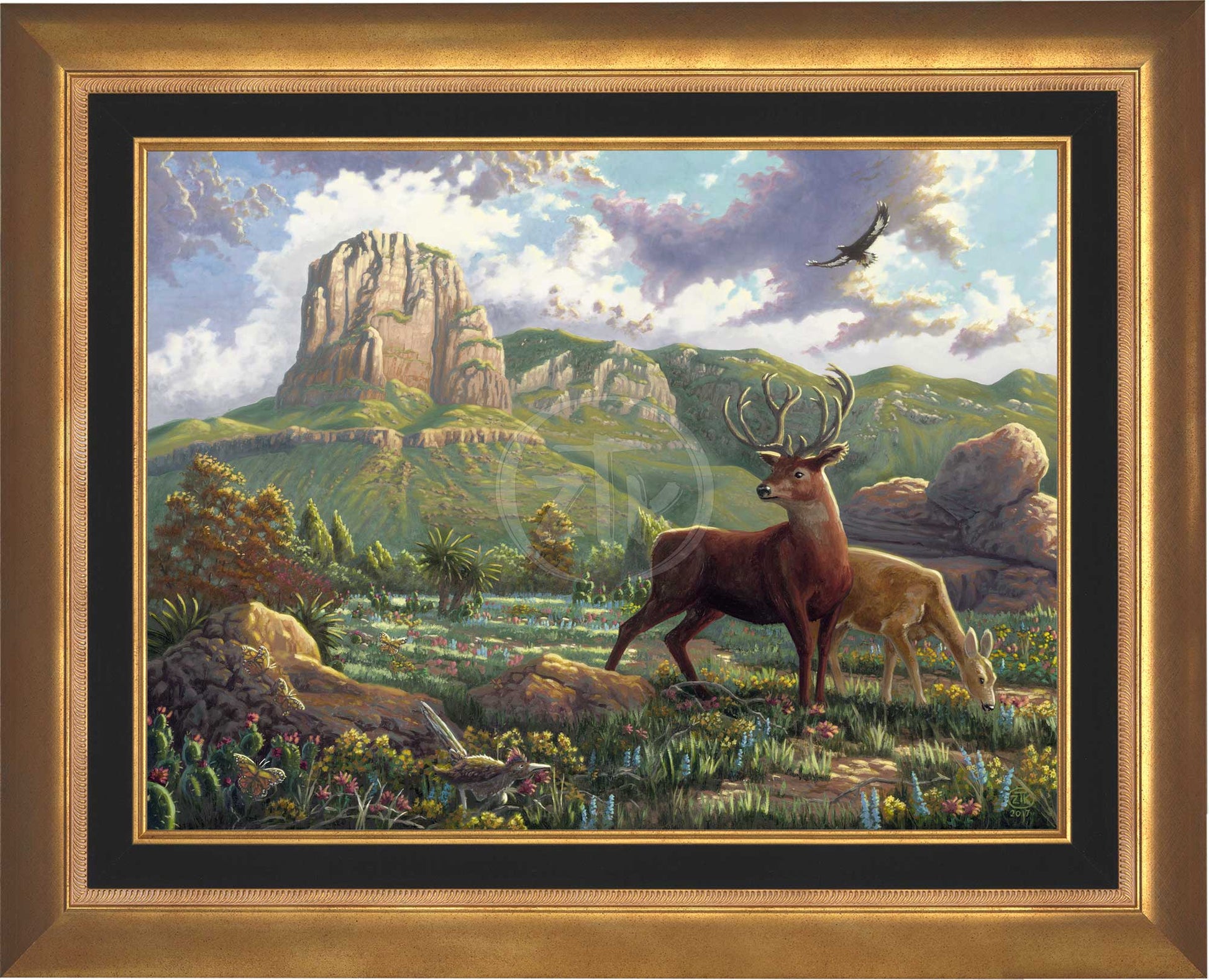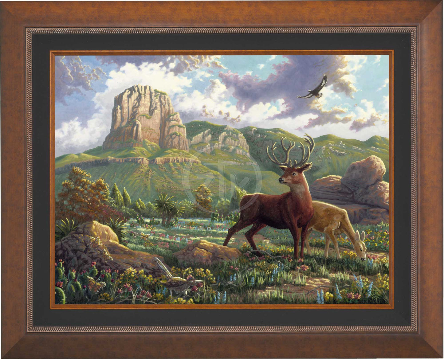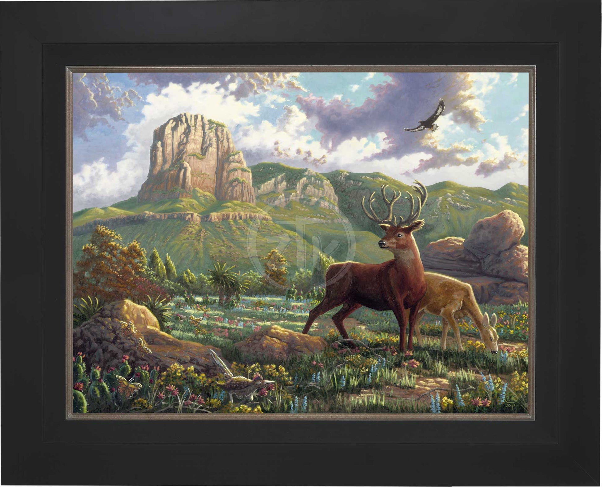 The majesty and beauty of our country’s national parks has long been part of my artistic imagination. Even as a child when I began visiting these untamed places their emotional impact on me was real and profound. Those early transformative experiences were only furthered when I grew to fully appreciate the works of other artists and their interpretations of these natural treasures. Fredrick Church, Albert Bierstadt and, of course, my uncle Thomas Kinkade all came to influence my own efforts in oil seeking to capture what I was seeing and feeling inside. In the first of my America’s Wildlands series, I explore a little-known region in my home state of Texas that is protected within Guadalupe Mountains. Set at sunrise as the park’s inhabitants just begin to stir, the background is dominated by “El Capitan” the best-known peak of the Guadalupe range. Mule deer and road runners forage for food as a golden eagle flies above and scans the ground below. Splashes of color dot the landscape in the petals of bluebonnets and Indian paintbrush as well as on the wings of monarch butterflies. It is spring in Guadalupe and a moment of verdant green hangs on before the coming summer heat has chance to grey the rocky terrain. My plan is to visit many of our nation’s parks over the coming years and chronicle the sights, the flora and the fauna of each for those of you who would enjoy my captured moments. And, as always, I want to thank you all for sharing my adventure in art.