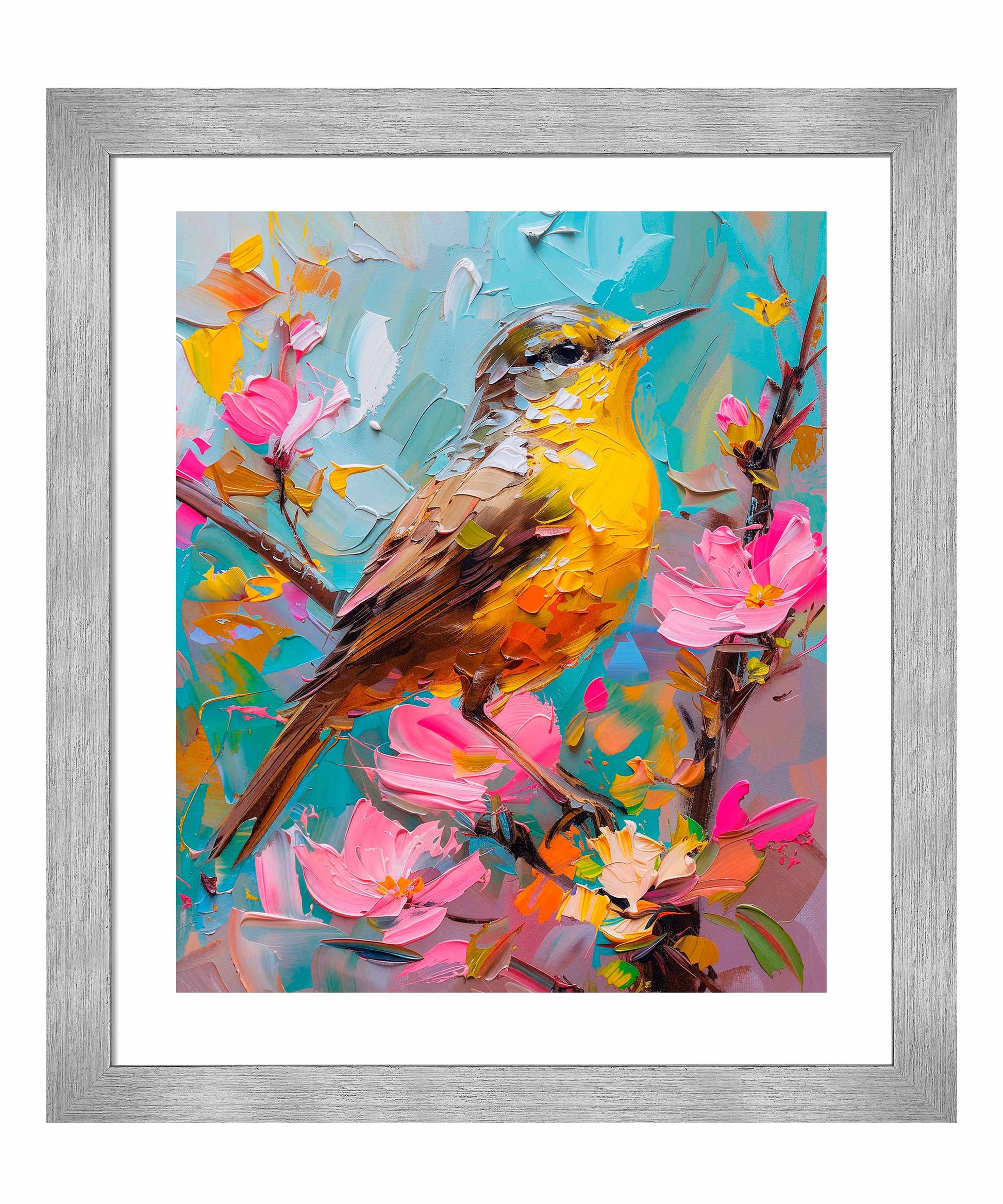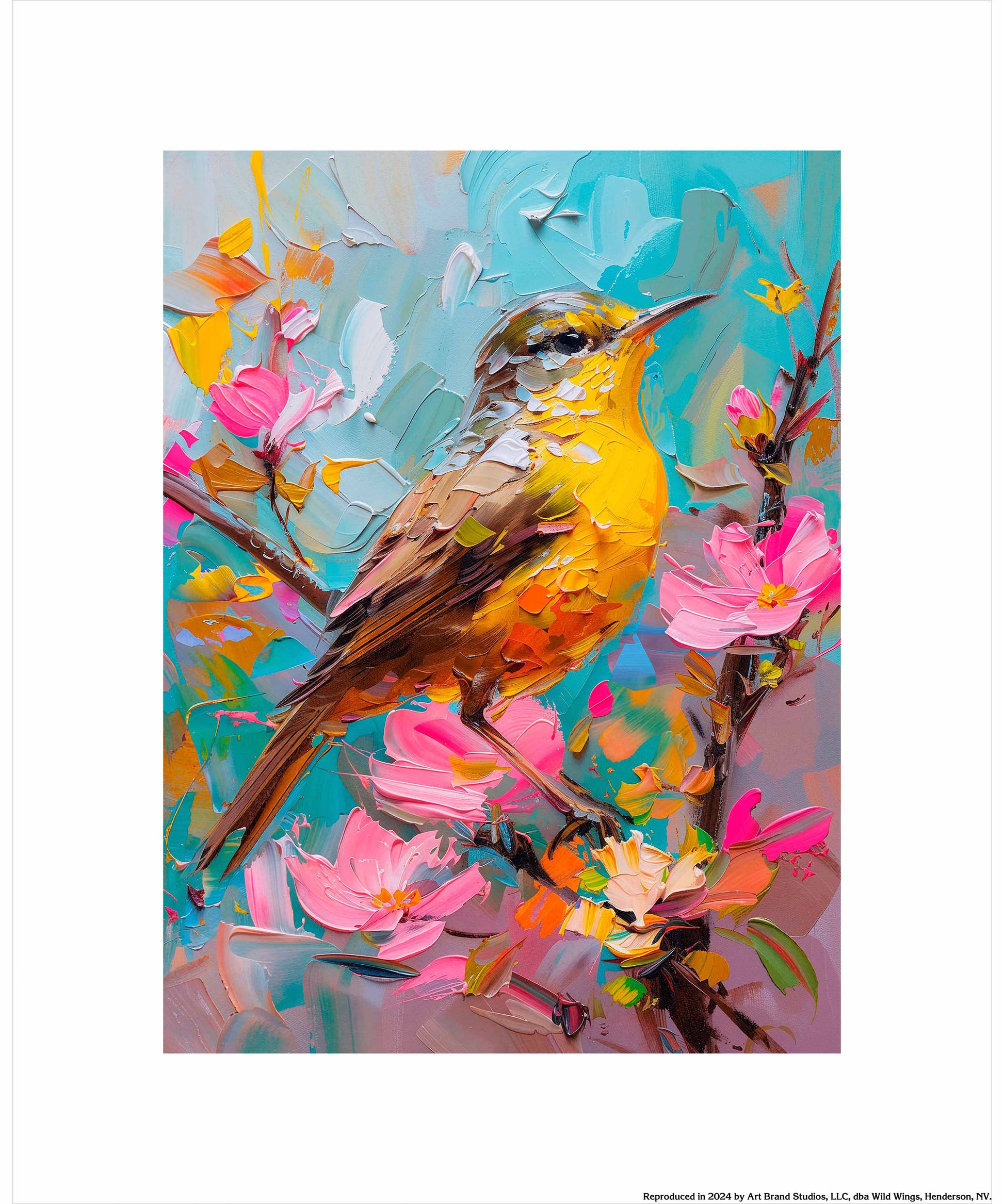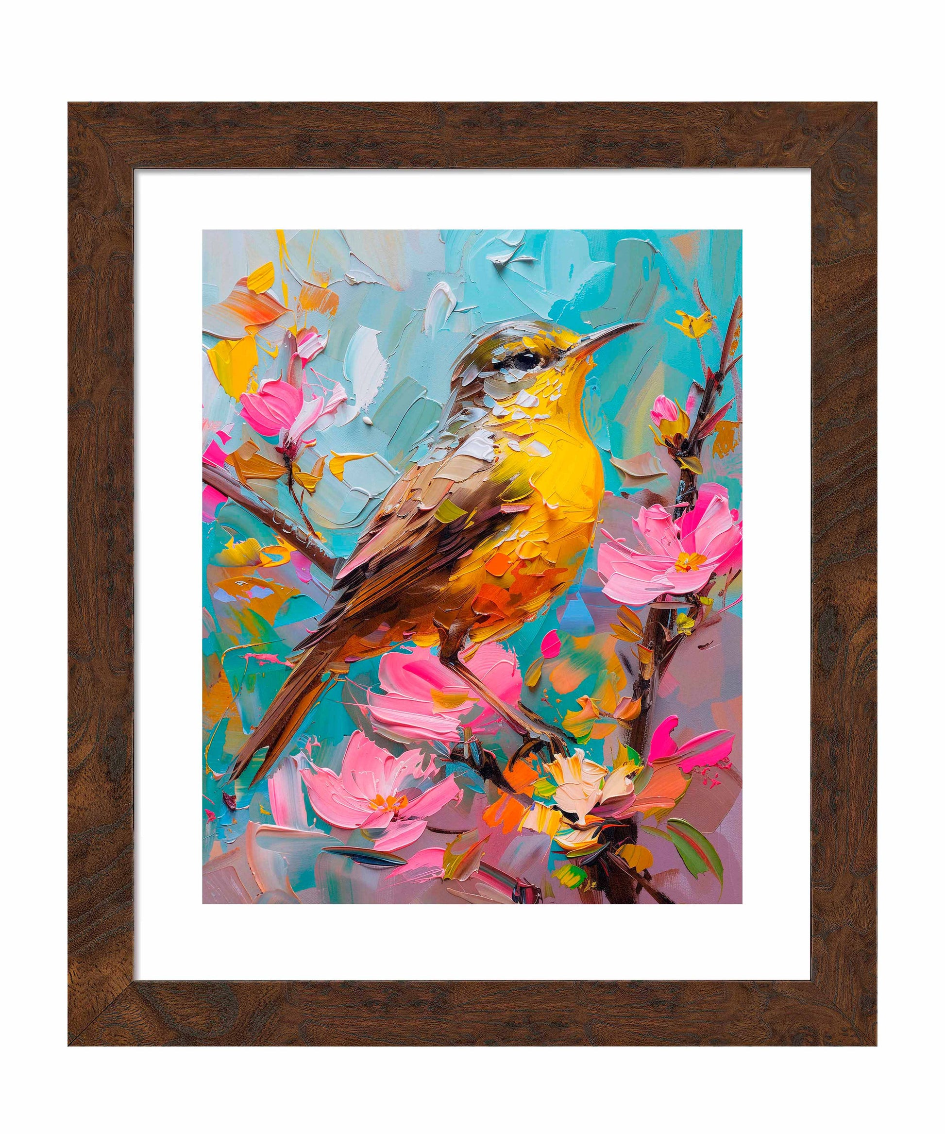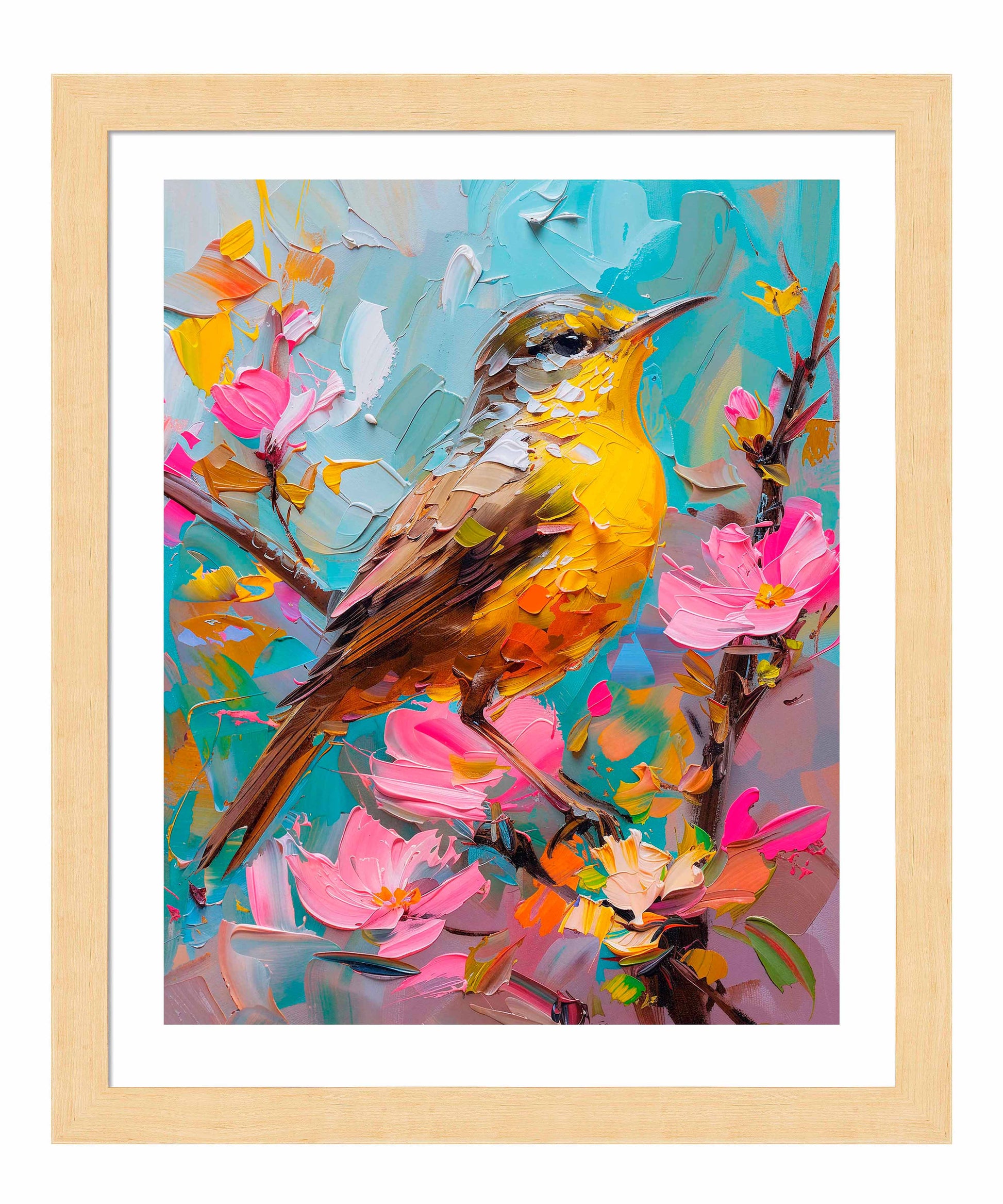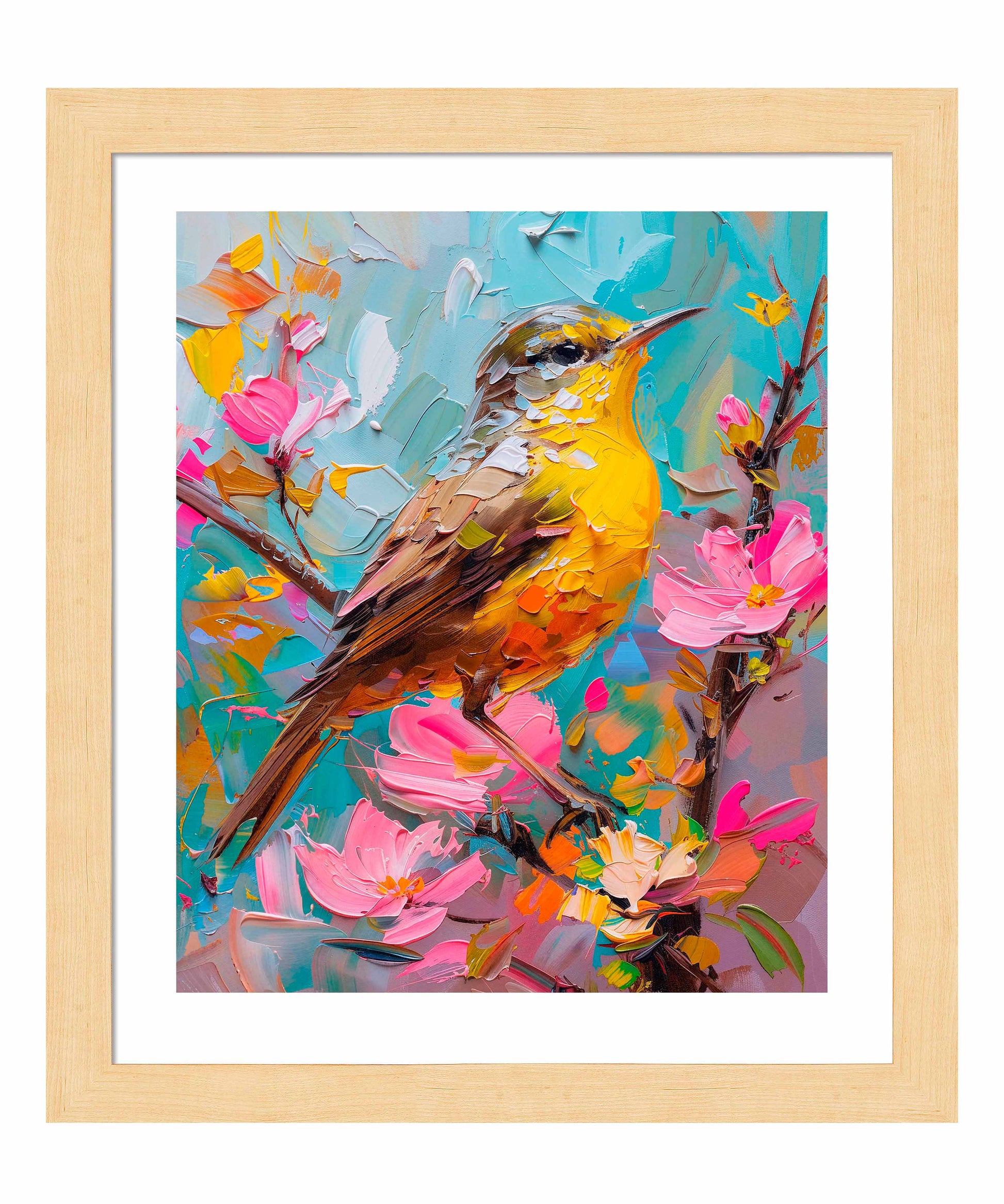 Spring Symphony - Warbler Among Blossoms is a vibrant and expressive painting that captures the lively essence of a warbler perched amidst a cascade of blooming flowers. The warbler, painted in brilliant shades of yellow and brown, stands out against the dynamic background of pink and orange blossoms, all rendered with bold, textured brushstrokes. The use of bright turquoise and soft pastels in the background creates a harmonious and uplifting atmosphere, highlighting the exuberant spirit of spring.