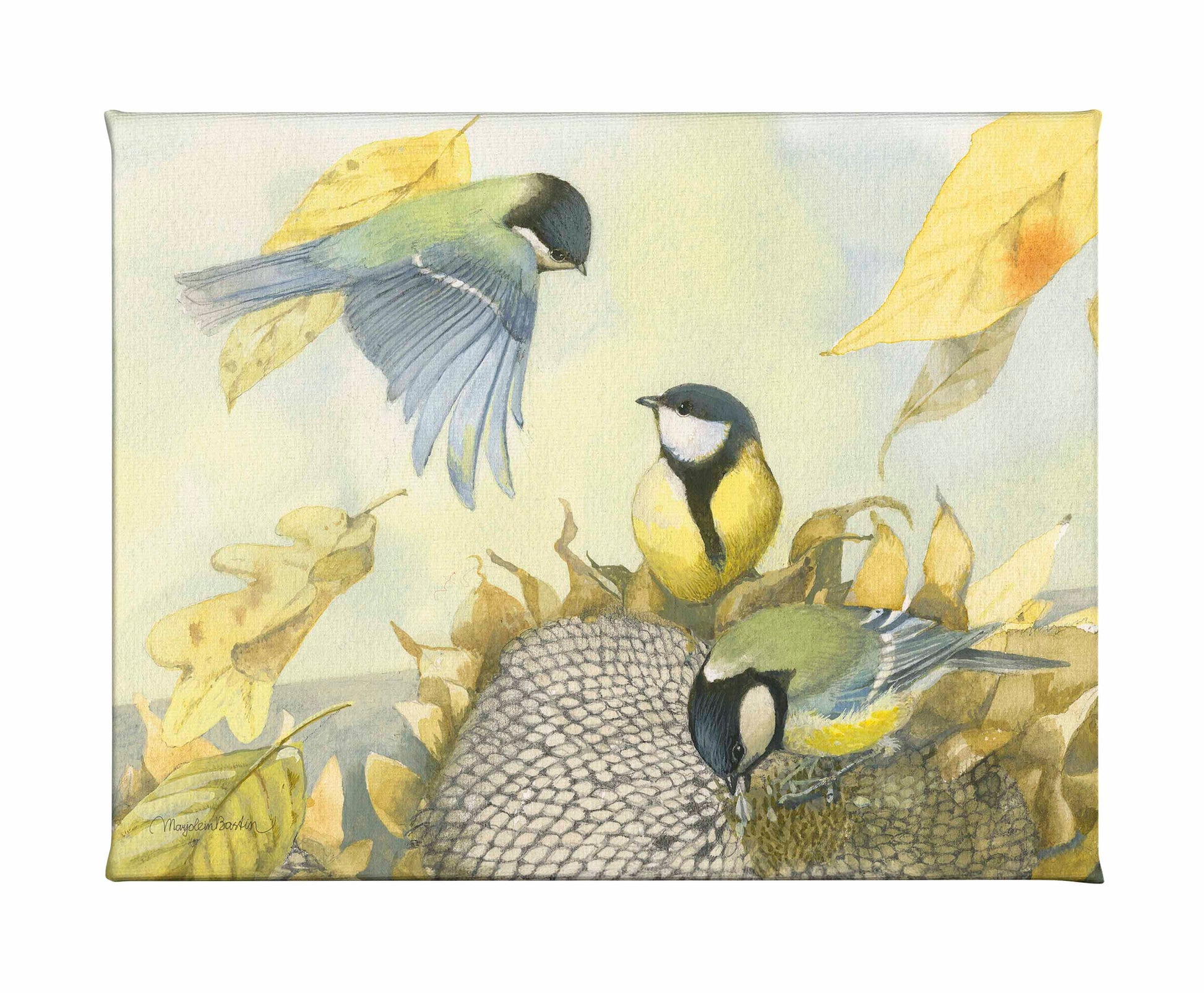 Sure, I could use the sunflowers from my herb garden for a beautiful bouquet. But this is a lot more fun! I’m leaving the flowers on the plant to fully mature and seeds to form. Then I cut them off and place them on a table right in front of my studio. Of course the Great tits are some of the first to take advantage but I have seen a variety of small birds, including woodpeckers, robins, blackbirds and finches.