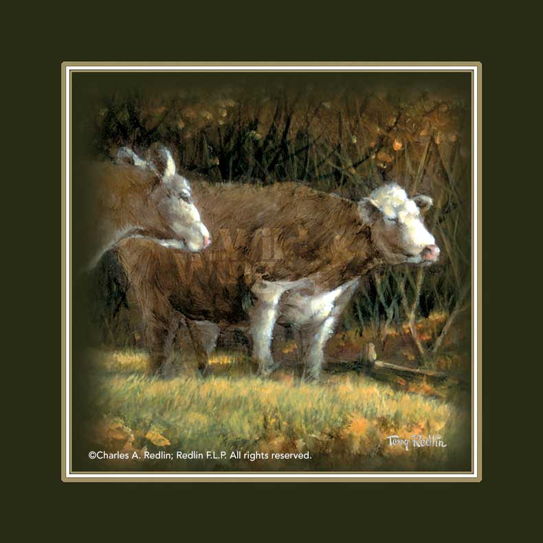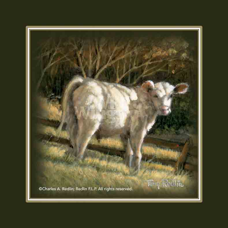 On this serene morning, all of God's creatures are congregating. The humans have arrived in cars and buggies. The deer slowly stir. The cows amble contentedly toward their morning drink. Suddenly, the calf becomes aware of strangers across the stream. In response, the young doe rises, ears alert, and intently watches the intruders approach. After a few moments of mutual inspection, both cows and deer will continue on with their business. High above the steeple, the circling pigeons have been scattered by ringing bells.