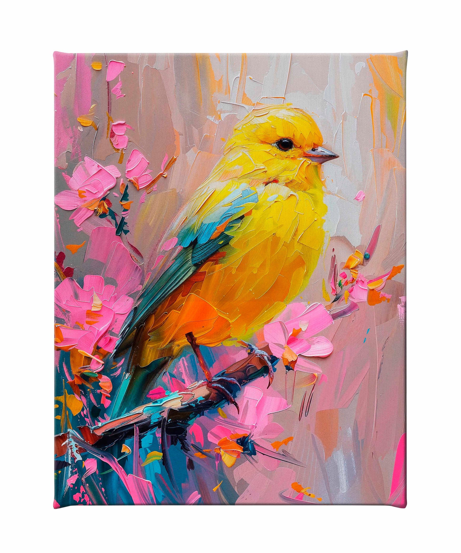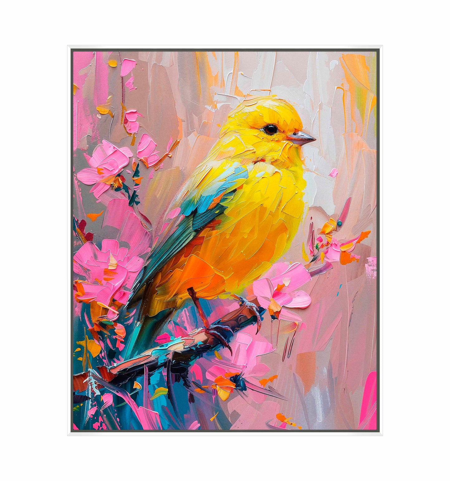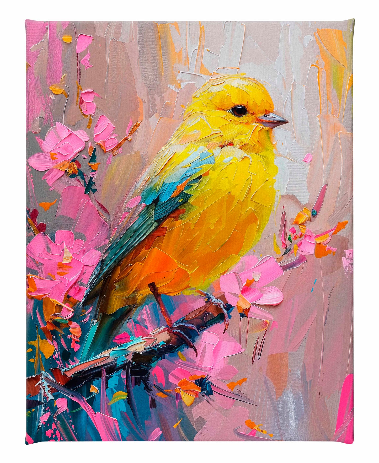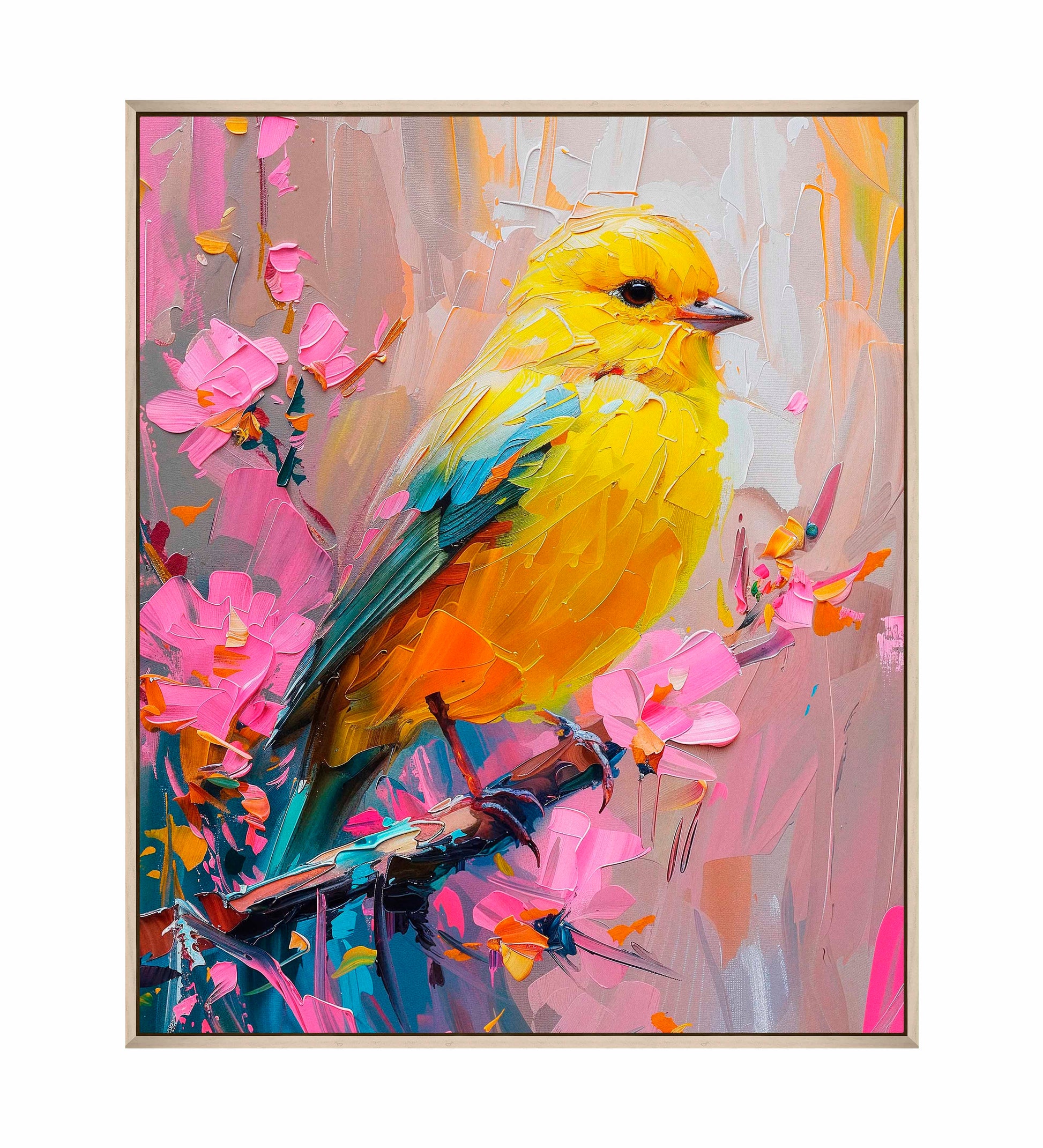 Sunlit Song - Warbler is an exuberant and dynamic painting that captures the radiant beauty of a warbler perched amidst a cascade of vibrant blossoms. The warbler, painted in brilliant shades of yellow with touches of green and blue, stands out against the lively background of pink flowers, all rendered with expressive, textured brushstrokes. The use of bold colors and thick layers of paint creates a sense of movement and vitality, bringing the scene to life.
