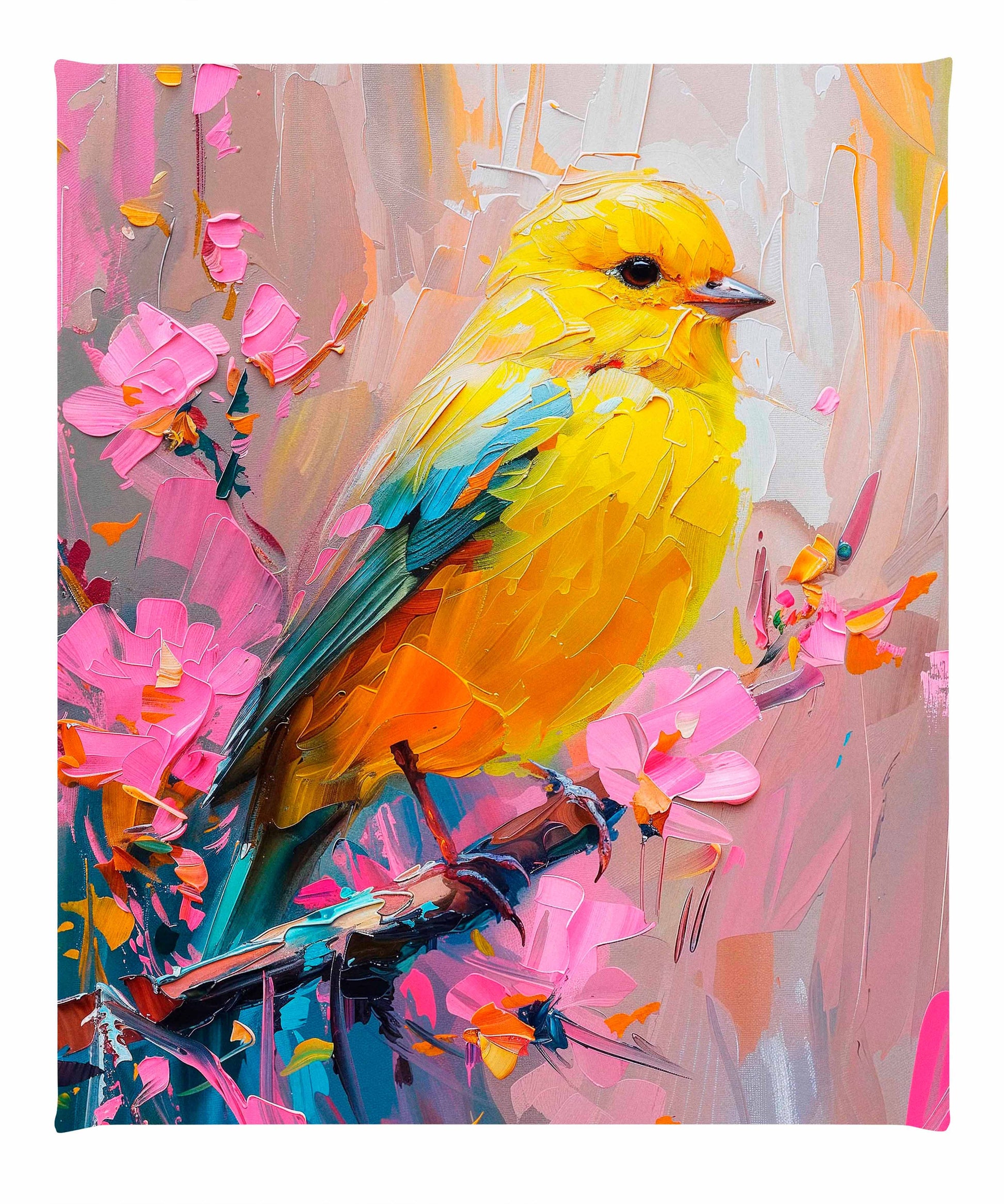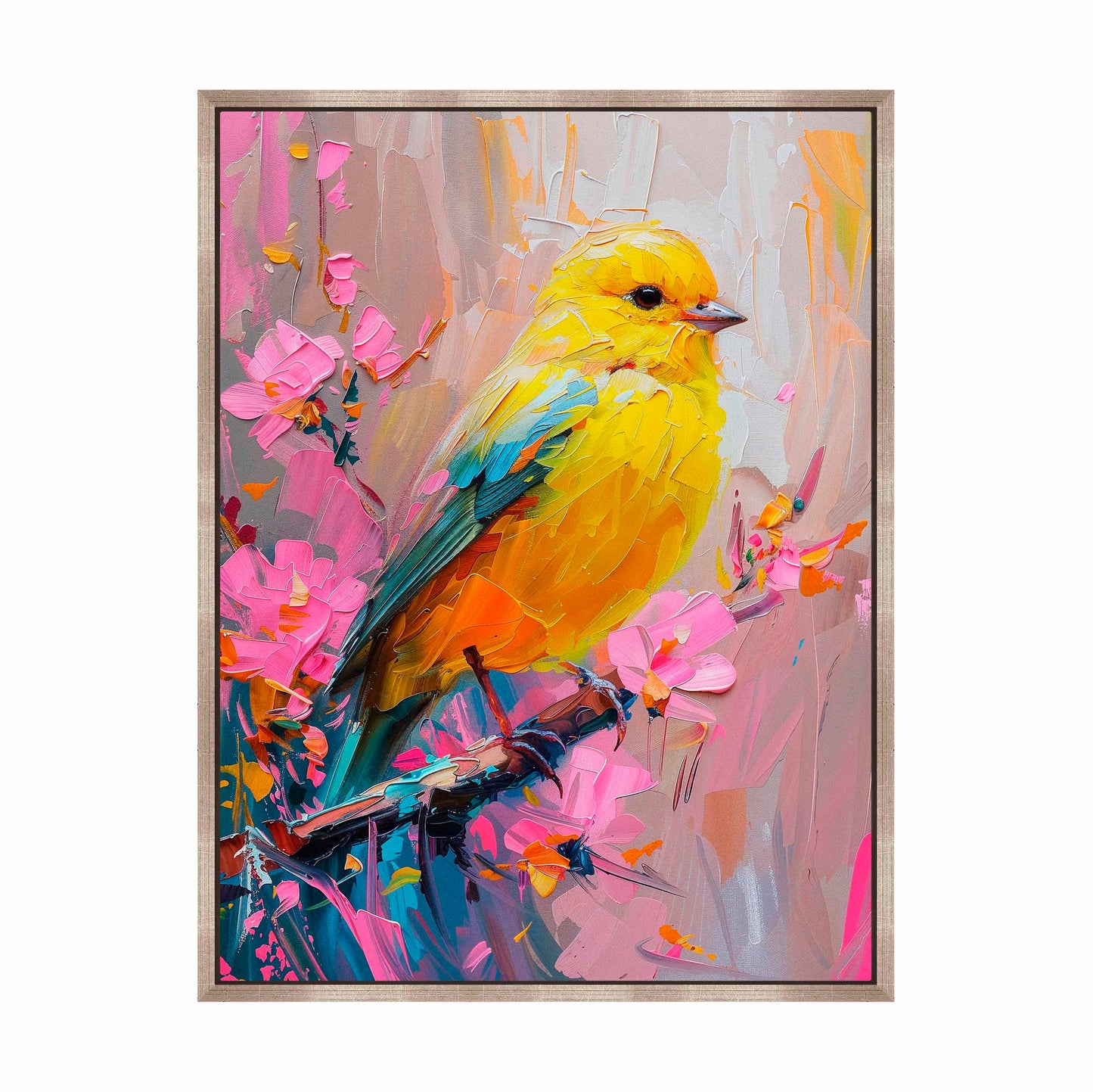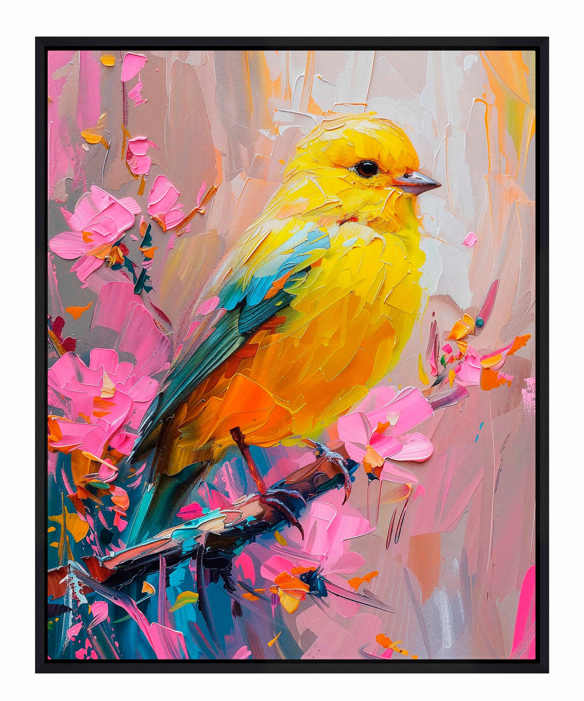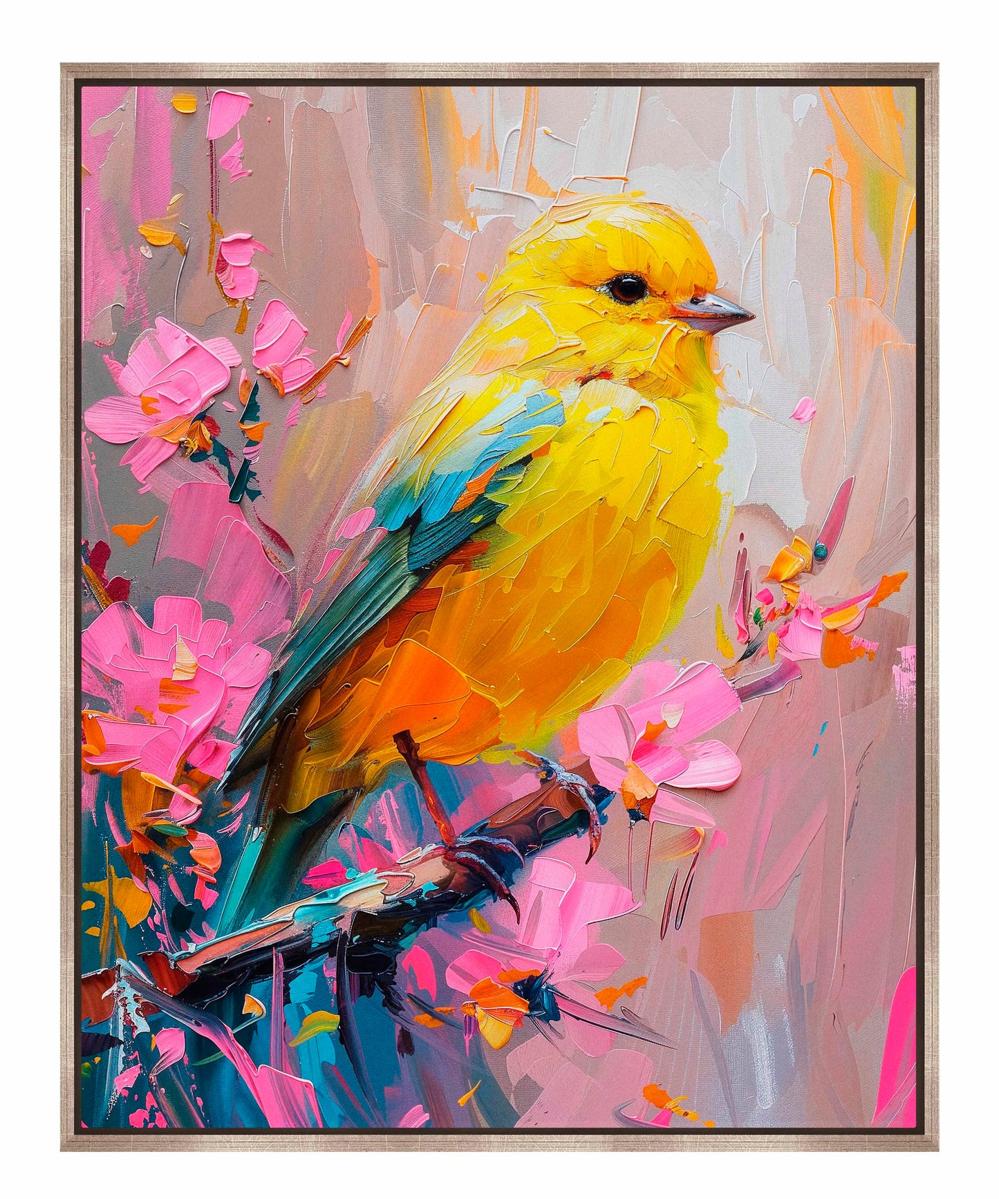 Sunlit Song - Warbler is an exuberant and dynamic painting that captures the radiant beauty of a warbler perched amidst a cascade of vibrant blossoms. The warbler, painted in brilliant shades of yellow with touches of green and blue, stands out against the lively background of pink flowers, all rendered with expressive, textured brushstrokes. The use of bold colors and thick layers of paint creates a sense of movement and vitality, bringing the scene to life.