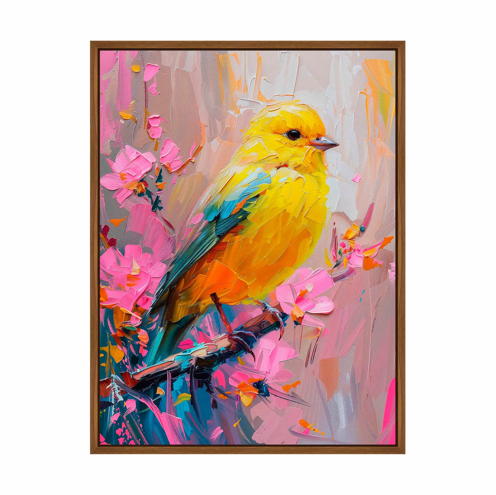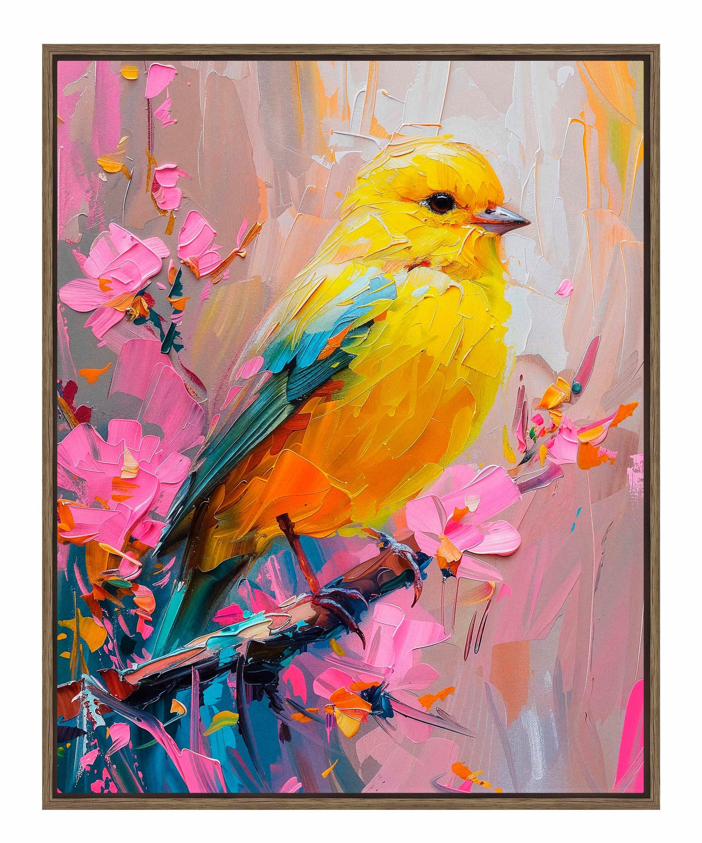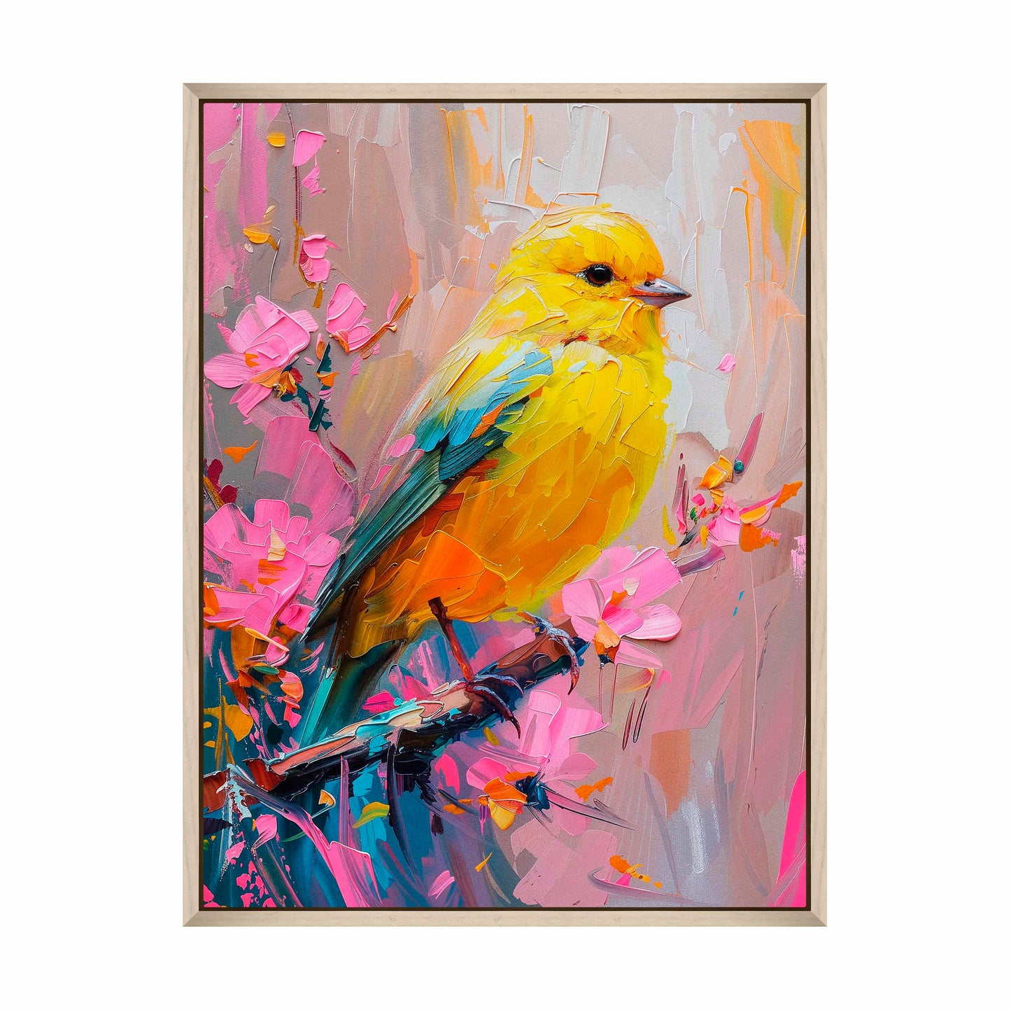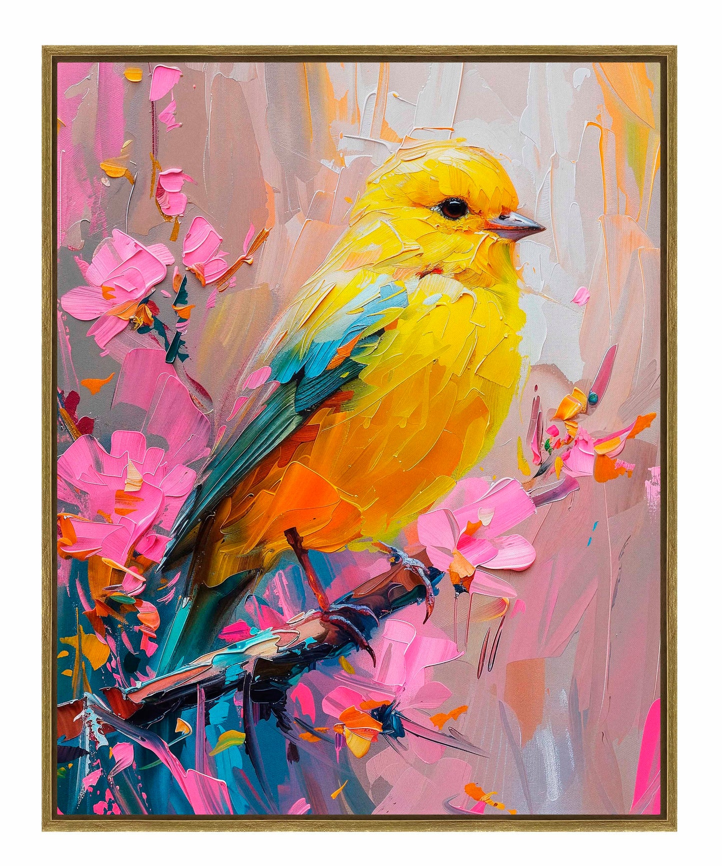 Sunlit Song - Warbler is an exuberant and dynamic painting that captures the radiant beauty of a warbler perched amidst a cascade of vibrant blossoms. The warbler, painted in brilliant shades of yellow with touches of green and blue, stands out against the lively background of pink flowers, all rendered with expressive, textured brushstrokes. The use of bold colors and thick layers of paint creates a sense of movement and vitality, bringing the scene to life.