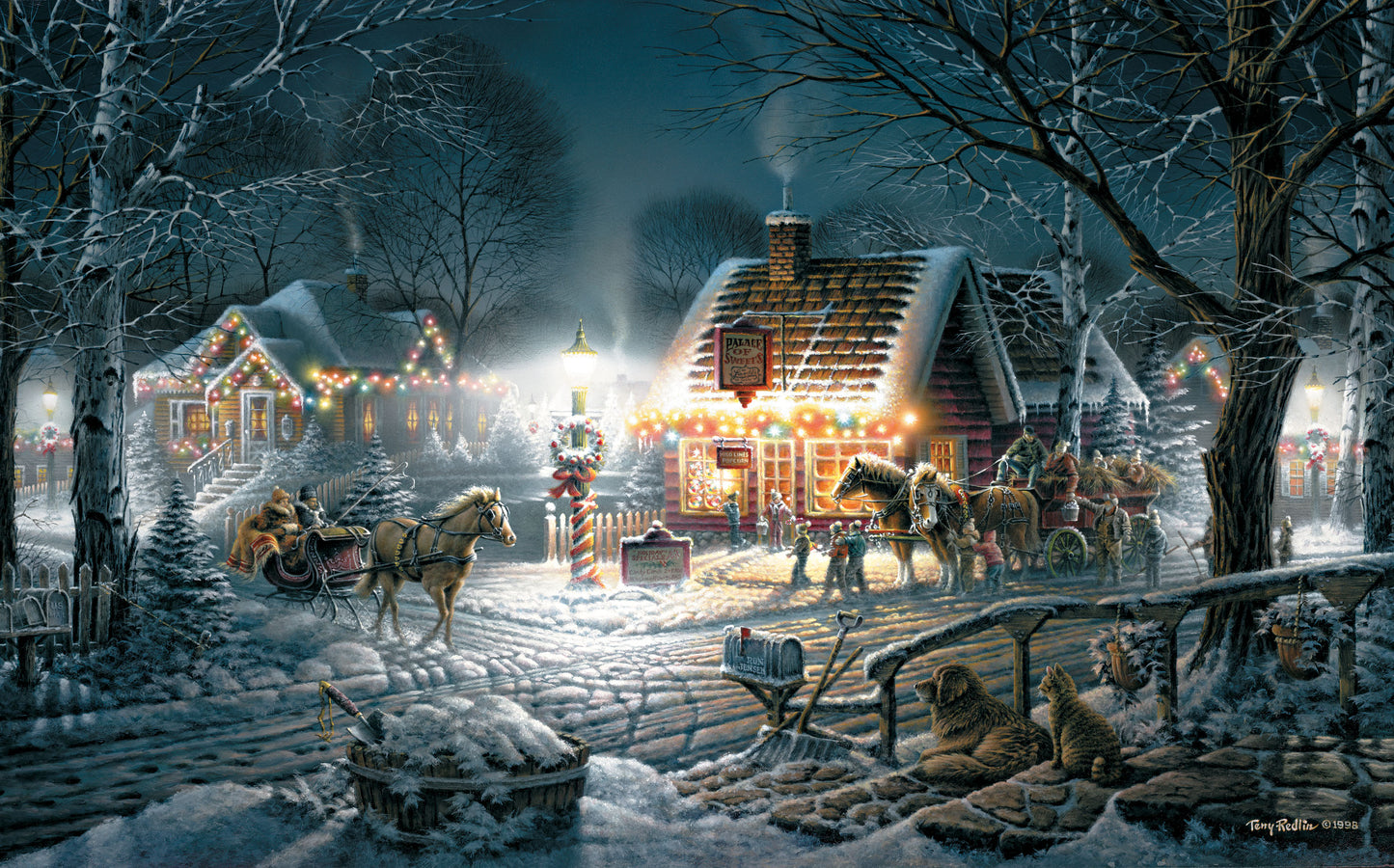 The Palace of Sweets, a neighborhood candy store, was an actual place in the artist's youth. In this painting he remembers that nostalgic time during the Christmas season. The area homes are gaily decorated and the corner lampost is a work of art with wreath, bow and strips of twirled bunting. A wagonload of children on a holiday hayride have stopped for a bit of shopping."