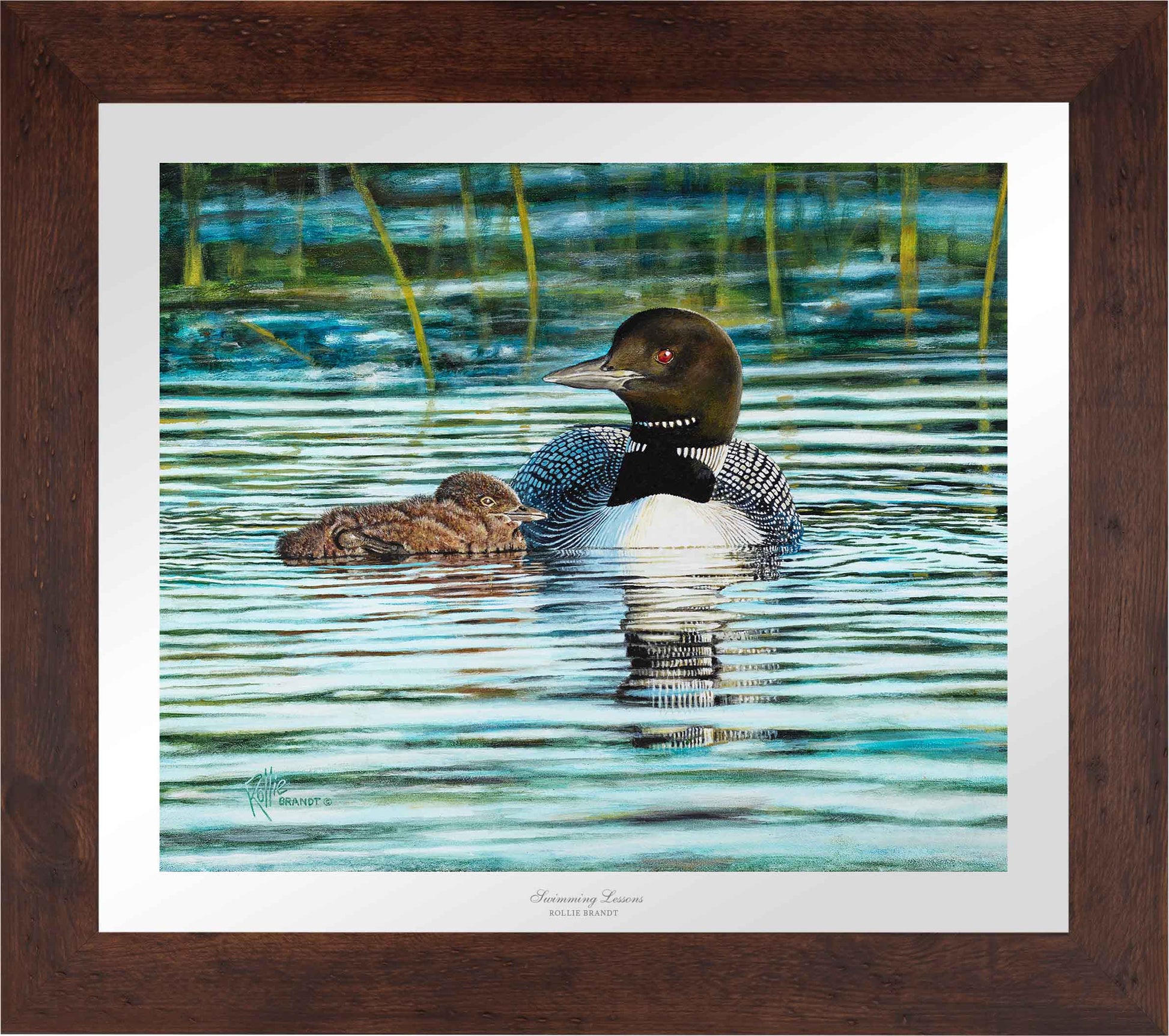 This was such fun to paint both the water/reflections and our beautiful state bird mothering her little Loonchick.