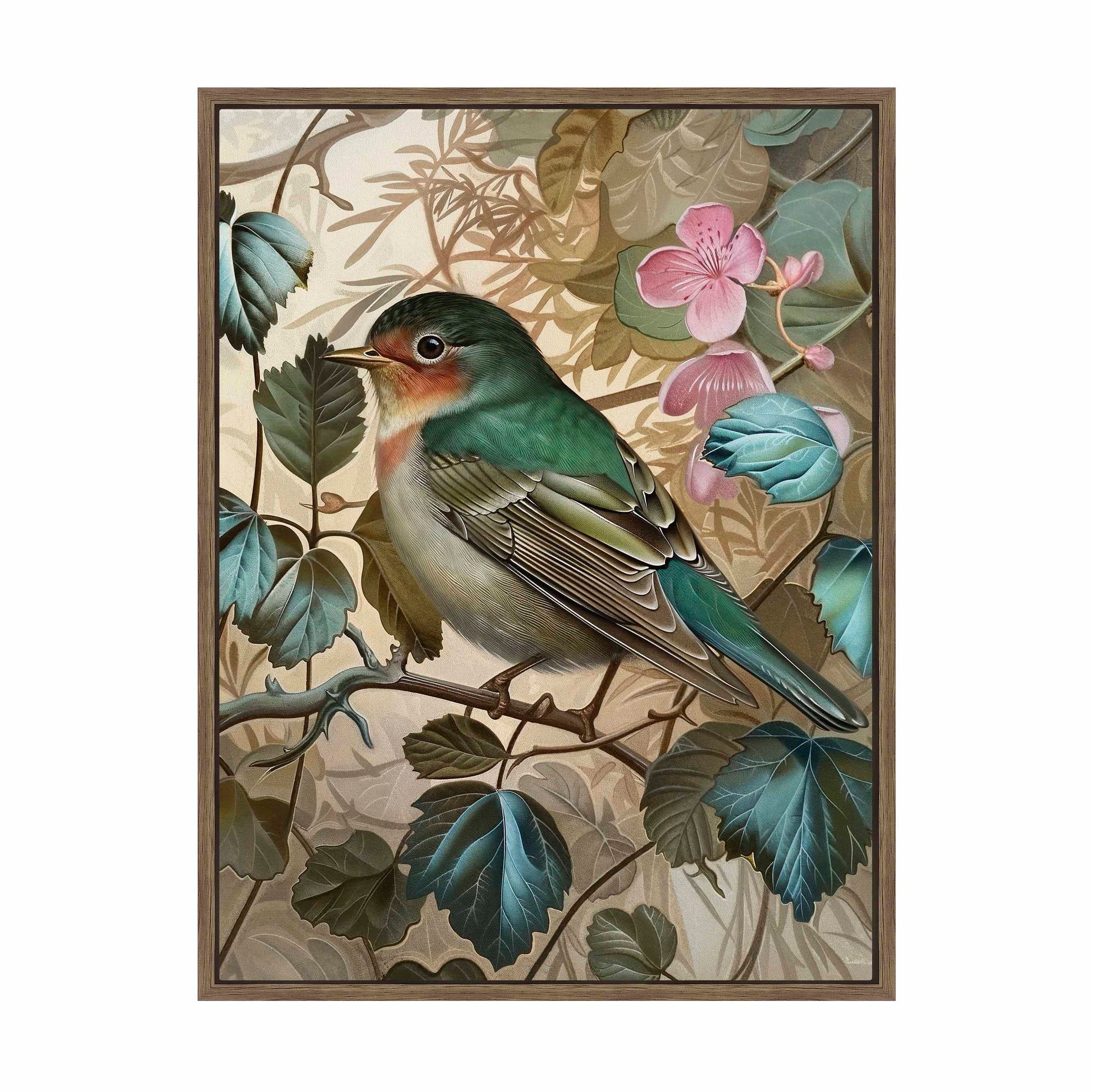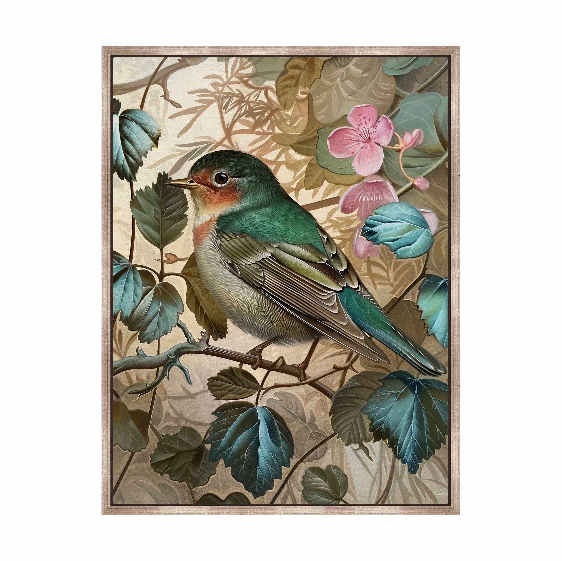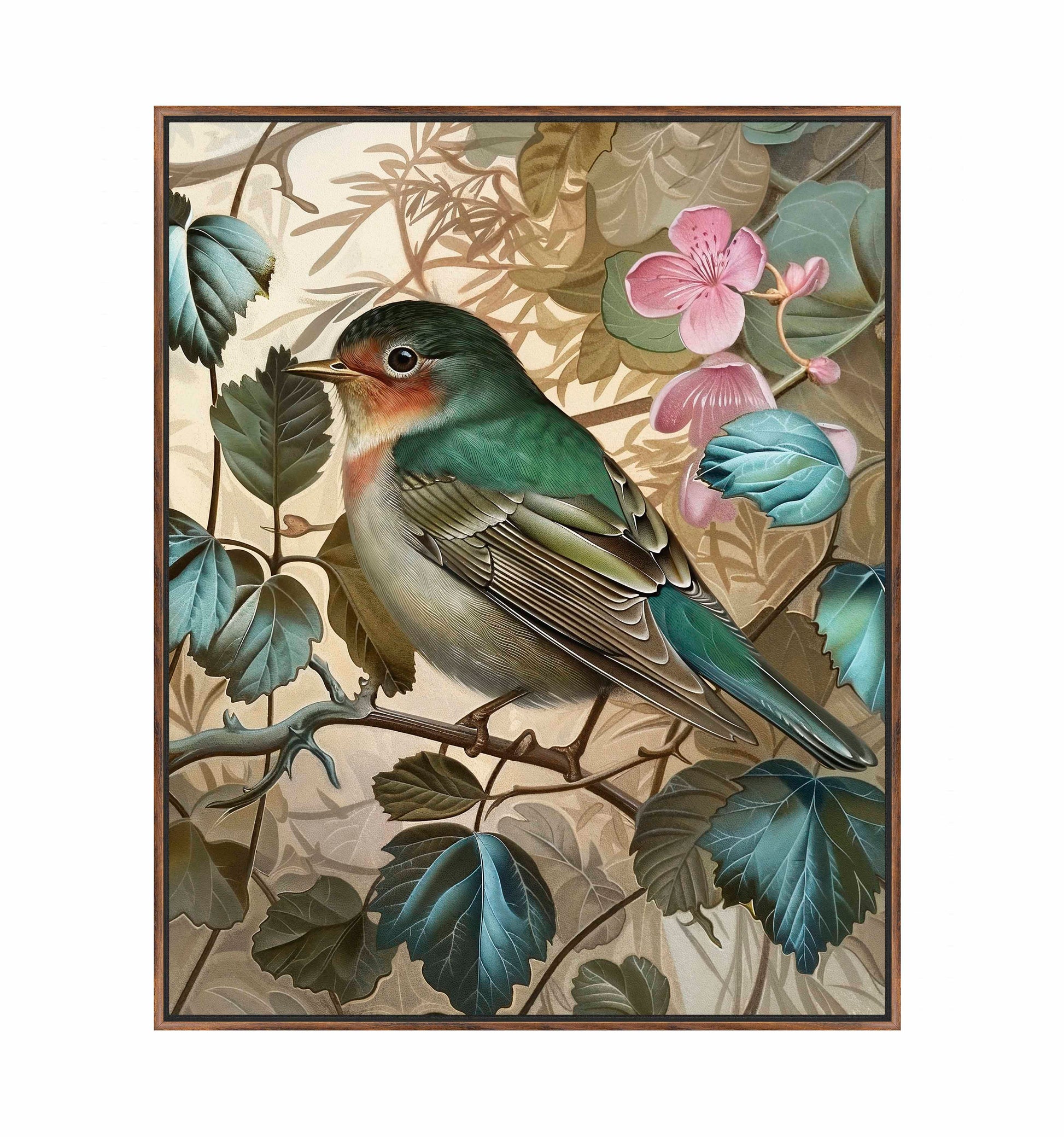Sweet Melody - Songbird Among Blossoms is a captivating piece from the Sonora Emerald Collection, showcasing the delicate beauty and serene presence of a songbird perched gracefully among lush foliage and blooming flowers. The songbird, with its vibrant green and soft pink plumage, is meticulously detailed, highlighting the intricate patterns and textures of its feathers. The background of rich green leaves and soft pink blossoms adds a harmonious and tranquil ambiance to the composition.