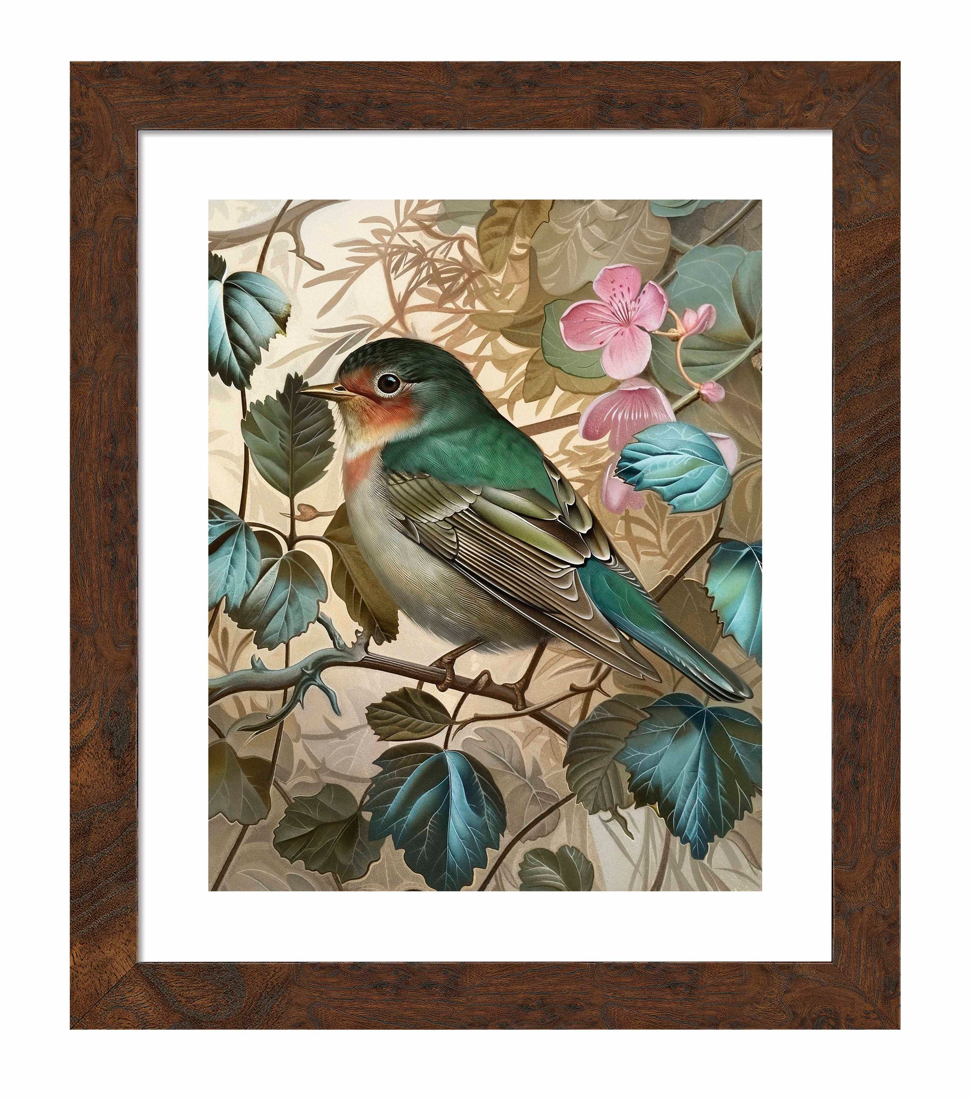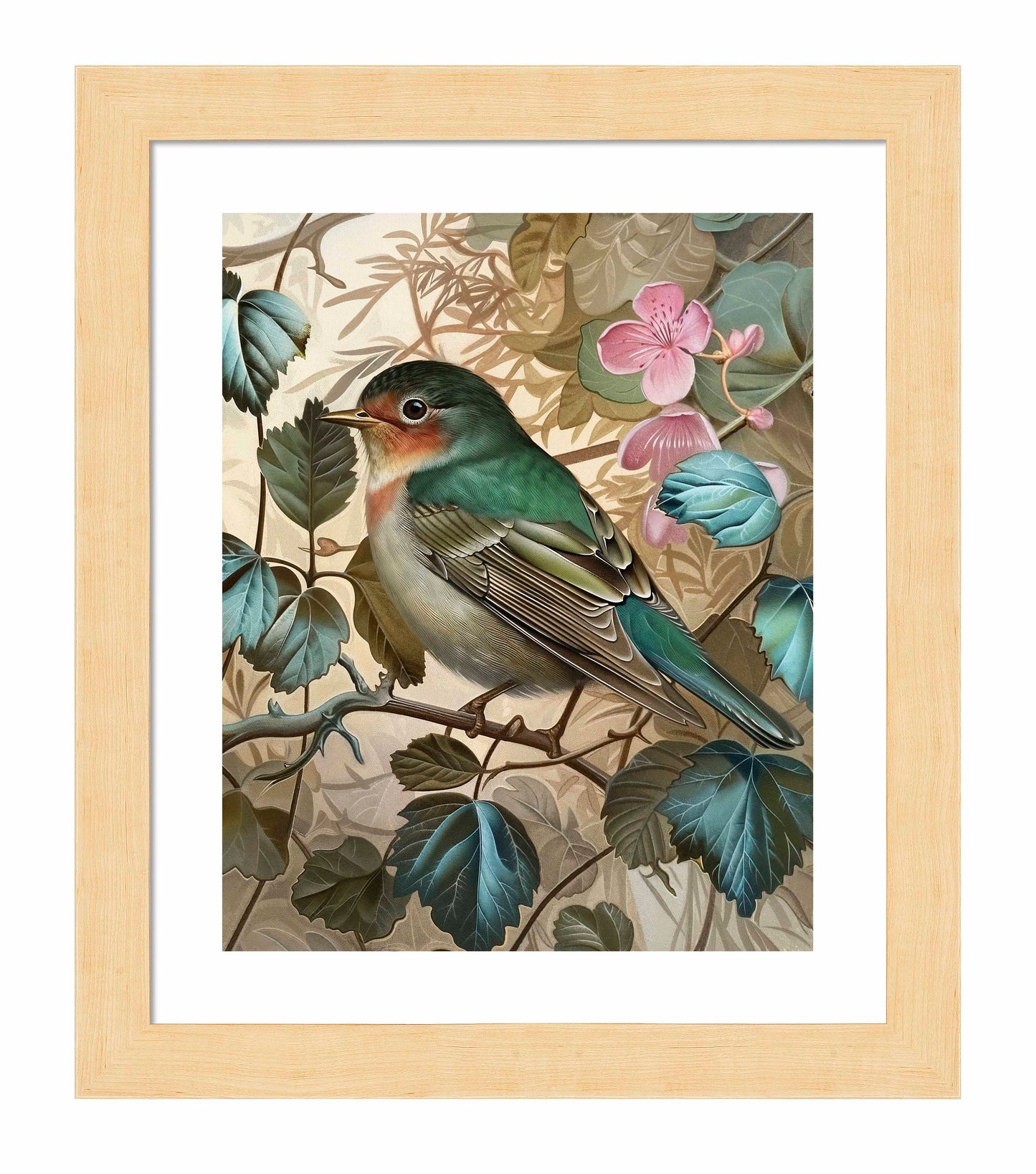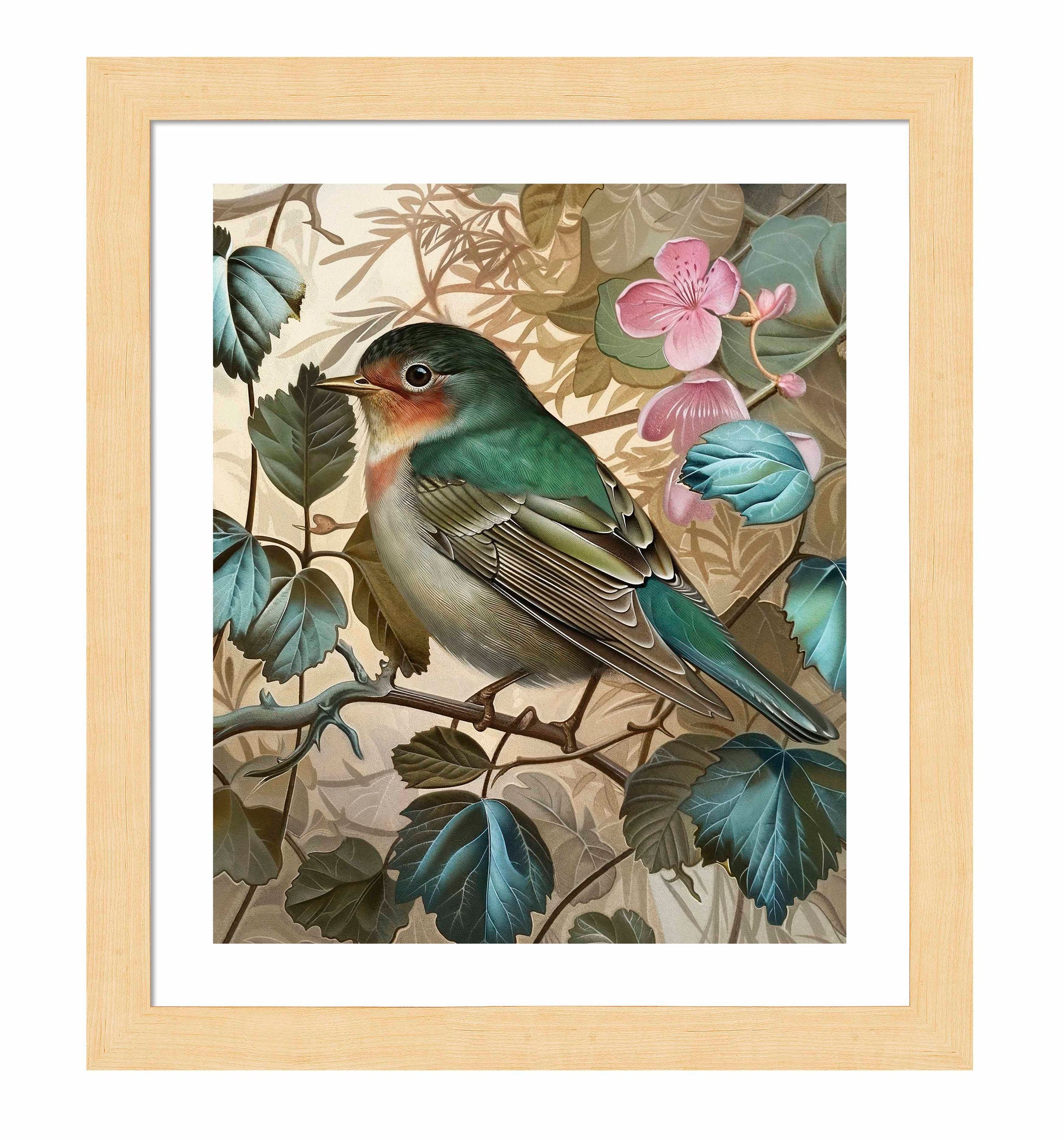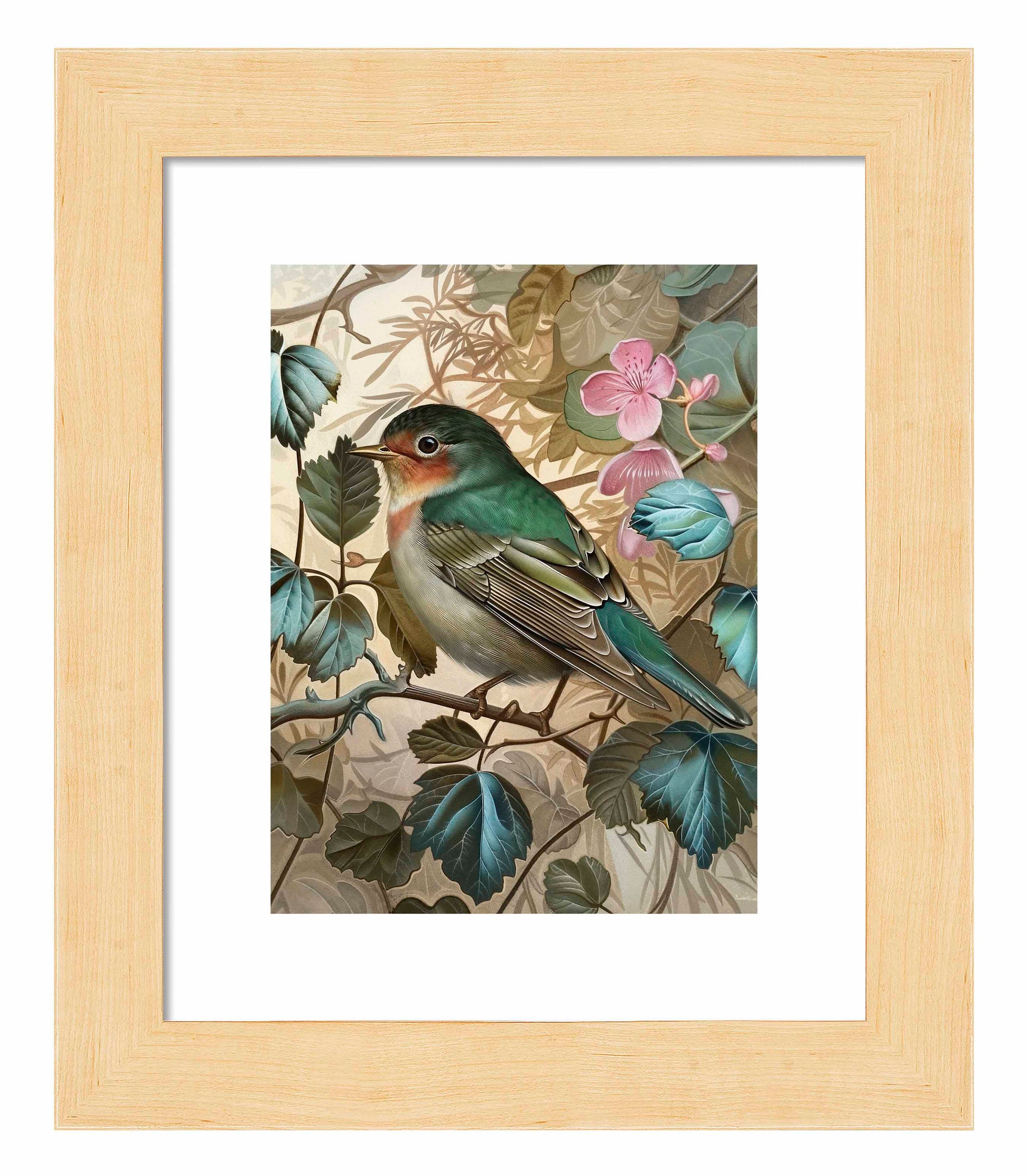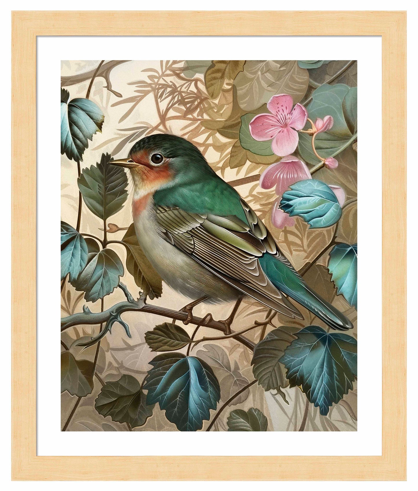 Sweet Melody - Songbird Among Blossoms is a captivating piece from the Sonora Emerald Collection, showcasing the delicate beauty and serene presence of a songbird perched gracefully among lush foliage and blooming flowers. The songbird, with its vibrant green and soft pink plumage, is meticulously detailed, highlighting the intricate patterns and textures of its feathers. The background of rich green leaves and soft pink blossoms adds a harmonious and tranquil ambiance to the composition.