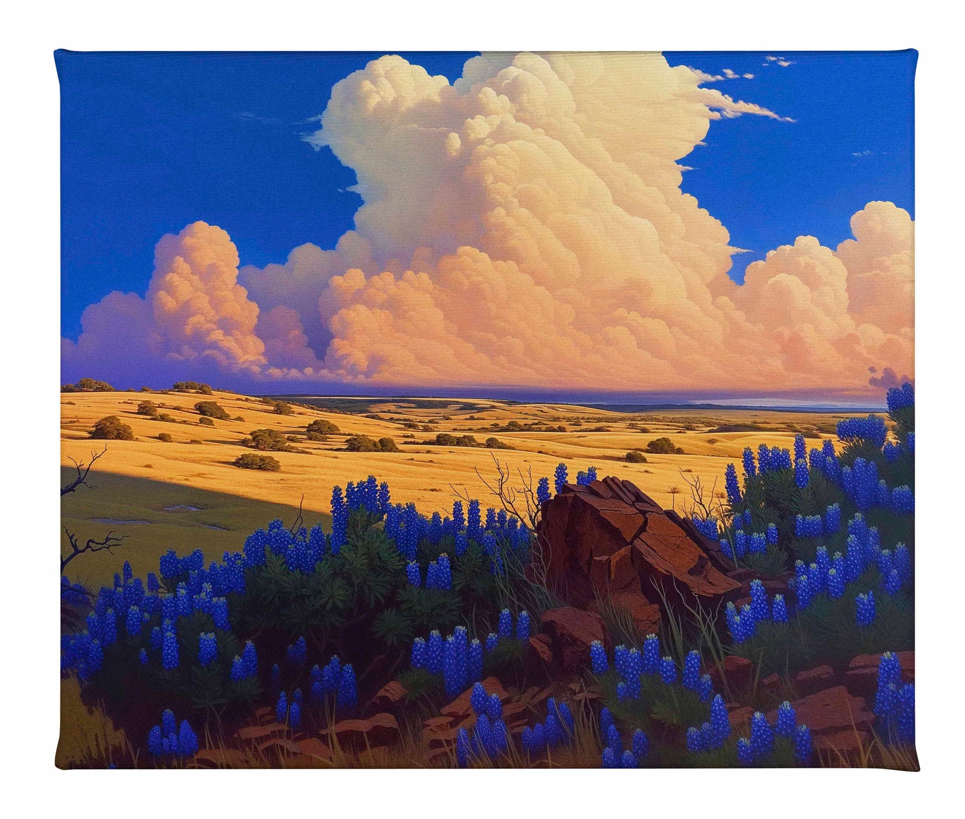 This painting showcases the expansive Texas landscape beneath a vast, cloud-filled sky. The dramatic cumulus clouds, bathed in the warm light of the setting sun, rise majestically against the deep blue sky, creating a stunning contrast. The golden fields stretch into the distance, their subtle variations in tone and texture adding depth to the composition. In the foreground, vibrant bluebonnets stand out against the rich, earthy tones of the rocks, adding a splash of color to the scene. The presence of sparse vegetation and distant silhouettes of trees enhances the sense of isolation and tranquility, emphasizing the vastness of the Texan plains. This piece captures the serene beauty and grandeur of Texas, inviting the viewer to immerse themselves in the quiet majesty of the landscape.