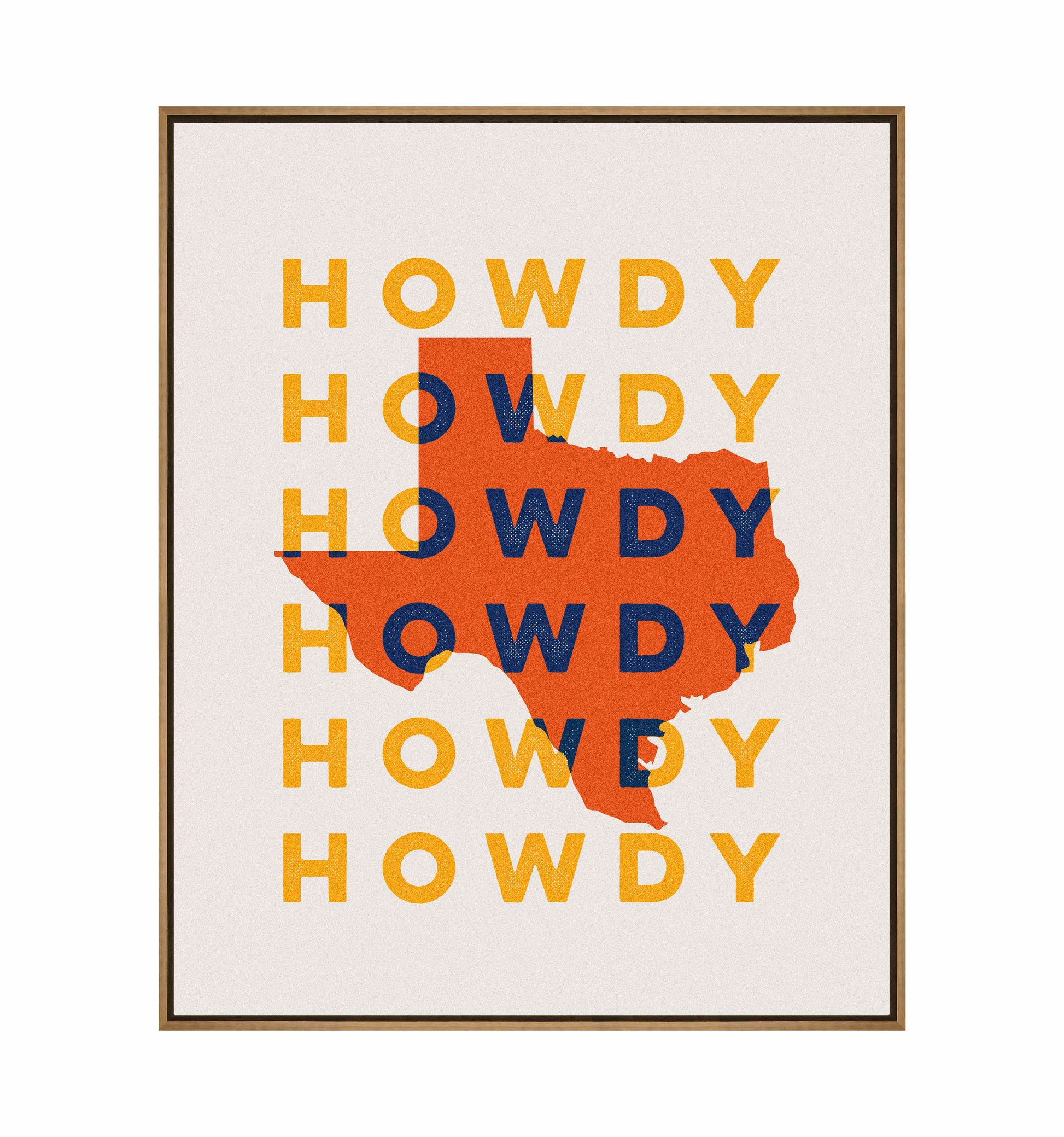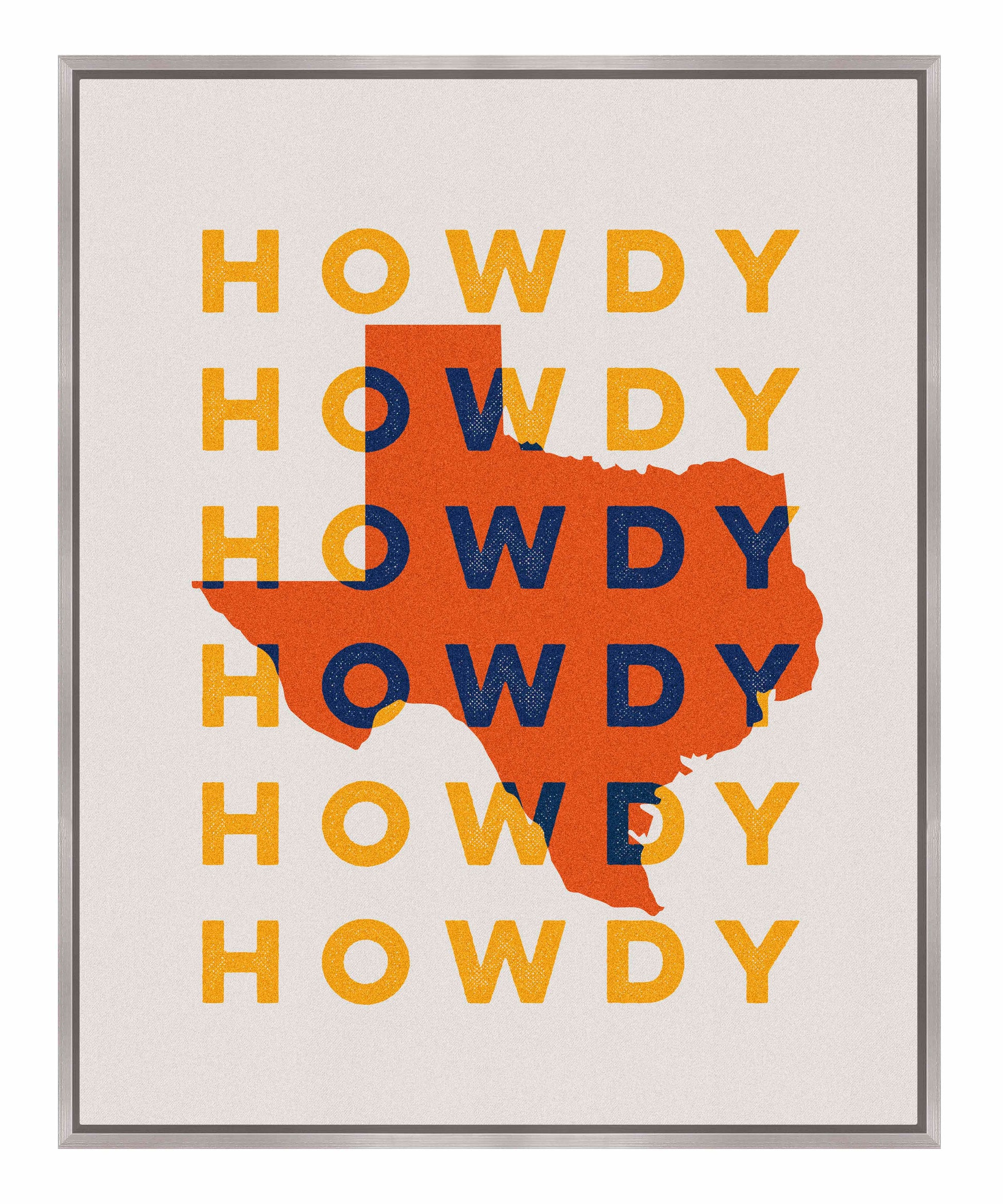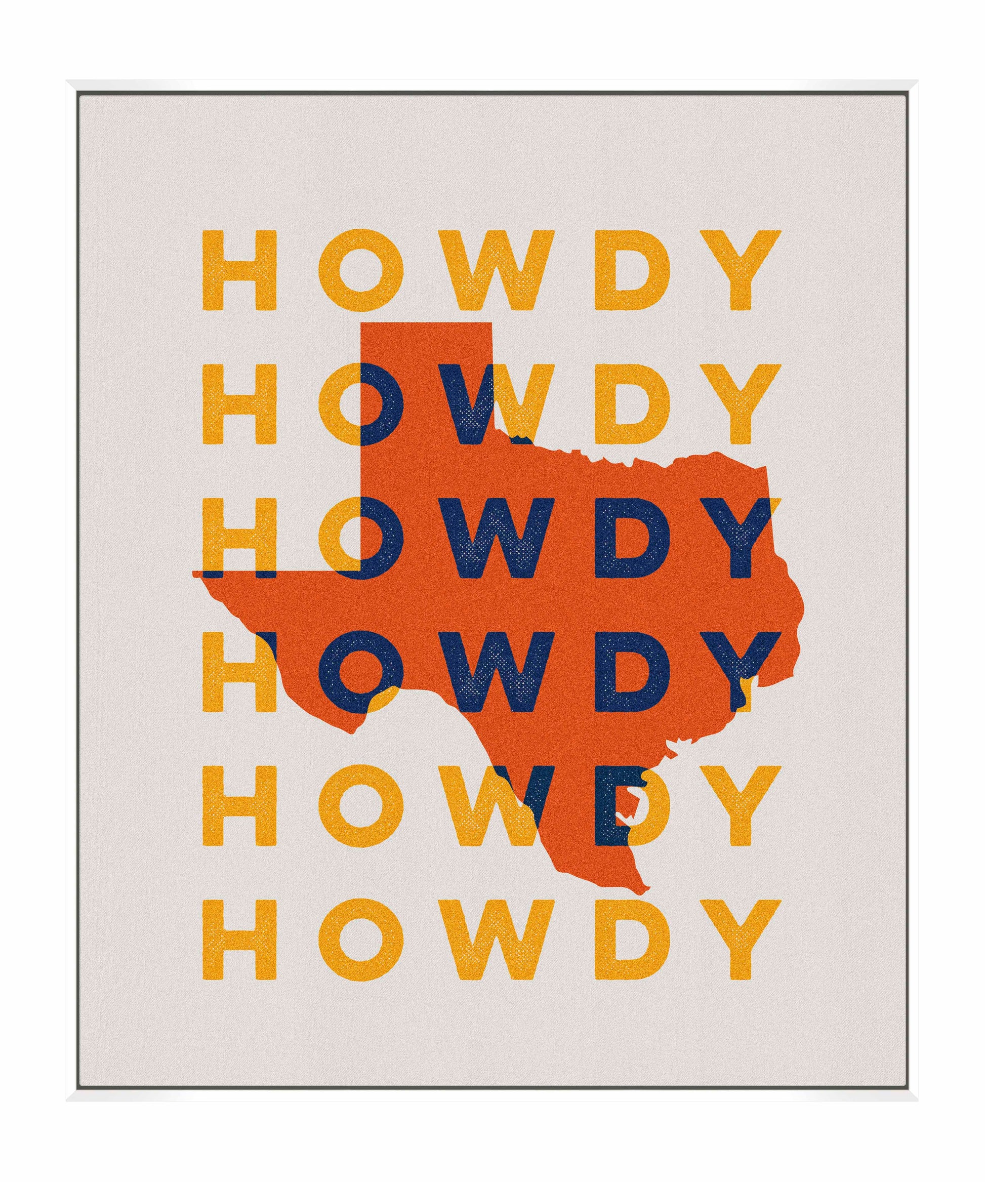 "Texas Howdy B" fuses graphic minimalism with bold regional pride, creating a dynamic visual tribute to the Lone Star State. The composition prominently features the silhouette of Texas in vibrant orange, set against a repeating backdrop of the word “Howdy,” rendered in contrasting yellow and navy blue tones. This combination of warm and cool colors gives the piece a lively and welcoming energy, reflecting the spirit of Texas hospitality.