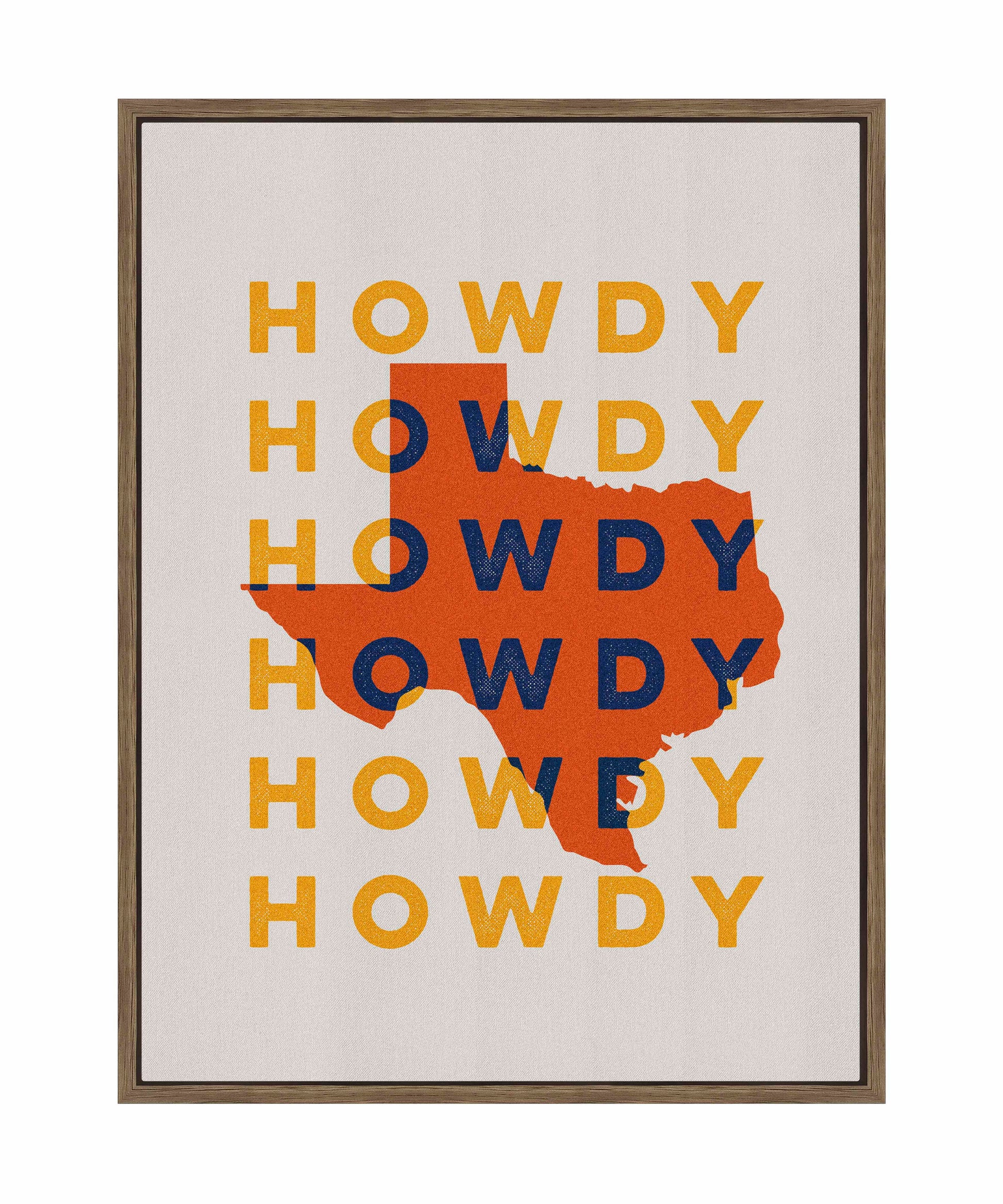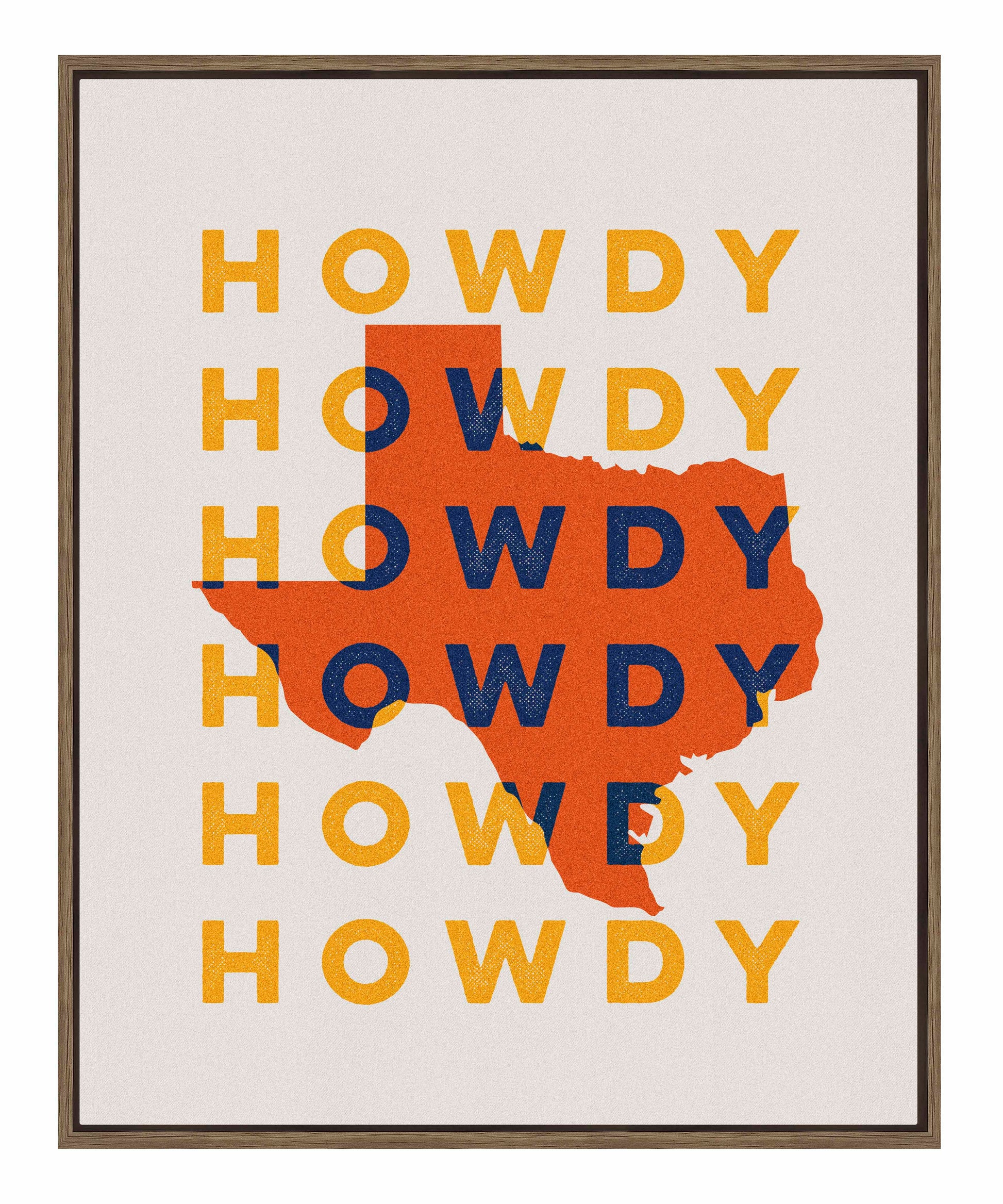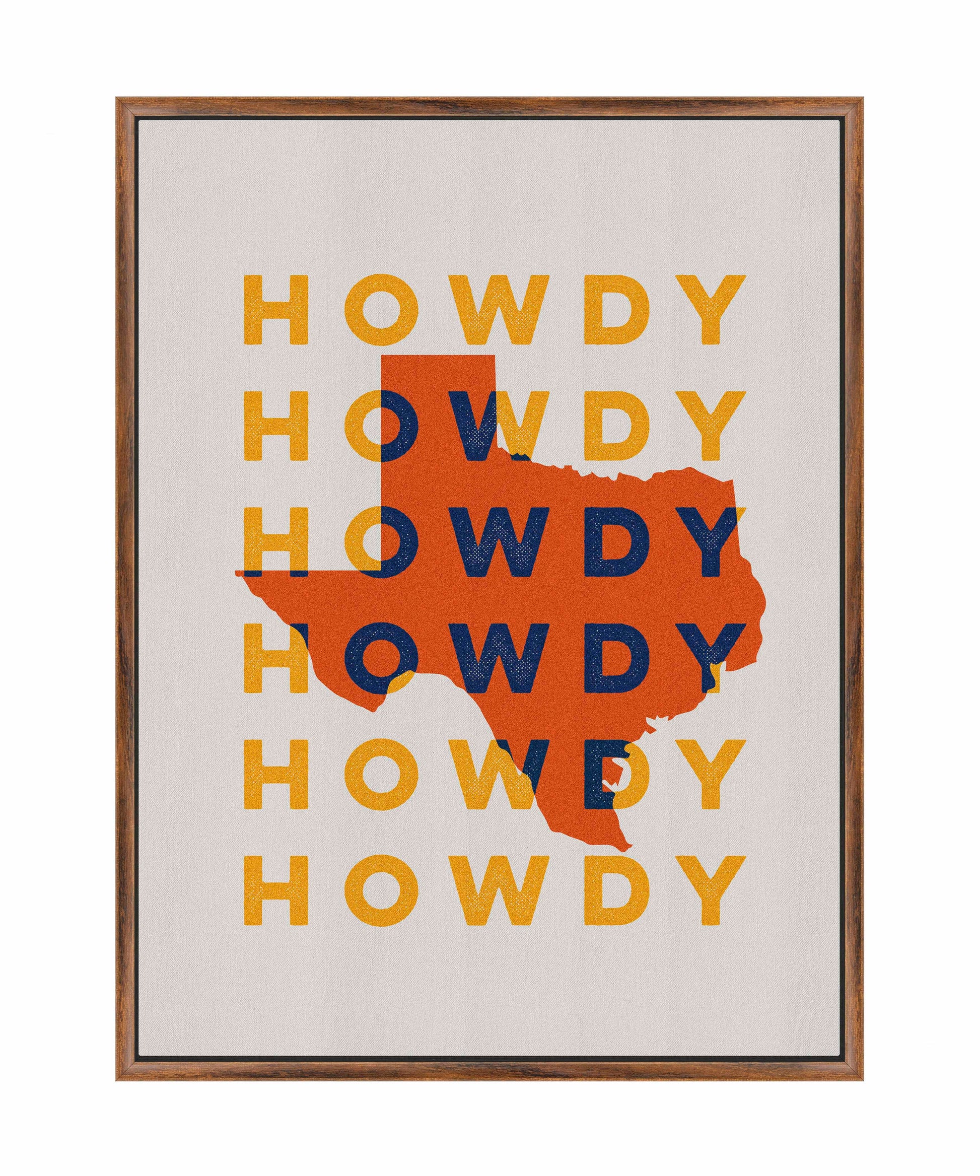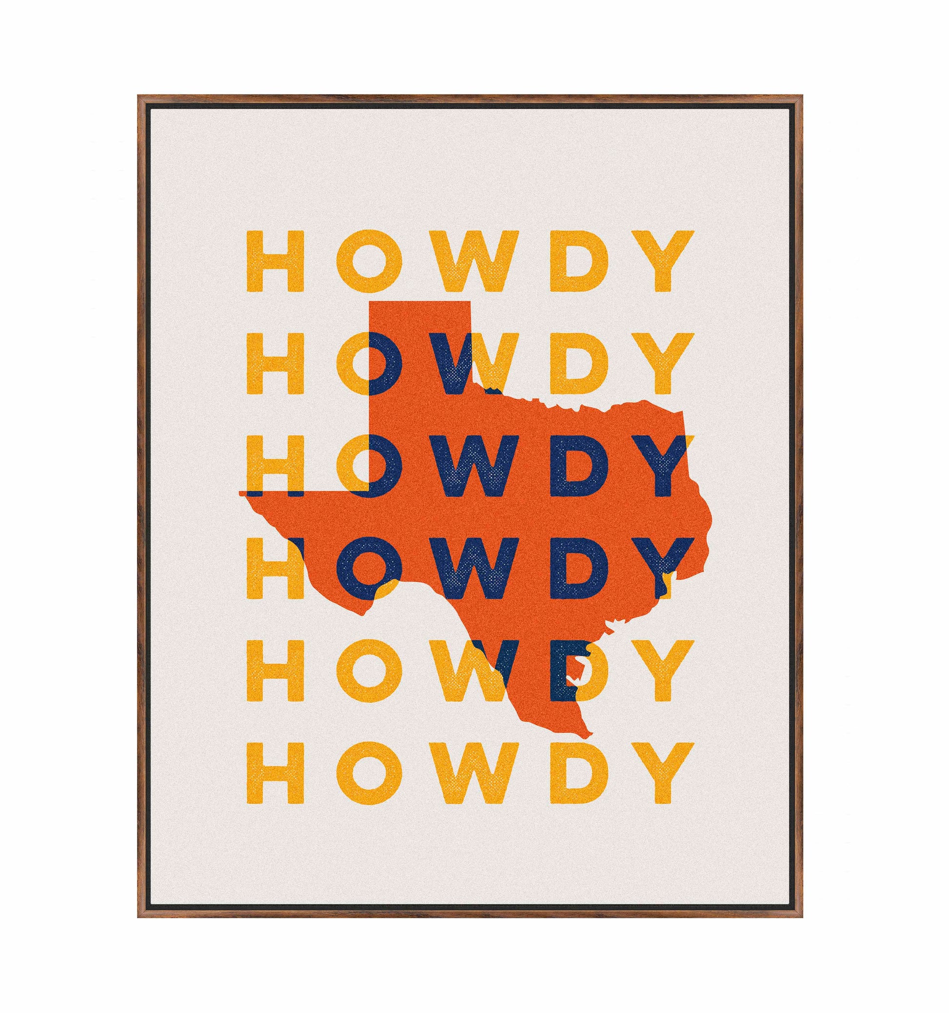 "Texas Howdy B" fuses graphic minimalism with bold regional pride, creating a dynamic visual tribute to the Lone Star State. The composition prominently features the silhouette of Texas in vibrant orange, set against a repeating backdrop of the word “Howdy,” rendered in contrasting yellow and navy blue tones. This combination of warm and cool colors gives the piece a lively and welcoming energy, reflecting the spirit of Texas hospitality.