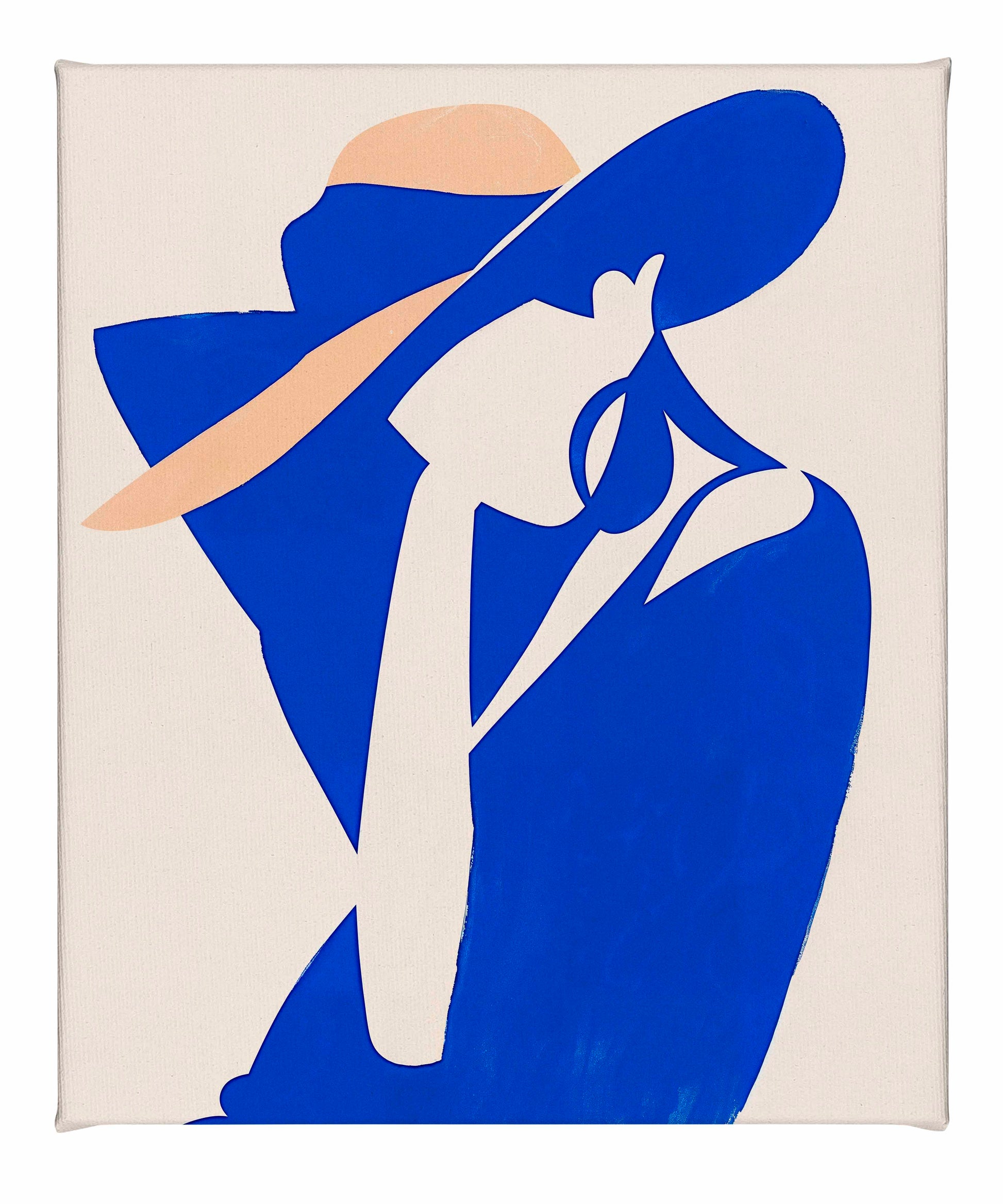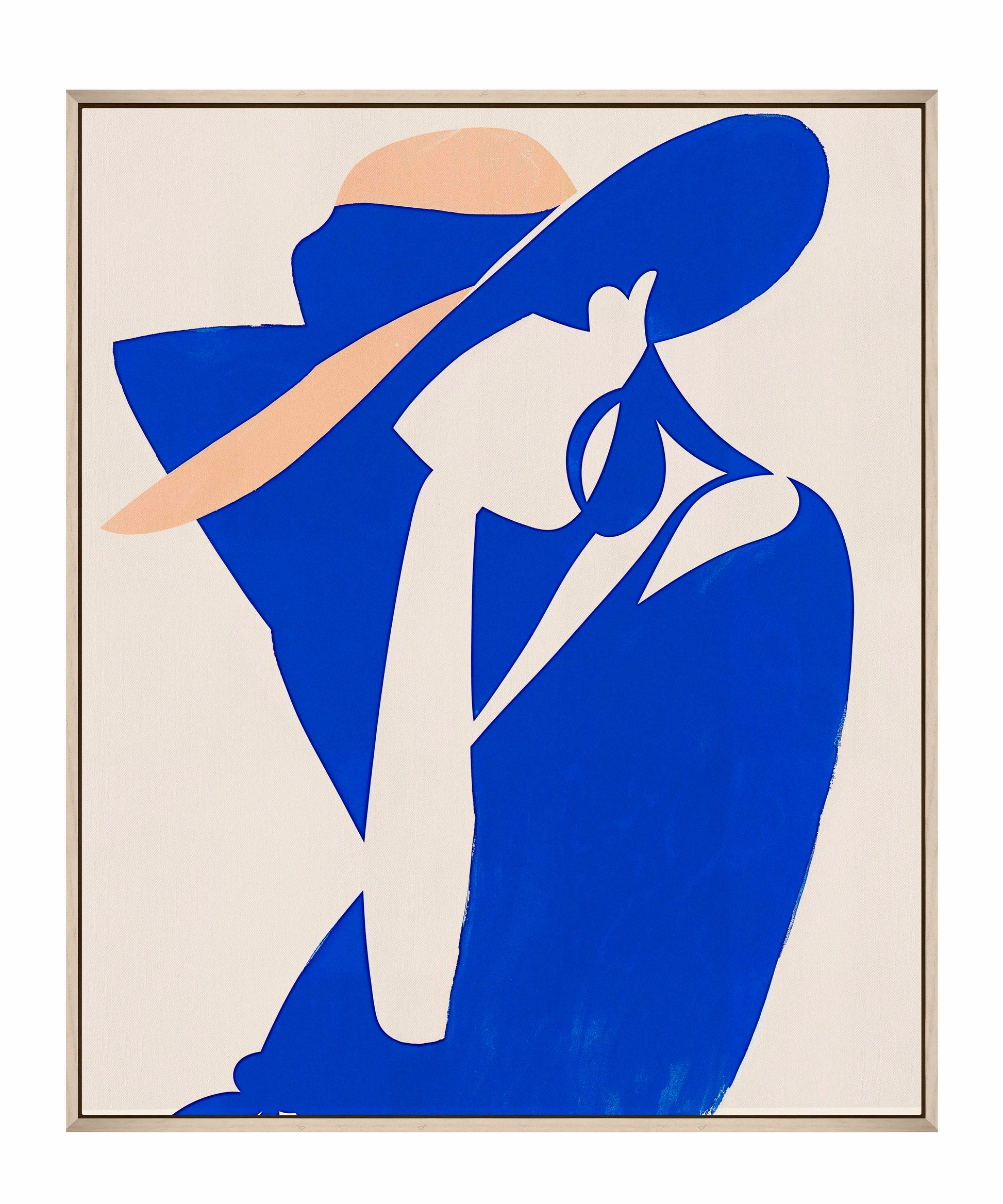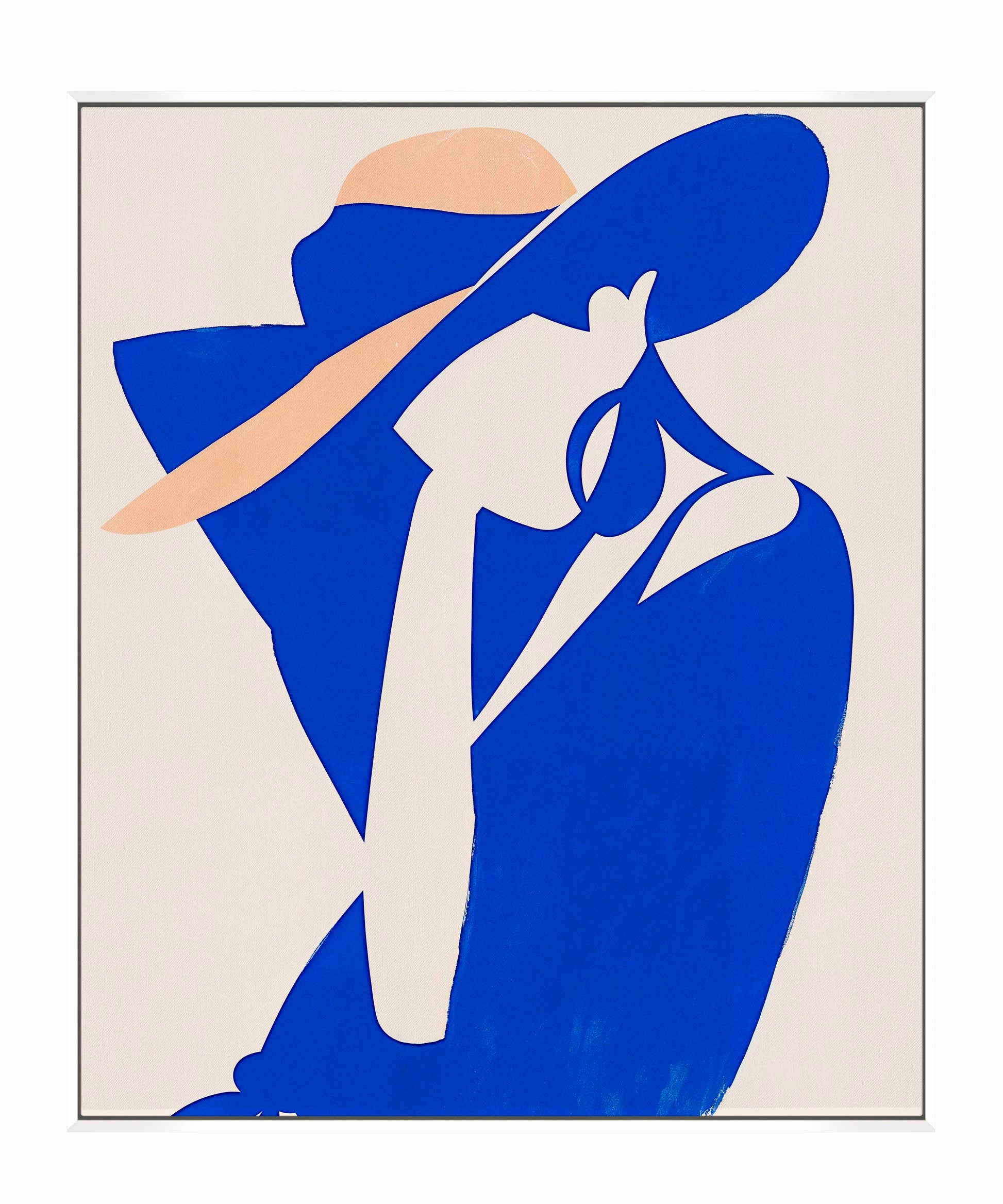 "Texas Tilt"is an evocative work that captures the elegance and mystery of the human form through minimalist design. The painting features a figure adorned with a wide-brimmed hat, tilted at an angle that both conceals and reveals, creating a sense of intrigue. The artist’s use of bold, solid colors—primarily cobalt blue and beige—emphasizes the silhouette, allowing the viewer to focus on the interplay of shapes and negative space.