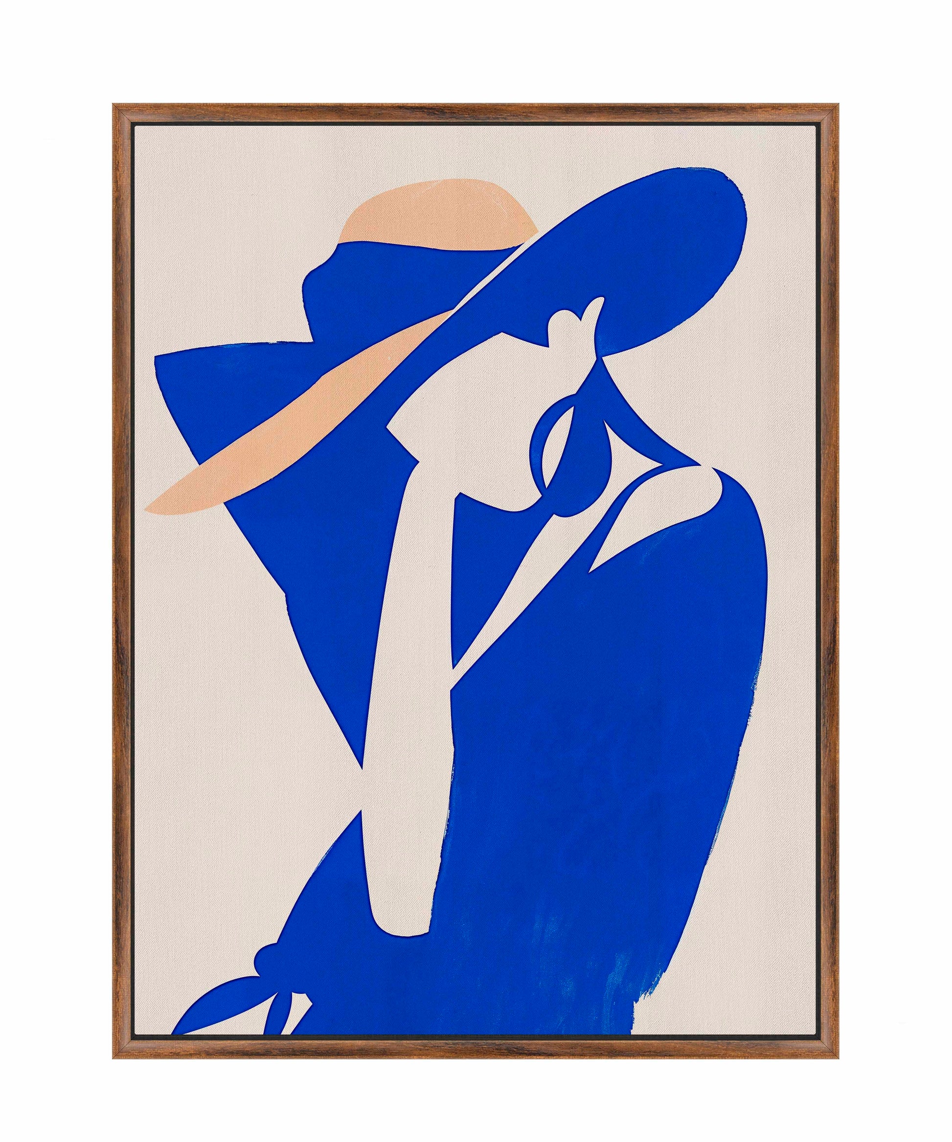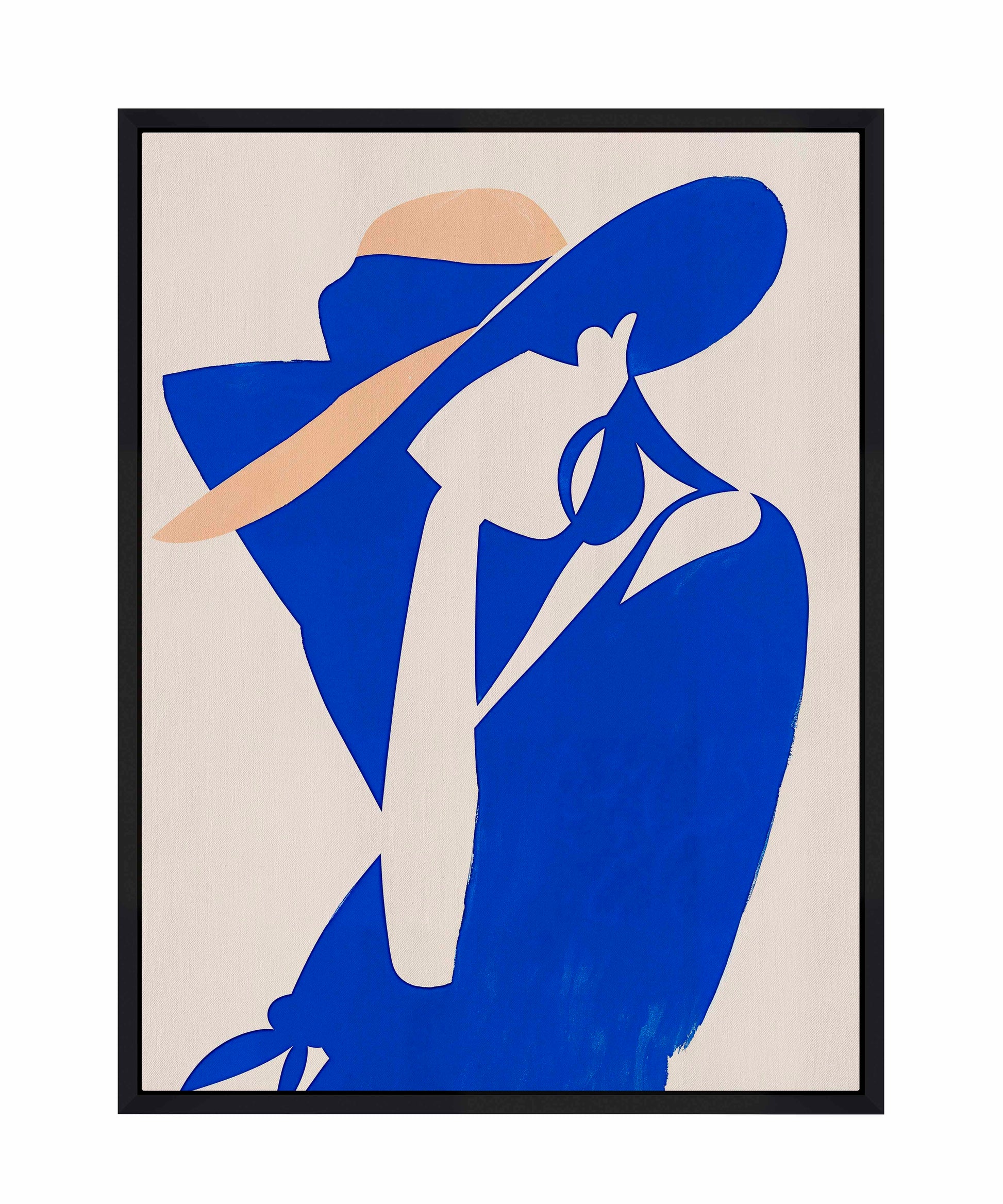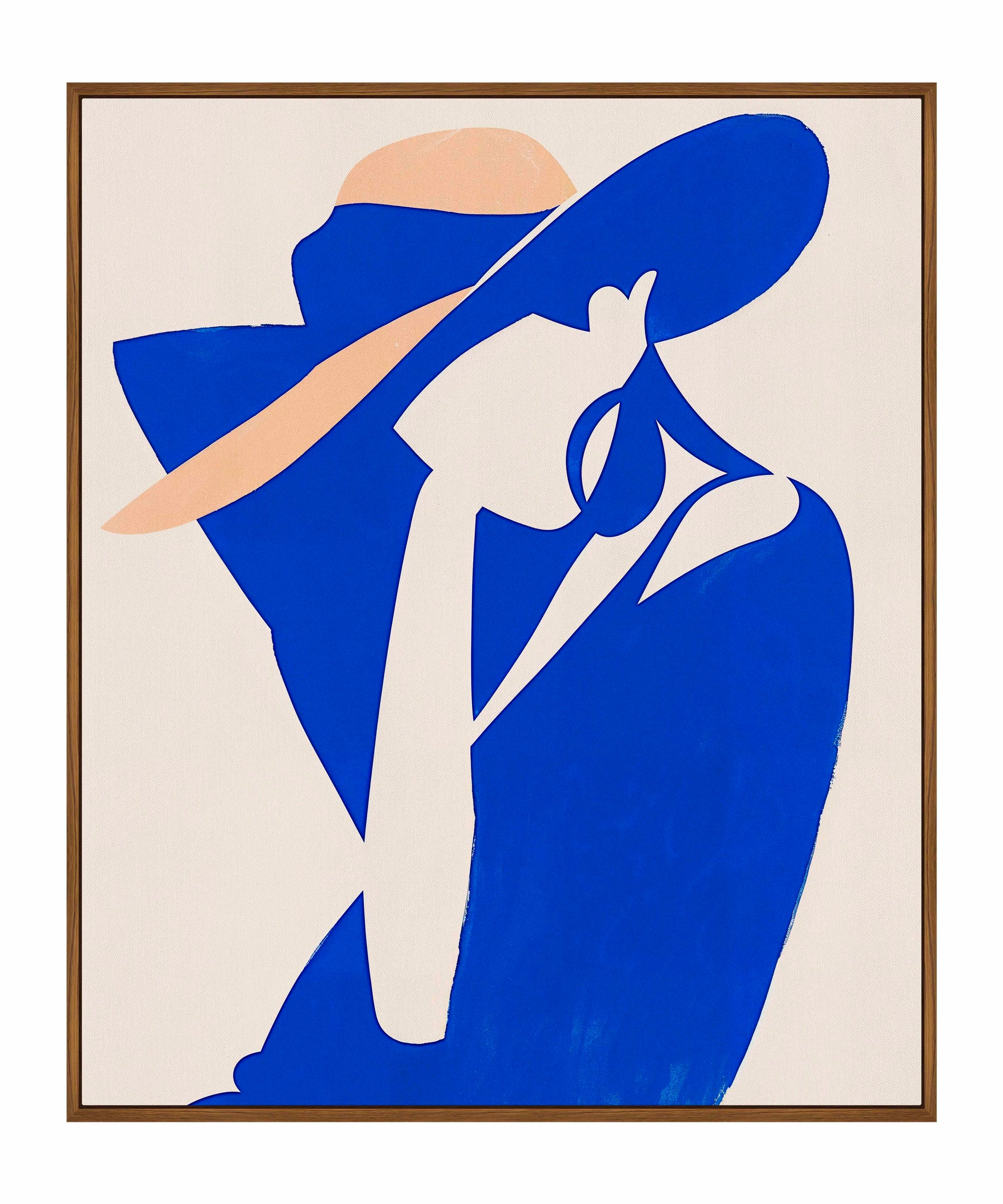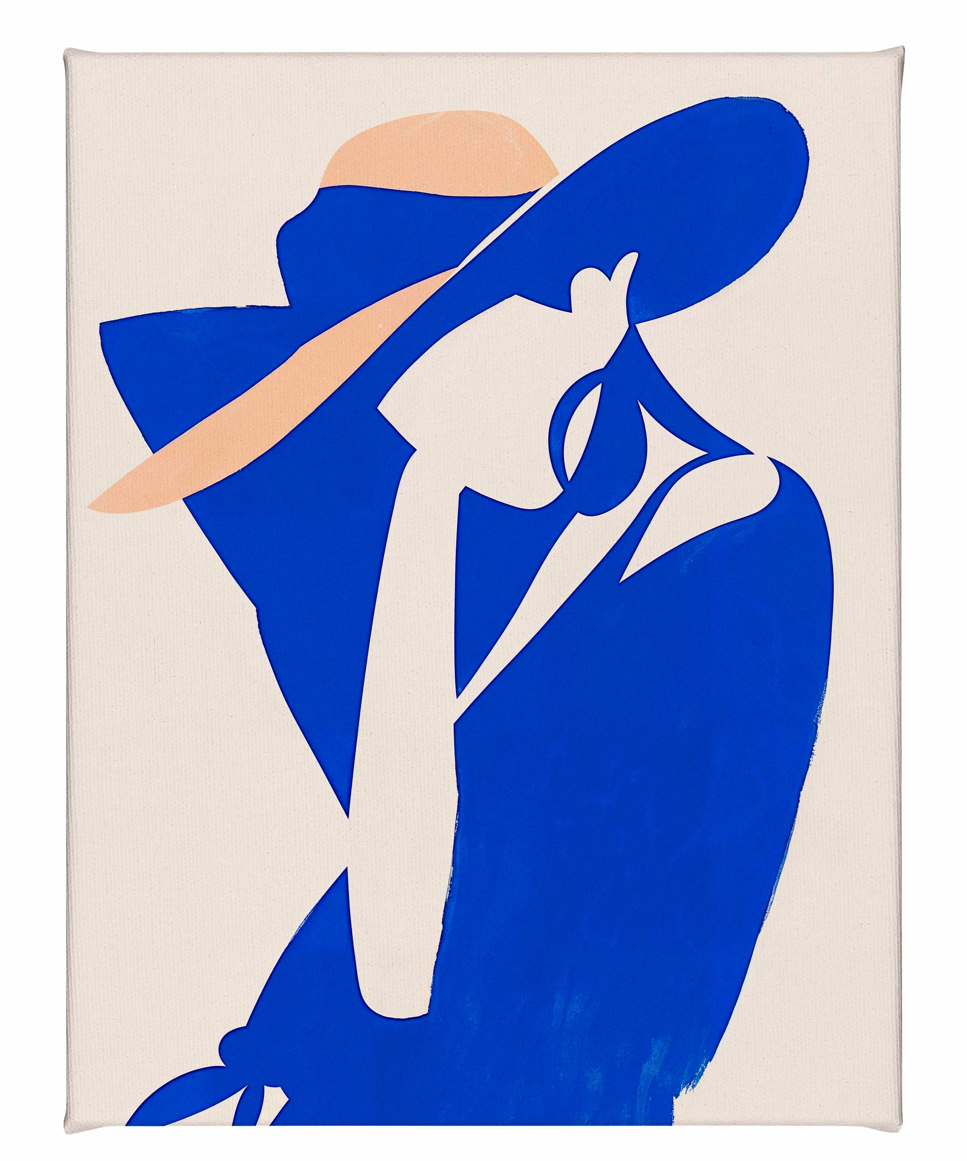 "Texas Tilt"is an evocative work that captures the elegance and mystery of the human form through minimalist design. The painting features a figure adorned with a wide-brimmed hat, tilted at an angle that both conceals and reveals, creating a sense of intrigue. The artist’s use of bold, solid colors—primarily cobalt blue and beige—emphasizes the silhouette, allowing the viewer to focus on the interplay of shapes and negative space.