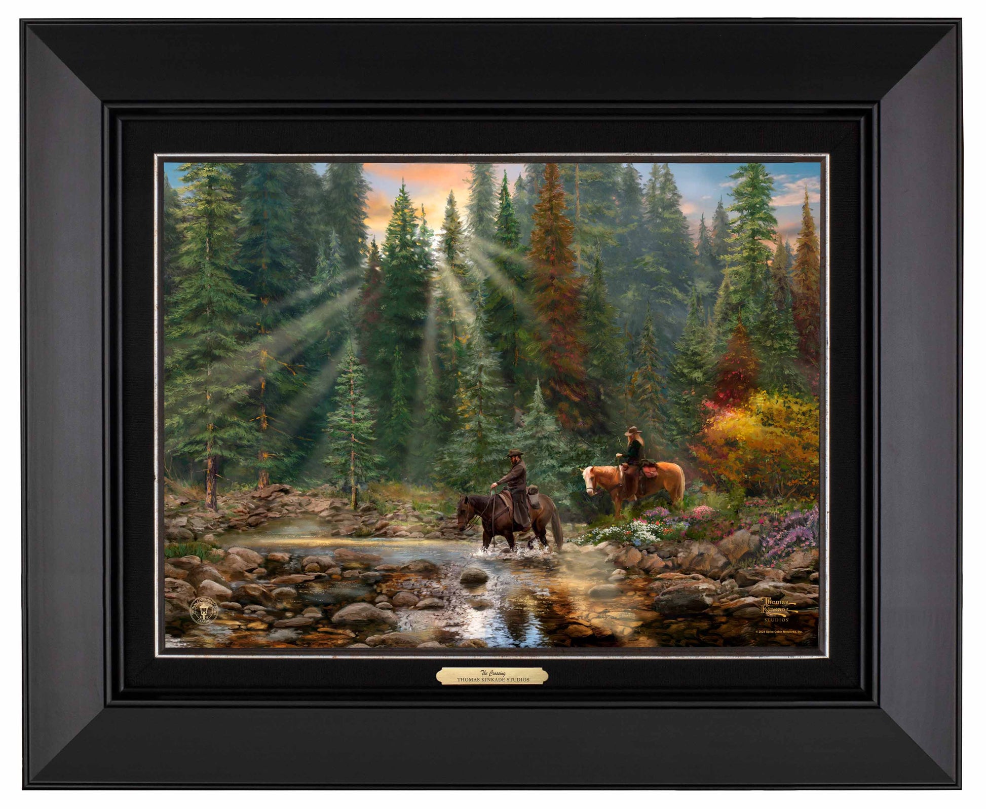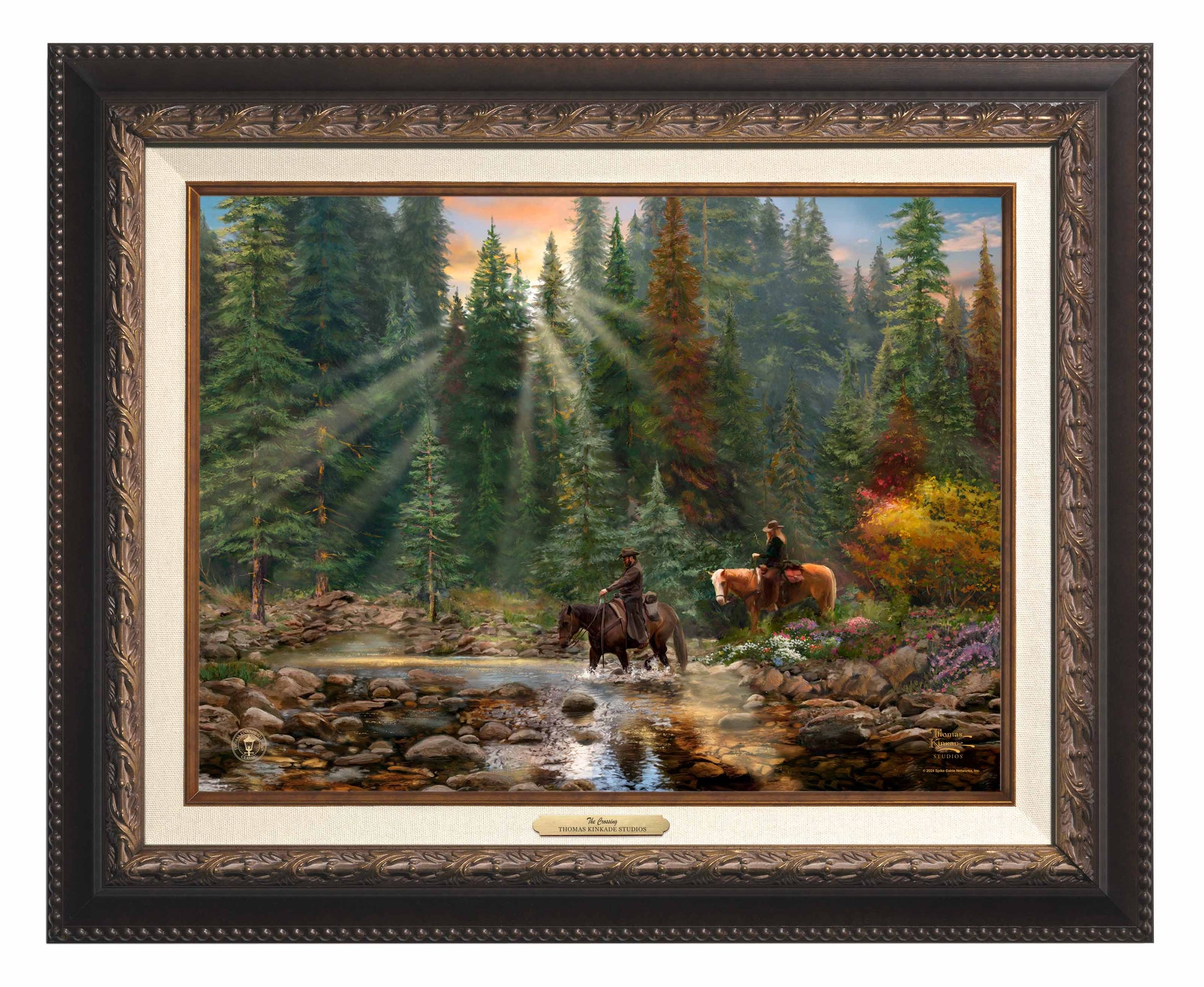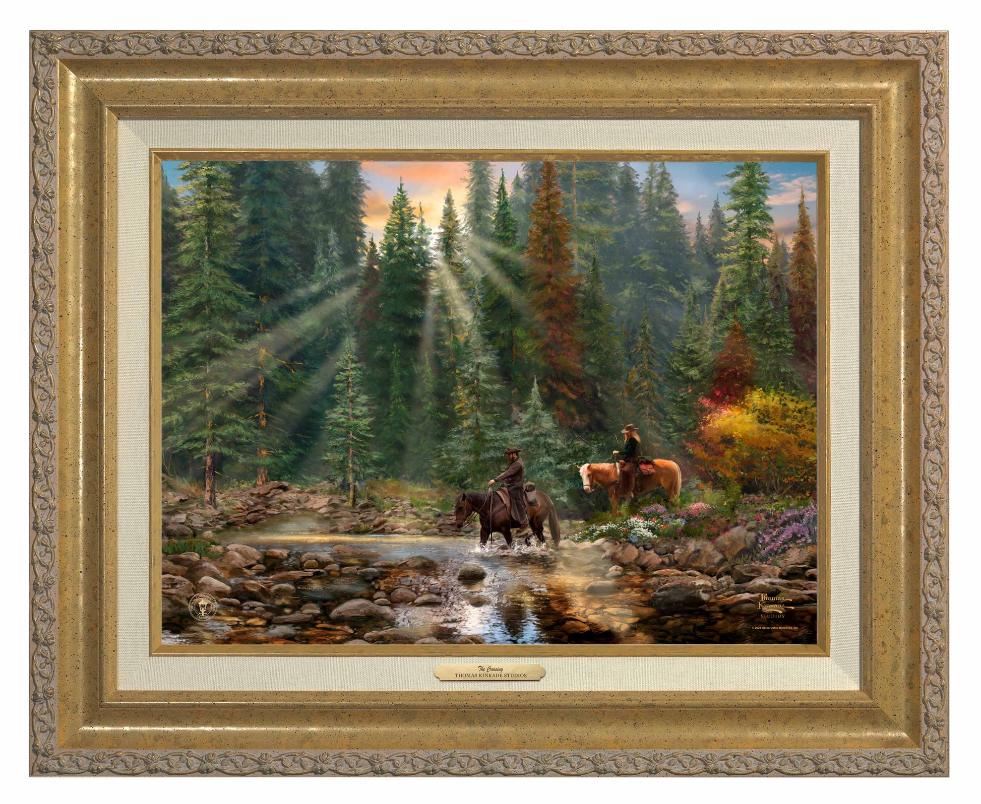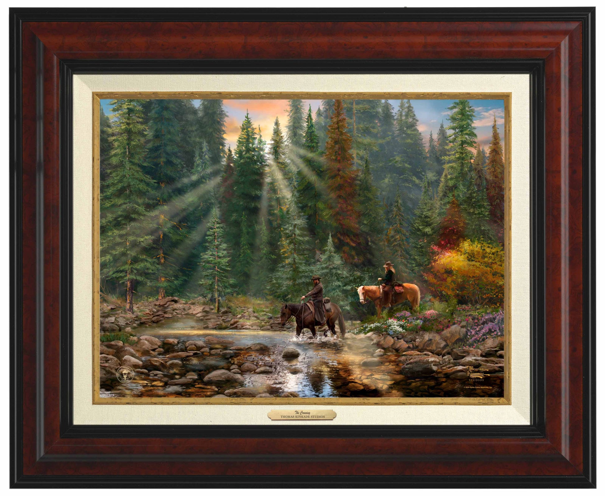 The Crossing by Thomas Kinkade Studios portrays two familiar riders on horseback fording a picturesque mountain stream after the end of a long cattle drive.