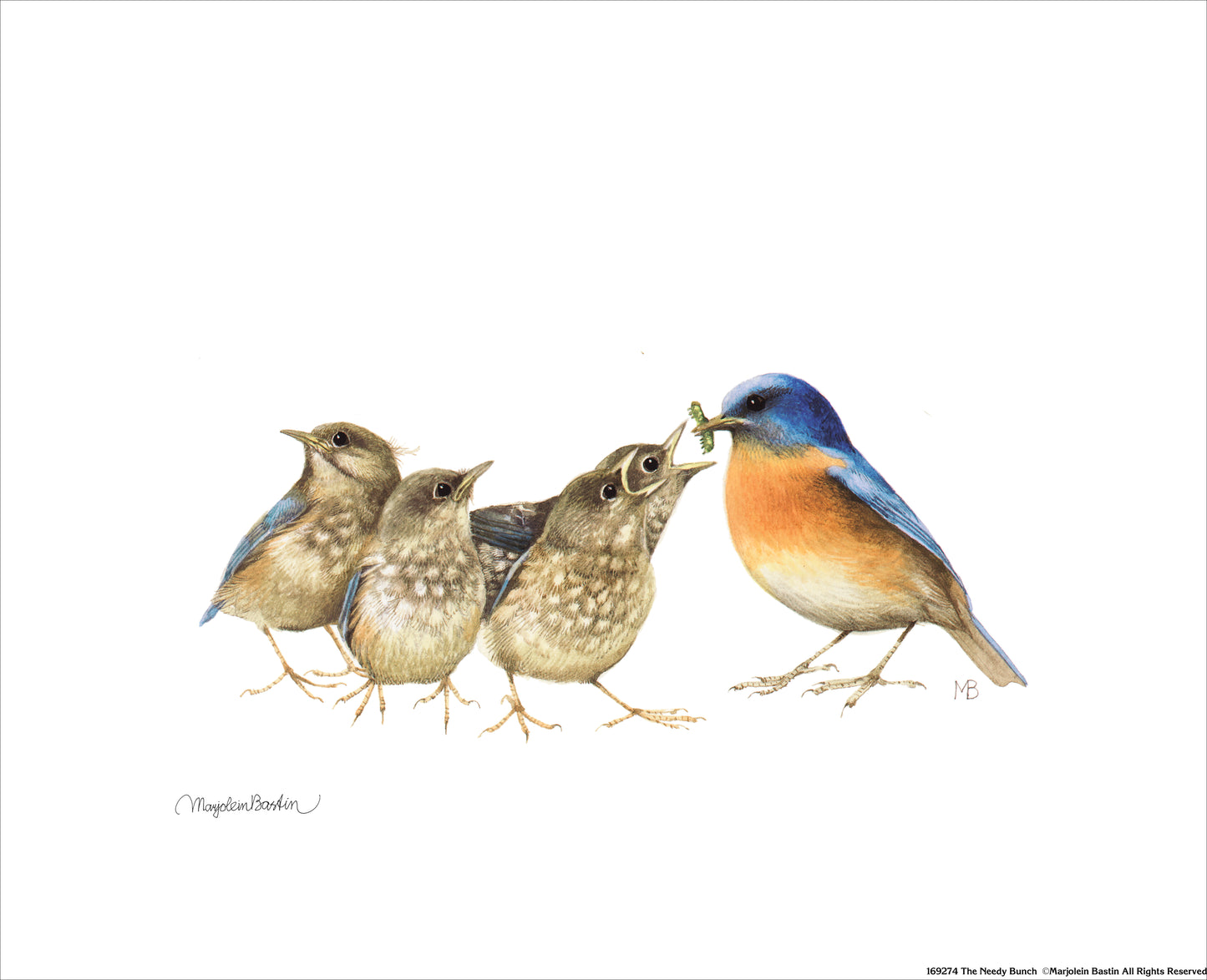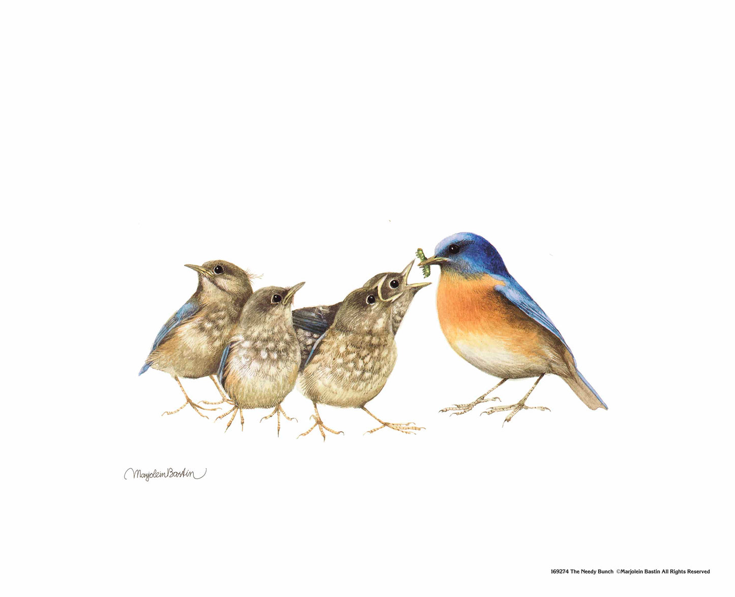 Typically the Eastern bluebird eats seeds and fruits but fledglings need a little more protein in their diet. So this time of the year you will see the bluebird hunting for insects and worms. Perched on top of a post they scour the area for anything that moves. They’ll fly down to grab it or even catch insects mid-air. They’re quite acrobatic! Having this many beaks to feed puts a lot of pressure on the parents!