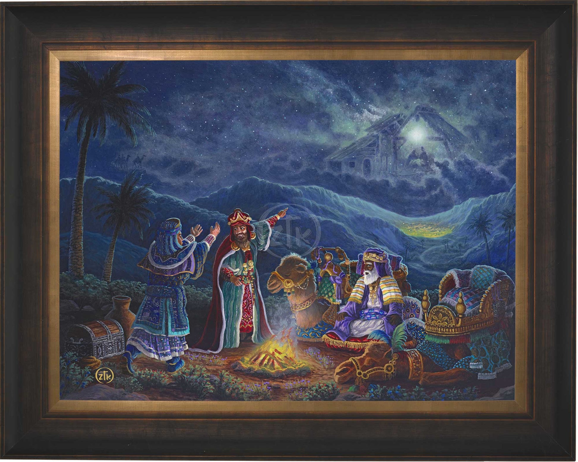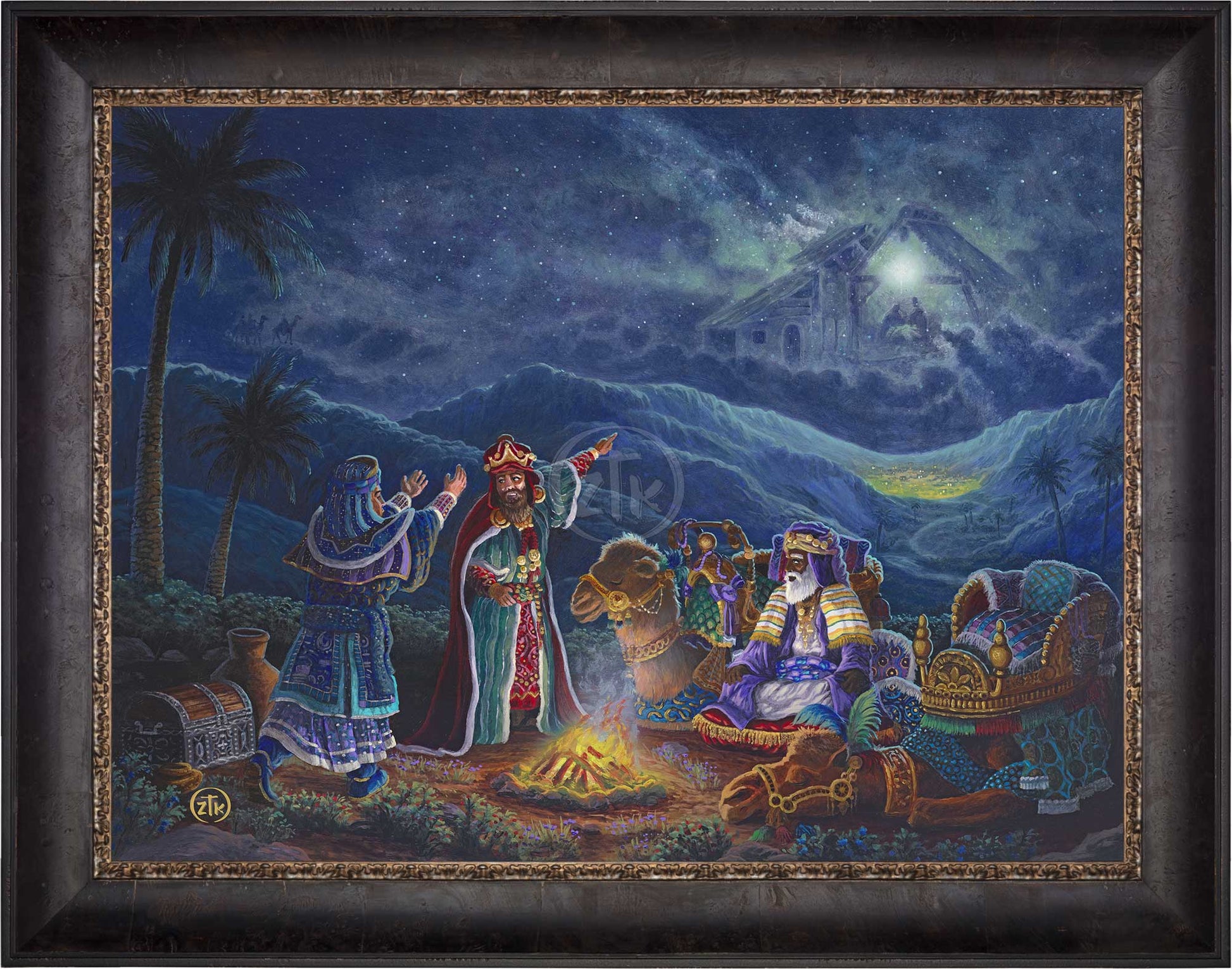 The visit of the three wise men bringing gifts to Bethlehem in honor of the birth of the Christ child is a story that has been told as part of the Christmas tradition since time immemorial. In spoken word and joyous song, players in holiday pageants recount the journey from the east of Melchior, Caspar and Balthazar to a humble manger surrounded by lowly animals and heavenly angels, laying under a divine star. As a young boy, my Uncle Thom played Caspar in one such production. Wearing his bath robe, a beard made of brown yarn and a kitchen towel adored with plastic jewels, he sang “We Three Kings of Orient Are” with a gusto befitting a noble! My father played a shepherd in that show’s climatic nativity and was equally proud of his part, if not as ornately attired. These are the memories and traditions that bind families together and create larger communities based on good will and love for one another. My hope is that the viewing of my newest painting, The Three Wisemen will not only become one of your favorite holiday traditions but will also be a source of year-round cheer that spills out as a gift to all you know. You too, can give a treasure as the three kings did so long ago. I toast to sharing the gift of Christmas joy all year long, and thank you all for sharing my adventures in art.