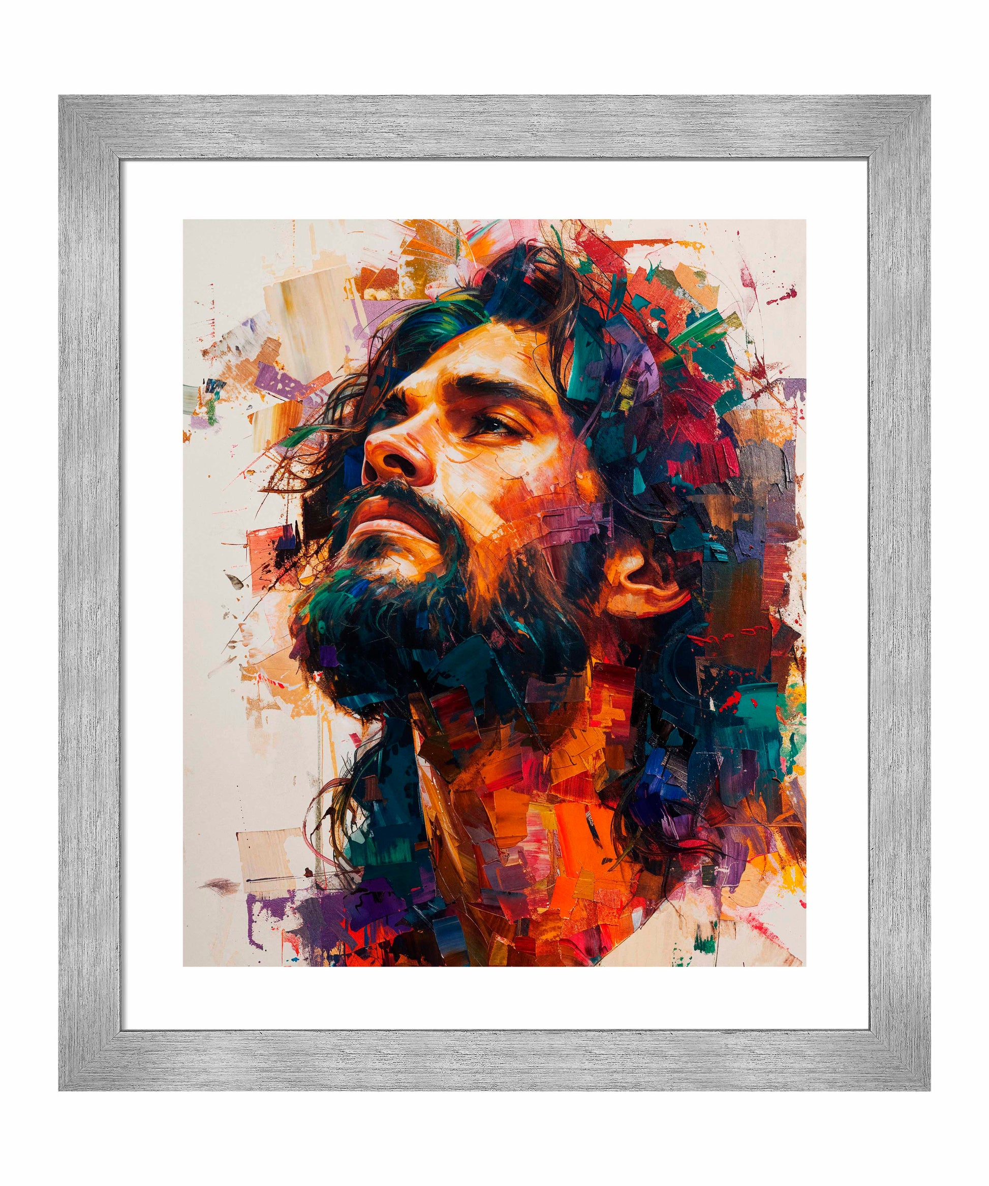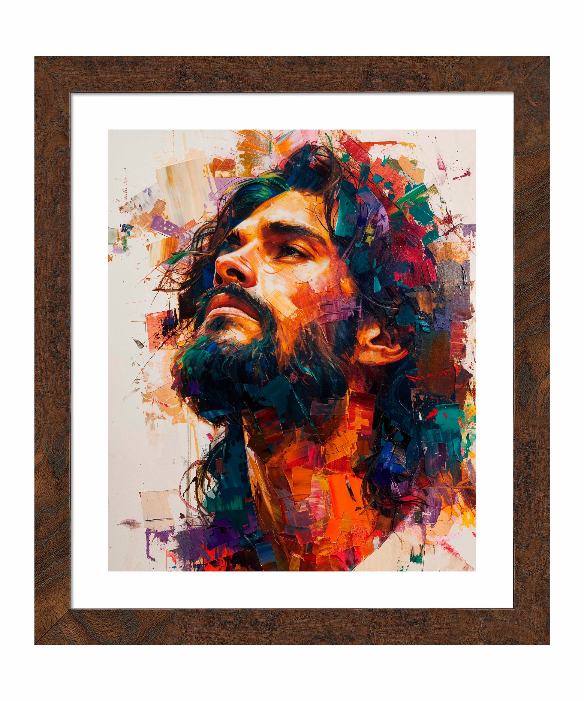 The Light of the World is a vibrant, expressive portrait that captures a moment of divine introspection and spiritual depth. The figure, with eyes lifted toward the heavens, radiates a sense of inner strength, faith, and surrender. The artist uses a striking combination of warm oranges, reds, and cool blues and greens in dynamic brushstrokes to convey the emotional intensity of the moment, creating an aura of divine light around the figure’s face.