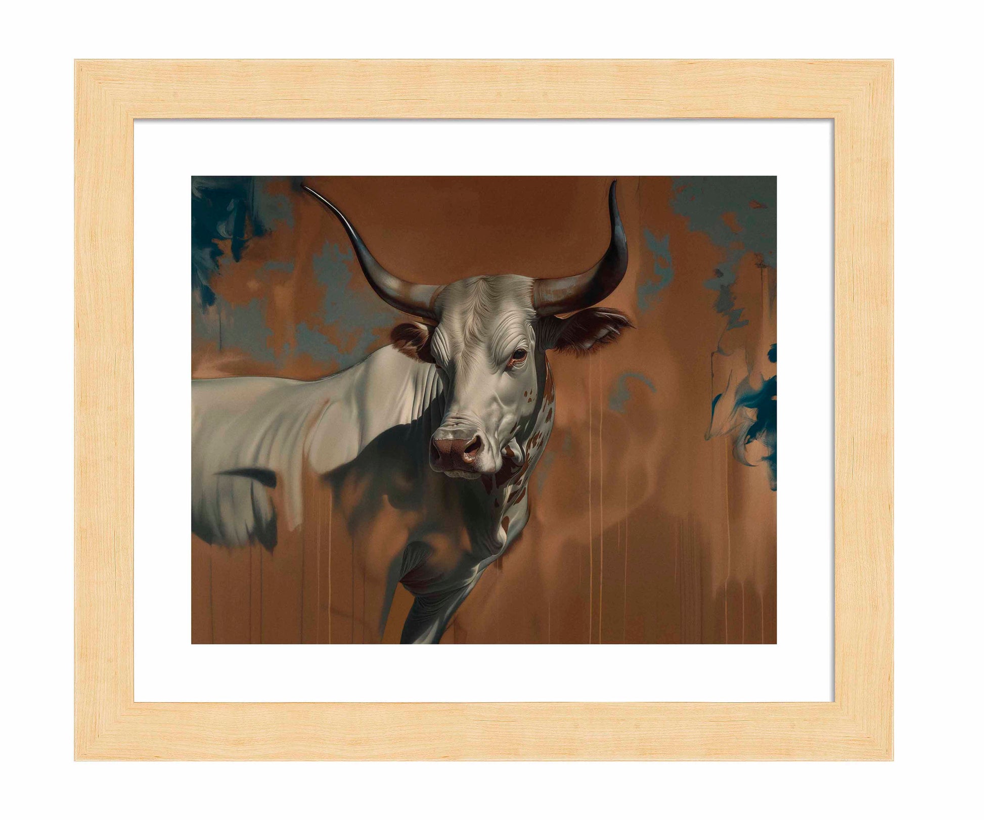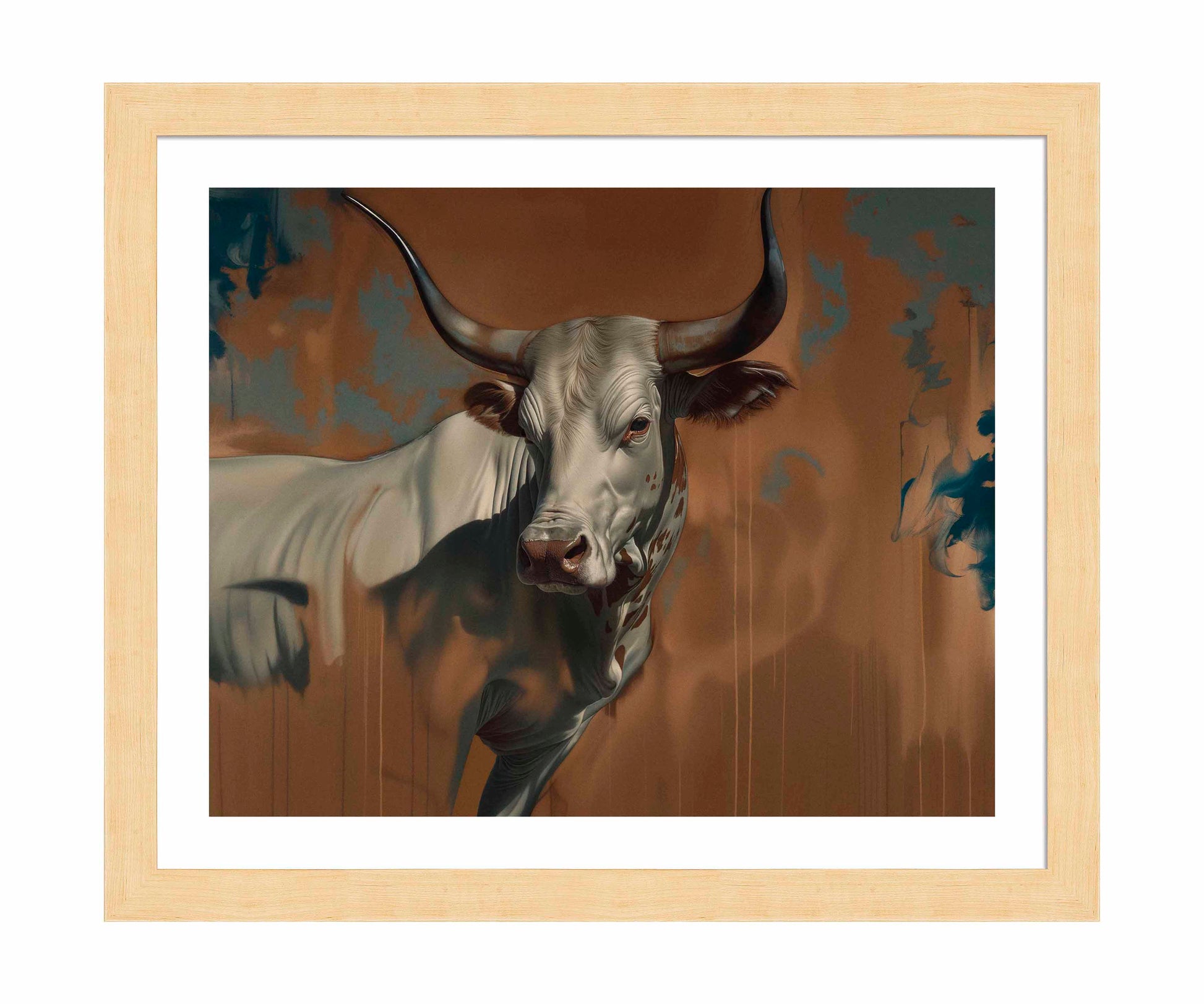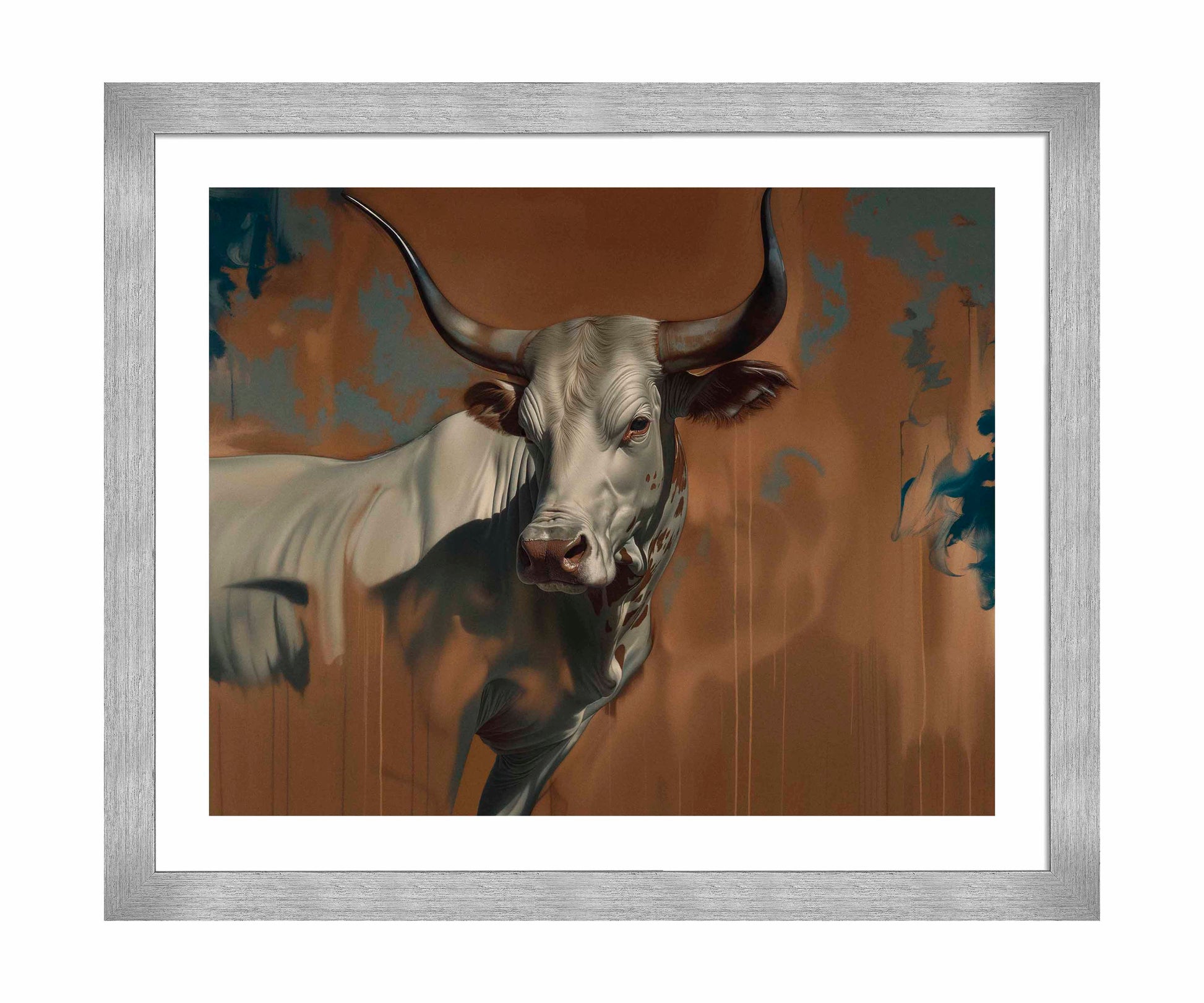 "The Texan Colossus" is a powerful depiction of a longhorn steer, rendered with stunning realism and an almost mythic presence. The central figure, the steer, is captured in mid-motion, its muscular form emerging from a rich, earthy background that hints at both the rugged landscapes of the American Southwest and the untamed nature of the animal itself. The interplay of light and shadow on the steer's body creates a dynamic sense of movement, while the subtle blending of colors in the background adds depth and a sense of mystery.