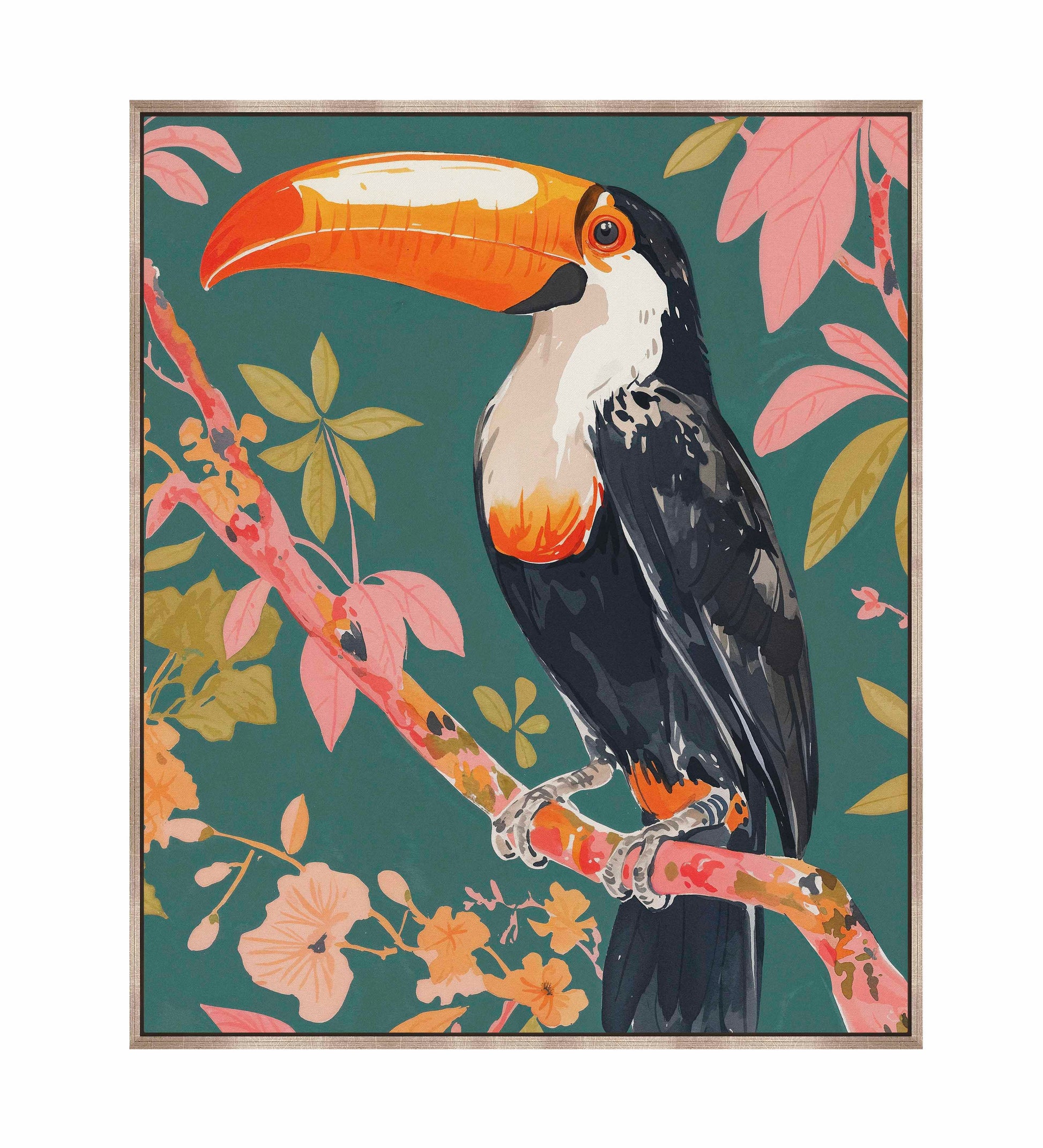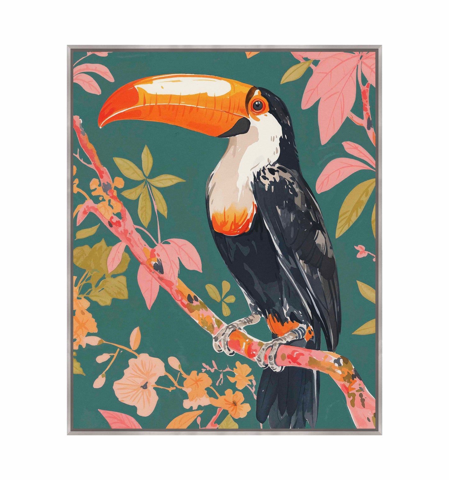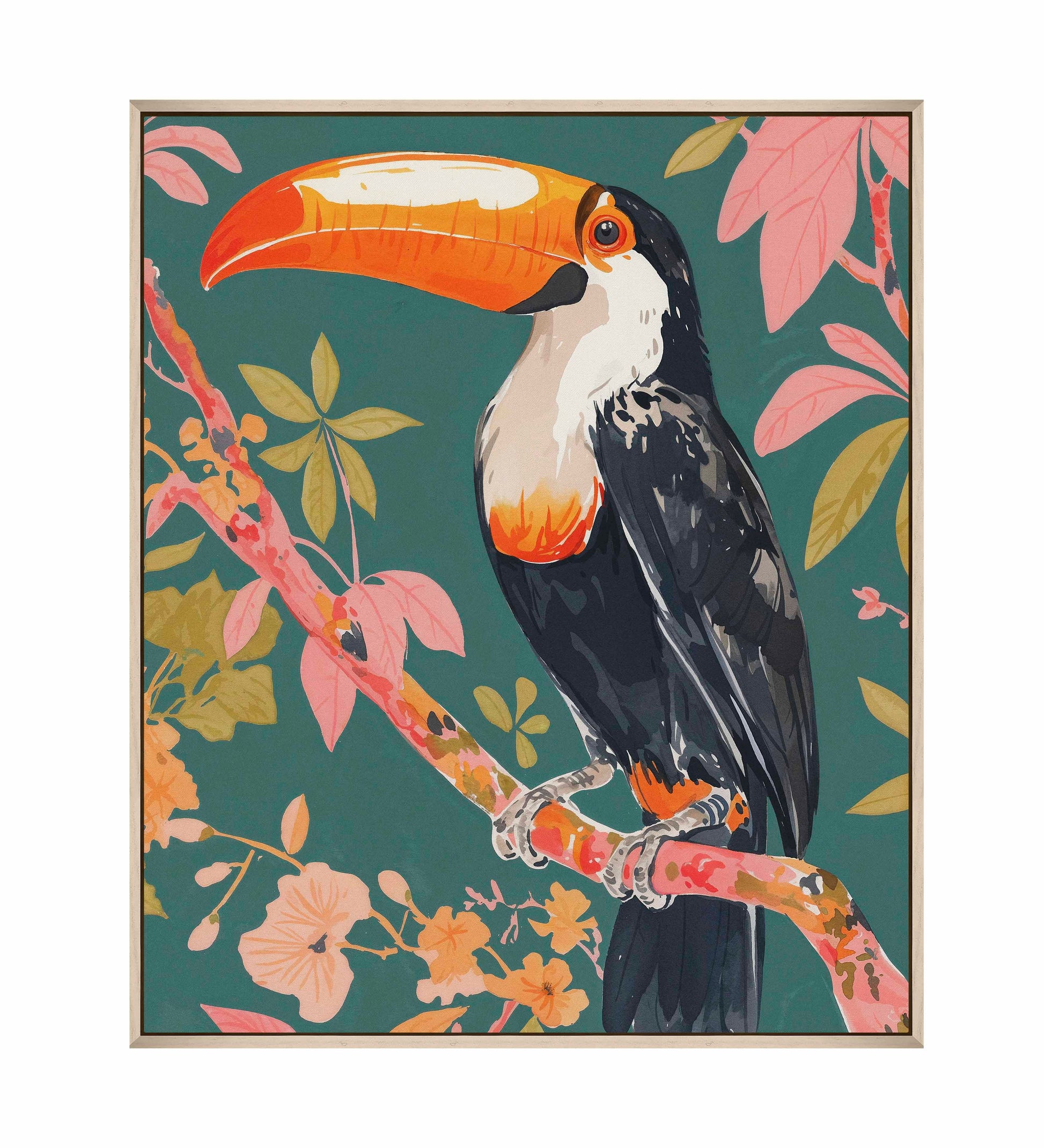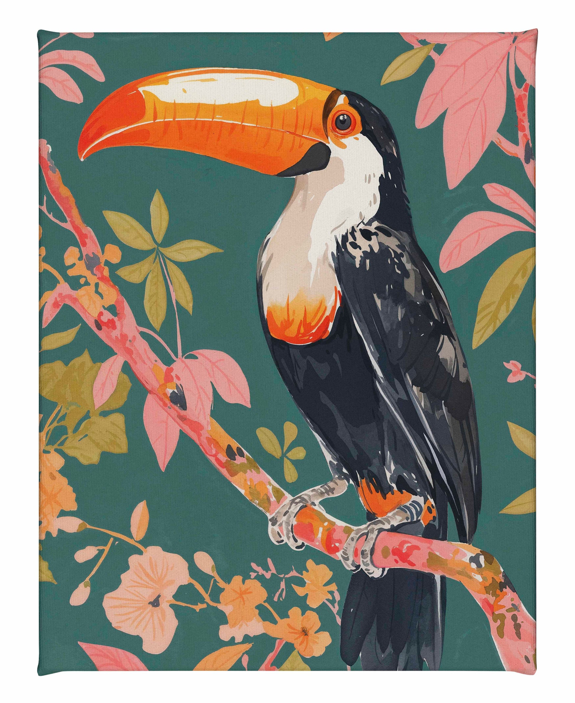 The artist's use of bold, contrasting colors and detailed brushwork brings the scene to life, capturing the essence of tropical flora and fauna. The harmonious interplay of the Toucan's bright orange beak and the delicate blossoms around it creates a visually stunning composition that draws the viewer into a serene, tropical paradise.
