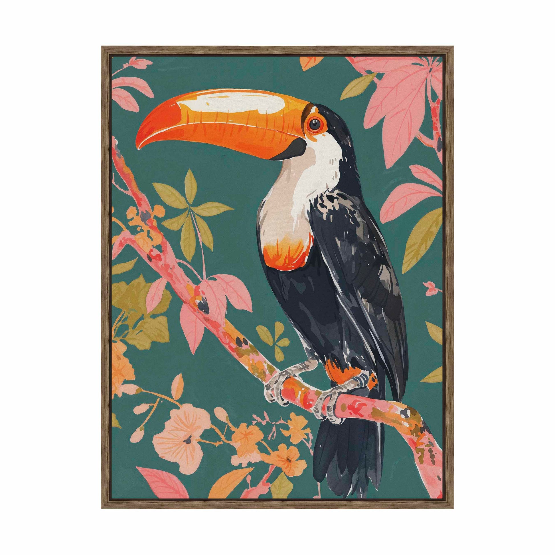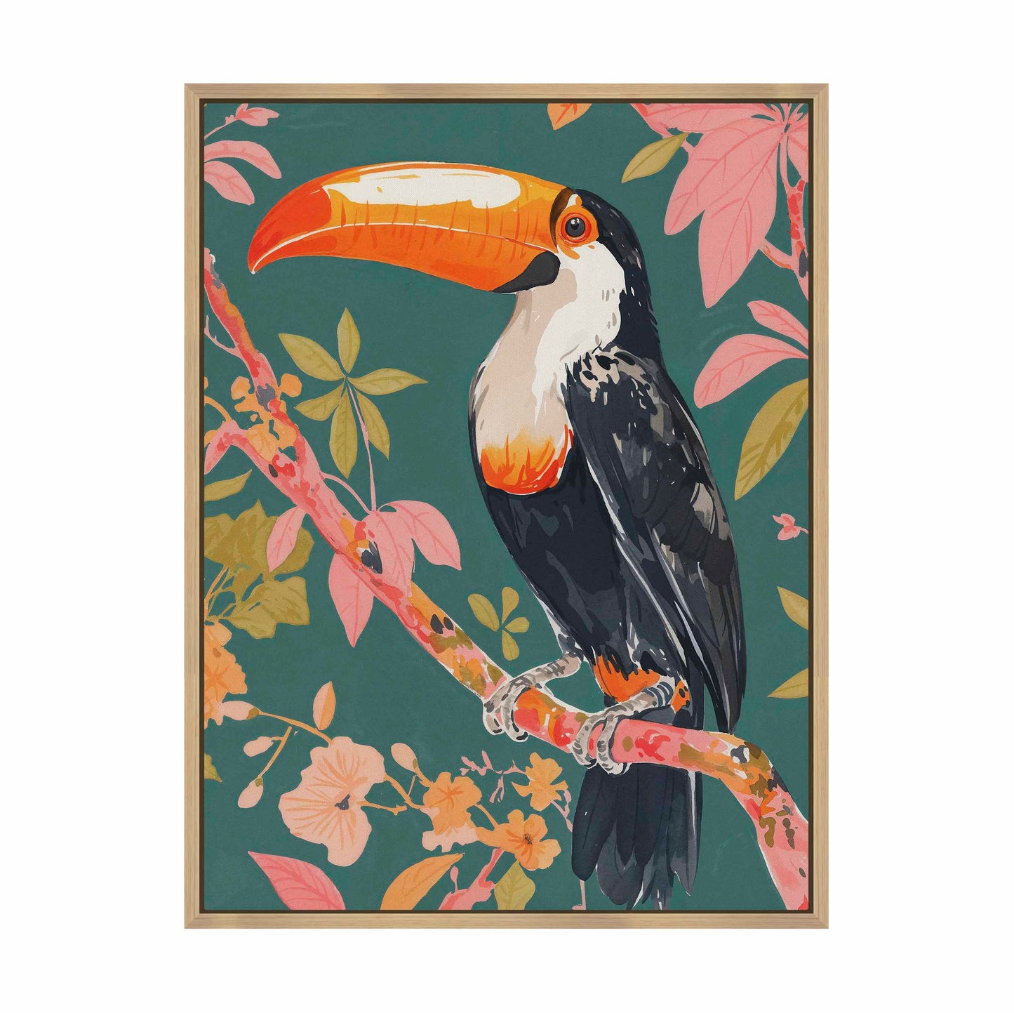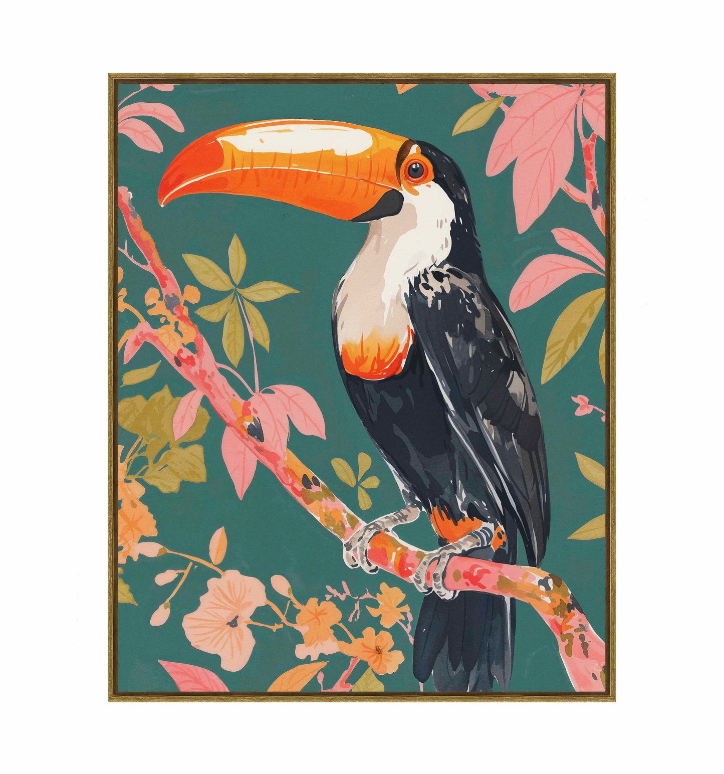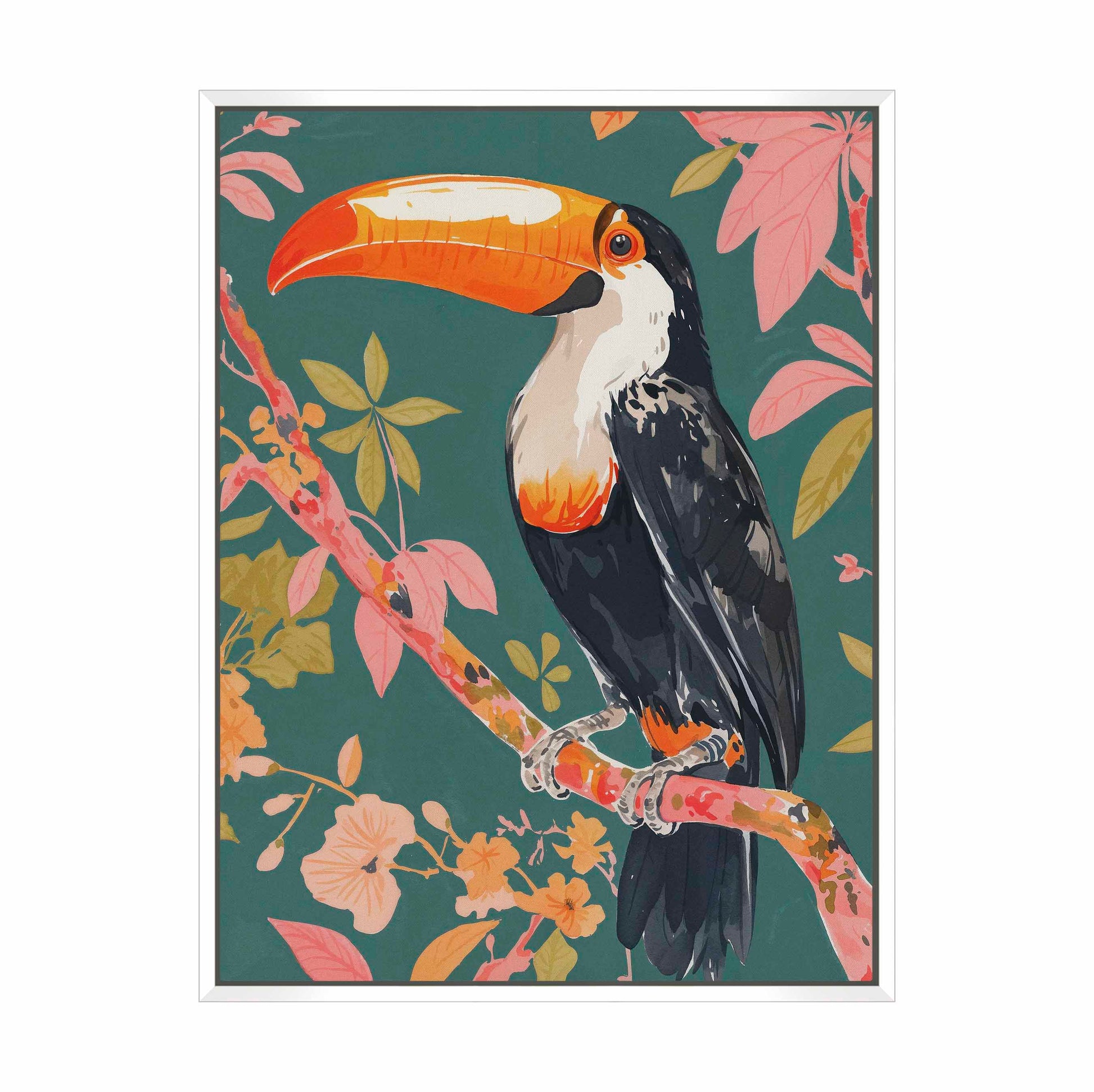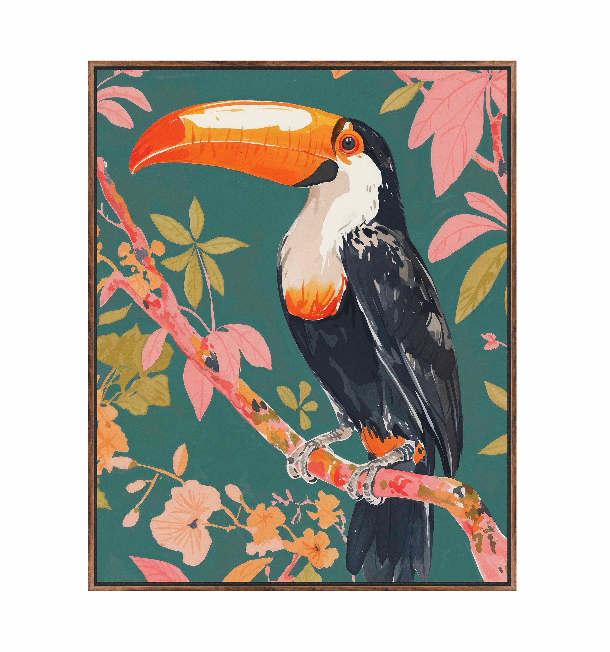 The artist's use of bold, contrasting colors and detailed brushwork brings the scene to life, capturing the essence of tropical flora and fauna. The harmonious interplay of the Toucan's bright orange beak and the delicate blossoms around it creates a visually stunning composition that draws the viewer into a serene, tropical paradise.