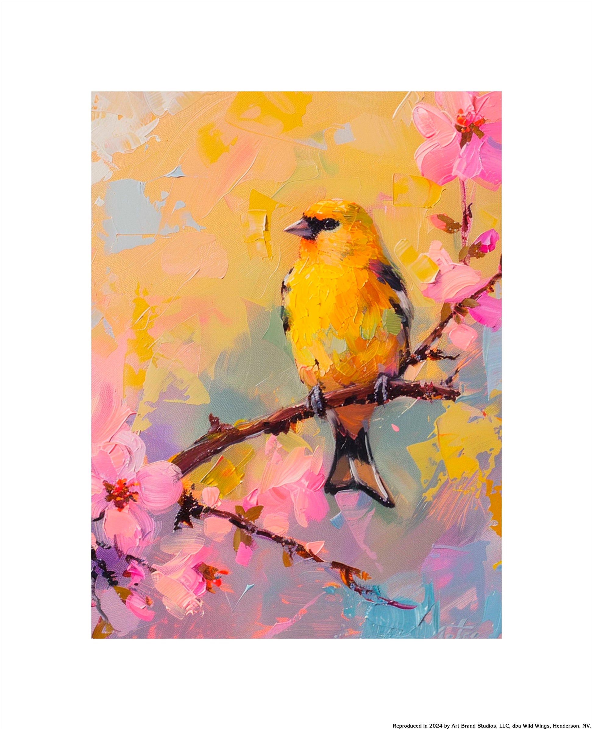 In this peaceful painting, "Tranquil Blossom," an American goldfinch perches tranquility on a branch adorned with delicate pink blossoms, its gaze calmly directed towards the left of the piece. The artist captures the bird's serene demeanor amidst a backdrop of vibrant yellow, purple, blue, and pink hues, creating a tranquil atmosphere that invites viewers to immerse themselves in the beauty of the moment. Against this harmonious backdrop, the goldfinch radiates a sense of calm and tranquility, adding to the peaceful allure of the scene. Through the artist's skillful portrayal of both subject and setting, this artwork offers a serene retreat into the natural world, where beauty and tranquility converge in perfect harmony.