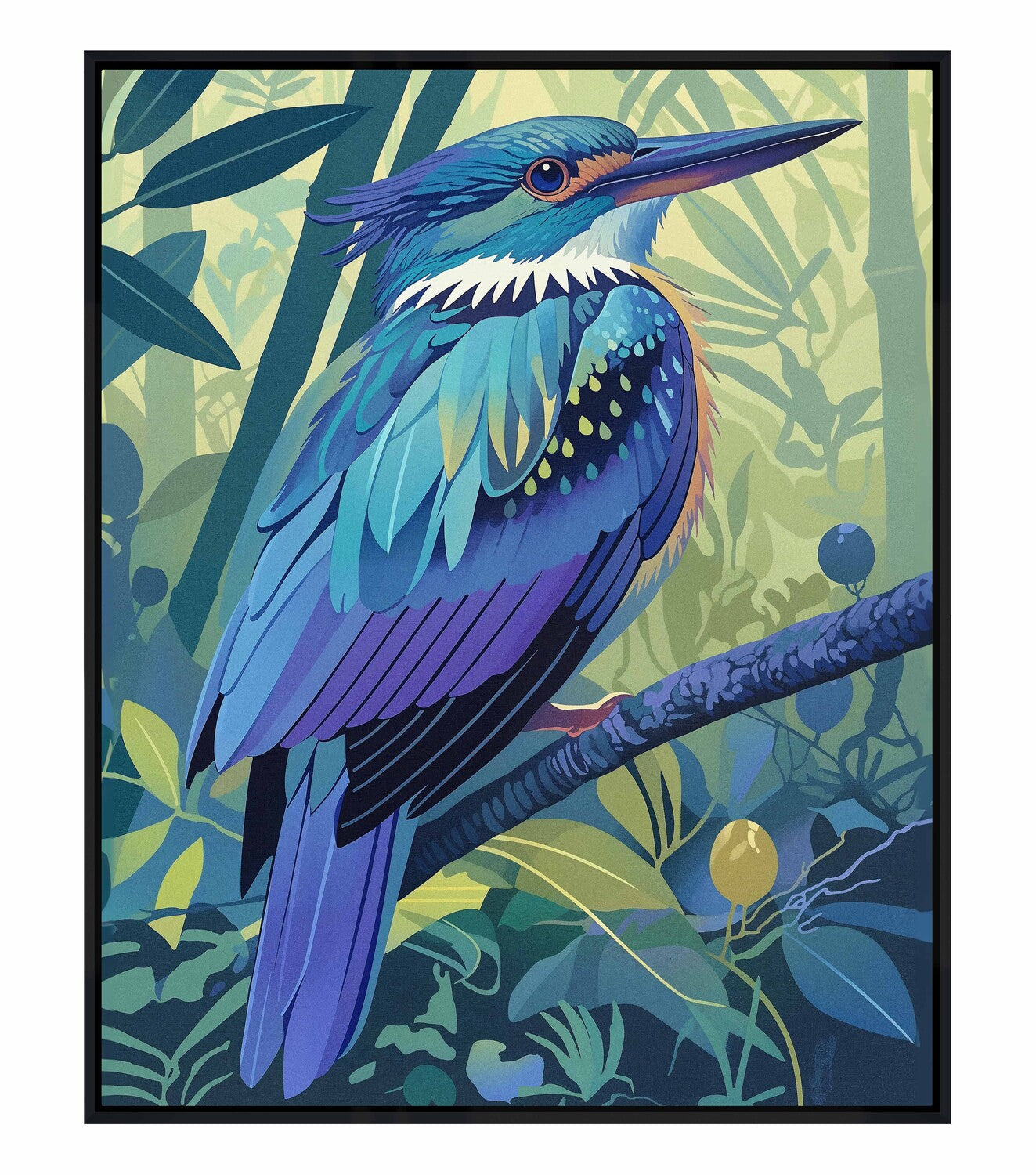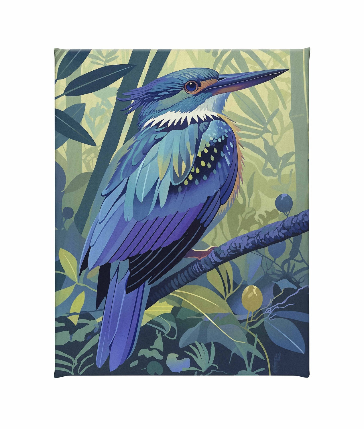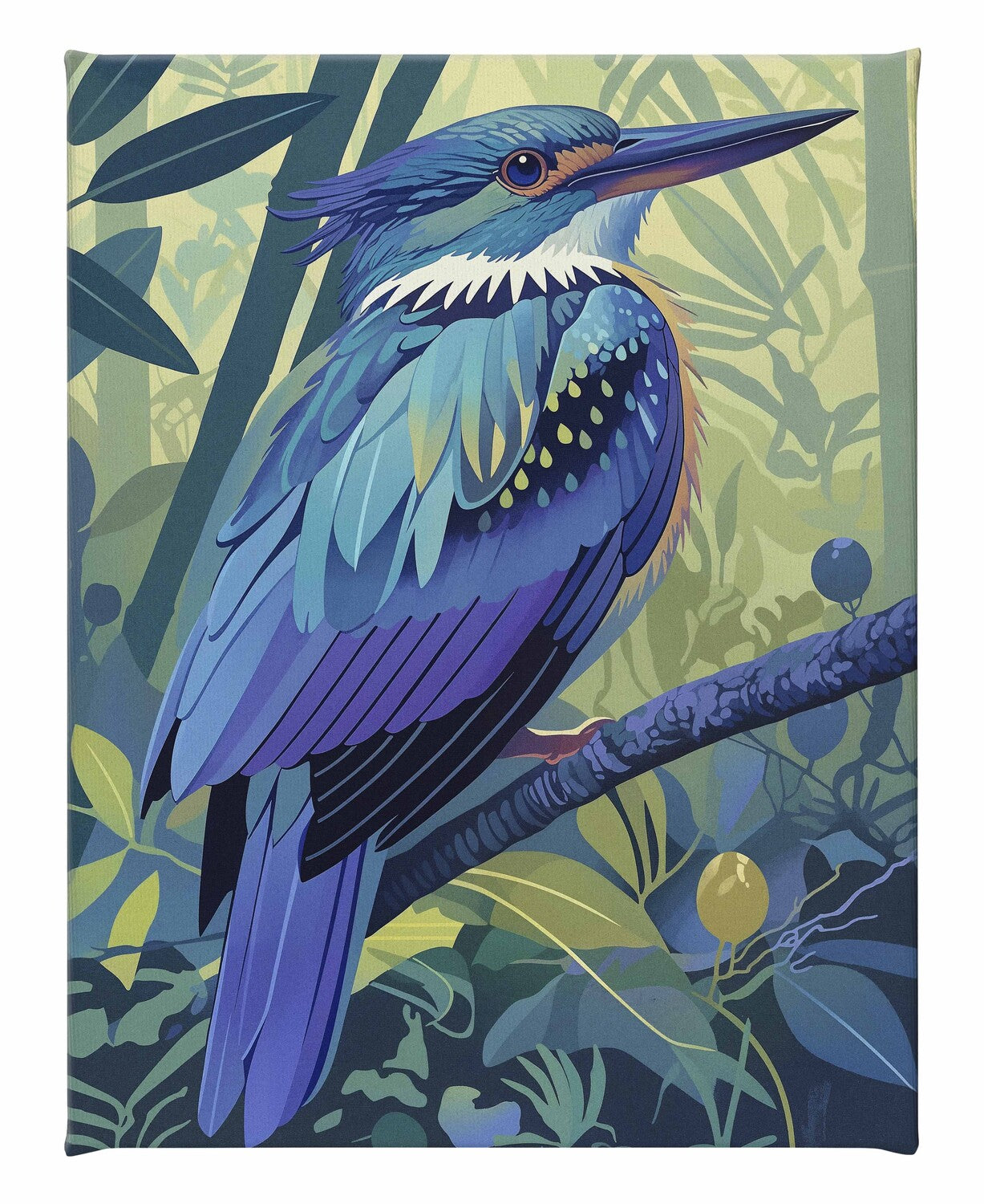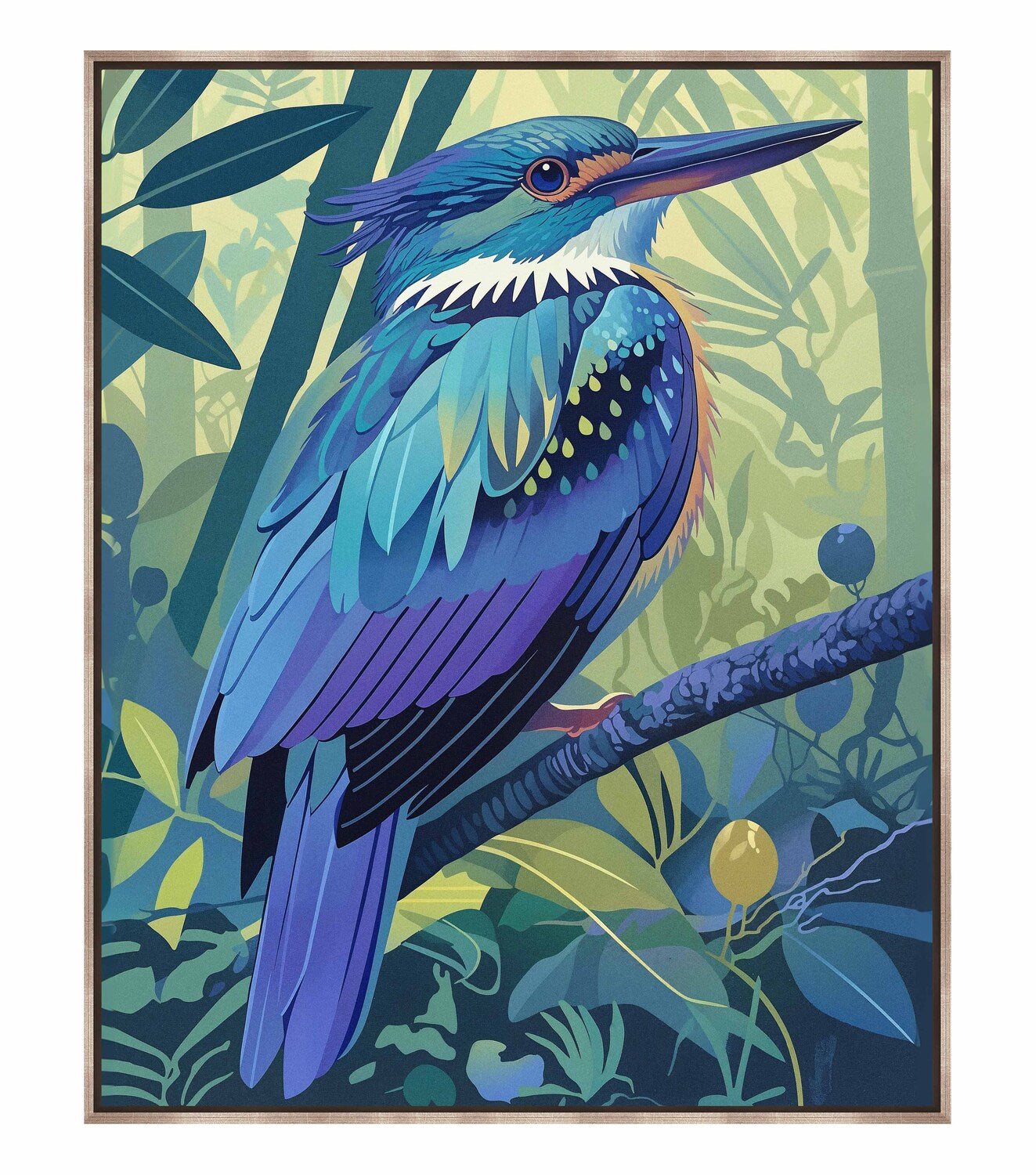Tropical Splendor - Kingfisher in Lush Jungle is a vibrant and enchanting piece from the Limelight Collection, capturing the dynamic beauty and vivid colors that characterize this series. This painting features a stunning kingfisher perched on a branch, surrounded by the dense, lush foliage of a tropical jungle. The kingfisher's plumage, a brilliant mix of blues, greens, and hints of purple, is rendered with exquisite detail, highlighting the bird's striking appearance and poised elegance.