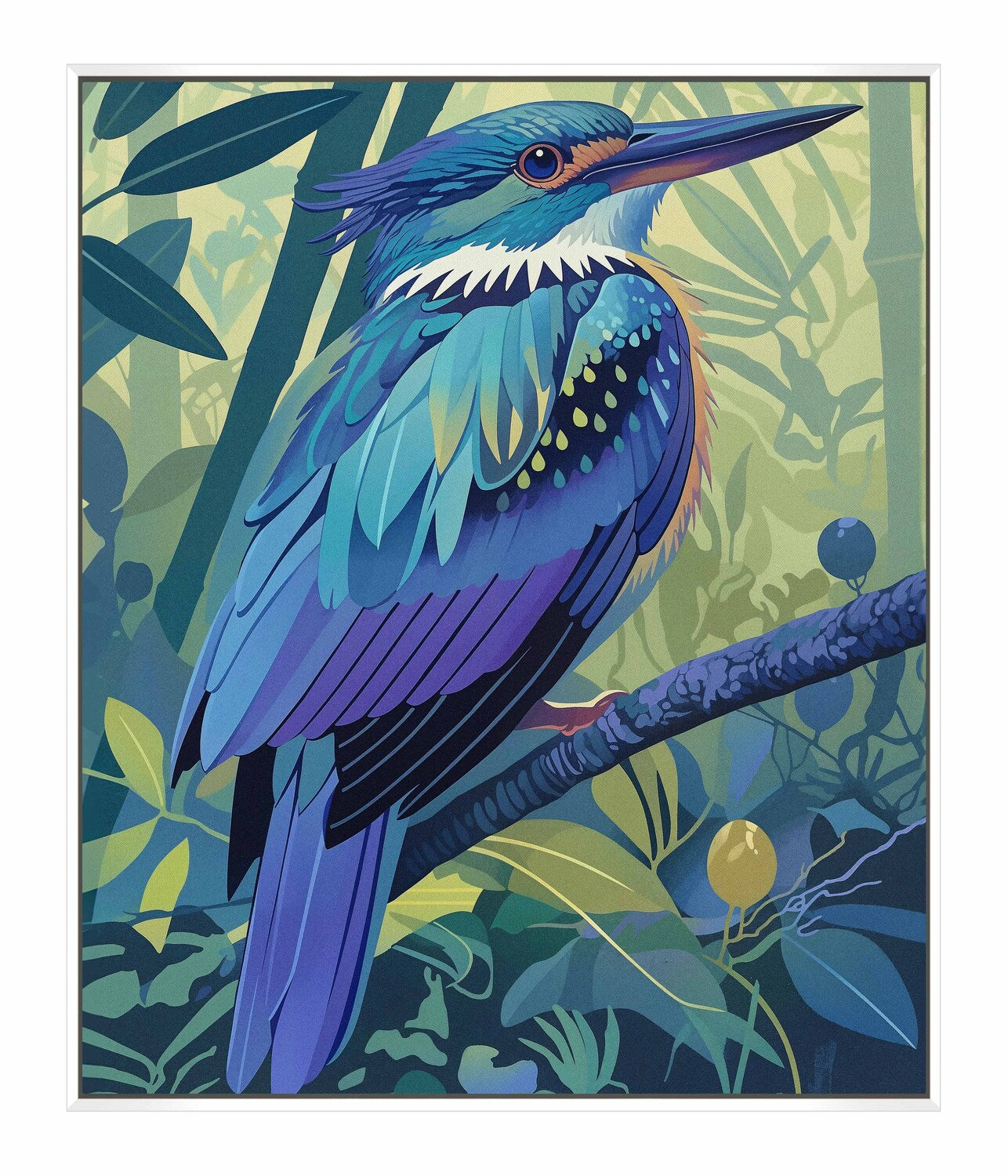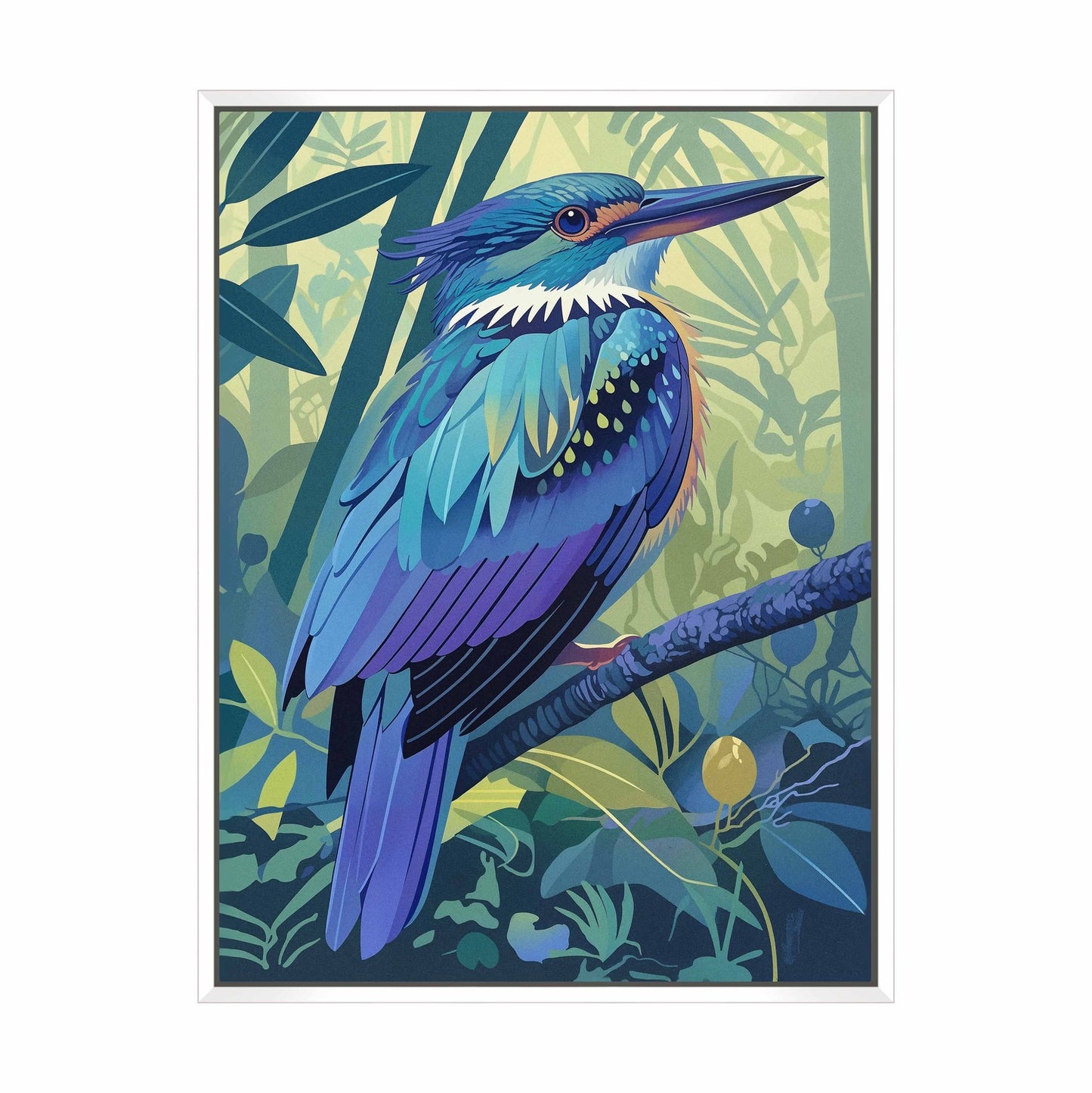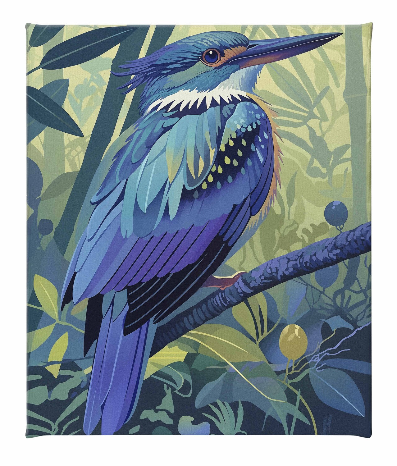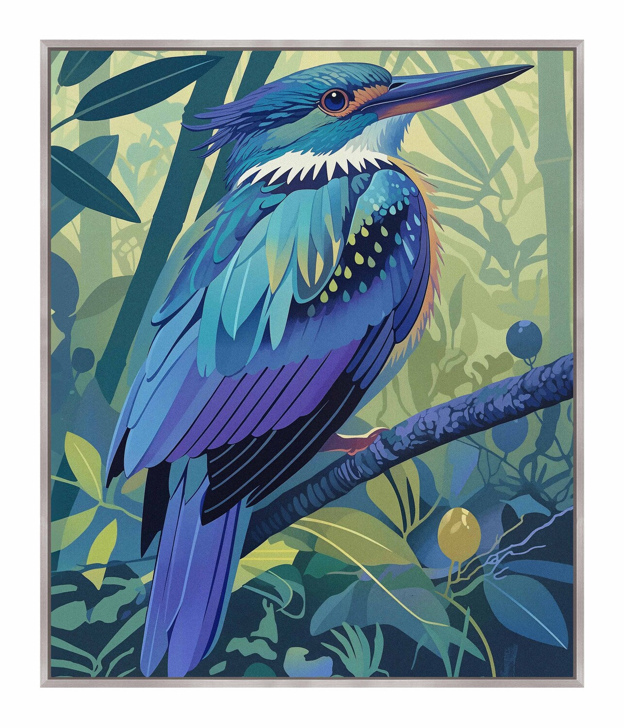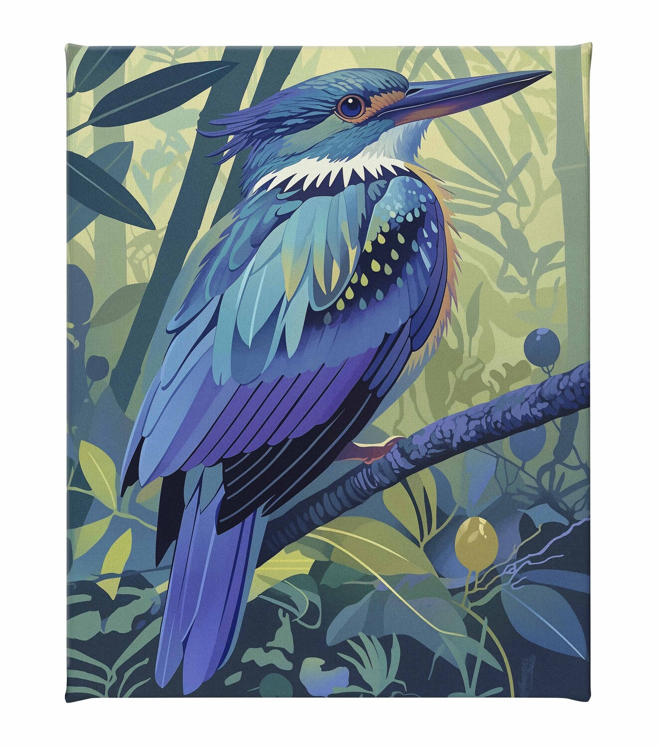 Tropical Splendor - Kingfisher in Lush Jungle is a vibrant and enchanting piece from the Limelight Collection, capturing the dynamic beauty and vivid colors that characterize this series. This painting features a stunning kingfisher perched on a branch, surrounded by the dense, lush foliage of a tropical jungle. The kingfisher's plumage, a brilliant mix of blues, greens, and hints of purple, is rendered with exquisite detail, highlighting the bird's striking appearance and poised elegance.