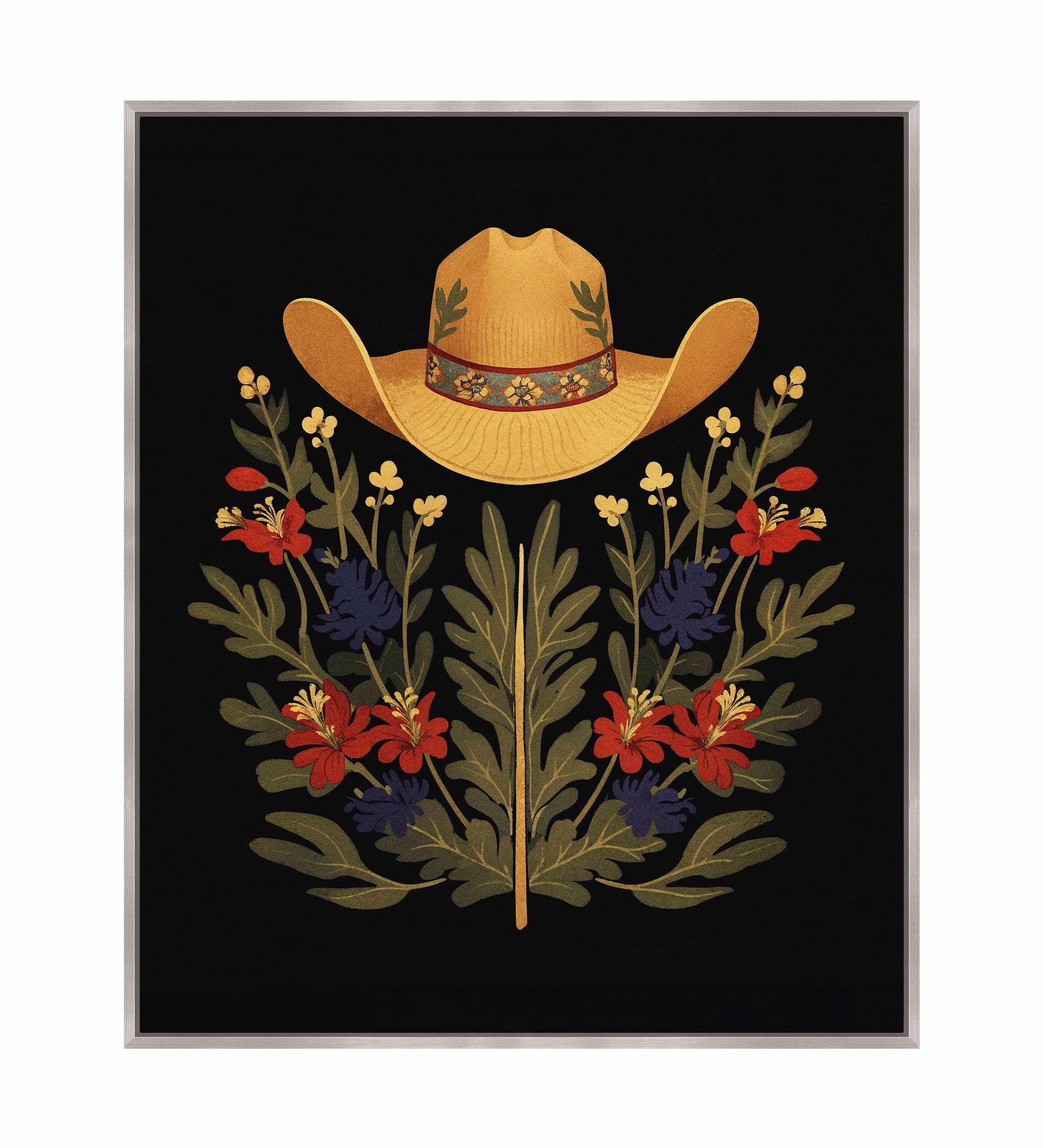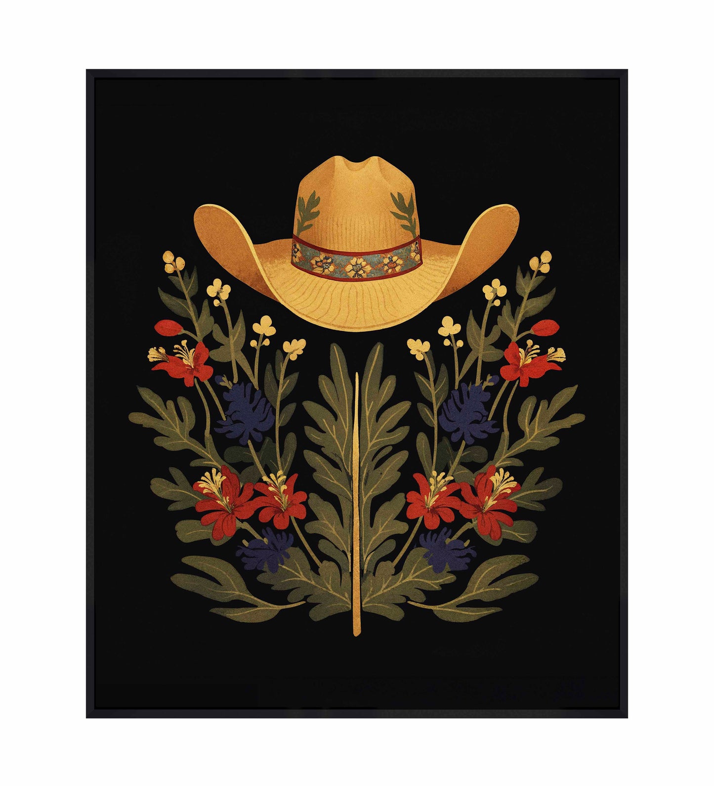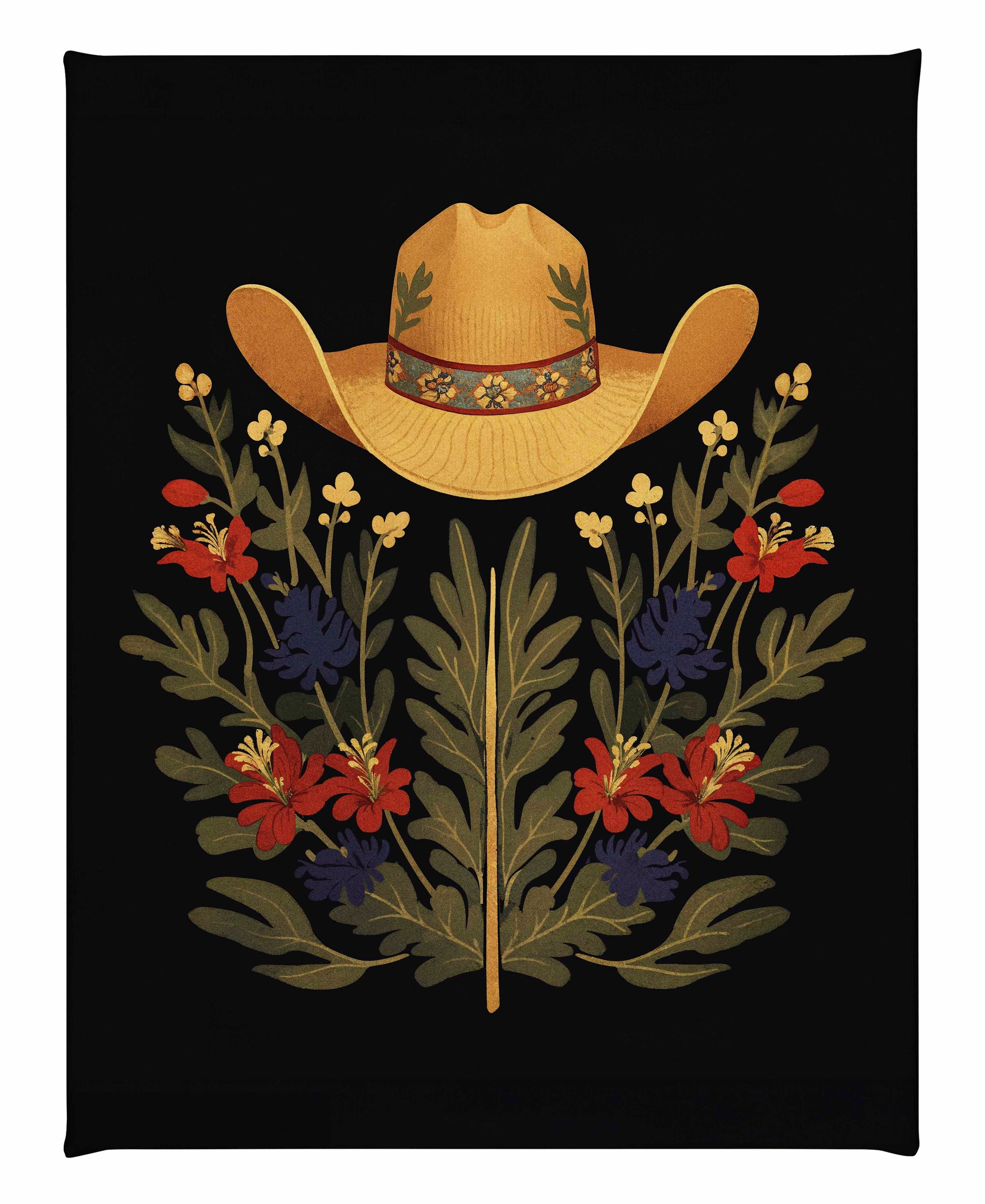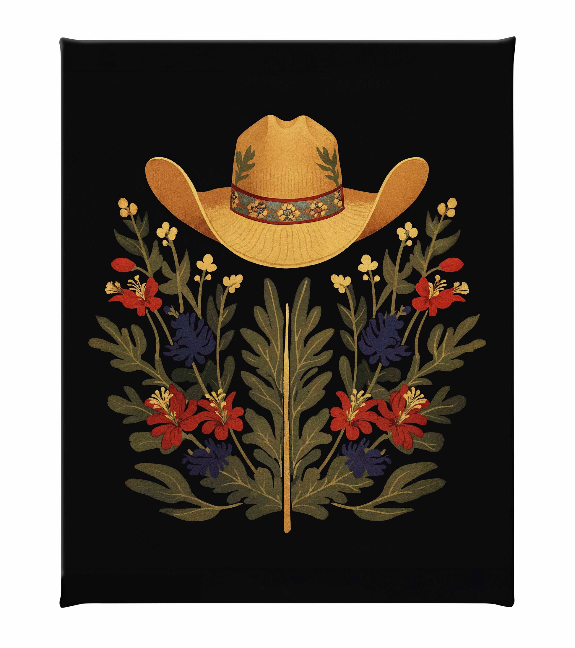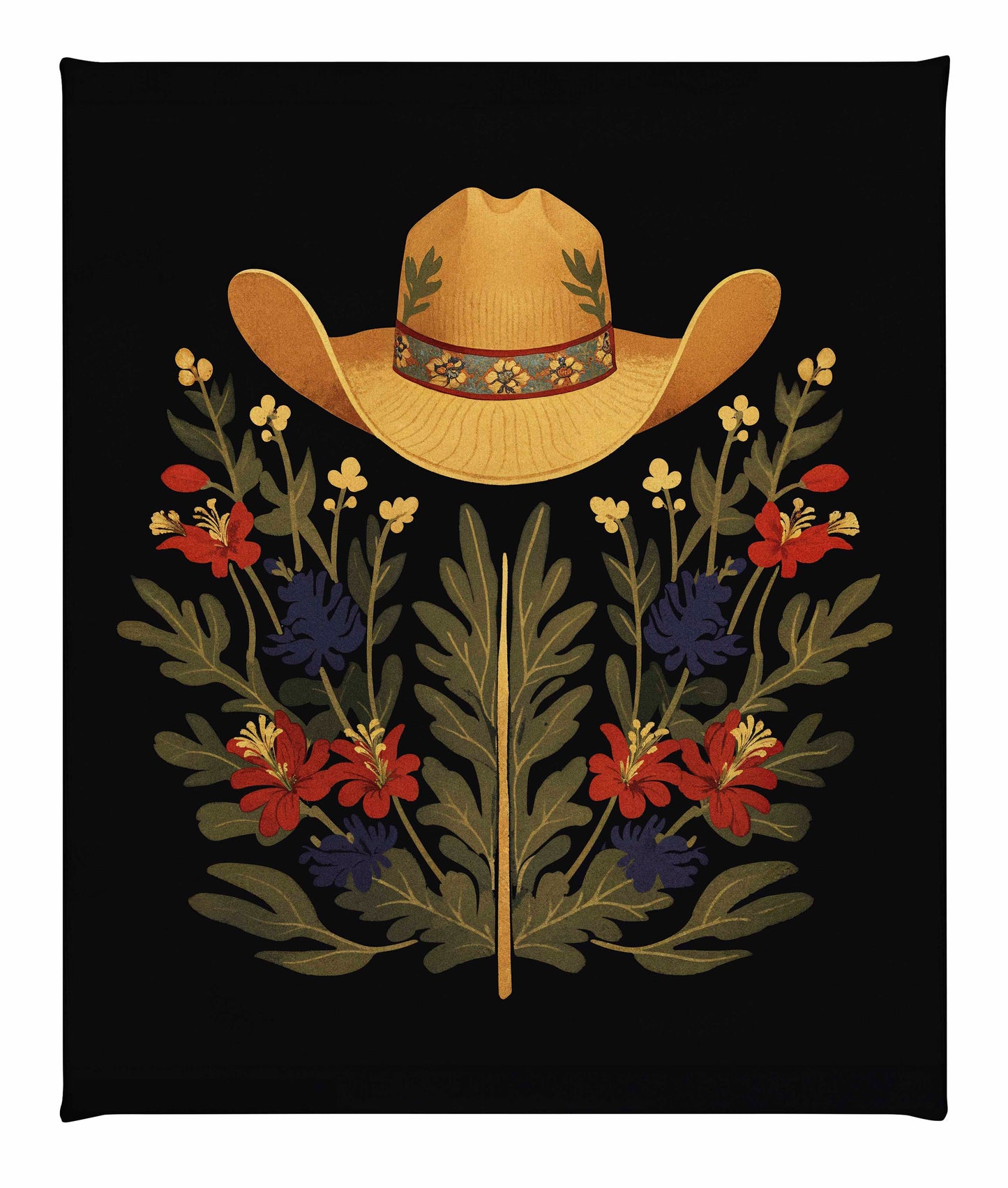 Below the hat, a lush arrangement of wildflowers and greenery unfolds. The composition includes vibrant red and deep blue flowers, along with delicate yellow blossoms, creating a rich tapestry of color and form. The flowers and leaves are arranged symmetrically, giving the piece a balanced and harmonious feel. The dark background provides a stark contrast that enhances the vivid colors of the hat and floral arrangement, making them stand out with clarity and intensity.