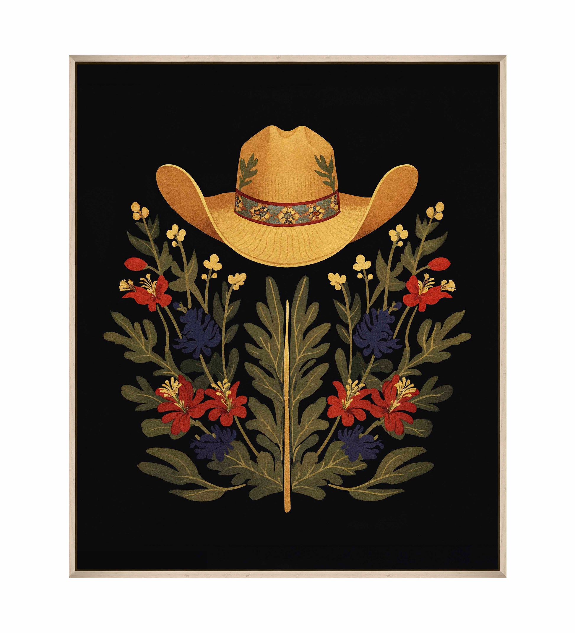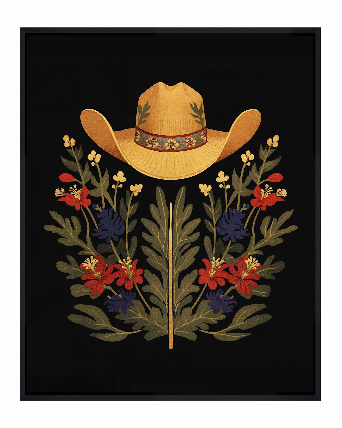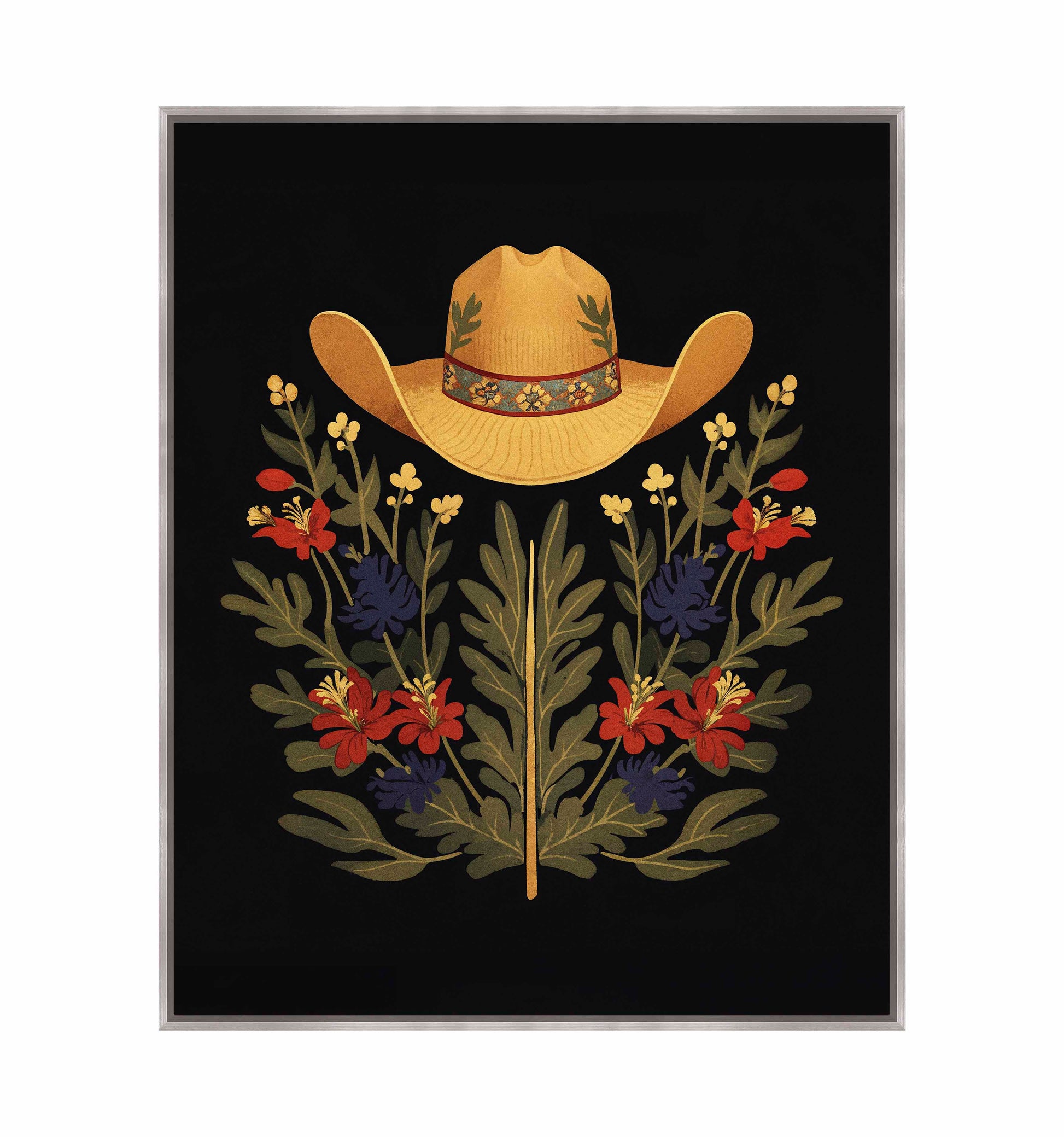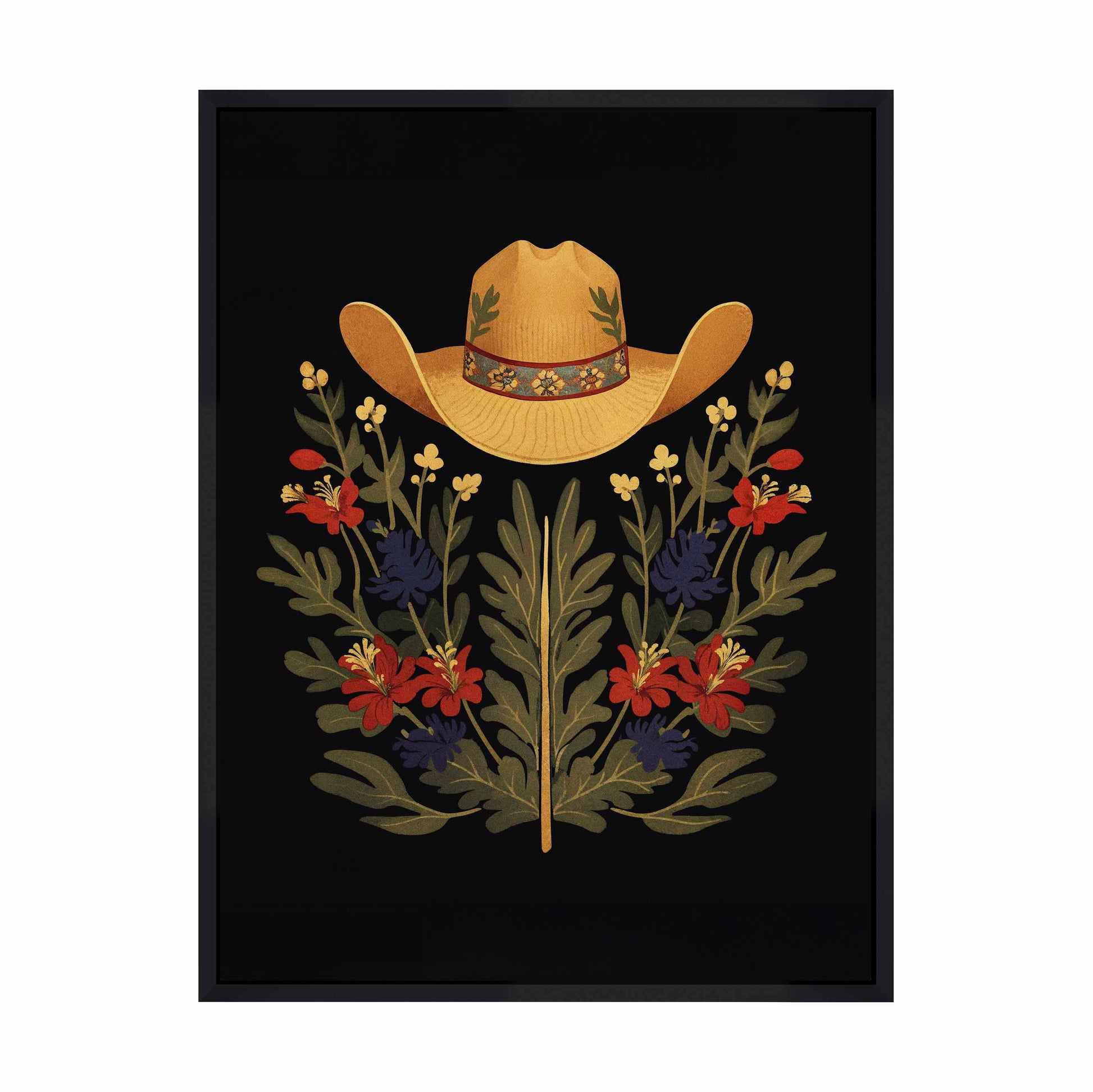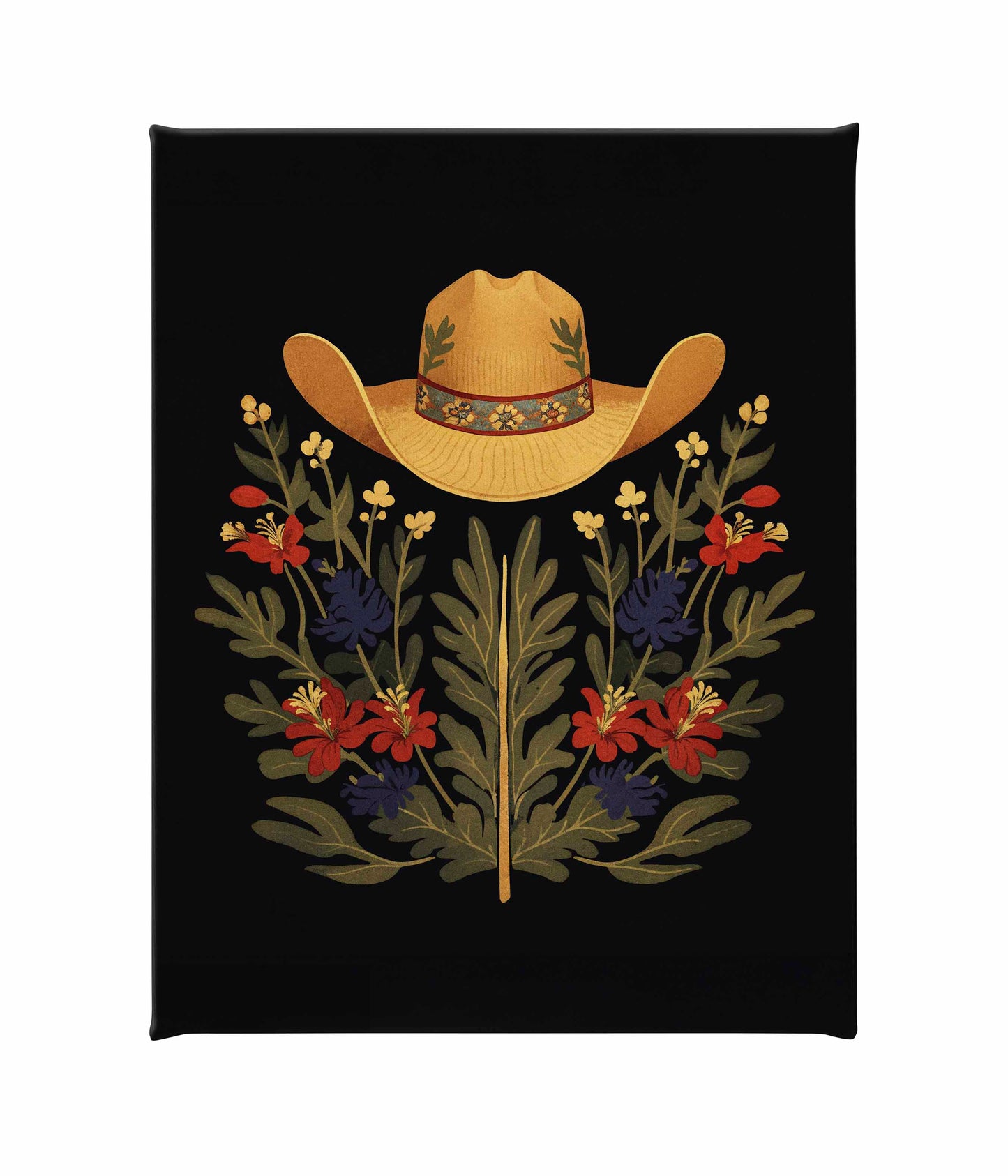 Below the hat, a lush arrangement of wildflowers and greenery unfolds. The composition includes vibrant red and deep blue flowers, along with delicate yellow blossoms, creating a rich tapestry of color and form. The flowers and leaves are arranged symmetrically, giving the piece a balanced and harmonious feel. The dark background provides a stark contrast that enhances the vivid colors of the hat and floral arrangement, making them stand out with clarity and intensity.