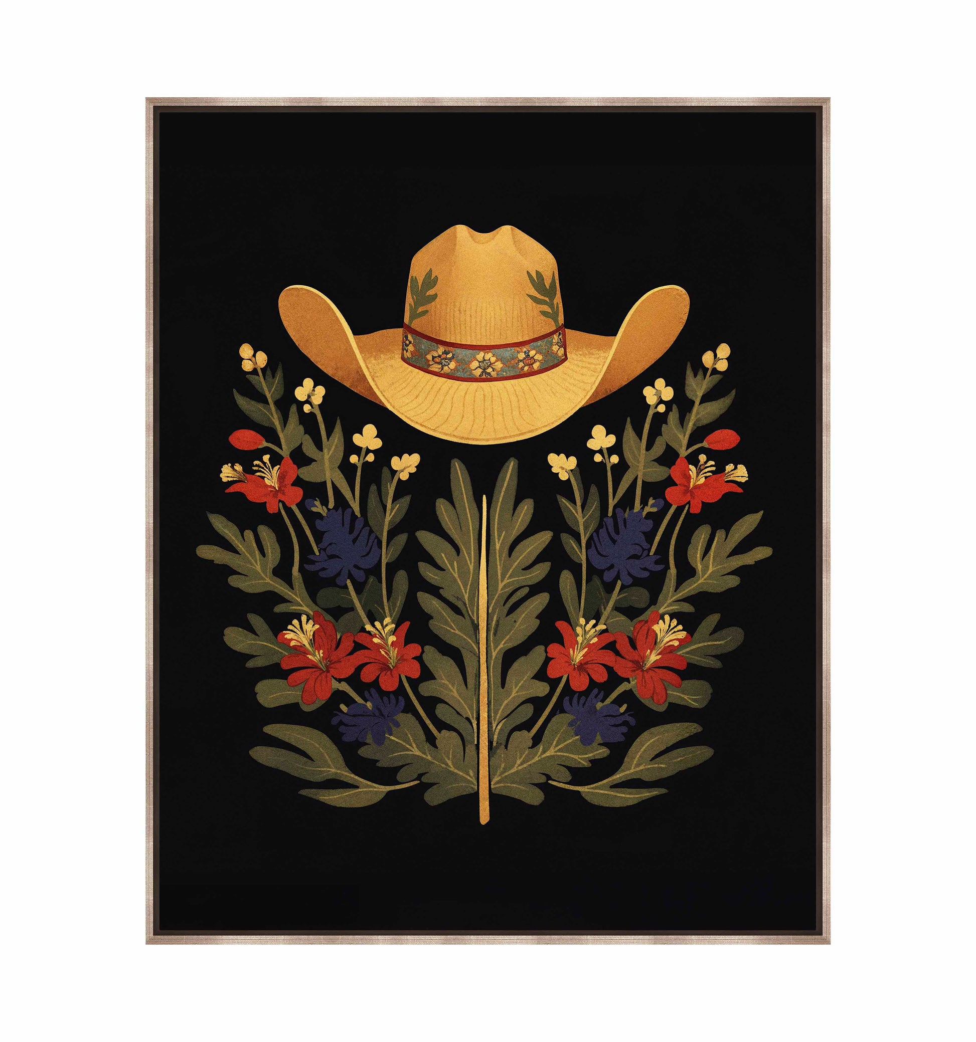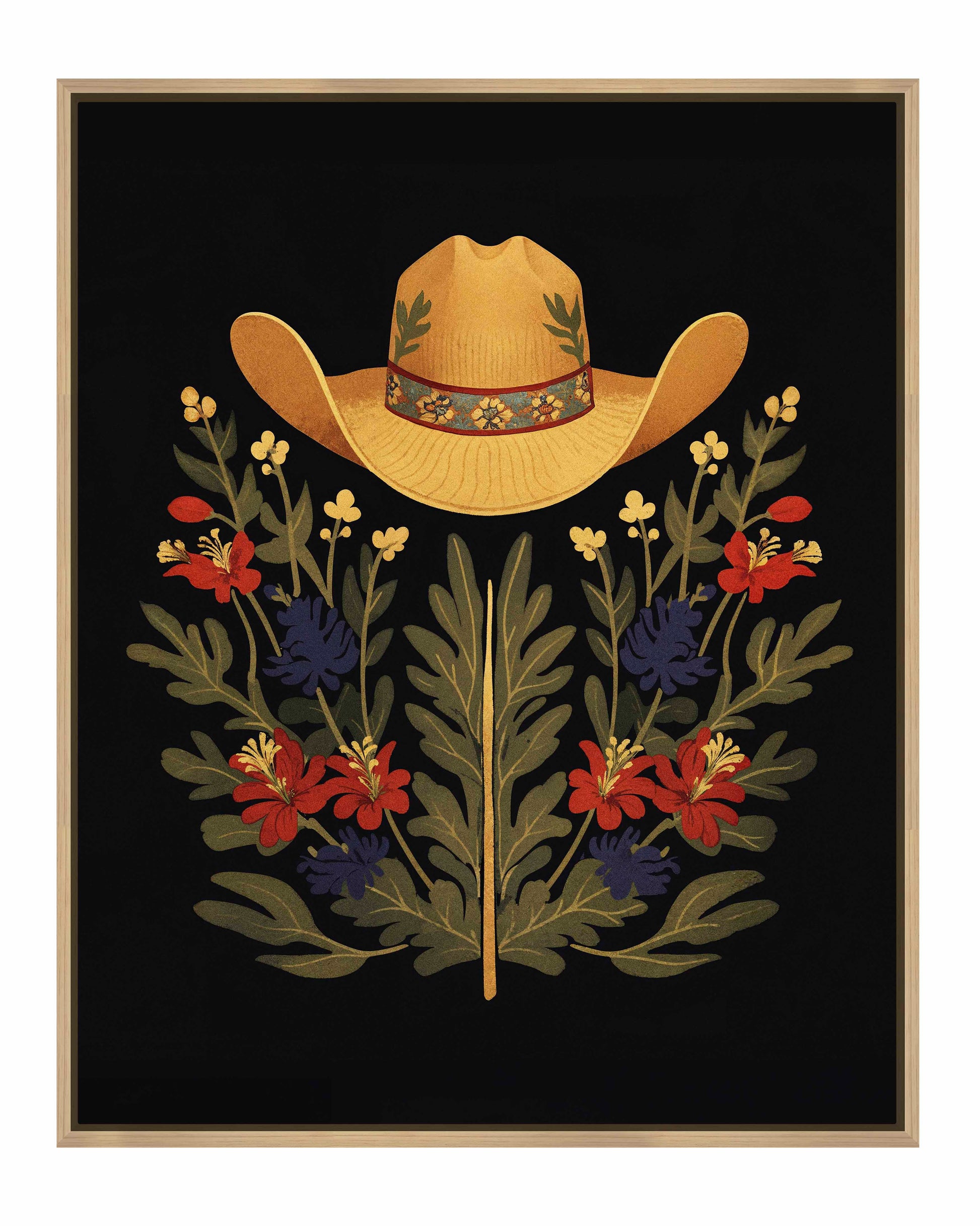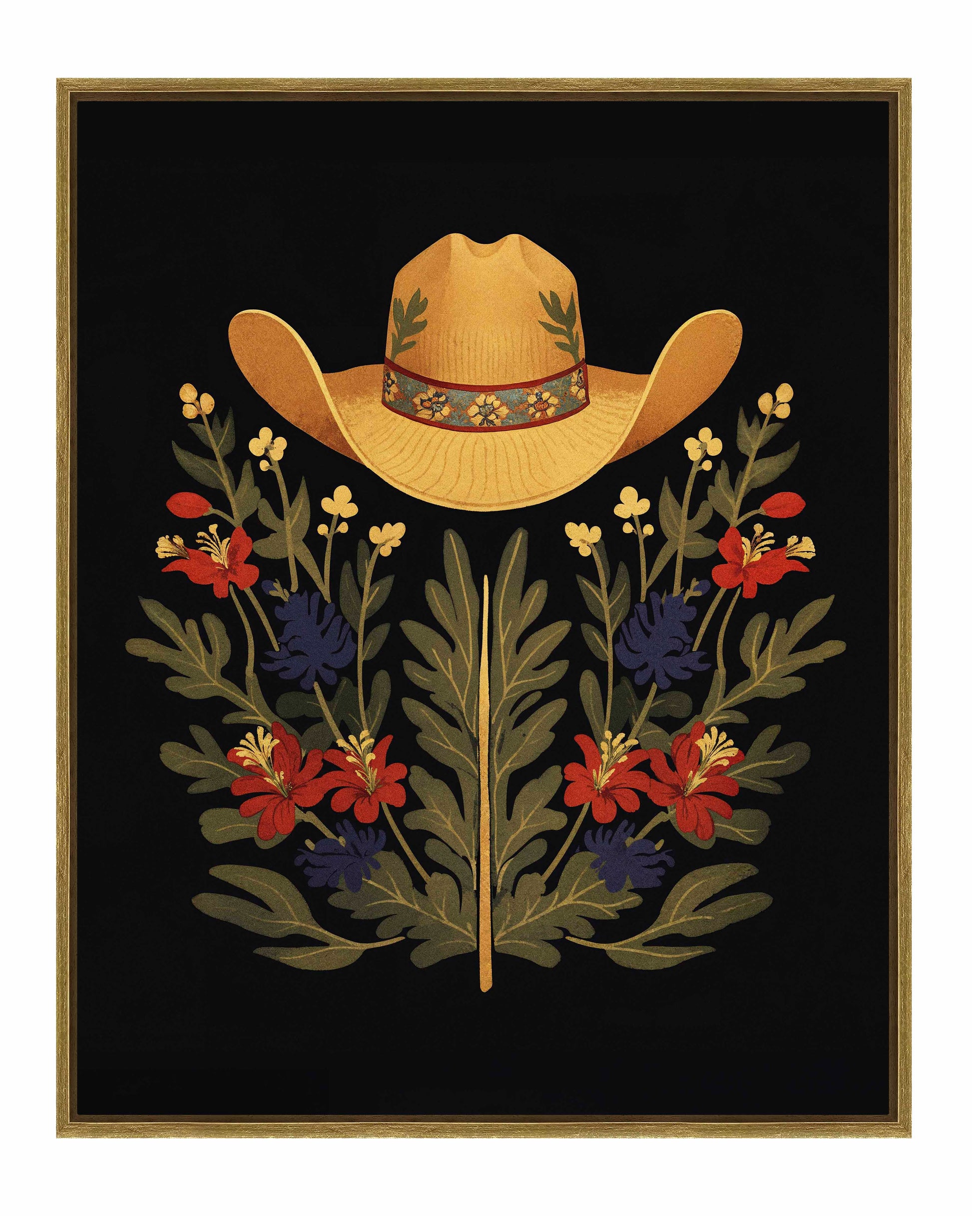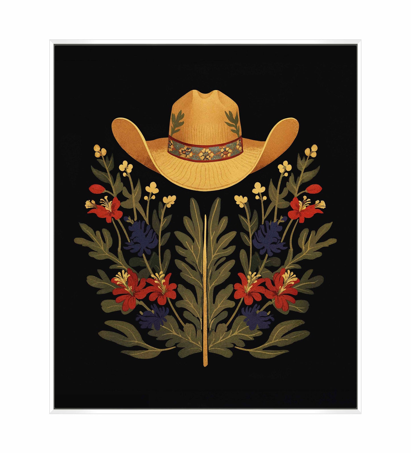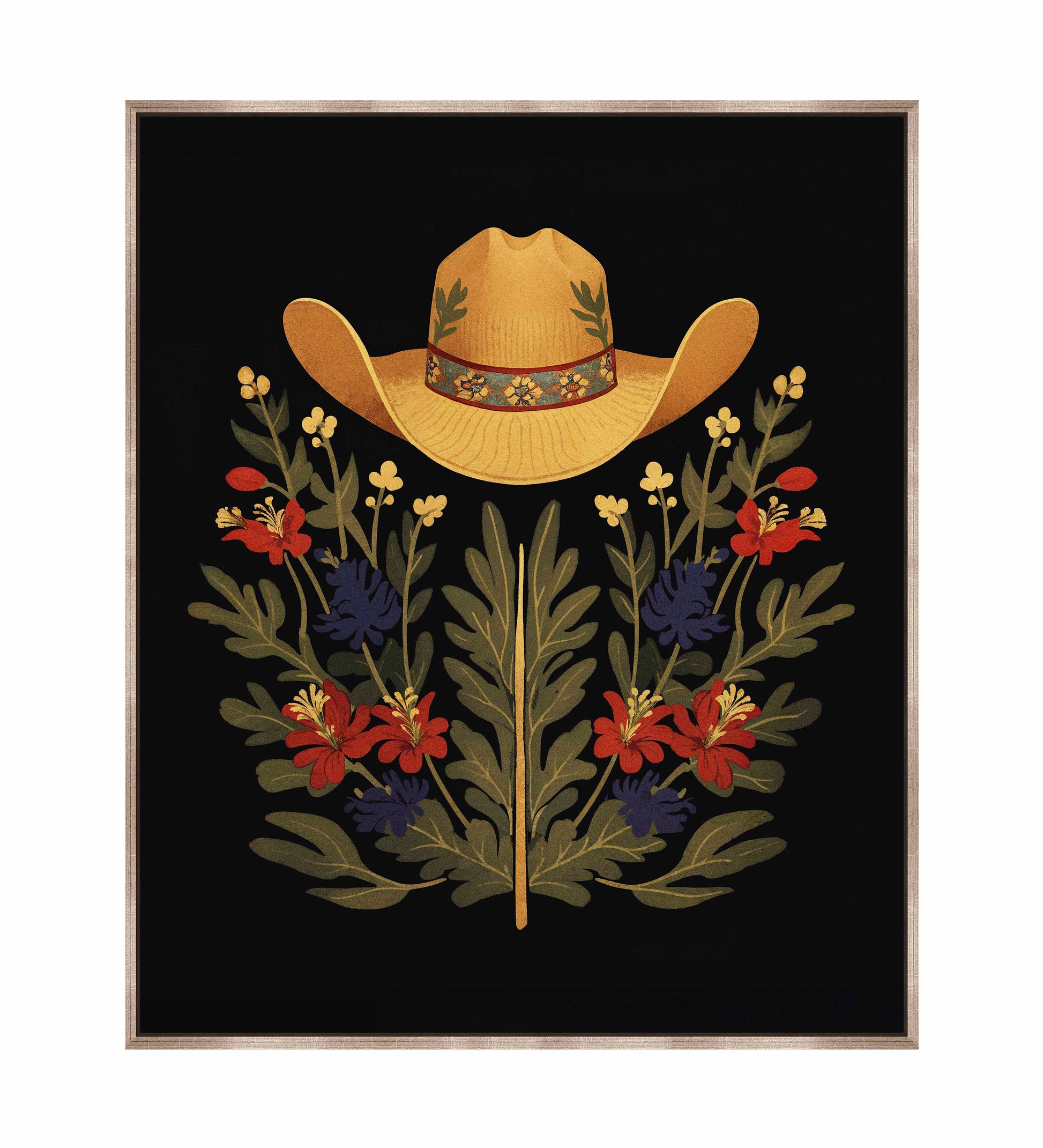 Below the hat, a lush arrangement of wildflowers and greenery unfolds. The composition includes vibrant red and deep blue flowers, along with delicate yellow blossoms, creating a rich tapestry of color and form. The flowers and leaves are arranged symmetrically, giving the piece a balanced and harmonious feel. The dark background provides a stark contrast that enhances the vivid colors of the hat and floral arrangement, making them stand out with clarity and intensity.