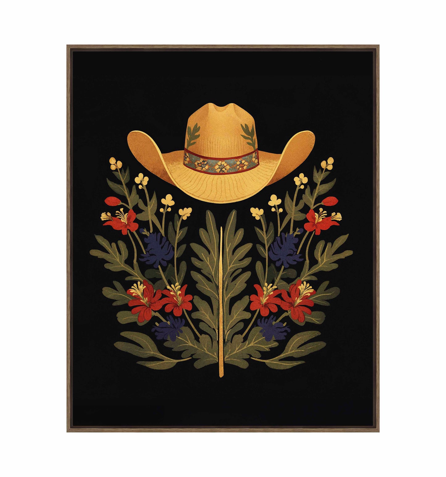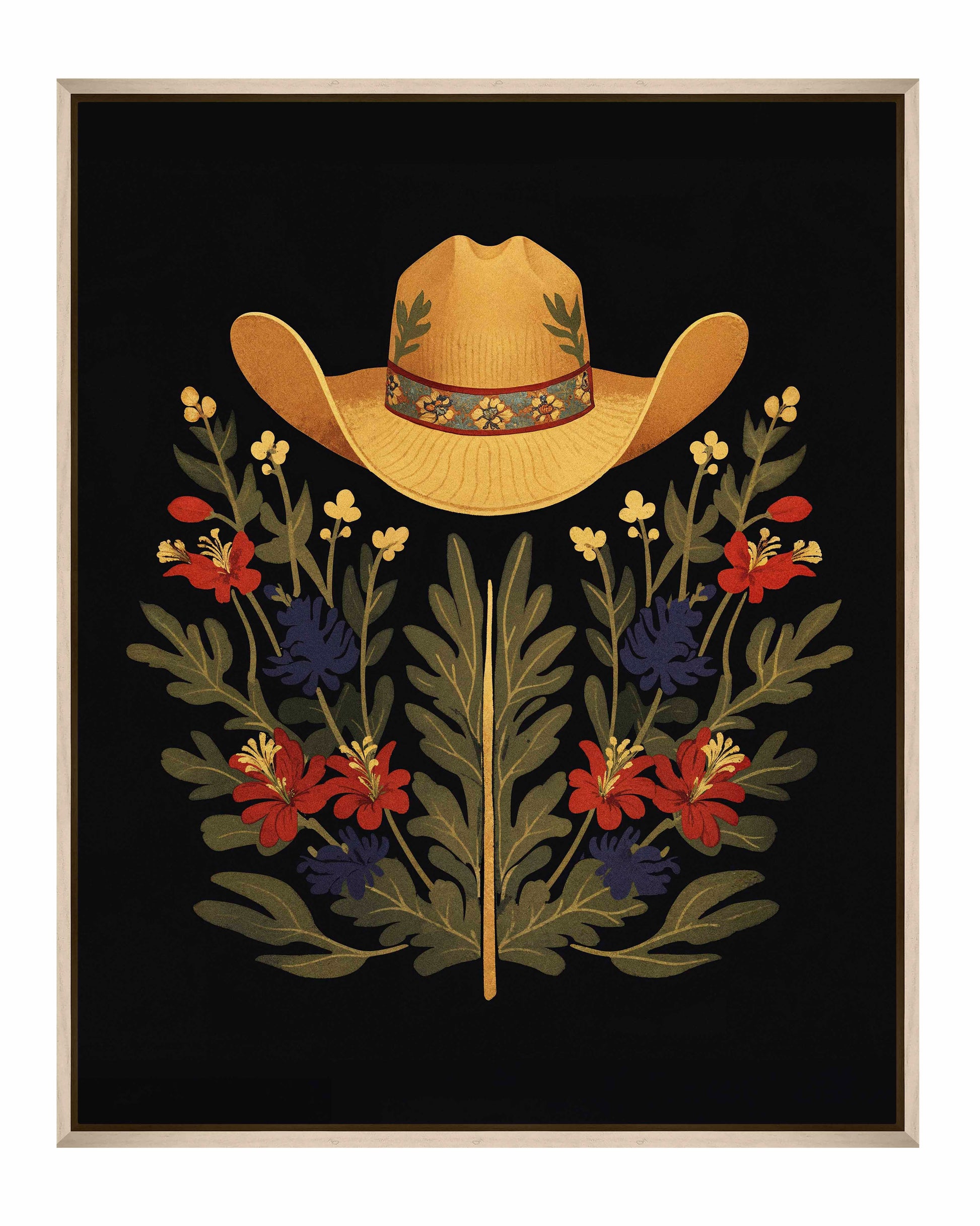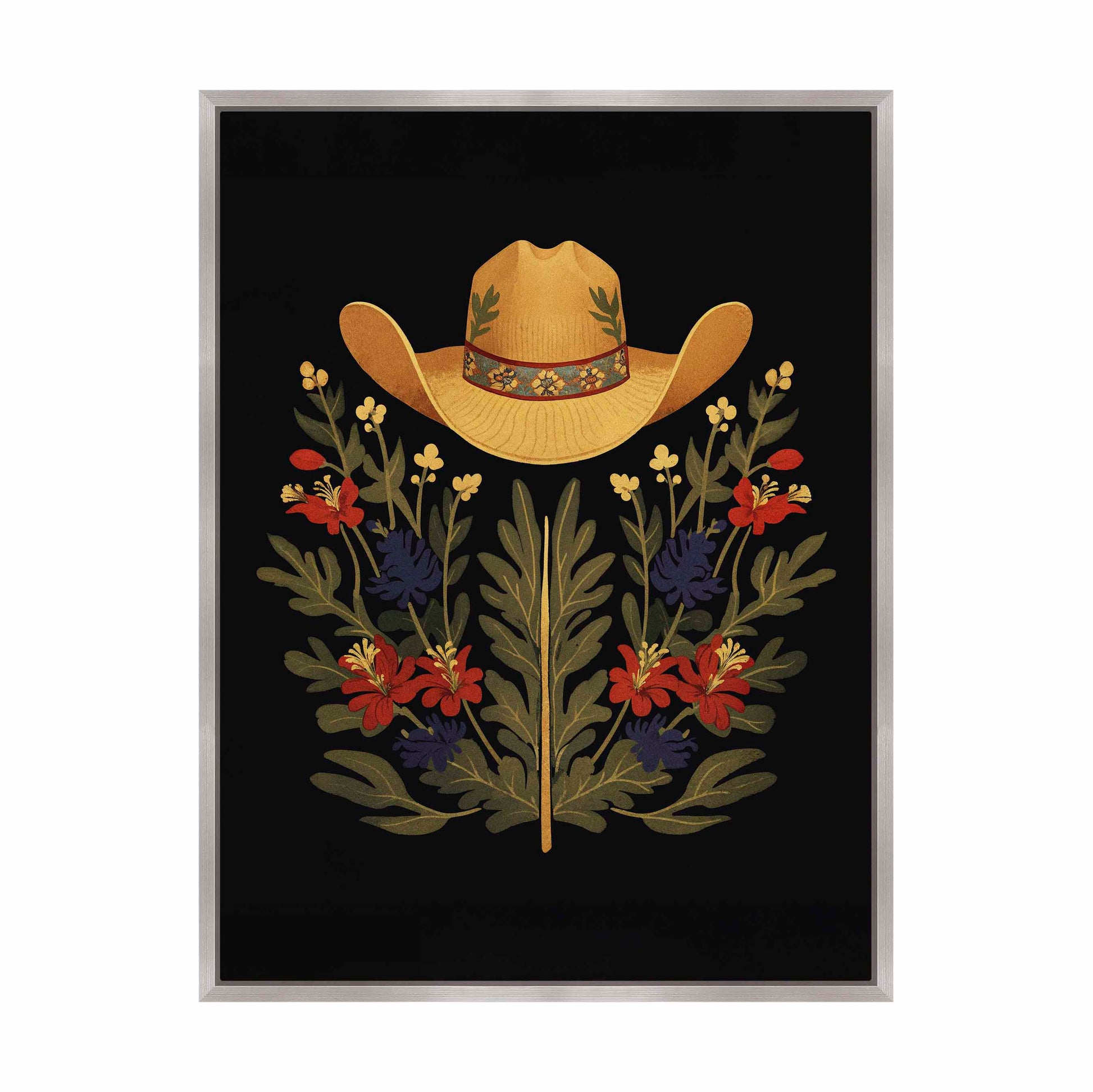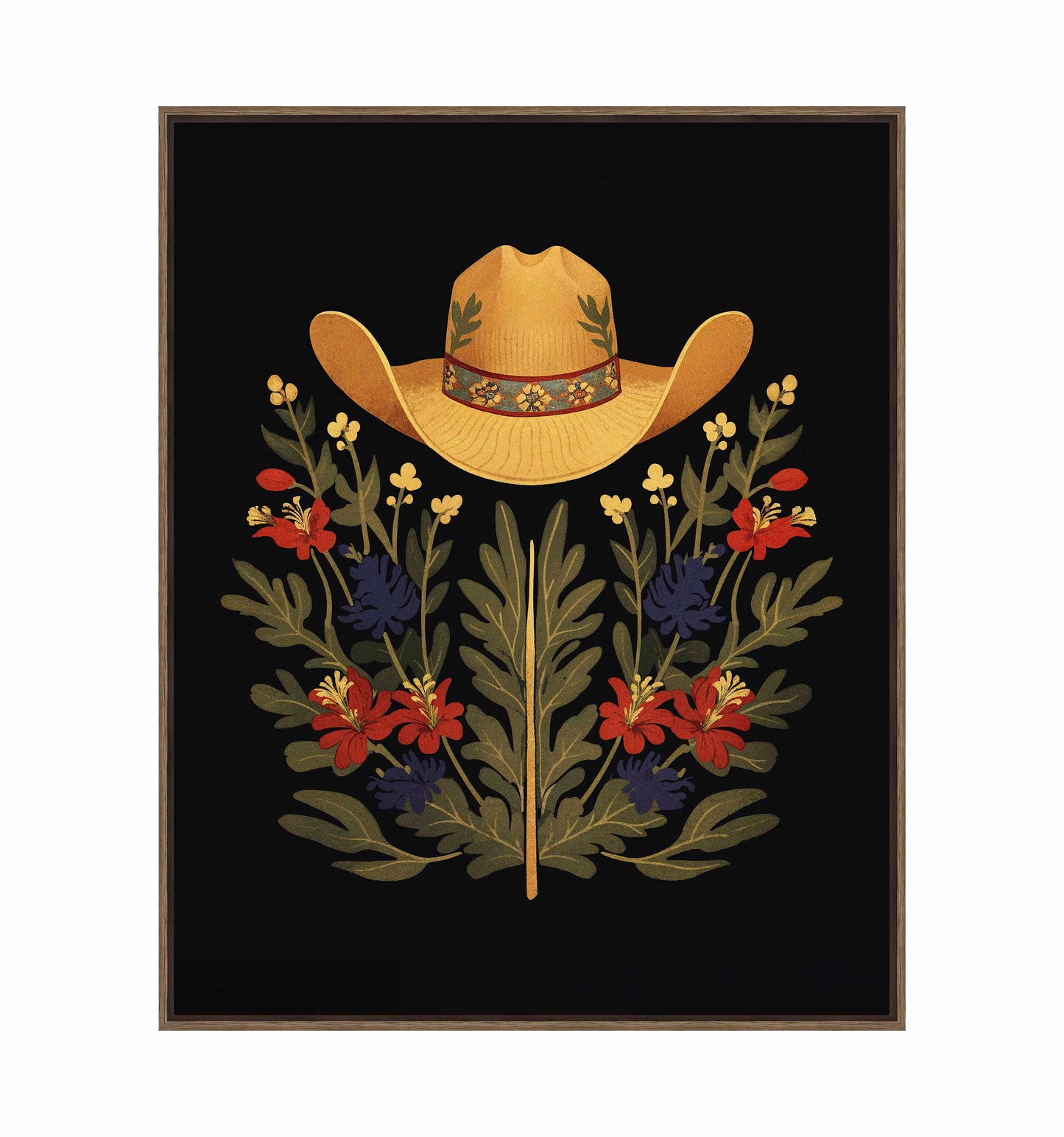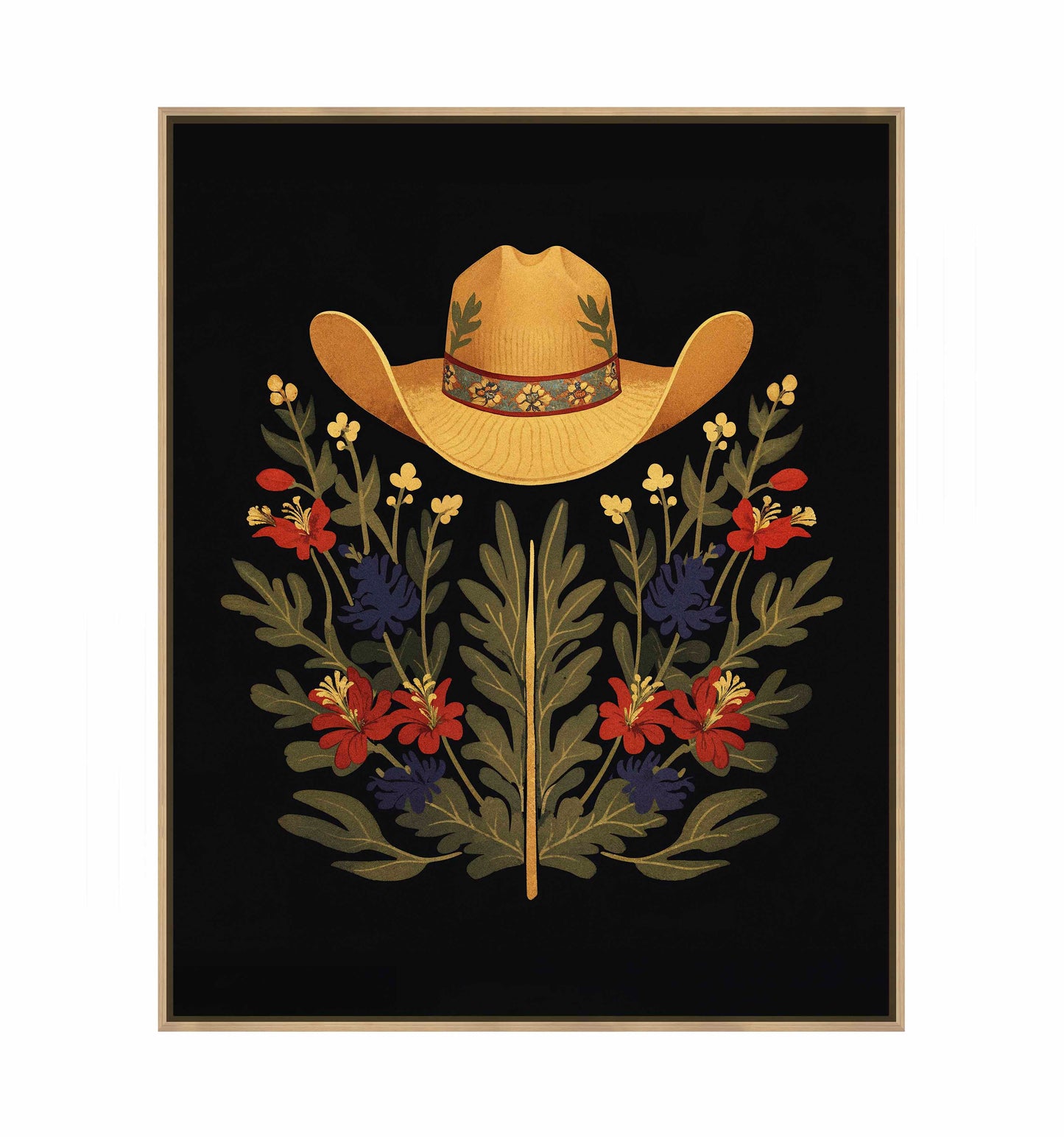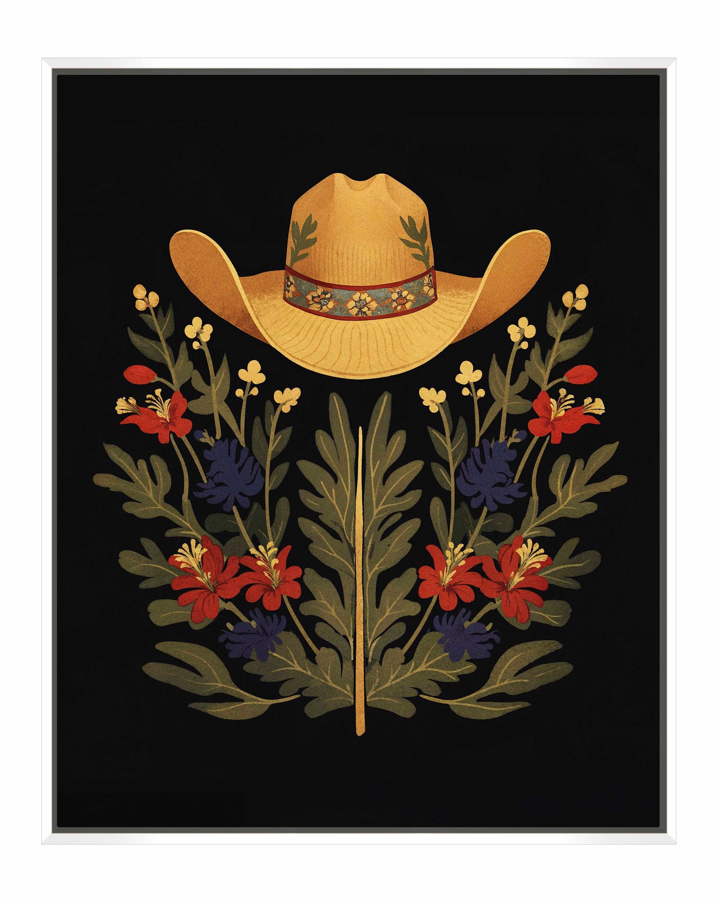 Below the hat, a lush arrangement of wildflowers and greenery unfolds. The composition includes vibrant red and deep blue flowers, along with delicate yellow blossoms, creating a rich tapestry of color and form. The flowers and leaves are arranged symmetrically, giving the piece a balanced and harmonious feel. The dark background provides a stark contrast that enhances the vivid colors of the hat and floral arrangement, making them stand out with clarity and intensity.