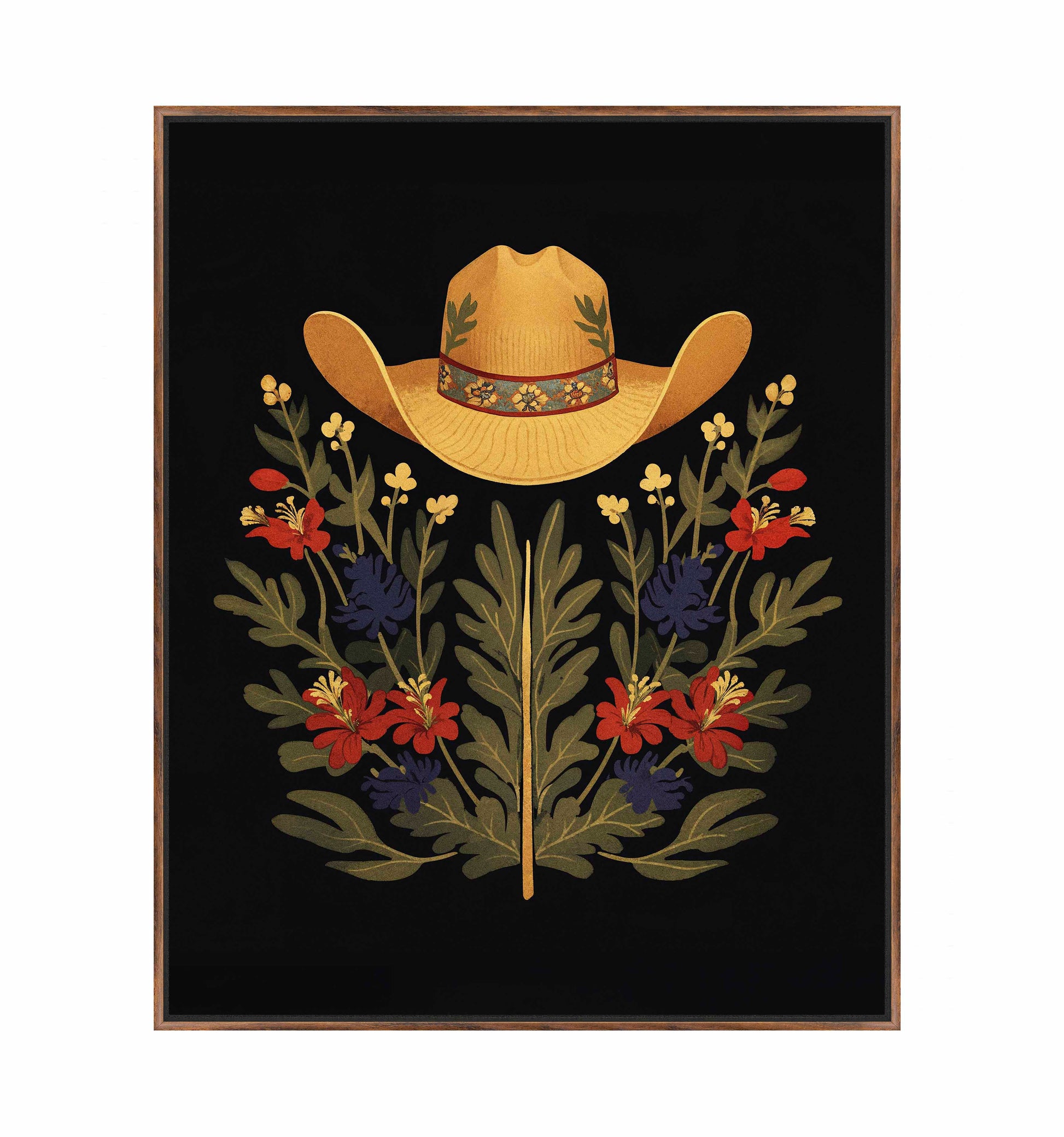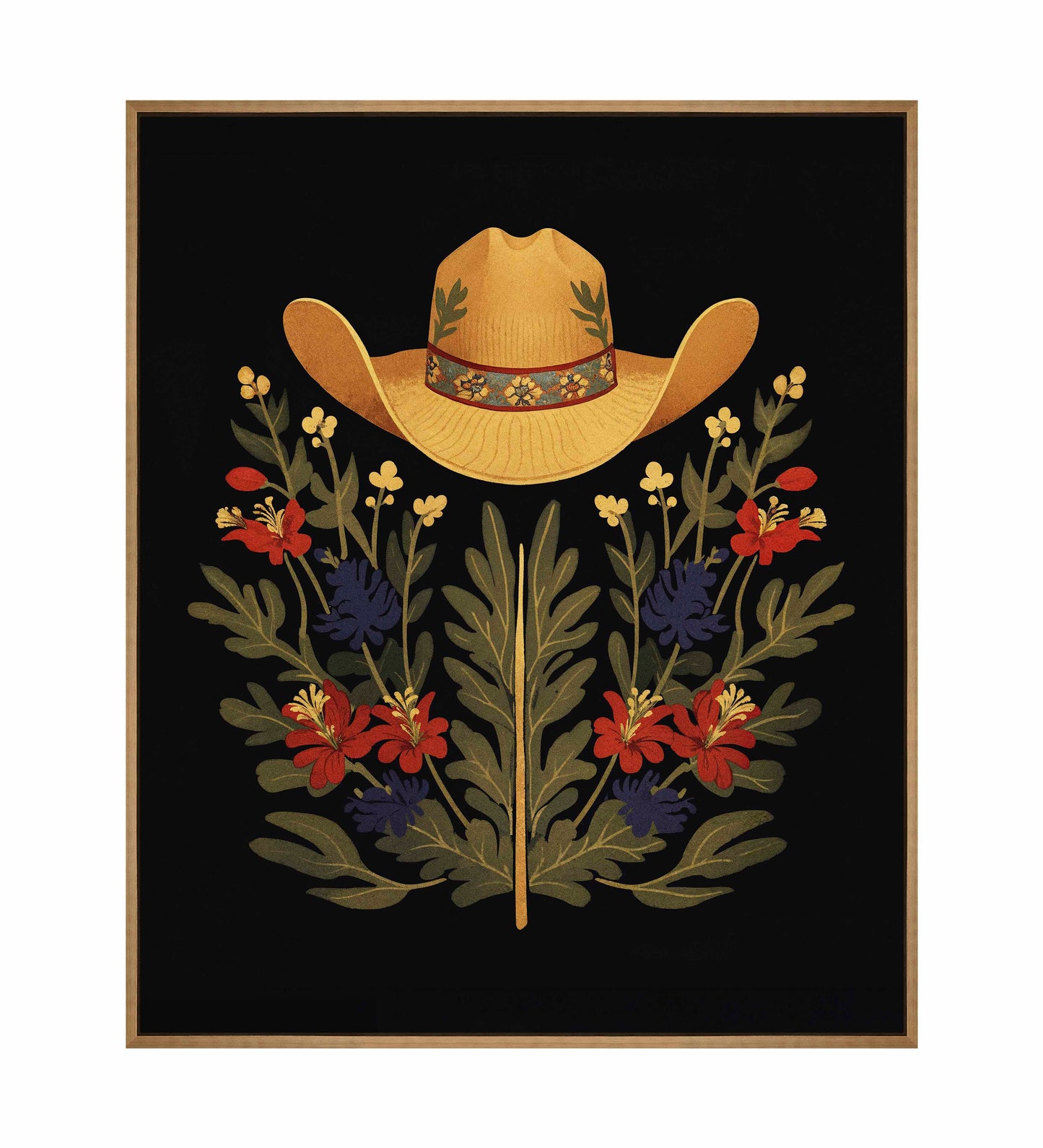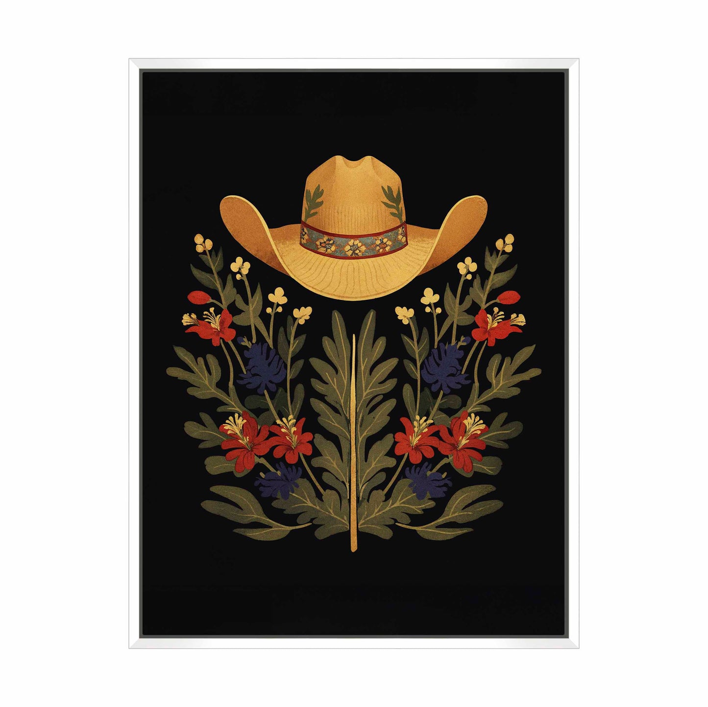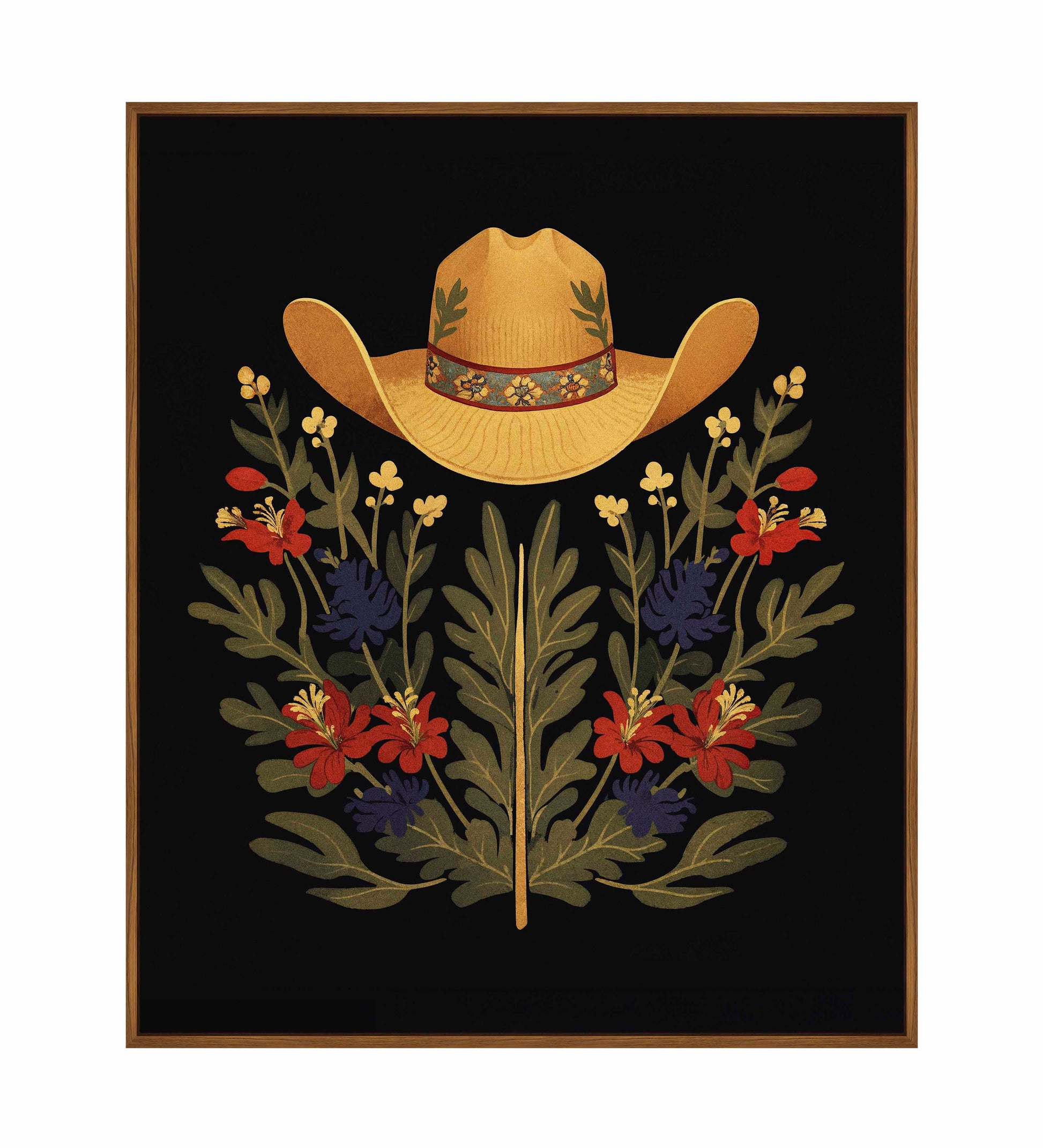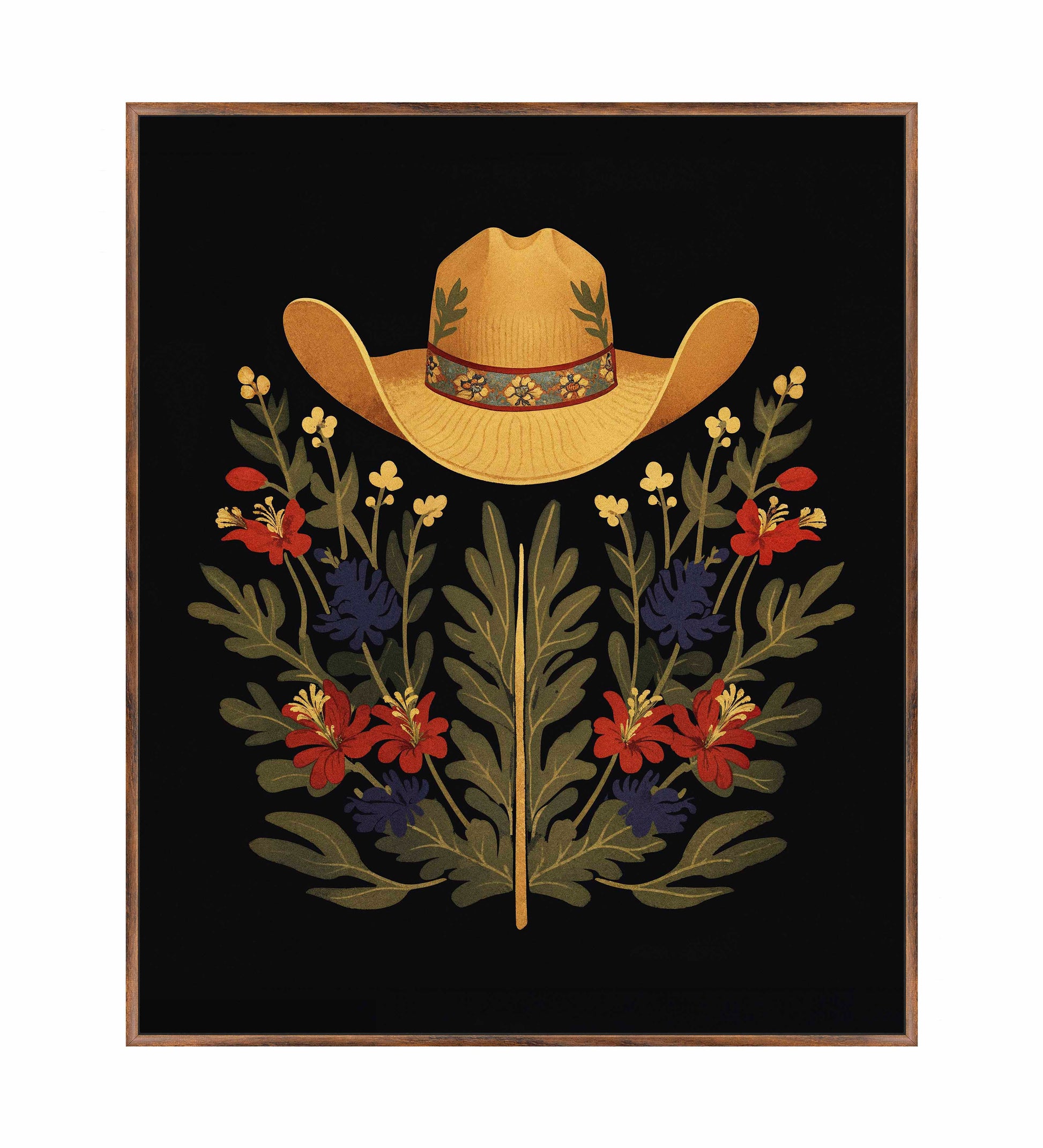 Below the hat, a lush arrangement of wildflowers and greenery unfolds. The composition includes vibrant red and deep blue flowers, along with delicate yellow blossoms, creating a rich tapestry of color and form. The flowers and leaves are arranged symmetrically, giving the piece a balanced and harmonious feel. The dark background provides a stark contrast that enhances the vivid colors of the hat and floral arrangement, making them stand out with clarity and intensity.