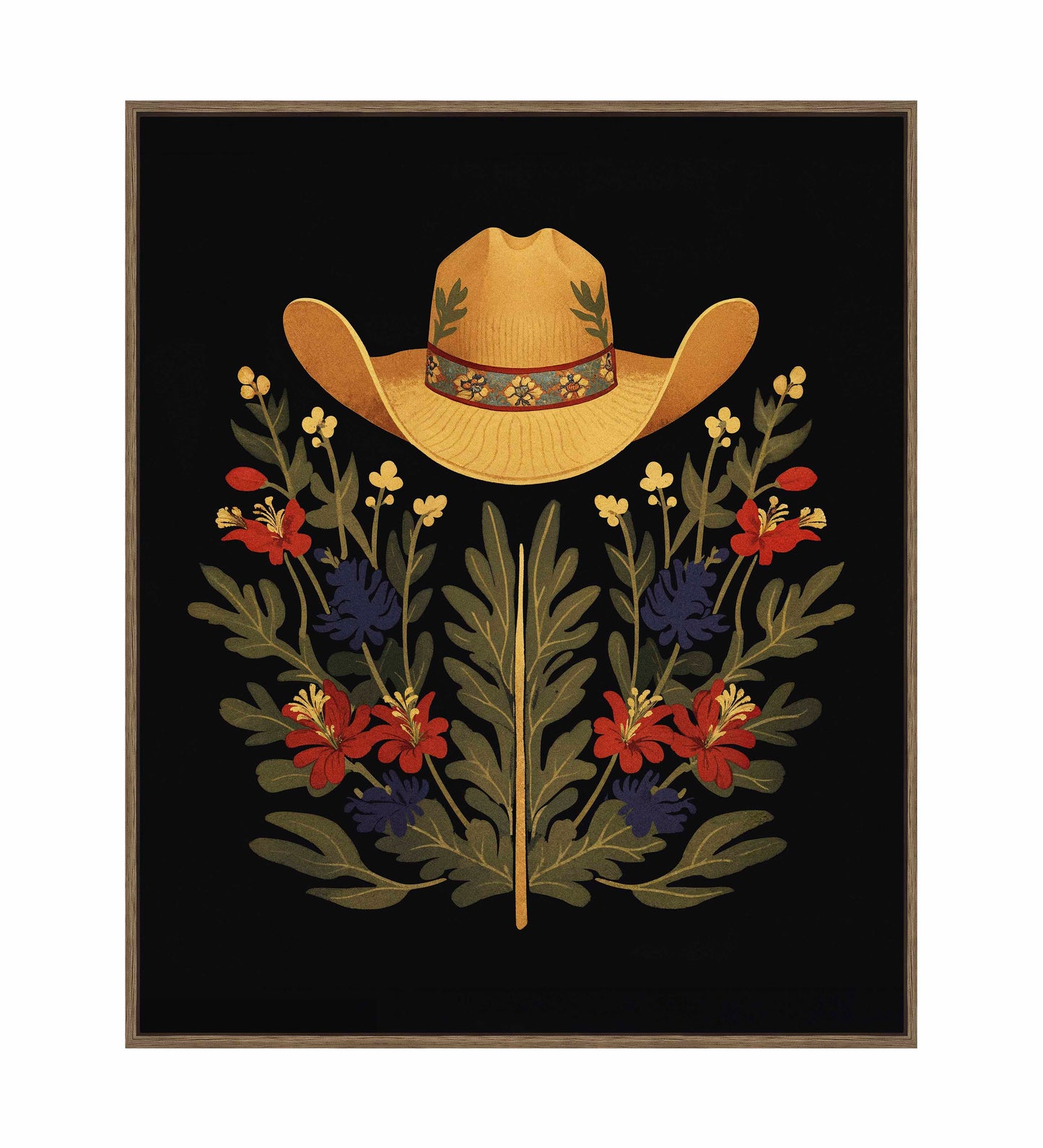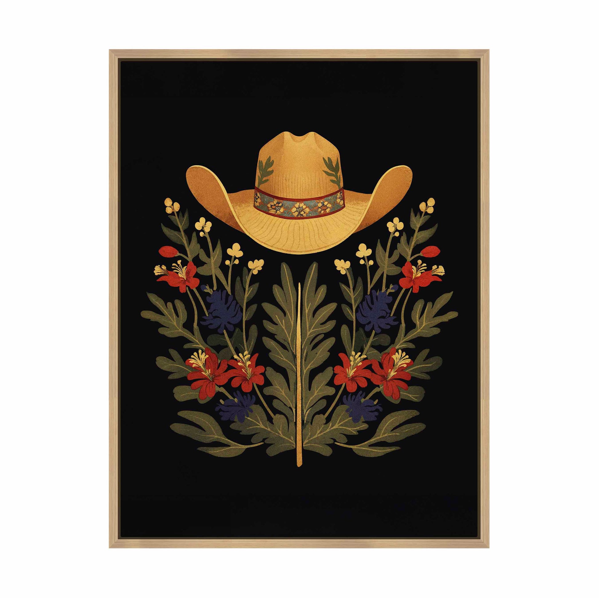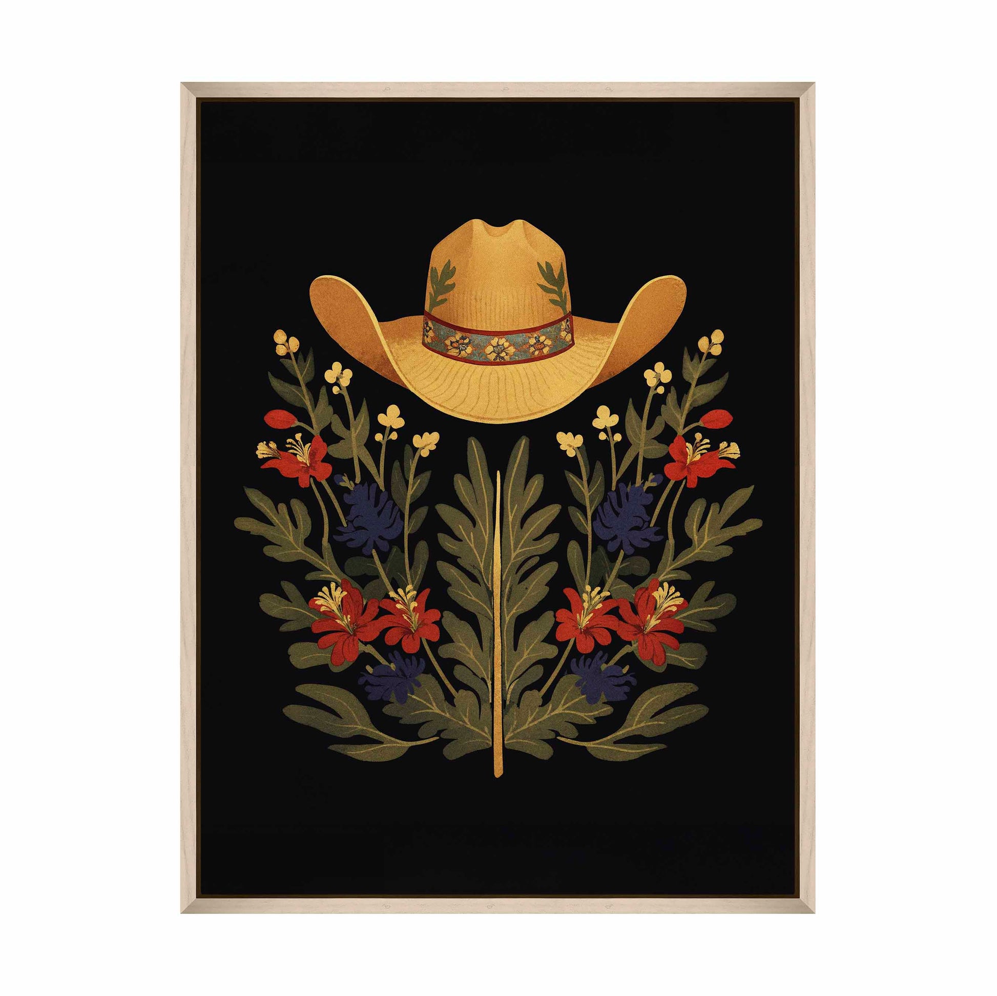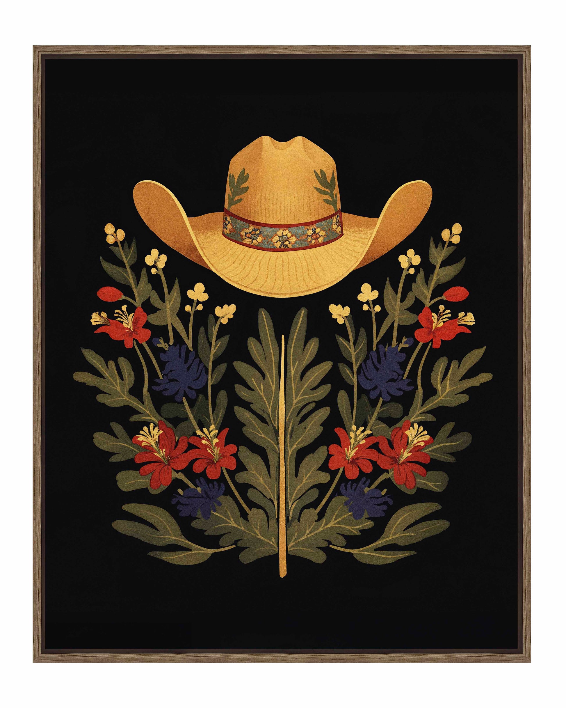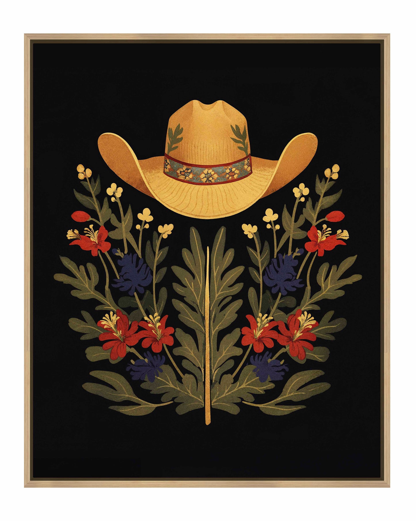 Below the hat, a lush arrangement of wildflowers and greenery unfolds. The composition includes vibrant red and deep blue flowers, along with delicate yellow blossoms, creating a rich tapestry of color and form. The flowers and leaves are arranged symmetrically, giving the piece a balanced and harmonious feel. The dark background provides a stark contrast that enhances the vivid colors of the hat and floral arrangement, making them stand out with clarity and intensity.