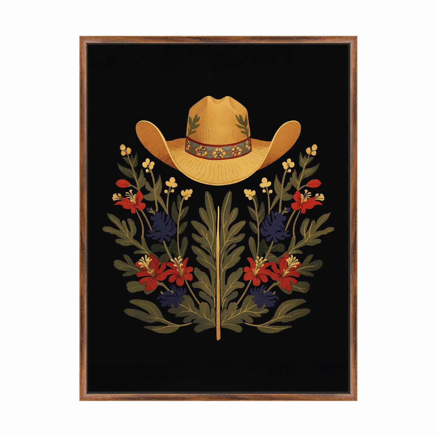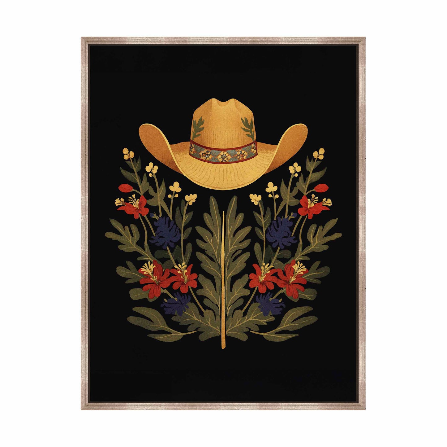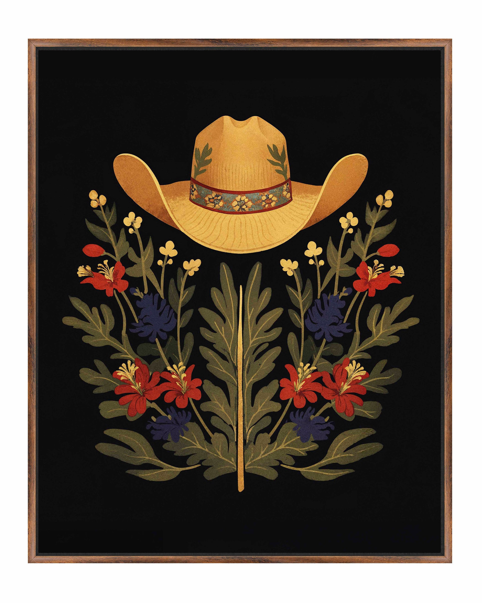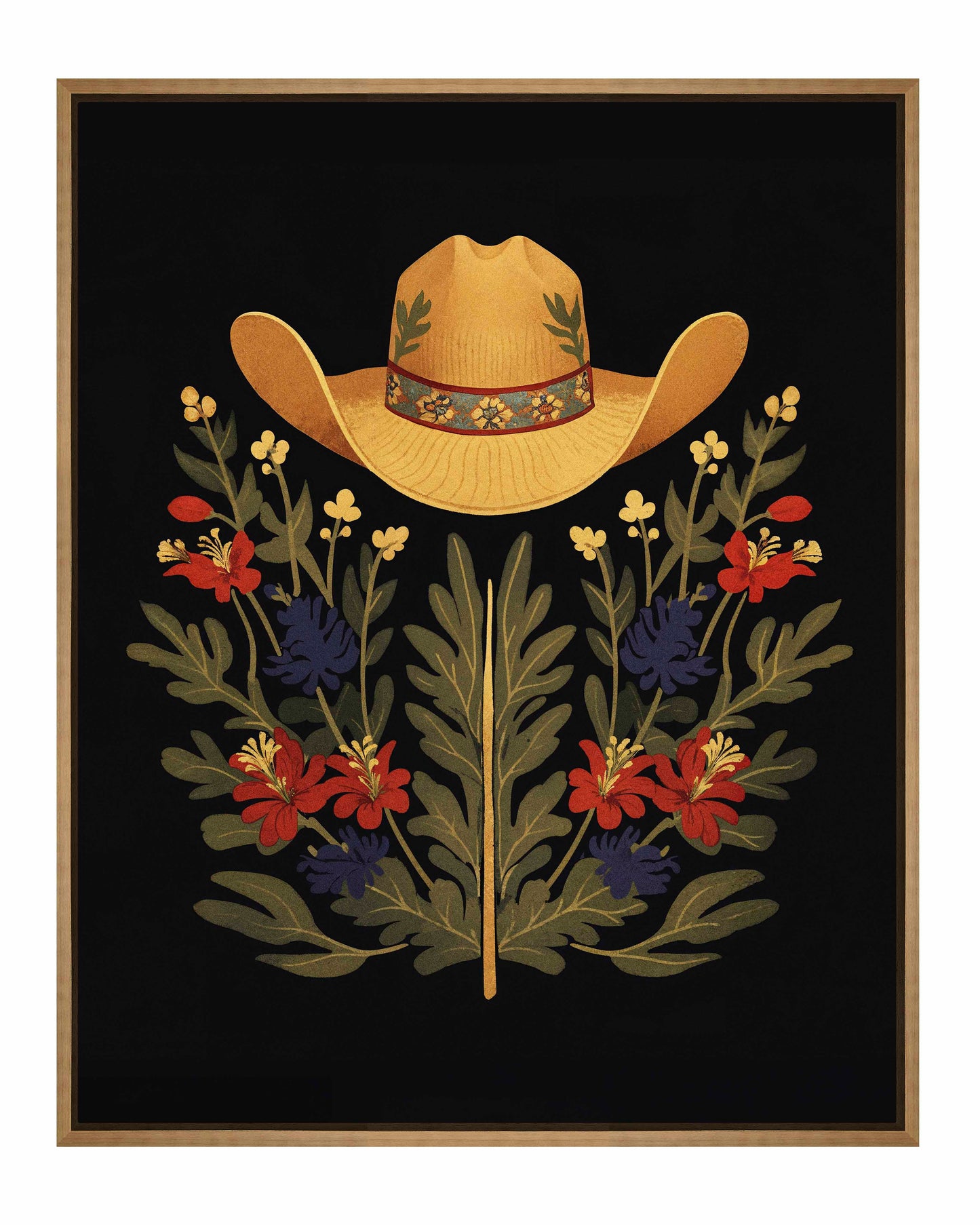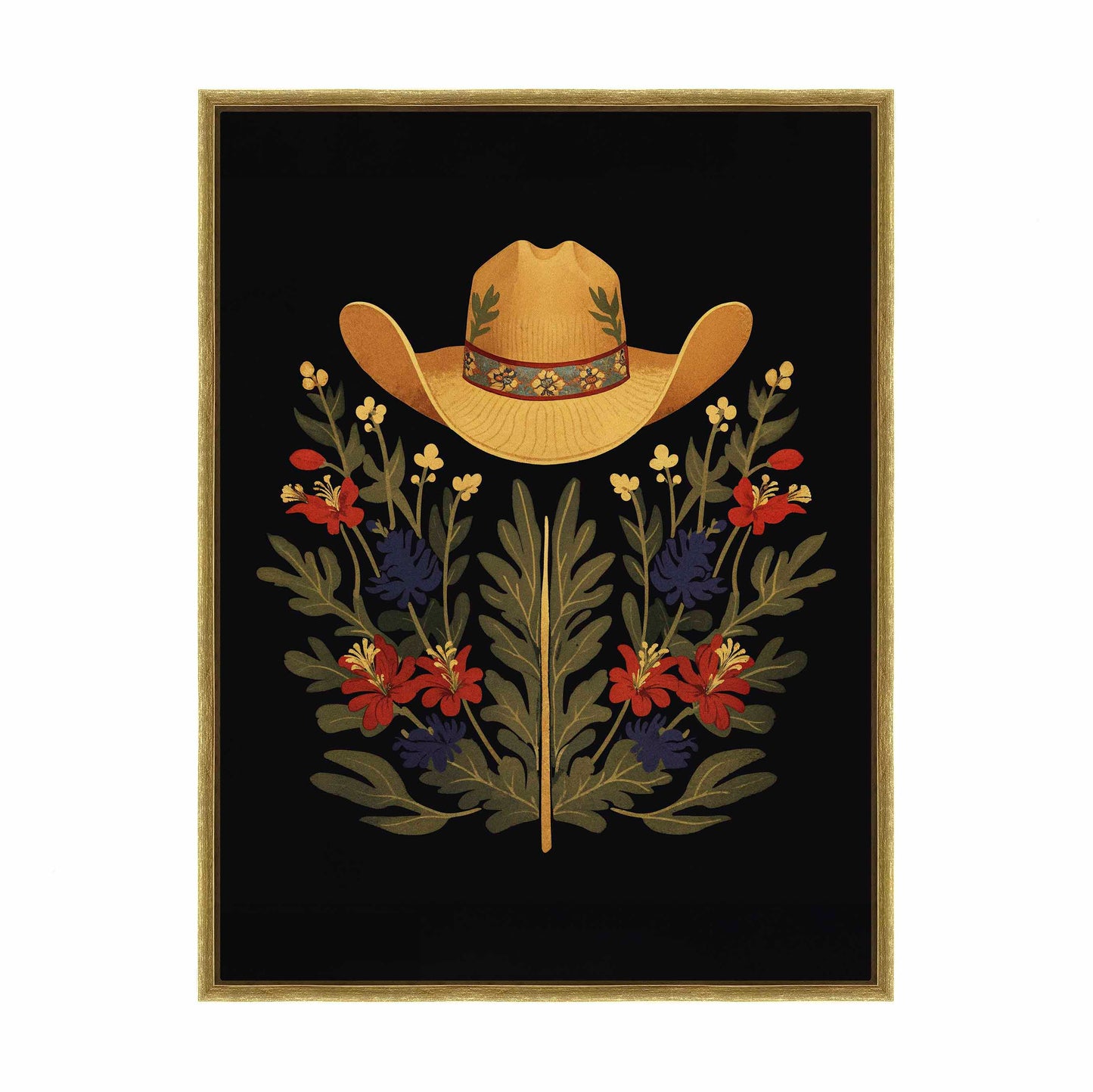 Below the hat, a lush arrangement of wildflowers and greenery unfolds. The composition includes vibrant red and deep blue flowers, along with delicate yellow blossoms, creating a rich tapestry of color and form. The flowers and leaves are arranged symmetrically, giving the piece a balanced and harmonious feel. The dark background provides a stark contrast that enhances the vivid colors of the hat and floral arrangement, making them stand out with clarity and intensity.