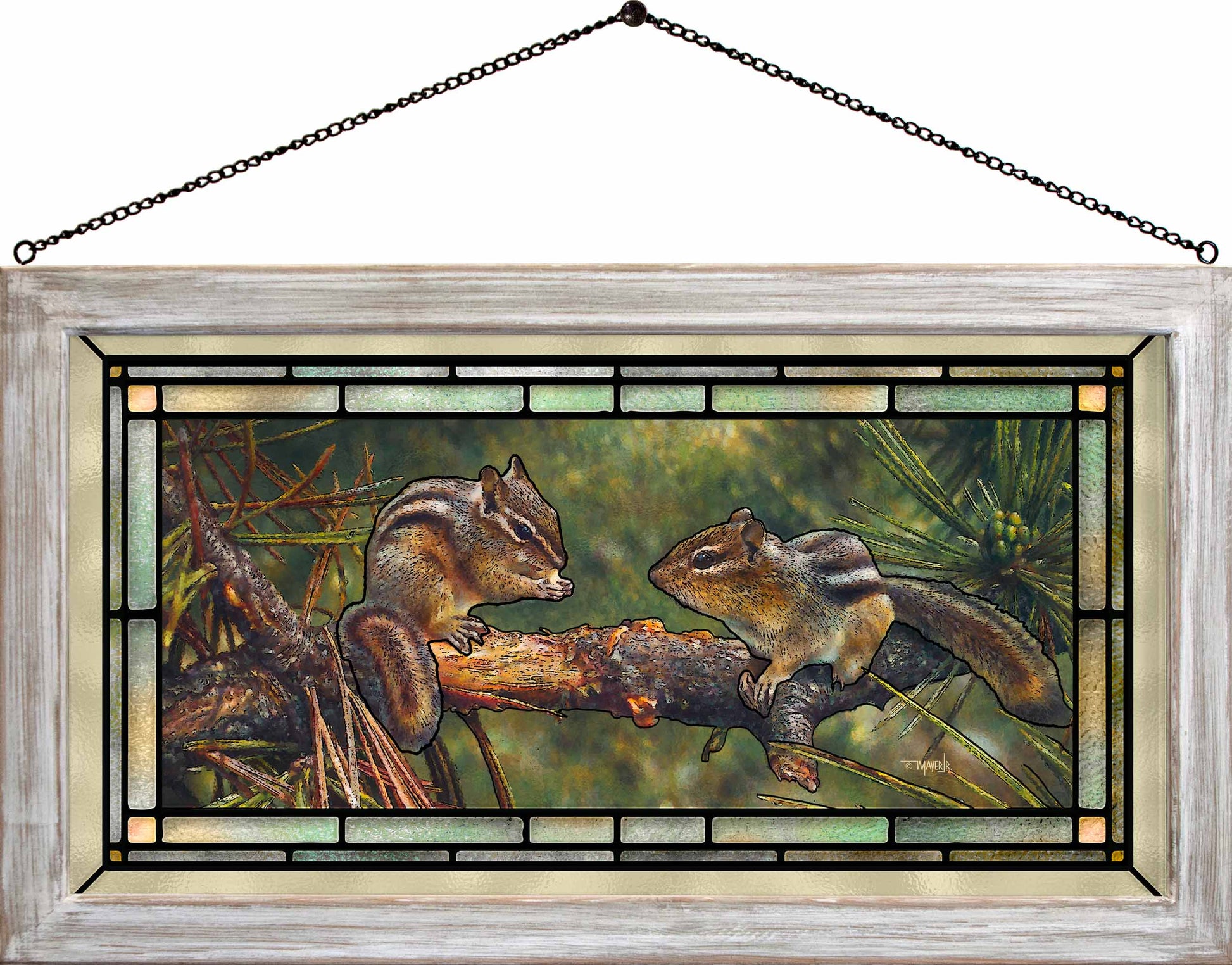 Let the light shine! Stained glass art hangings show their true colors when back-lit with natural sunlight. Popular designs are printed with fade resistant inks on 11" x 21" glass, framed with 1" black-finished moulding. Framed size 13" x 23". Ready to hang with provided chain. Designed, printed, and assembled in North America.
