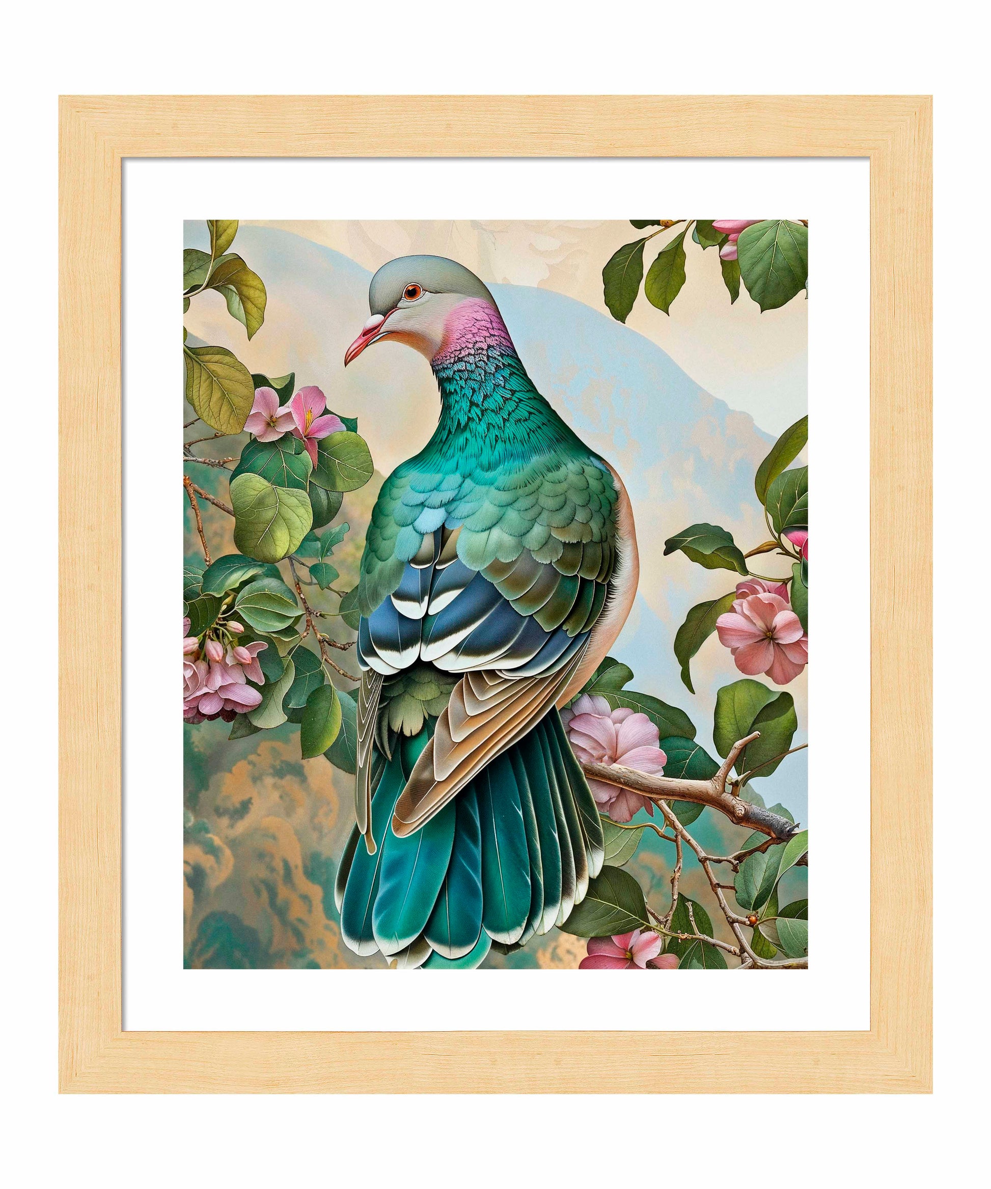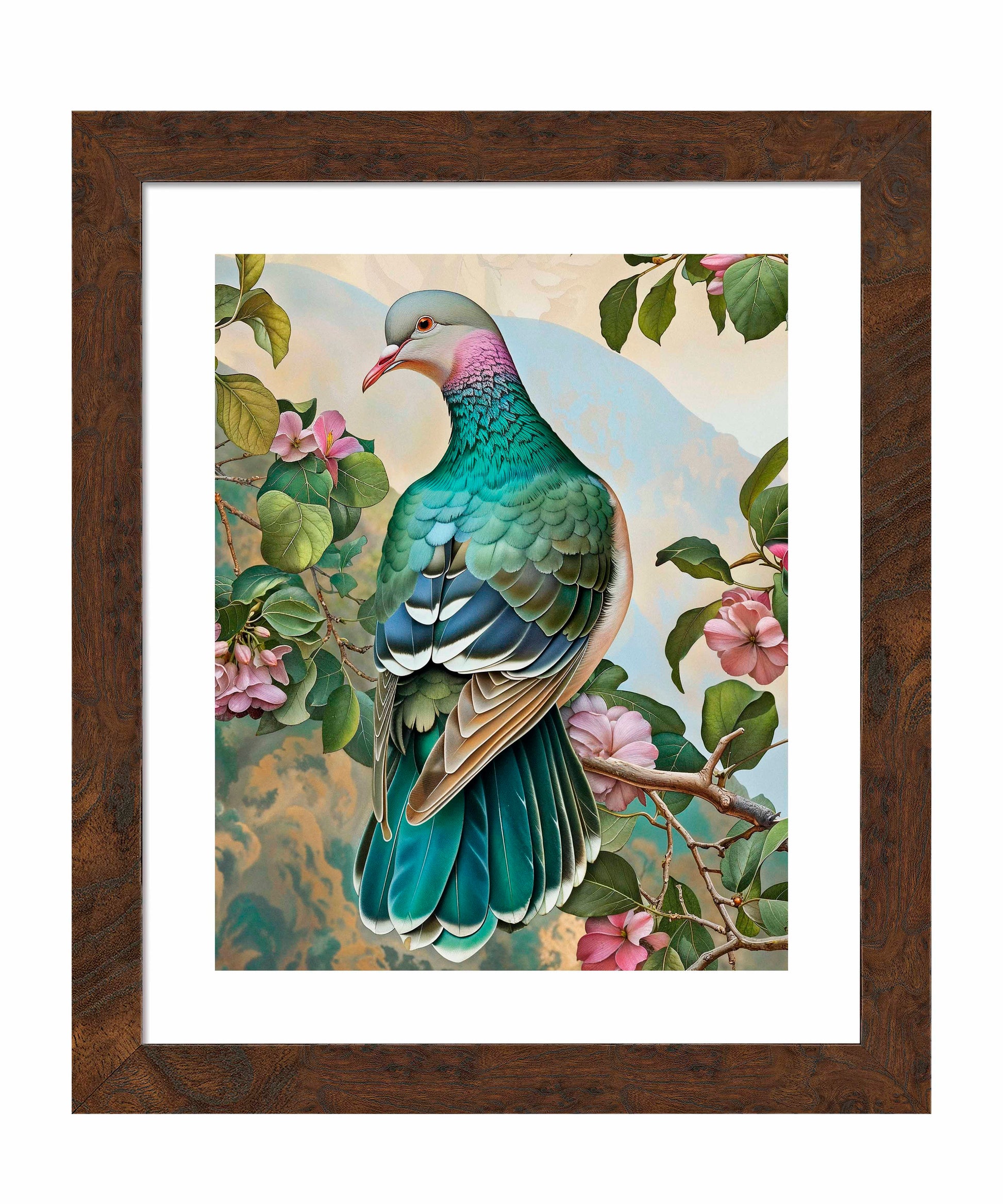 Verdant Splendor - Dove Amidst Blossoms, part of the Sonora Emerald Collection, showcases the serene elegance and vibrant beauty of a dove perched delicately among blooming flowers. The dove's plumage, depicted in an exquisite palette of greens, blues, and soft purples, is intricately detailed, highlighting the bird's graceful form and the iridescent quality of its feathers. The surrounding blossoms and lush foliage create a harmonious backdrop, enhancing the dove's natural charm.