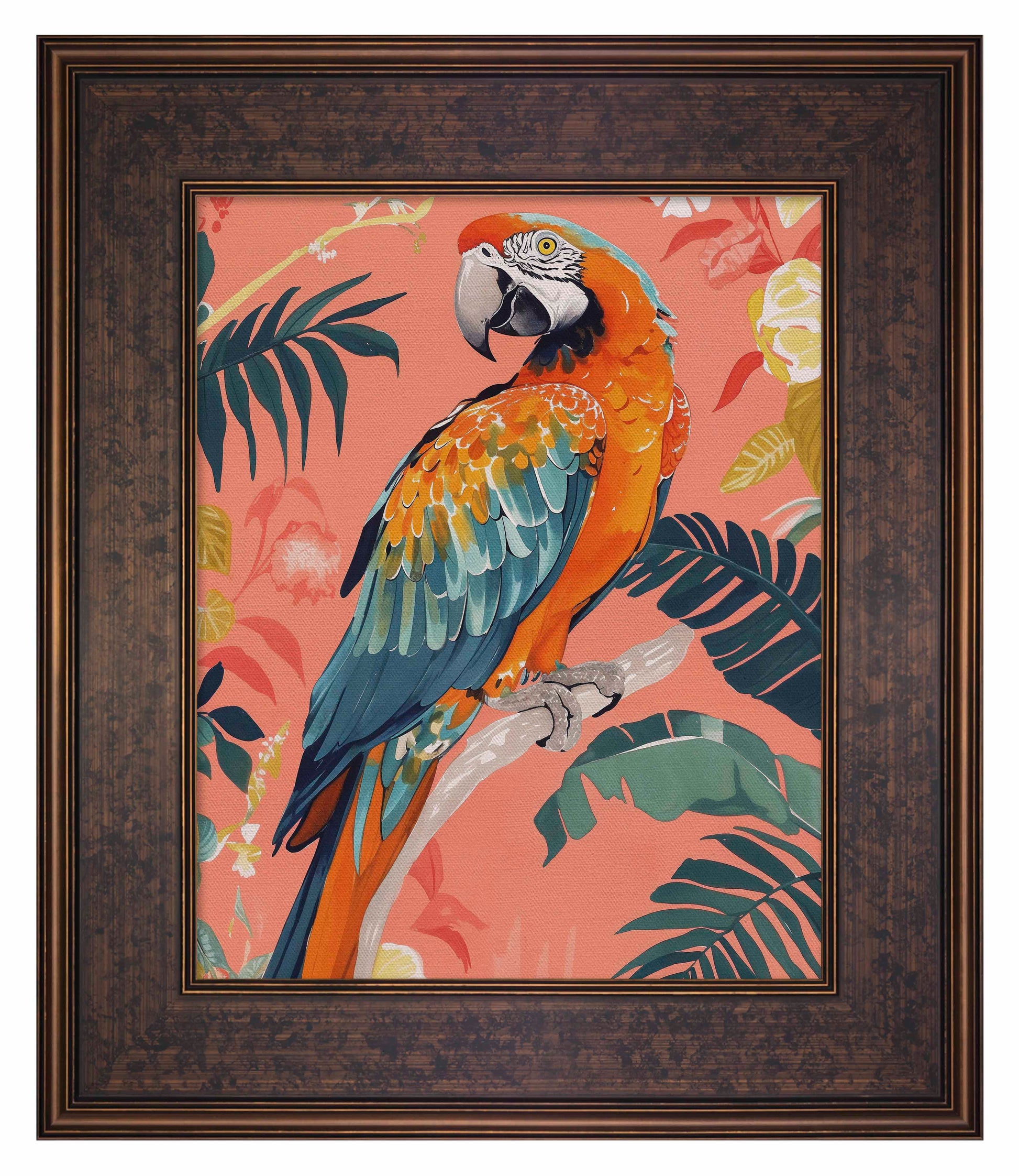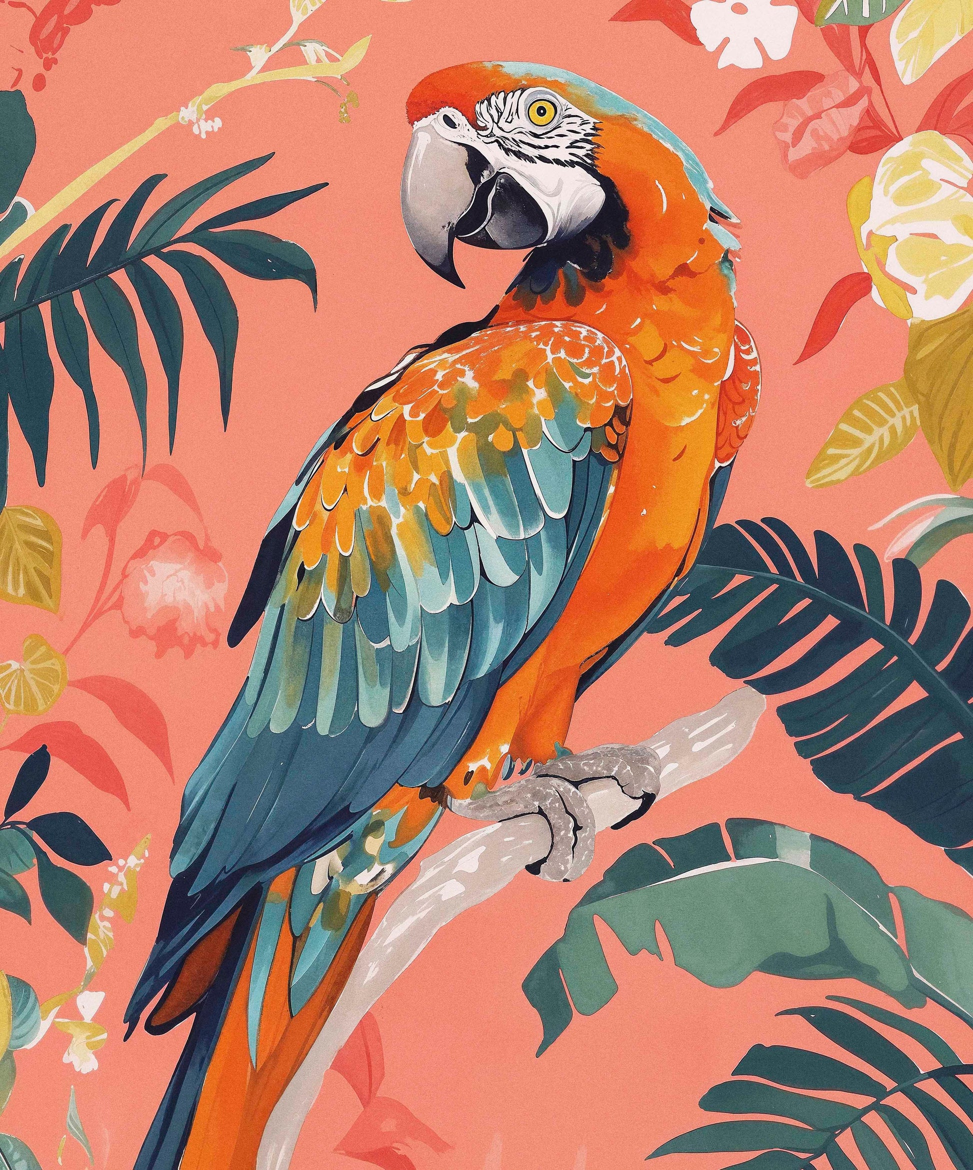 Vibrant Echoes - Macaw is an exhilarating celebration of the colorful and lively essence of tropical wildlife. This painting features a magnificent Macaw, perched proudly amidst a lush array of tropical leaves and flowers. The Macaw's vibrant plumage, with its brilliant hues of orange, blue, and green, stands out vividly against the warm, coral background, creating a striking visual impact.