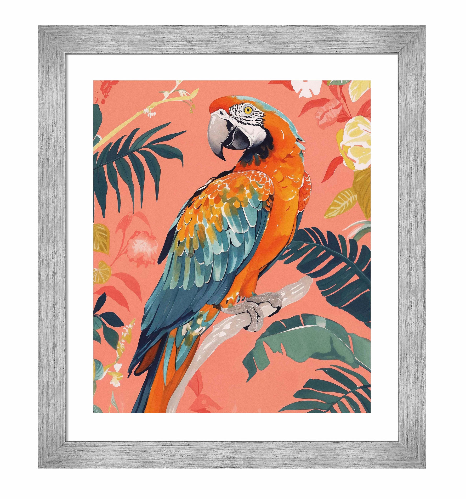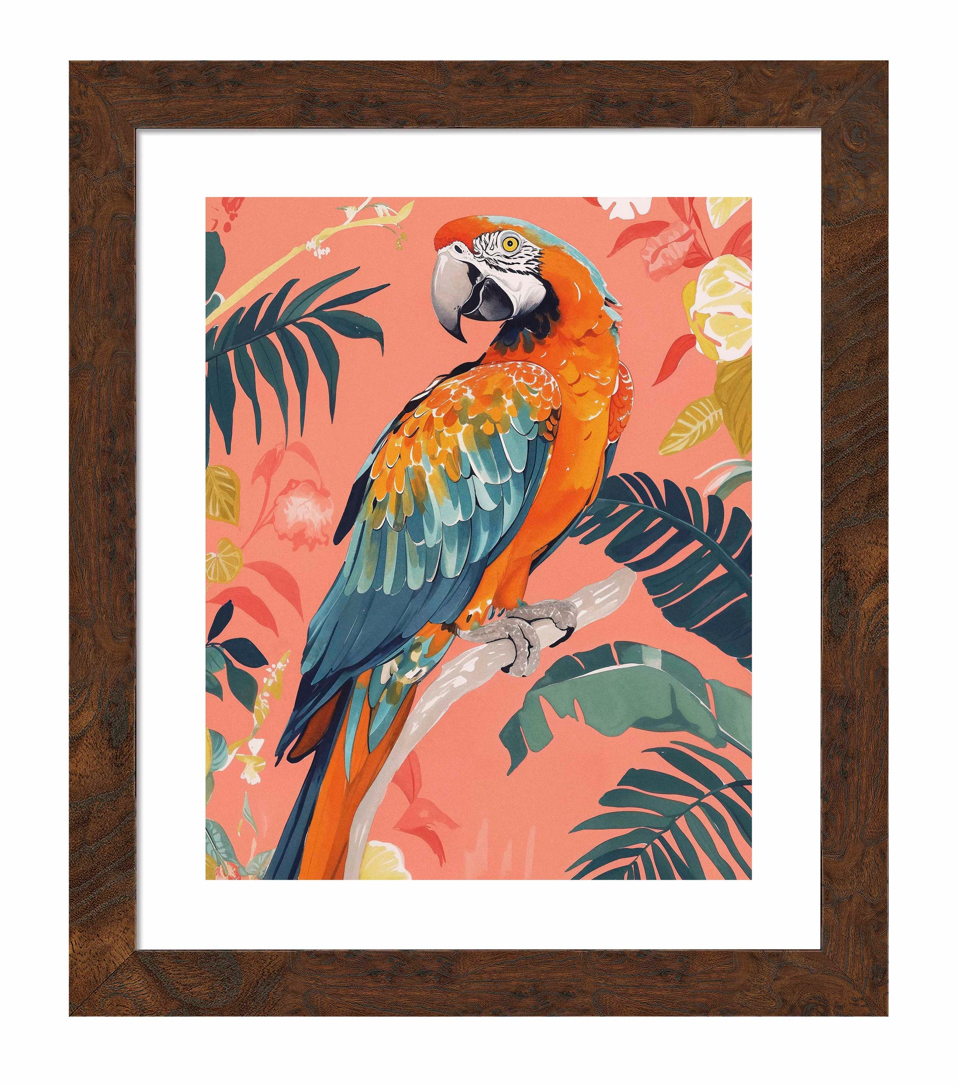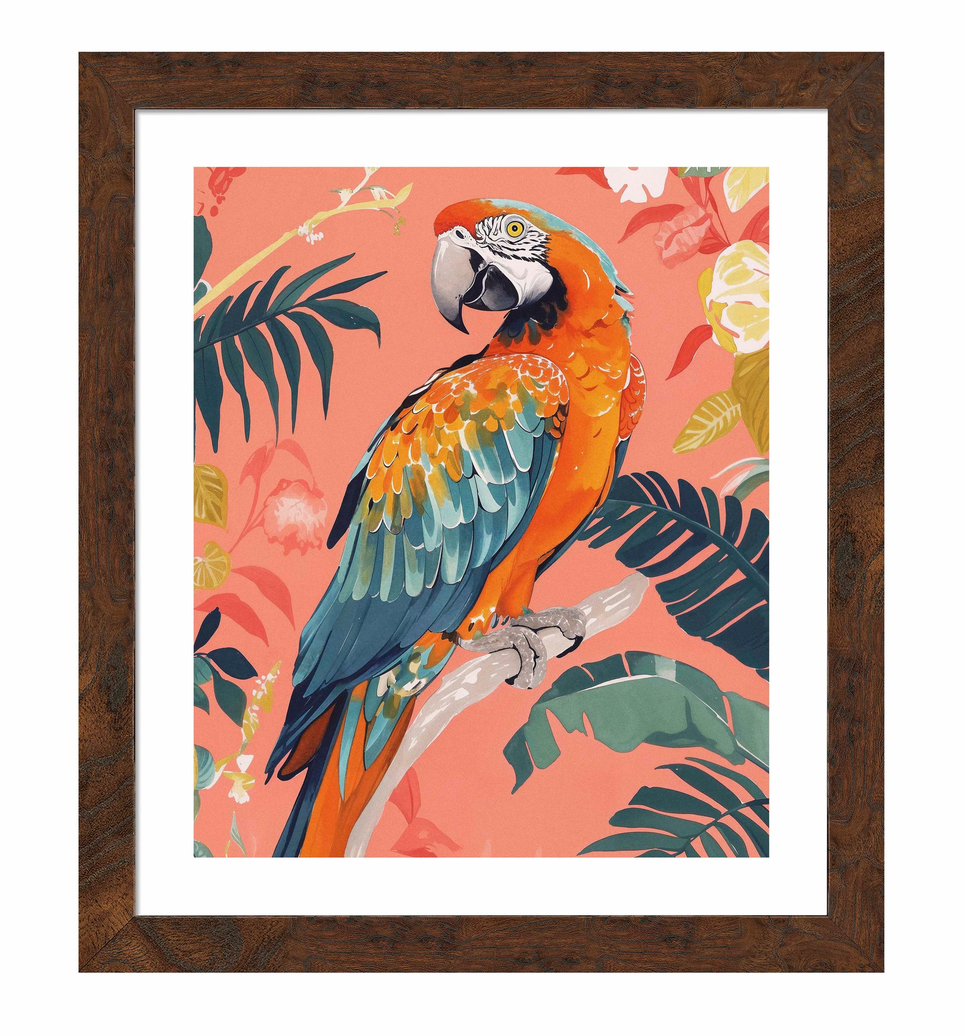 Vibrant Echoes - Macaw is an exhilarating celebration of the colorful and lively essence of tropical wildlife. This painting features a magnificent Macaw, perched proudly amidst a lush array of tropical leaves and flowers. The Macaw's vibrant plumage, with its brilliant hues of orange, blue, and green, stands out vividly against the warm, coral background, creating a striking visual impact.