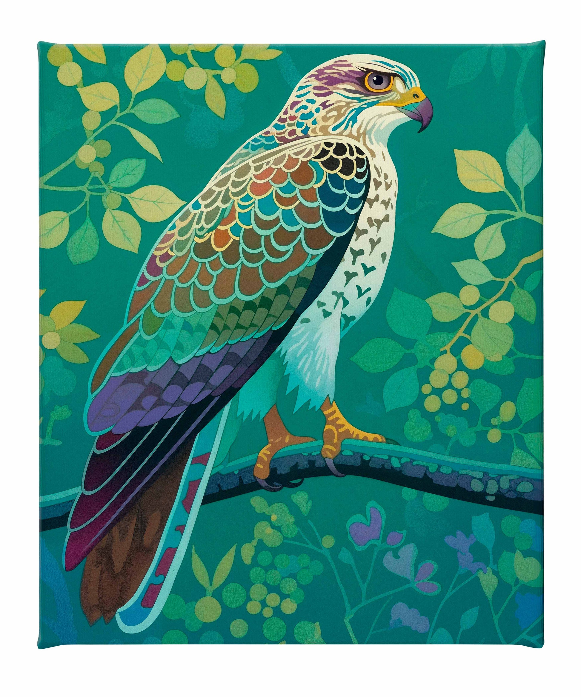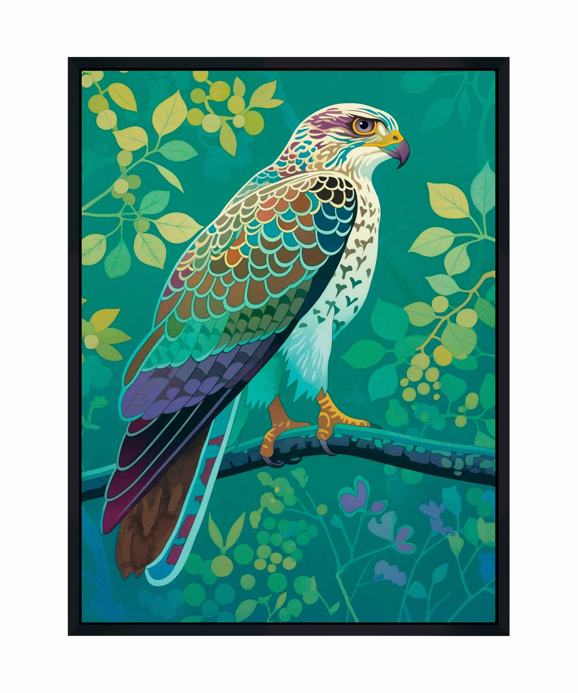 The artist's use of a rich, saturated color palette creates a sense of depth within the foliage. The contrasting hues and intricate patterns draw the viewer's eye, making the hawk the undeniable focal point of the composition. The lush background, with its varied shades of green and hints of yellow and purple, adds to the overall sense of vibrancy and natural beauty.