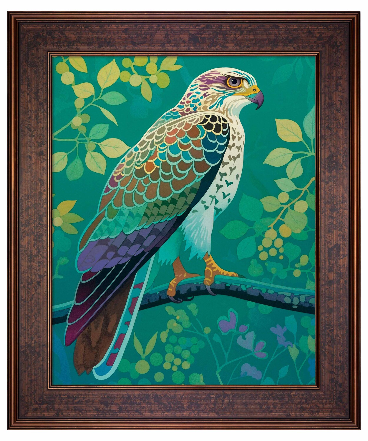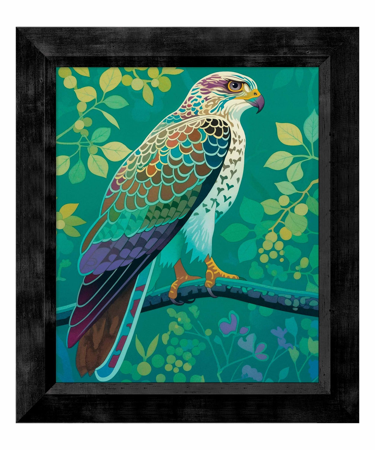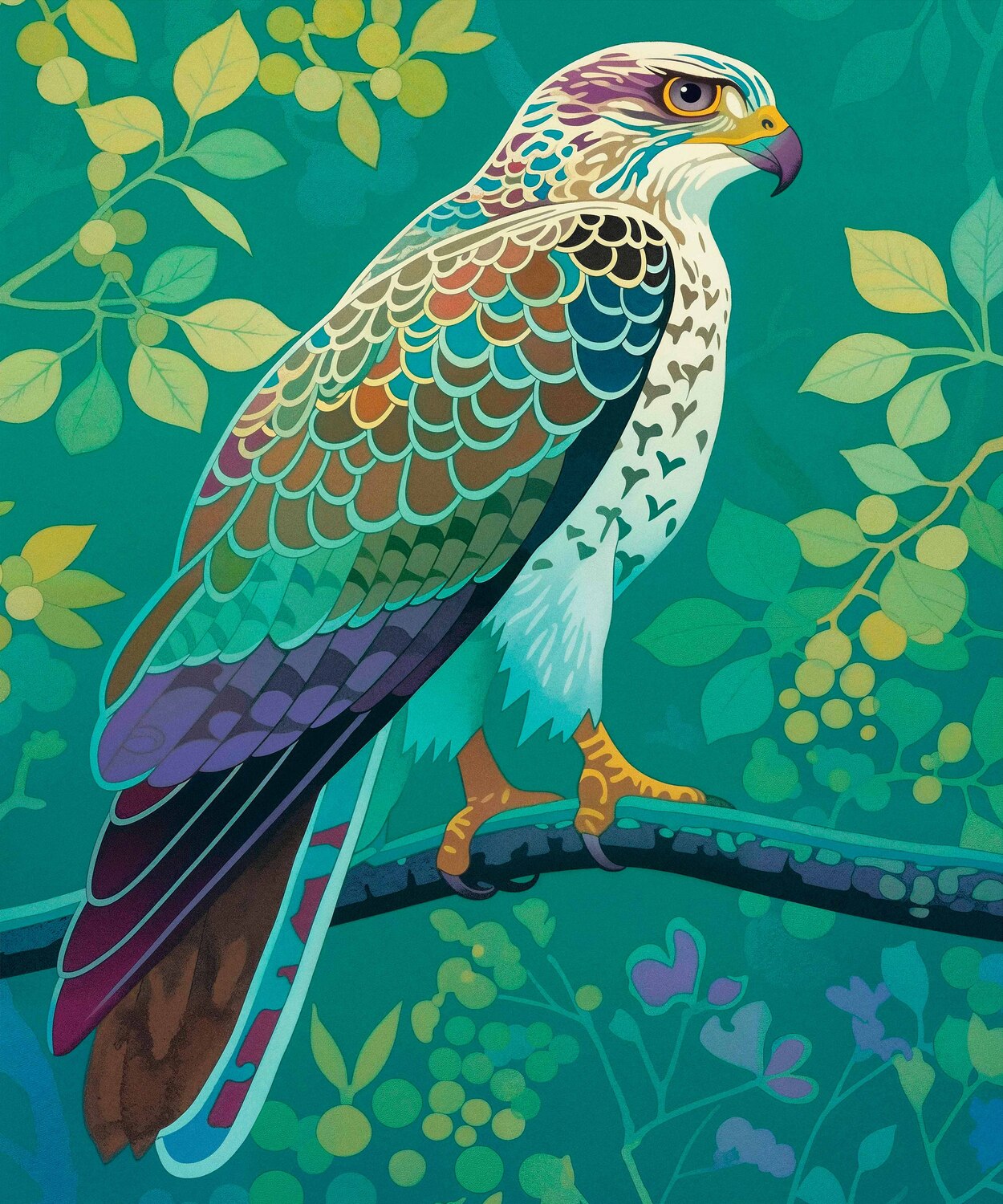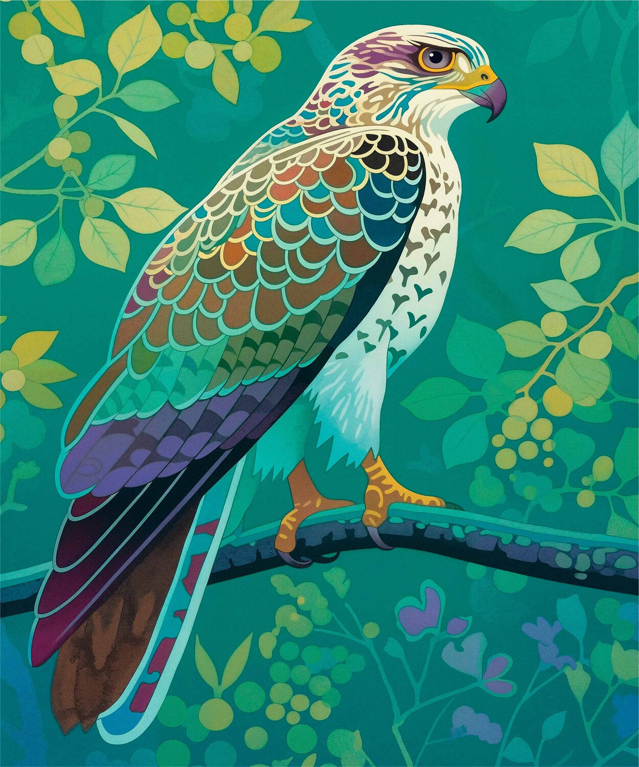 The artist's use of a rich, saturated color palette creates a sense of depth within the foliage. The contrasting hues and intricate patterns draw the viewer's eye, making the hawk the undeniable focal point of the composition. The lush background, with its varied shades of green and hints of yellow and purple, adds to the overall sense of vibrancy and natural beauty.