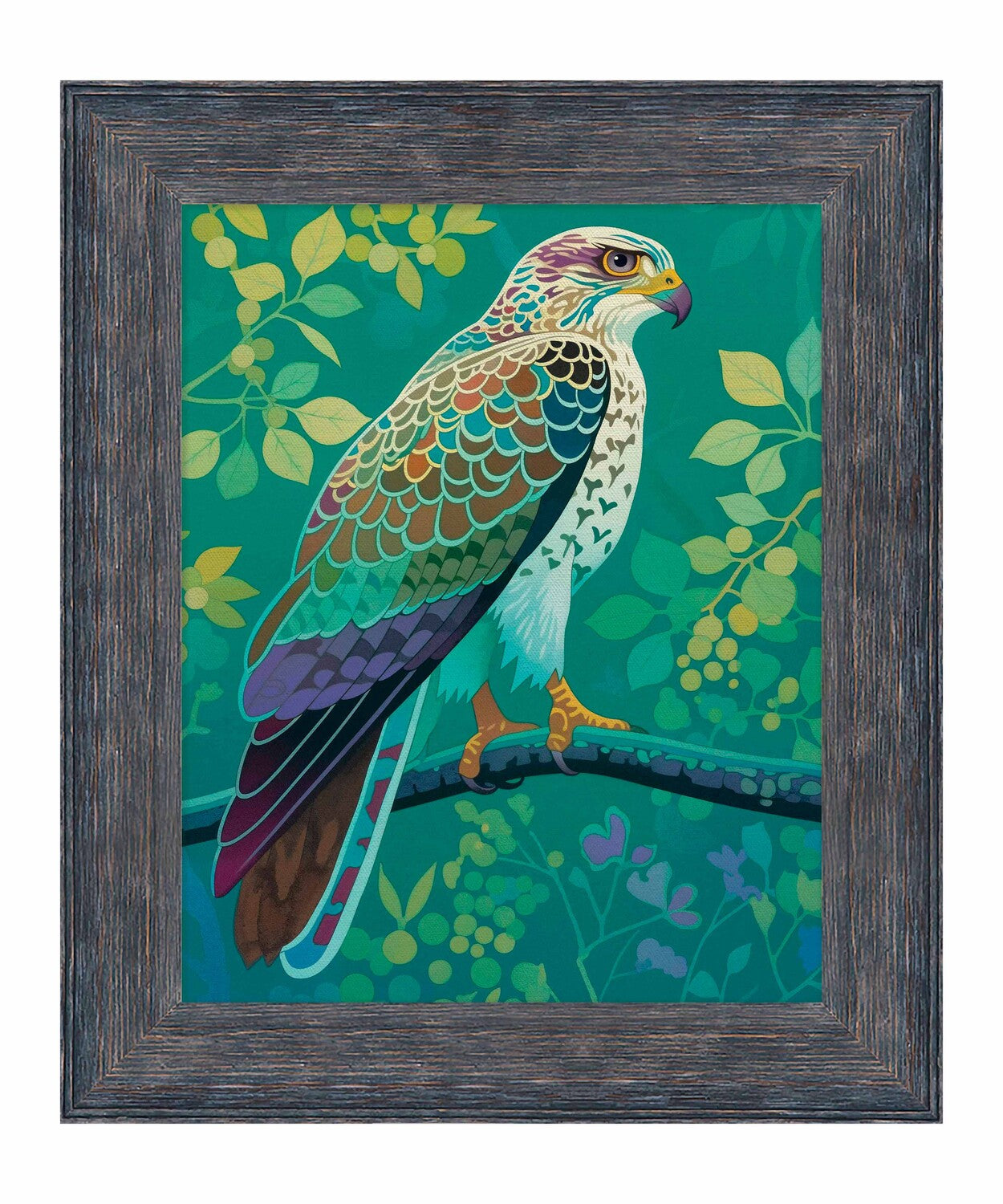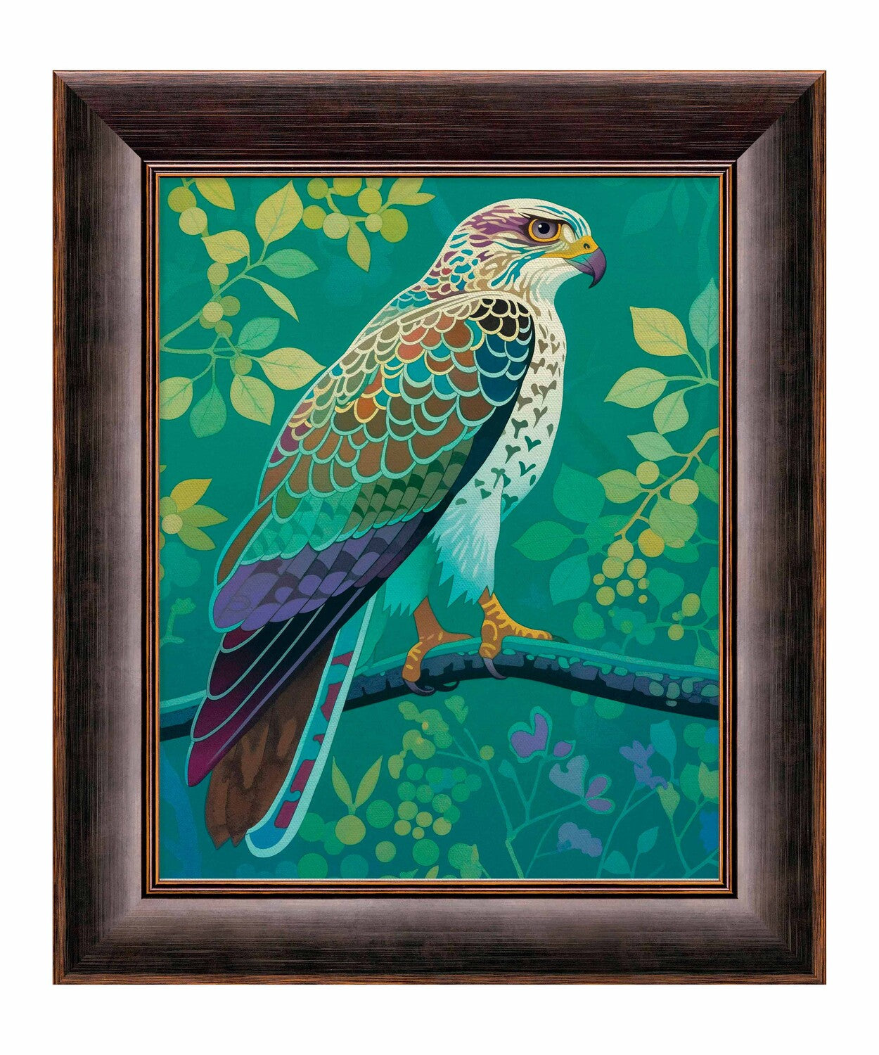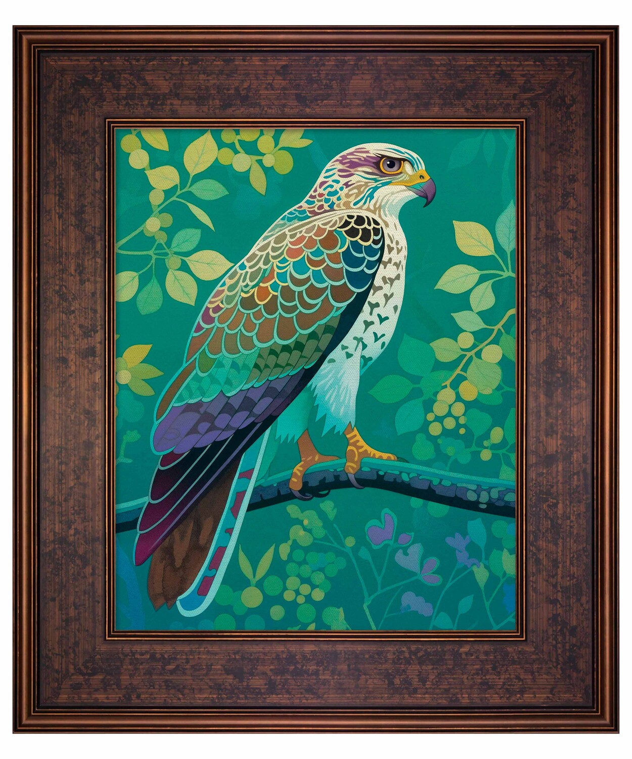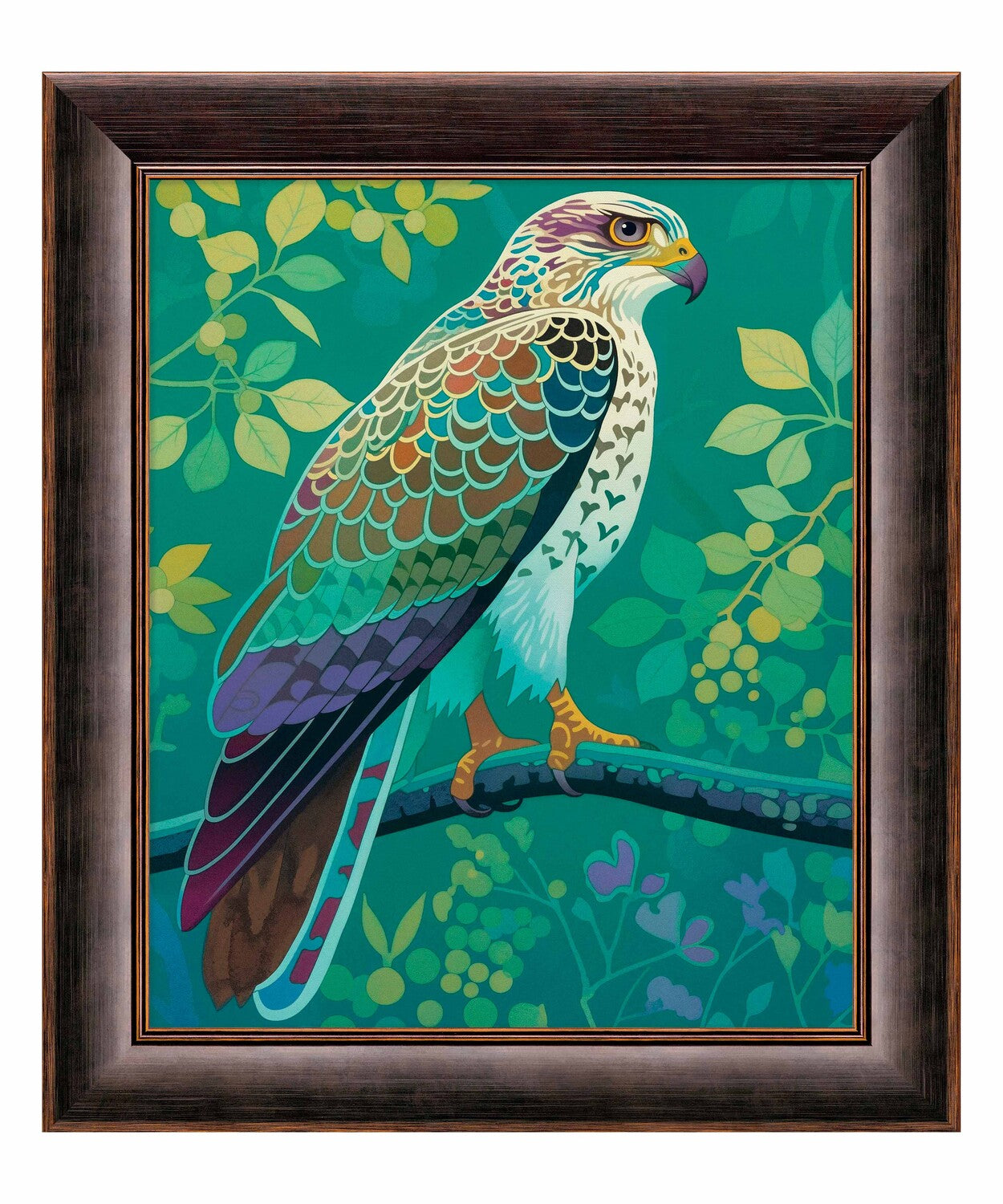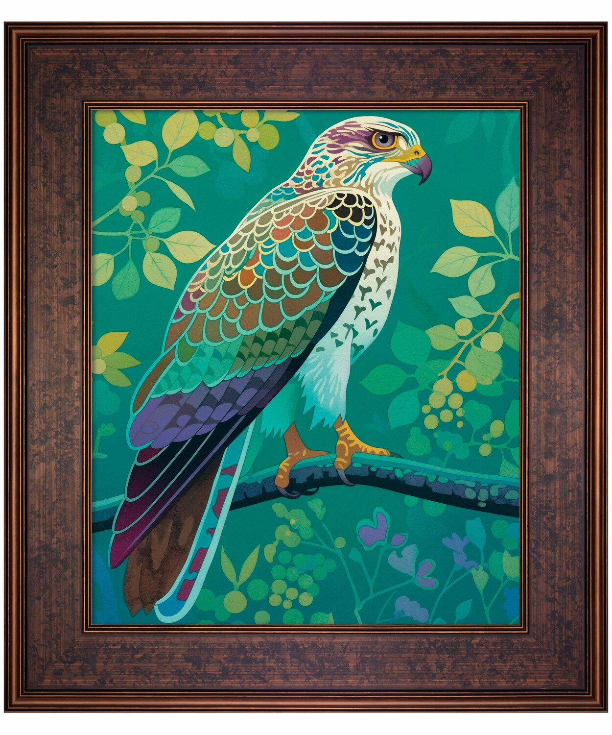 The artist's use of a rich, saturated color palette creates a sense of depth within the foliage. The contrasting hues and intricate patterns draw the viewer's eye, making the hawk the undeniable focal point of the composition. The lush background, with its varied shades of green and hints of yellow and purple, adds to the overall sense of vibrancy and natural beauty.