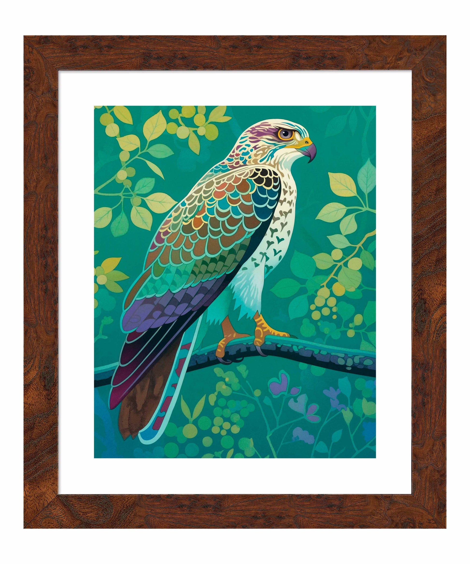 The artist's use of a rich, saturated color palette creates a sense of depth within the foliage. The contrasting hues and intricate patterns draw the viewer's eye, making the hawk the undeniable focal point of the composition. The lush background, with its varied shades of green and hints of yellow and purple, adds to the overall sense of vibrancy and natural beauty.