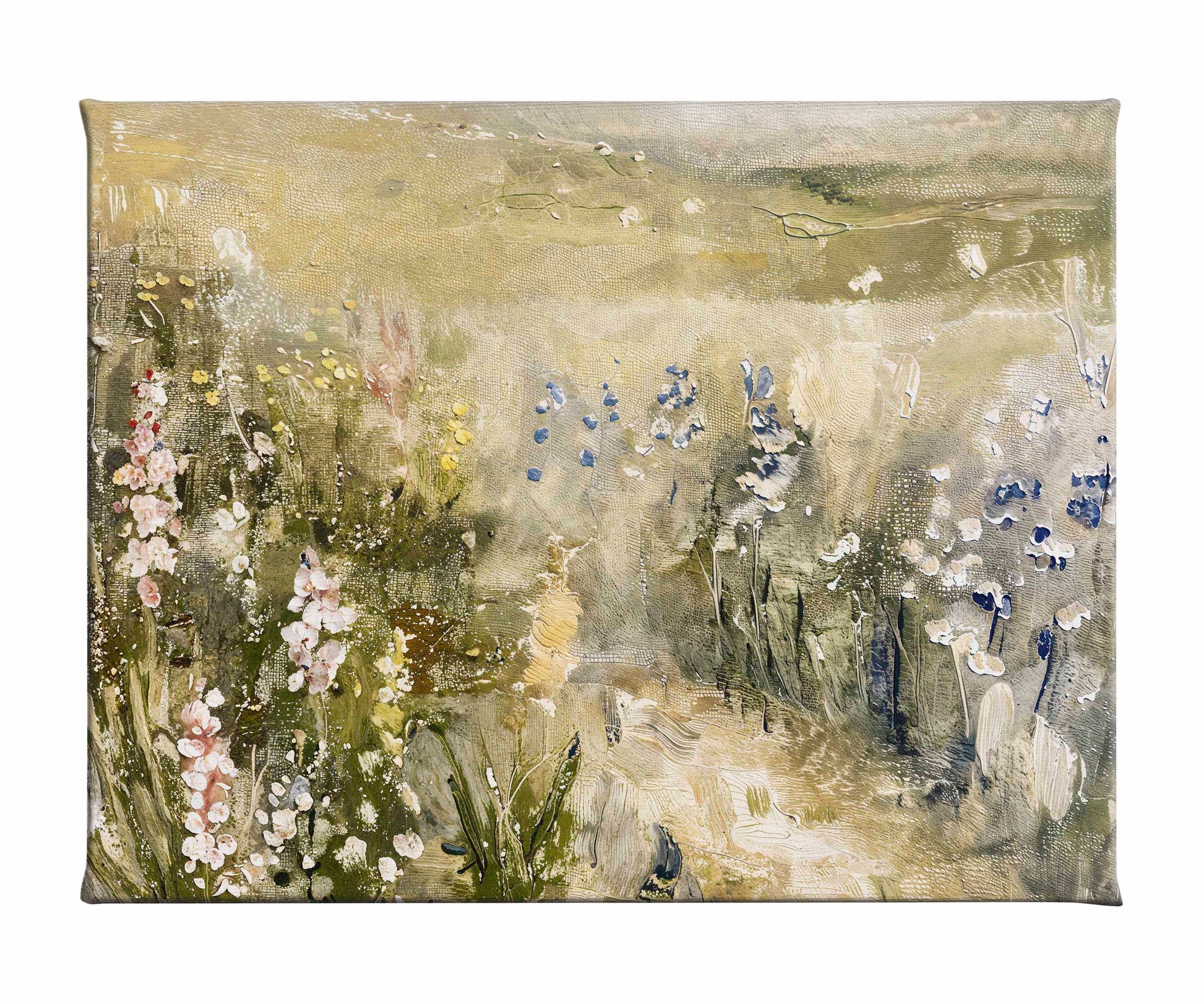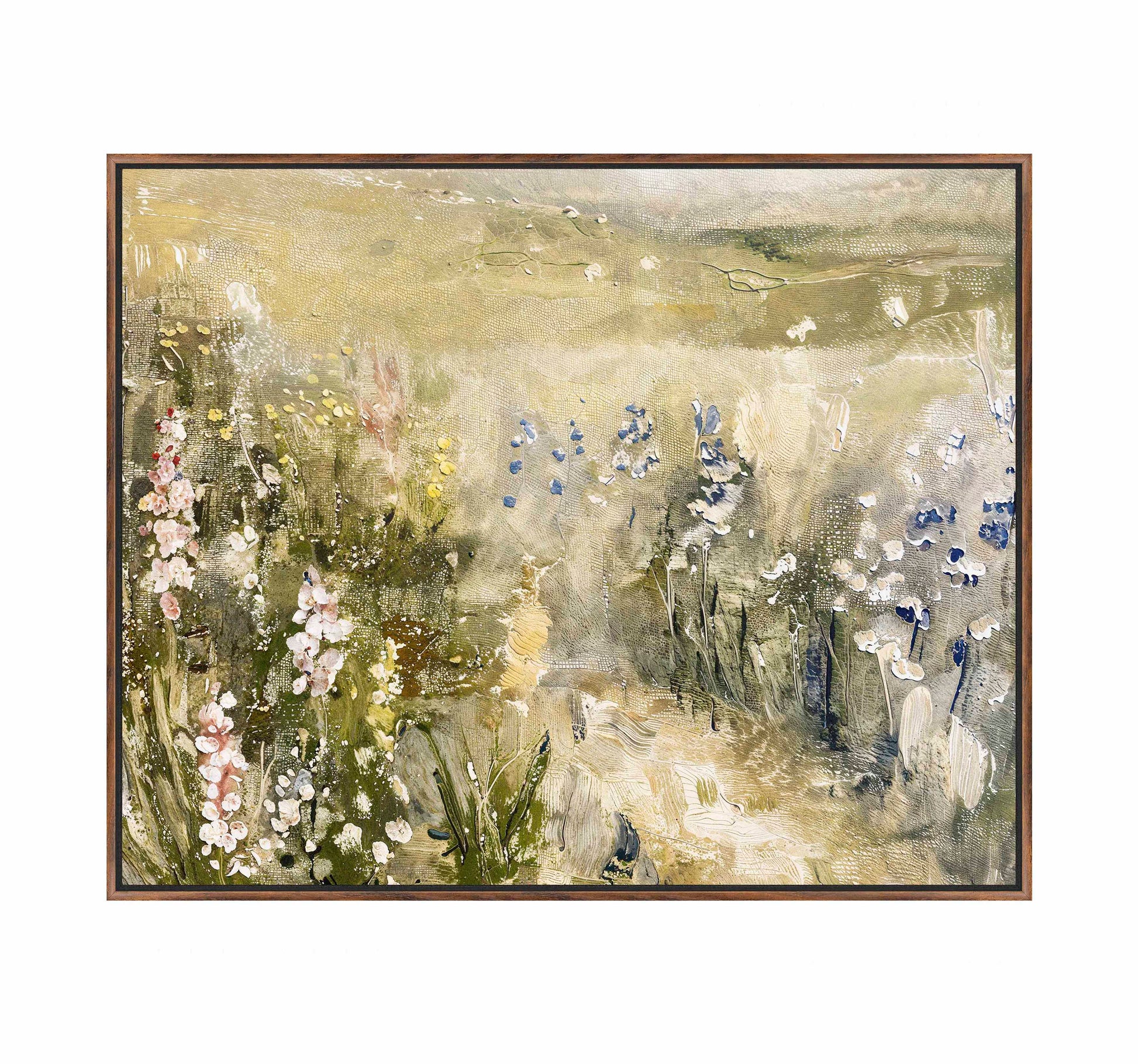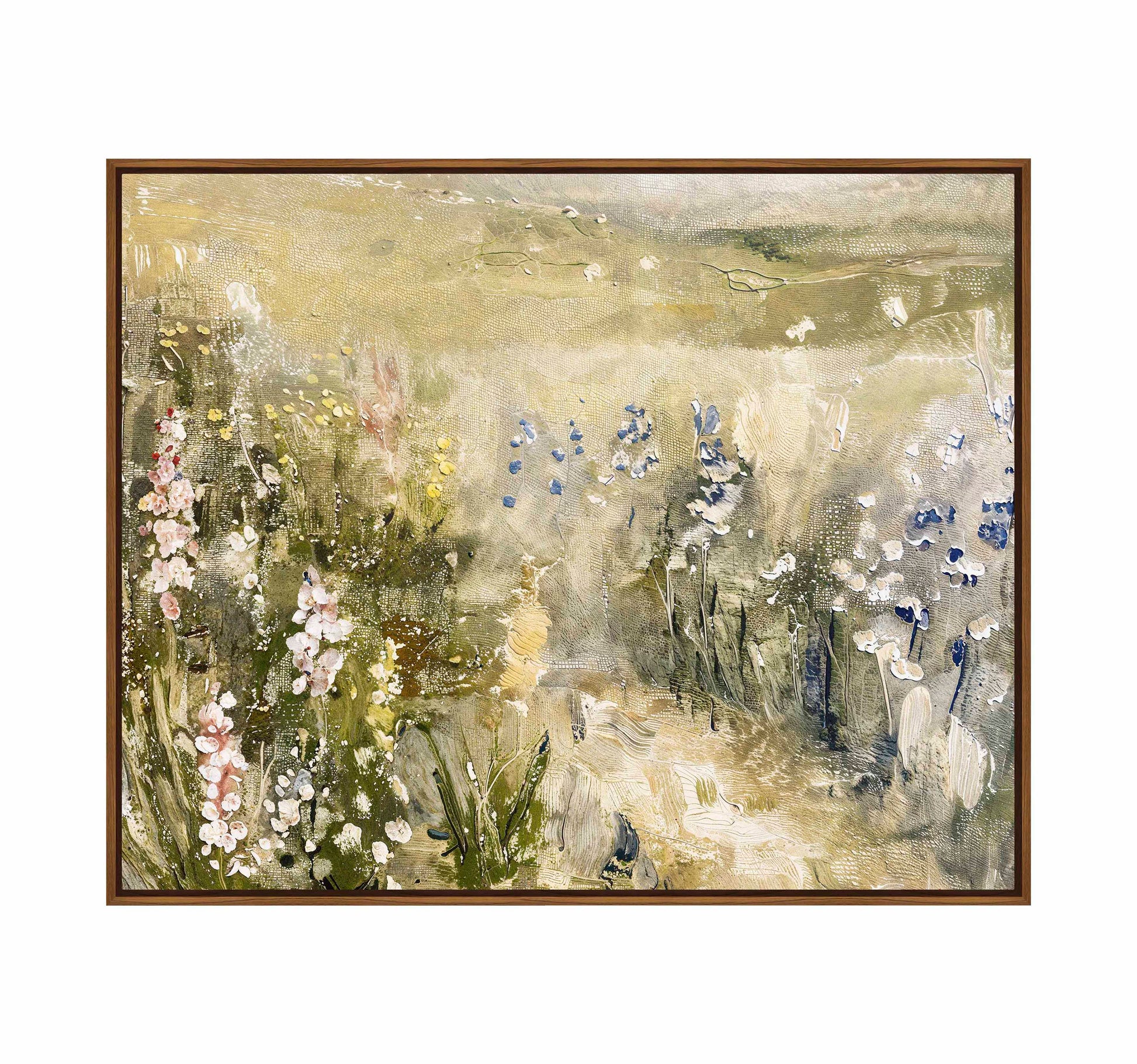"Visions of Remembrance II" invites viewers into a quiet, almost nostalgic landscape, where nature's beauty is captured in soft, impressionistic strokes. The composition centers around a blooming meadow, where muted greens and soft creams blend seamlessly with bursts of delicate pinks and blues, suggesting wildflowers swaying gently in a breeze. The palette is understated yet full of life, with the natural hues creating a serene and peaceful atmosphere.