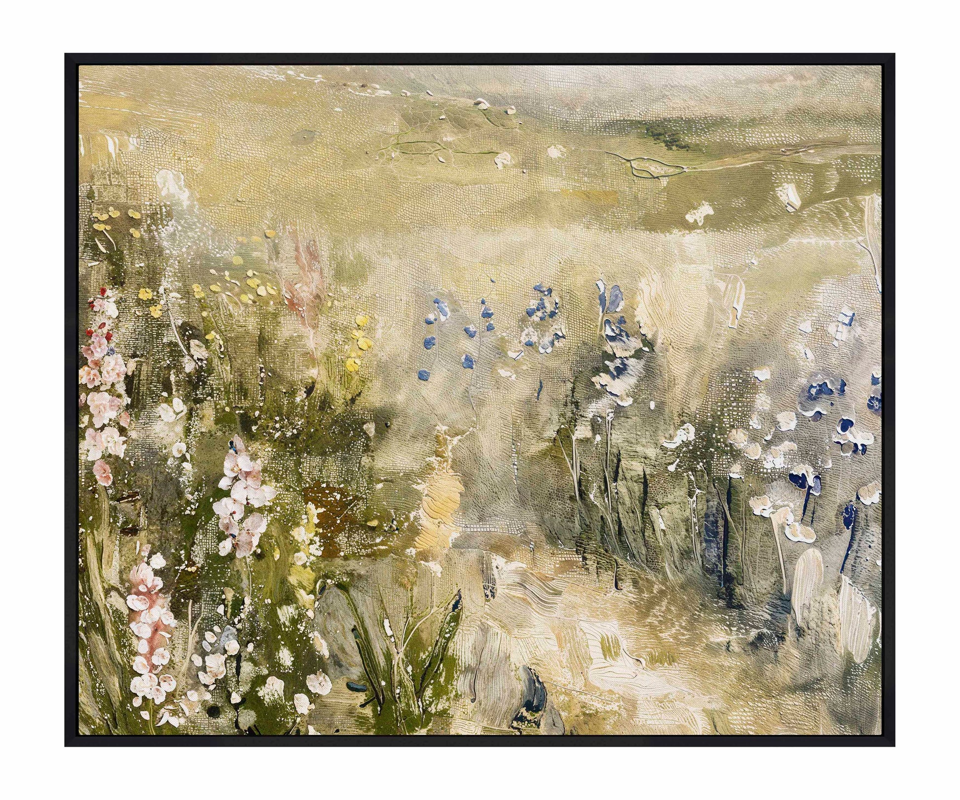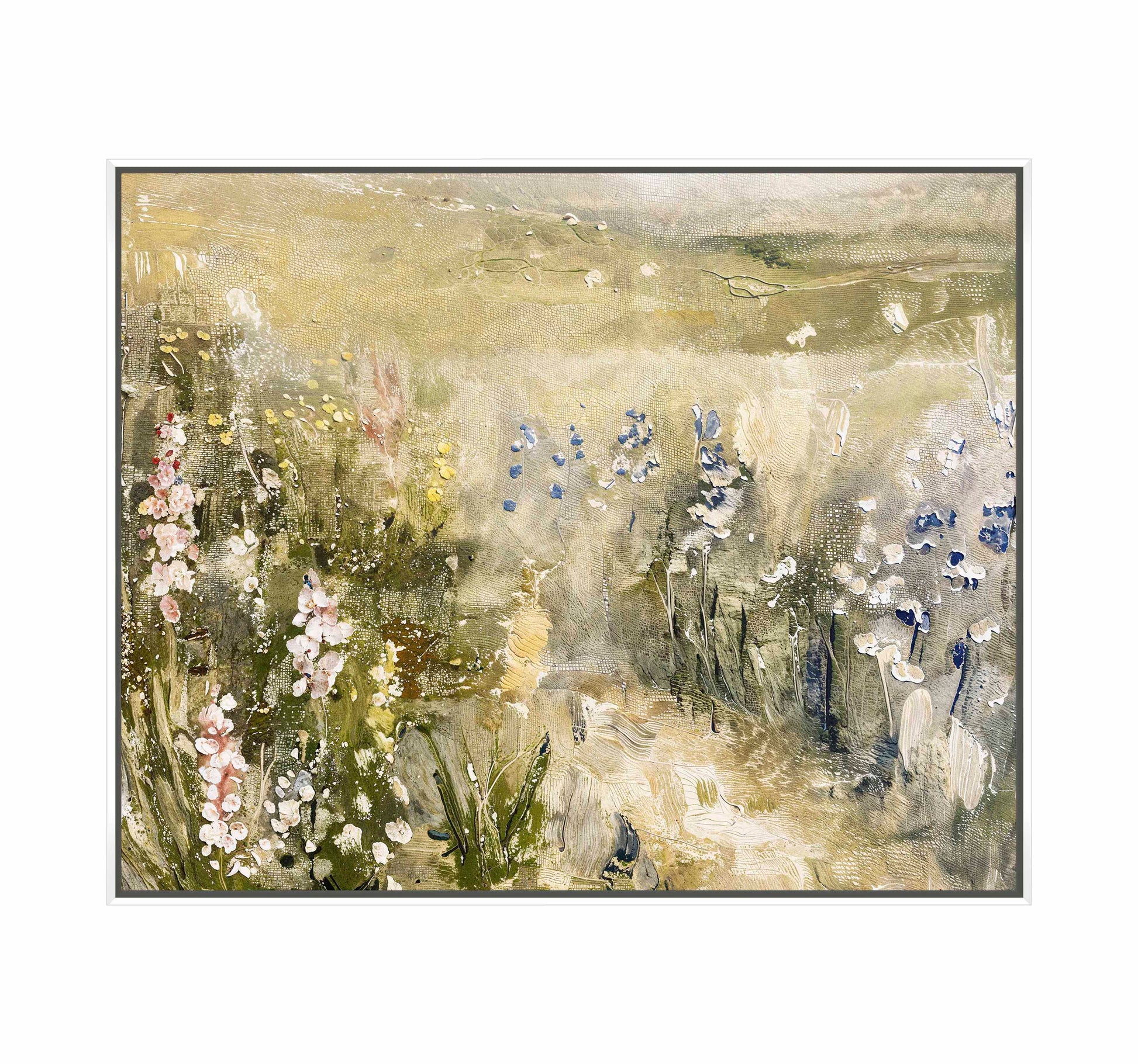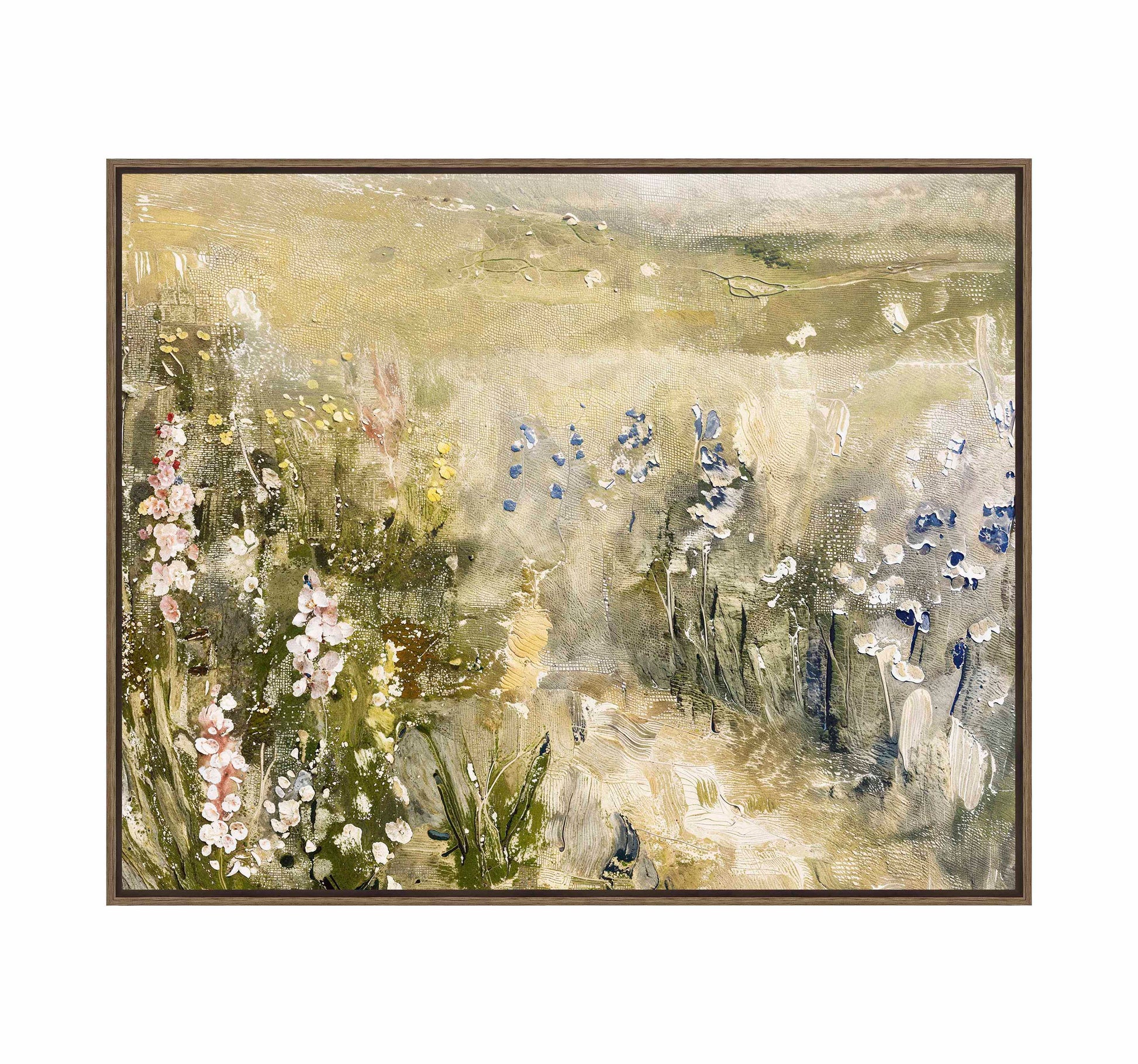"Visions of Remembrance II" invites viewers into a quiet, almost nostalgic landscape, where nature's beauty is captured in soft, impressionistic strokes. The composition centers around a blooming meadow, where muted greens and soft creams blend seamlessly with bursts of delicate pinks and blues, suggesting wildflowers swaying gently in a breeze. The palette is understated yet full of life, with the natural hues creating a serene and peaceful atmosphere.