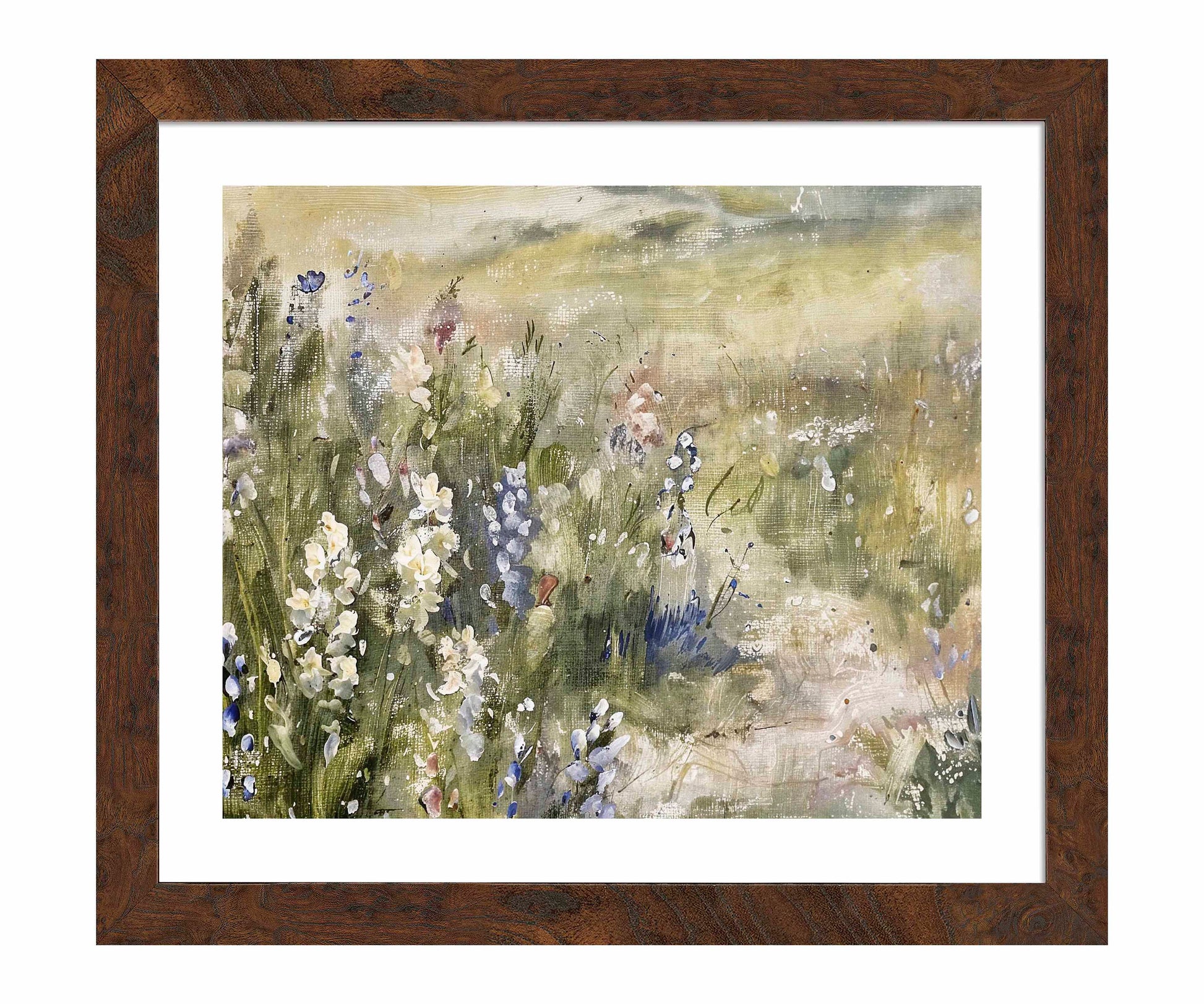 "Visions Of Remembrance I" captures the essence of a serene and nostalgic landscape. The painting employs a soft, muted palette, blending delicate greens, pale yellows, and gentle blues to create an ethereal, dreamlike atmosphere. The foreground is filled with an array of wildflowers, their forms lightly brushed and splattered, evoking a sense of movement as if swaying in a gentle breeze. The details of the flowers are subtle, giving them a spectral quality, as though they are memories of flowers rather than physical entities.